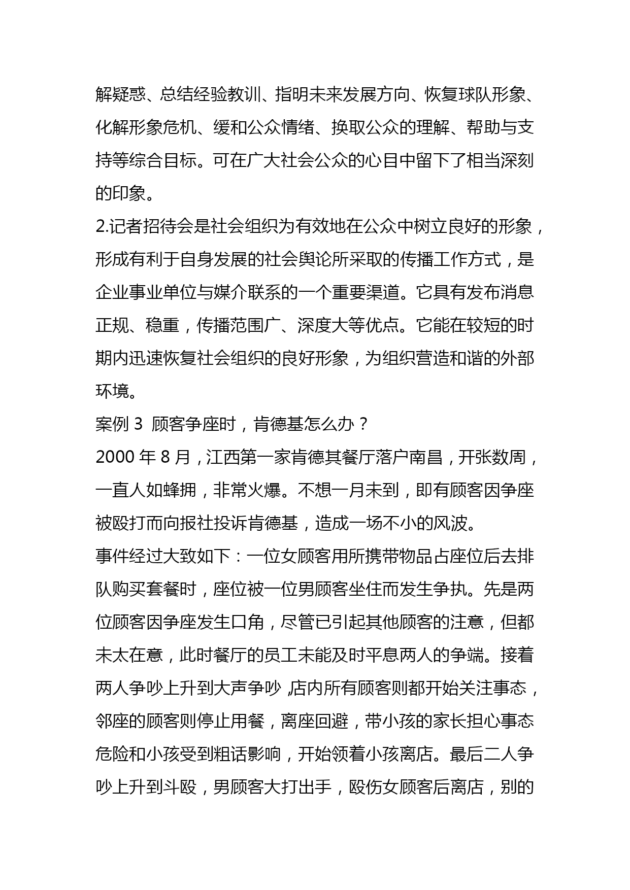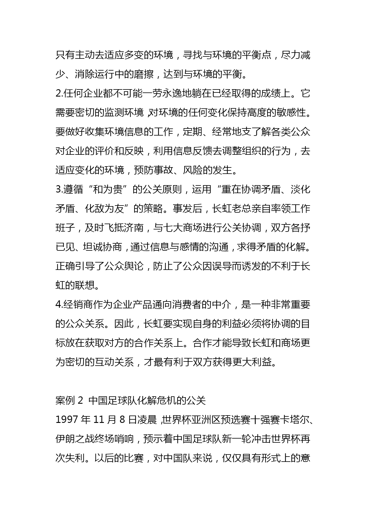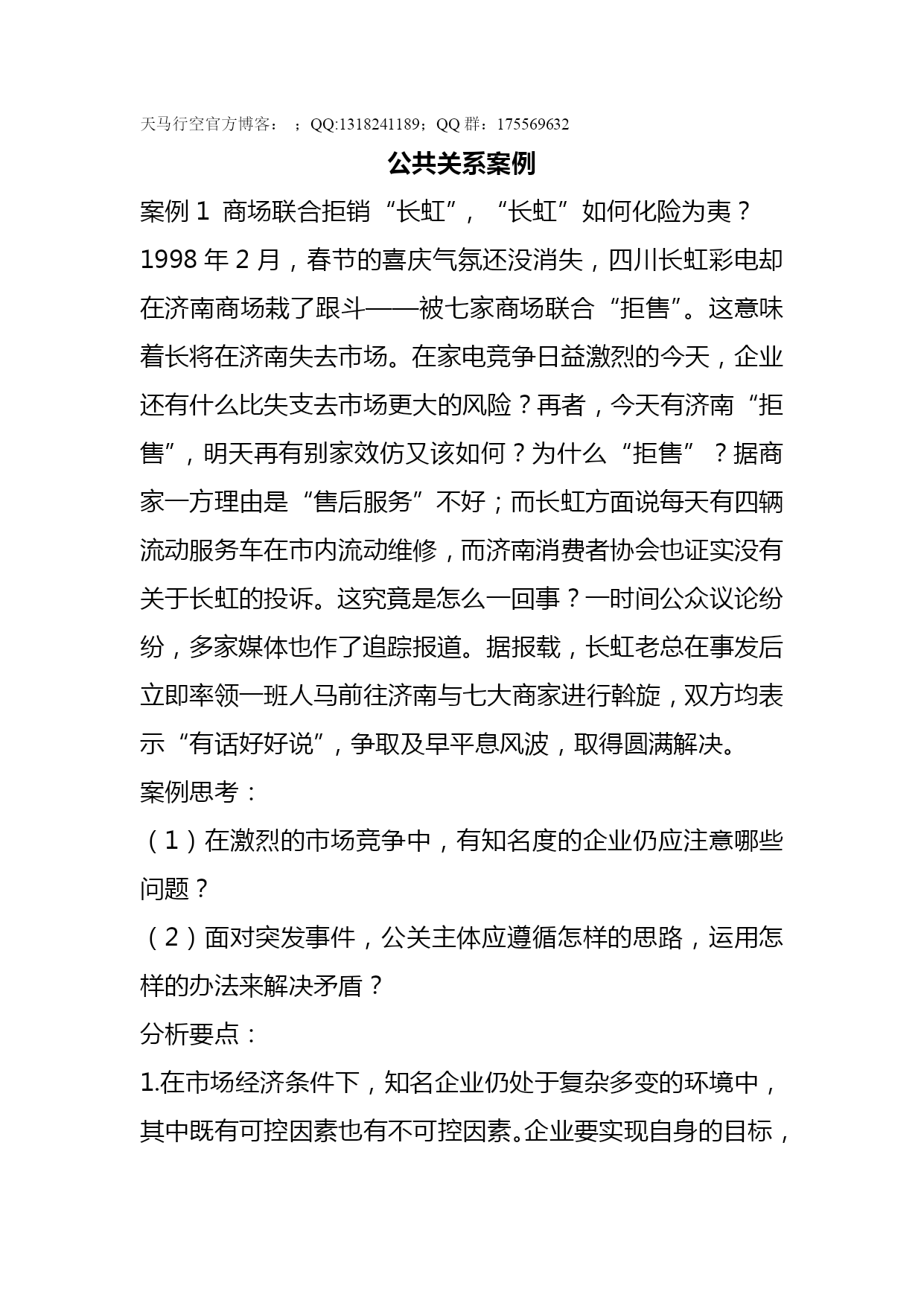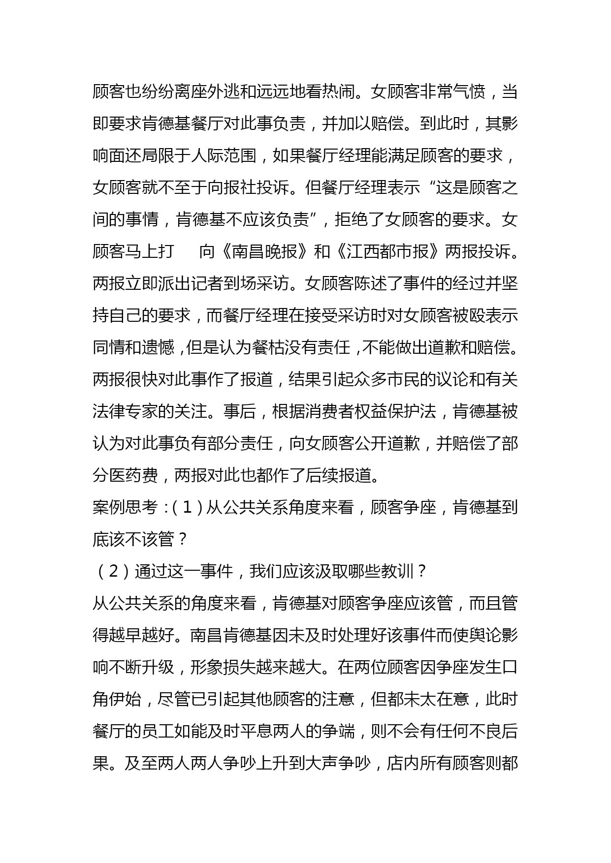 公共关系案例分析20例汇编(完整版)资料(可以直接使用,可编辑优秀版资料,欢迎下载)天马行空官方博客:;QQ:1318241189;QQ群:175569632公共关系案例案例1商场联合拒销“长虹”,“长虹”如何化险为夷?1998年2月,春节的喜庆气氛还没消失,四川长虹彩电却在济南商场栽了跟斗——被七家商场联合“拒售”。这意味着长将在济南失去市场。在家电竞争日益激烈的今天,企业还有什么比失支去市场更大的风险?再者,今天有济南“拒售”,明天再有别家效仿又该如何?为什么“拒售”?据商家一方理由是“售后服务”不好;而长虹方面说每天有四辆流动服务车在市内流动维修,而济南消费者协会也证实没有关于长虹的投诉。这究竟是怎么一回事?一时间公众议论纷纷,多家媒体也作了追踪报道。据报载,长虹老总在事发后立即率领一班人马前往济南与七大商家进行斡旋,双方均表示“有话好好说”,争取及早平息风波,取得圆满解决。案例思考:(1)在激烈的市场竞争中,有知名度的企业仍应注意哪些问题?(2)面对突发事件,公关主体应遵循怎样的思路,运用怎样的办法来解决矛盾?分析要点:1.在市场经济条件下,知名企业仍处于复杂多变的环境中,其中既有可控因素也有不可控因素。企业要实现自身的目标,只有主动去适应多变的环境,寻找与环境的平衡点,尽力减少、消除运行中的磨擦,达到与环境的平衡。2.任何企业都不可能一劳永逸地躺在已经取得的成绩上。它需要密切的监测环境,对环境的任何变化保持高度的敏感性。要做好收集环境信息的工作,定期、经常地支了解各类公众对企业的评价和反映,利用信息反馈去调整组织的行为,去适应变化的环境,预防事故、风险的发生。3.遵循“和为贵”的公关原则,运用“重在协调矛盾、淡化矛盾、化敌为友”的策略。事发后,长虹老总亲自率领工作班子,及时飞抵济南,与七大商场进行公关协调,双方各抒已见、坦诚协商,通过信息与感情的沟通,求得矛盾的化解。正确引导了公众舆论,防止了公众因误导而诱发的不利于长虹的联想。4.经销商作为企业产品通向消费者的中介,是一种非常重要的公众关系。因此,长虹要实现自身的利益必须将协调的目标放在获取对方的合作关系上。合作才能导致长虹和商场更为密切的互动关系,才最有利于双方获得更大利益。案例2中国足球队化解危机的公关1997年11月8日凌晨,世界杯亚洲区预选赛十强赛卡塔尔、伊朗之战终场哨响,预示着中国足球队新一轮冲击世界杯再次失利。以后的比赛,对中国队来说,仅仅具有形式上的意义。民众的疑惑、失望、忿恨、痛苦溢于言表,外在化、激情化的言辞、行动不断出现有各种媒体上。中国队的能力受到极大的怀疑,形象遇到前所未有的危机。“给民众一个说法”已是大势所趋。11月13日,中国足球队在大连东方大厦举行记者招待会。足球常务副主席王俊生为主要发言人、国家体委宣传司司长何慧娴为主持人,教练组成员戚务生、金志扬、迟尚斌、陈熙荣,运动员代表范志毅、徐弘、区楚良等出席会议。何女士首先表达了中国队非常希望与新闻媒体见面,共同为中国足球会诊的真诚愿望。王俊生接着作长篇发言,分析此次失利的主要原因:判断出偏差,发挥欠稳定,战术组合需要尽快提高,关键时刻在关键位置上出现了技术失误,导致失分。亿他和其他发言人还回答了记者提出的问题。会上发布了中国队致全国球迷的一封公开信《擦干眼泪,奋起直追》。来自全国各地的新闻单位的百余名记者参加了2小时的记者招待会。案例思考:(1)社会组织如何化解形象危机?(2)记者招待会的优势何在?分析要点:1.充分利用记者招待会的优势,在适当的时机和地点,精巧策划、周密准备,规范、稳妥、高超地支作,达到了预期的解疑惑、总结经验教训、指明未来发展方向、恢复球队形象、化解形象危机、缓和公众情绪、换取公众的理解、帮助与支持等综合目标。可在广大社会公众的心目中留下了相当深刻的印象。2.记者招待会是社会组织为有效地在公众中树立良好的形象,形成有利于自身发展的社会舆论所采取的传播工作方式,是企业事业单位与媒介联系的一个重要渠道。它具有发布消息正规、稳重,传播范围广、深度大等优点。它能在较短的时期内迅速恢复社会组织的良好形象,为组织营造和谐的外部环境。案例3顾客争座时,肯德基怎么办?2000年8月,江西第一家肯德其餐厅落户南昌,开张数周,一直人如蜂拥,非常火爆。不想一月未到,即有顾客因争座被殴打而向报社投诉肯德基,造成一场不小的风波。事件经过大致如下:一位女顾客用所携带物品占座位后去排队购买套餐时,座位被一位男顾客坐住而发生争执。先是两位顾客因争座发生口角,尽管已引起其他顾客的注意,但都未太在意,此时餐厅的员工未能及时平息两人的争端。接着两人争吵上升到大声争吵,店内所有顾客则都开始关注事态,邻座的顾客则停止用餐,离座回避,带小孩的家长担心