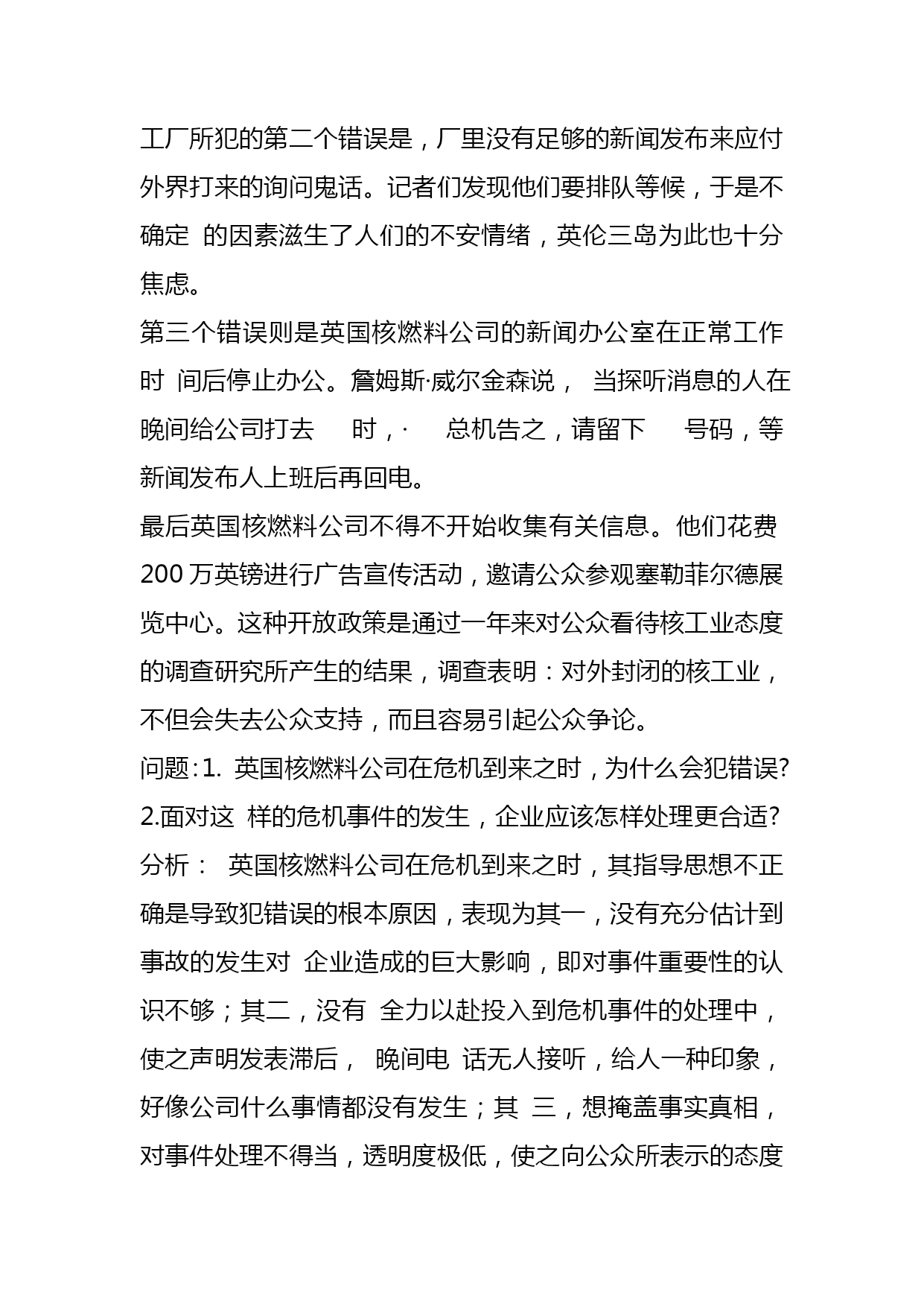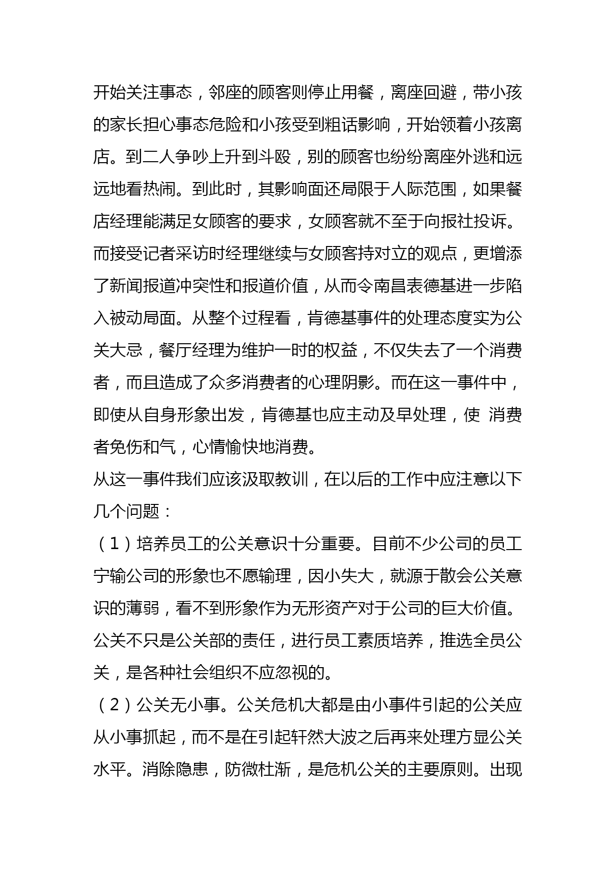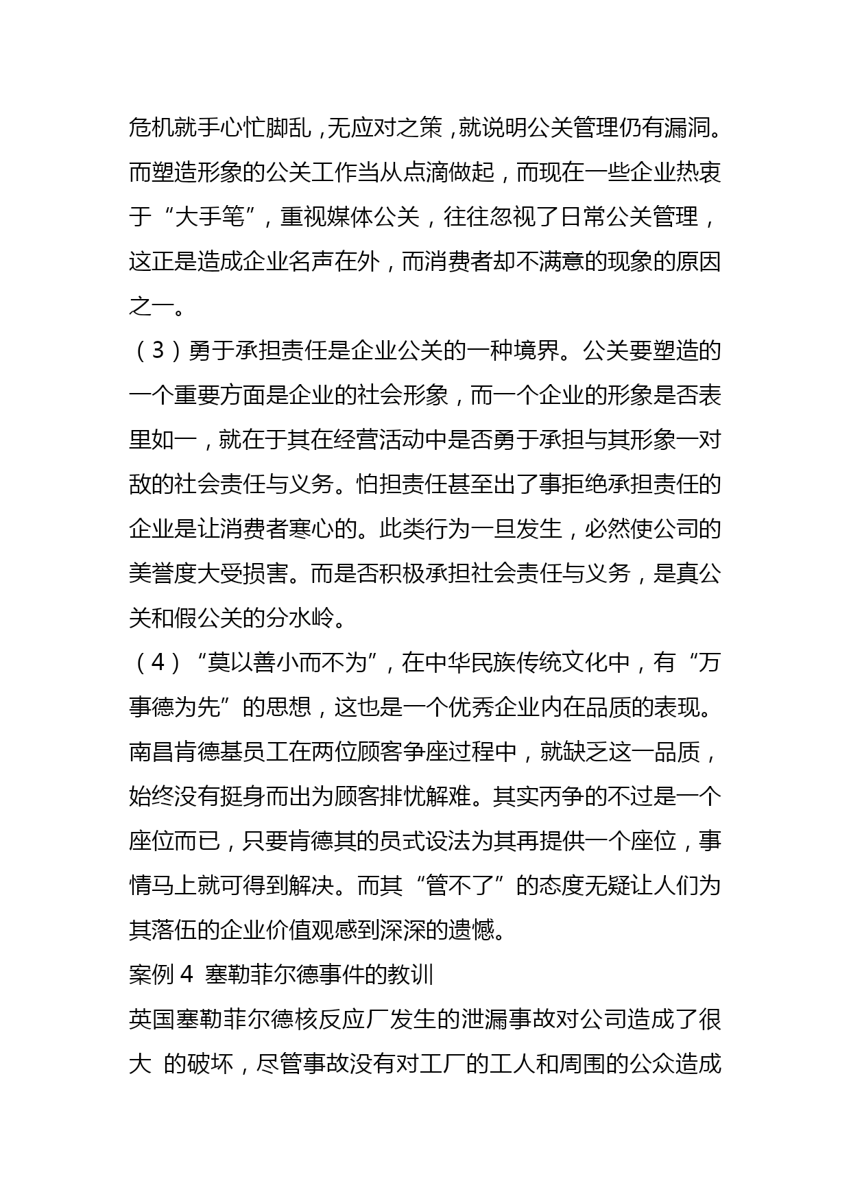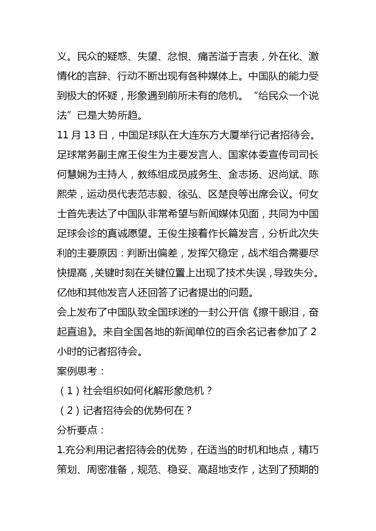 公共关系案例分析20例汇编(完整版)资料(可以直接使用,可编辑优秀版资料,欢迎下载)天马行空官方博客:;QQ:1318241189;QQ群:175569632公共关系案例案例1商场联合拒销“长虹”,“长虹”如何化险为夷?1998年2月,春节的喜庆气氛还没消失,四川长虹彩电却在济南商场栽了跟斗——被七家商场联合“拒售”。这意味着长将在济南失去市场。在家电竞争日益激烈的今天,企业还有什么比失支去市场更大的风险?再者,今天有济南“拒售”,明天再有别家效仿又该如何?为什么“拒售”?据商家一方理由是“售后服务”不好;而长虹方面说每天有四辆流动服务车在市内流动维修,而济南消费者协会也证实没有关于长虹的投诉。这究竟是怎么一回事?一时间公众议论纷纷,多家媒体也作了追踪报道。据报载,长虹老总在事发后立即率领一班人马前往济南与七大商家进行斡旋,双方均表示“有话好好说”,争取及早平息风波,取得圆满解决。案例思考:(1)在激烈的市场竞争中,有知名度的企业仍应注意哪些问题?(2)面对突发事件,公关主体应遵循怎样的思路,运用怎样的办法来解决矛盾?分析要点:1.在市场经济条件下,知名企业仍处于复杂多变的环境中,其中既有可控因素也有不可控因素。企业要实现自身的目标,只有主动去适应多变的环境,寻找与环境的平衡点,尽力减少、消除运行中的磨擦,达到与环境的平衡。2.任何企业都不可能一劳永逸地躺在已经取得的成绩上。它需要密切的监测环境,对环境的任何变化保持高度的敏感性。要做好收集环境信息的工作,定期、经常地支了解各类公众对企业的评价和反映,利用信息反馈去调整组织的行为,去适应变化的环境,预防事故、风险的发生。3.遵循“和为贵”的公关原则,运用“重在协调矛盾、淡化矛盾、化敌为友”的策略。事发后,长虹老总亲自率领工作班子,及时飞抵济南,与七大商场进行公关协调,双方各抒已见、坦诚协商,通过信息与感情的沟通,求得矛盾的化解。正确引导了公众舆论,防止了公众因误导而诱发的不利于长虹的联想。4.经销商作为企业产品通向消费者的中介,是一种非常重要的公众关系。因此,长虹要实现自身的利益必须将协调的目标放在获取对方的合作关系上。合作才能导致长虹和商场更为密切的互动关系,才最有利于双方获得更大利益。案例2中国足球队化解危机的公关1997年11月8日凌晨,世界杯亚洲区预选赛十强赛卡塔尔、伊朗之战终场哨响,预示着中国足球队新一轮冲击世界杯再次失利。以后的比赛,对中国队来说,仅仅具有形式上的意义。民众的疑惑、失望、忿恨、痛苦溢于言表,外在化、激情化的言辞、行动不断出现有各种媒体上。中国队的能力受到极大的怀疑,形象遇到前所未有的危机。“给民众一个说法”已是大势所趋。11月13日,中国足球队在大连东方大厦举行记者招待会。足球常务副主席王俊生为主要发言人、国家体委宣传司司长何慧娴为主持人,教练组成员戚务生、金志扬、迟尚斌、陈熙荣,运动员代表范志毅、徐弘、区楚良等出席会议。何女士首先表达了中国队非常希望与新闻媒体见面,共同为中国足球会诊的真诚愿望。王俊生接着作长篇发言,分析此次失利的主要原因:判断出偏差,发挥欠稳定,战术组合需要尽快提高,关键时刻在关键位置上出现了技术失误,导致失分。亿他和其他发言人还回答了记者提出的问题。会上发布了中国队致全国球迷的一封公开信《擦干眼泪,奋起直追》。来自全国各地的新闻单位的百余名记者参加了2小时的记者招待会。案例思考:(1)社会组织如何化解形象危机?(2)记者招待会的优势何在?分析要点:1.充分利用记者招待会的优势,在适当的时机和地点,精巧策划、周密准备,规范、稳妥、高超地支作,达到了预期的解疑惑、总结经验教训、指明未来发展方向、恢复球队形象、化解形象危机、缓和公众情绪、换取公众的理解、帮助与支持等综合目标。可在广大社会公众的心目中留下了相当深刻的印象。2.记者招待会是社会组织为有效地在公众中树立良好的形象,形成有利于自身发展的社会舆论所采取的传播工作方式,是企业事业单位与媒介联系的一个重要渠道。它具有发布消息正规、稳重,传播范围广、深度大等优点。它能在较短的时期内迅速恢复社会组织的良好形象,为组织营造和谐的外部环境。案例3顾客争座时,肯德基怎么办?2000年8月,江西第一家肯德其餐厅落户南昌,开张数周,一直人如蜂拥,非常火爆。不想一月未到,即有顾客因争座被殴打而向报社投诉肯德基,造成一场不小的风波。事件经过大致如下:一位女顾客用所携带物品占座位后去排队购买套餐时,座位被一位男顾客坐住而发生争执。先是两位顾客因争座发生口角,尽管已引起其他顾客的注意,但都未太在意,此时餐厅的员工未能及时平息两人的争端。接着两人争吵上升到大声争吵,店内所有顾客则都开始关注事态,邻座的顾客则停止用餐,离座回避,带小孩的家长担心