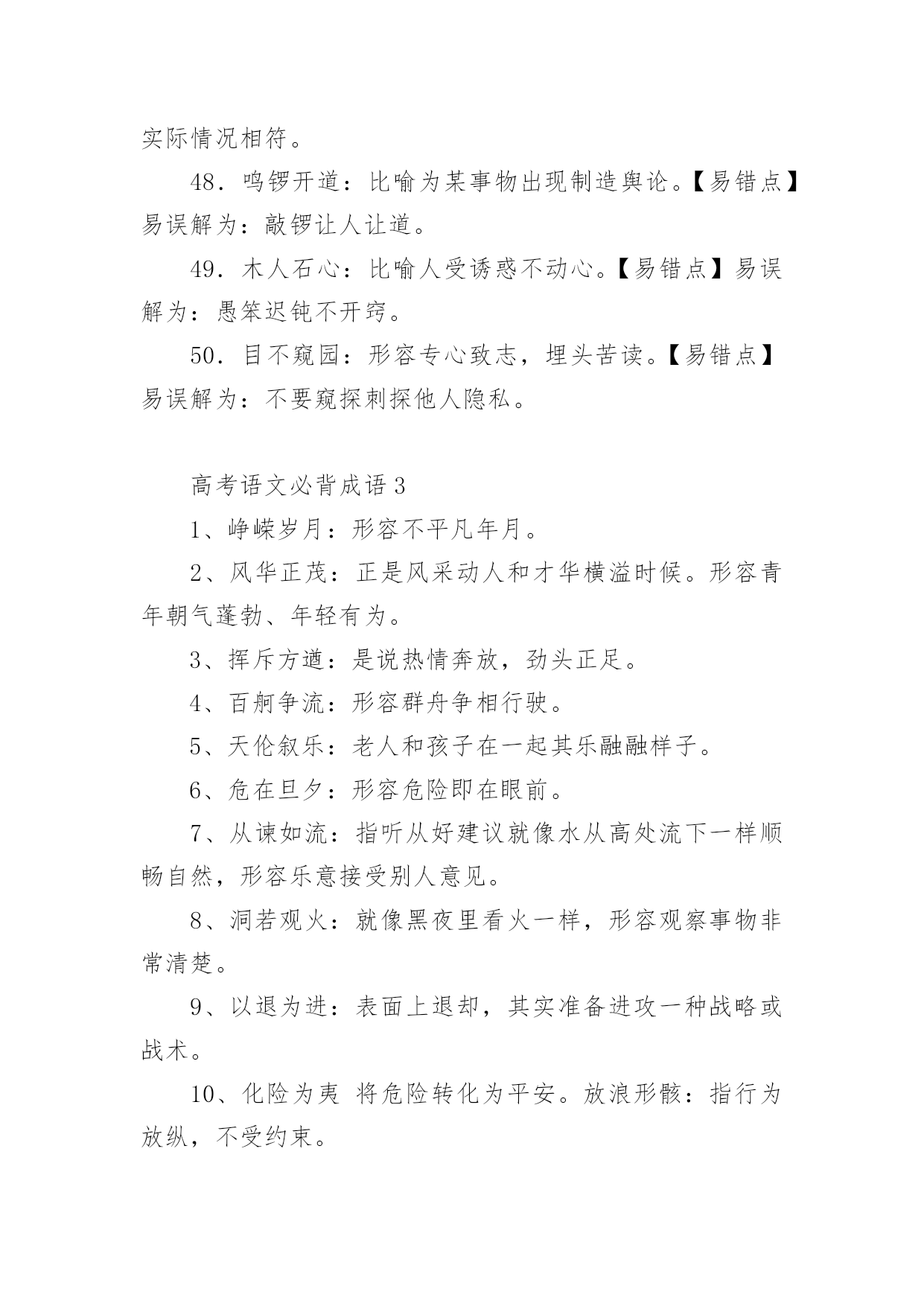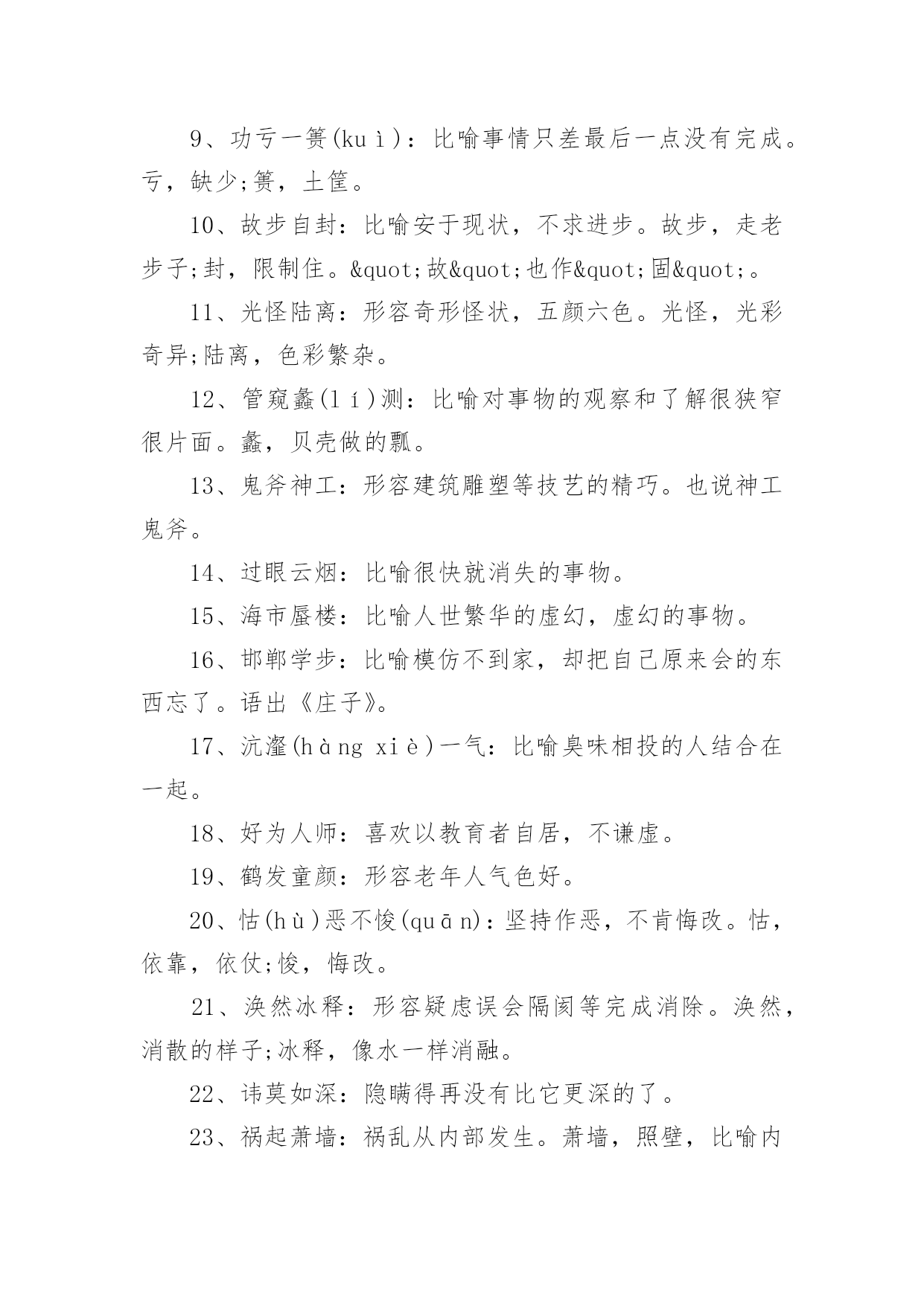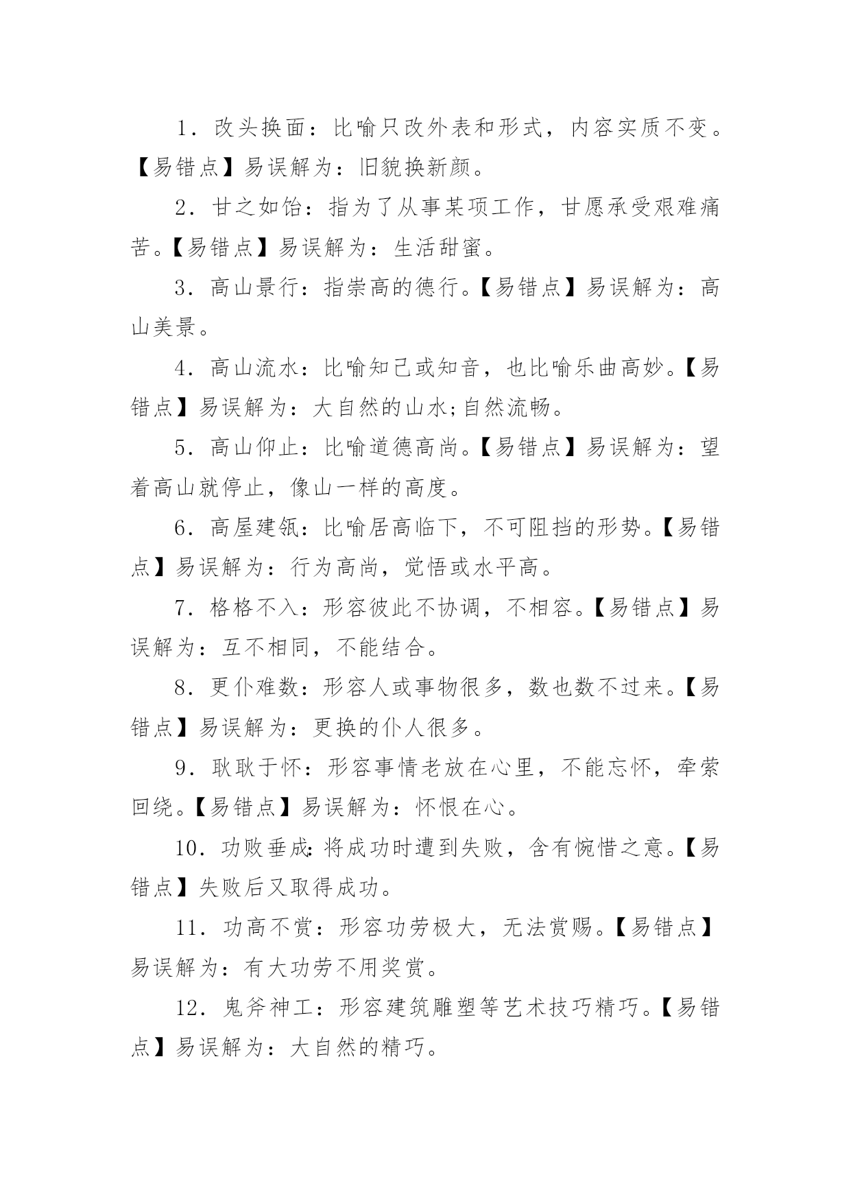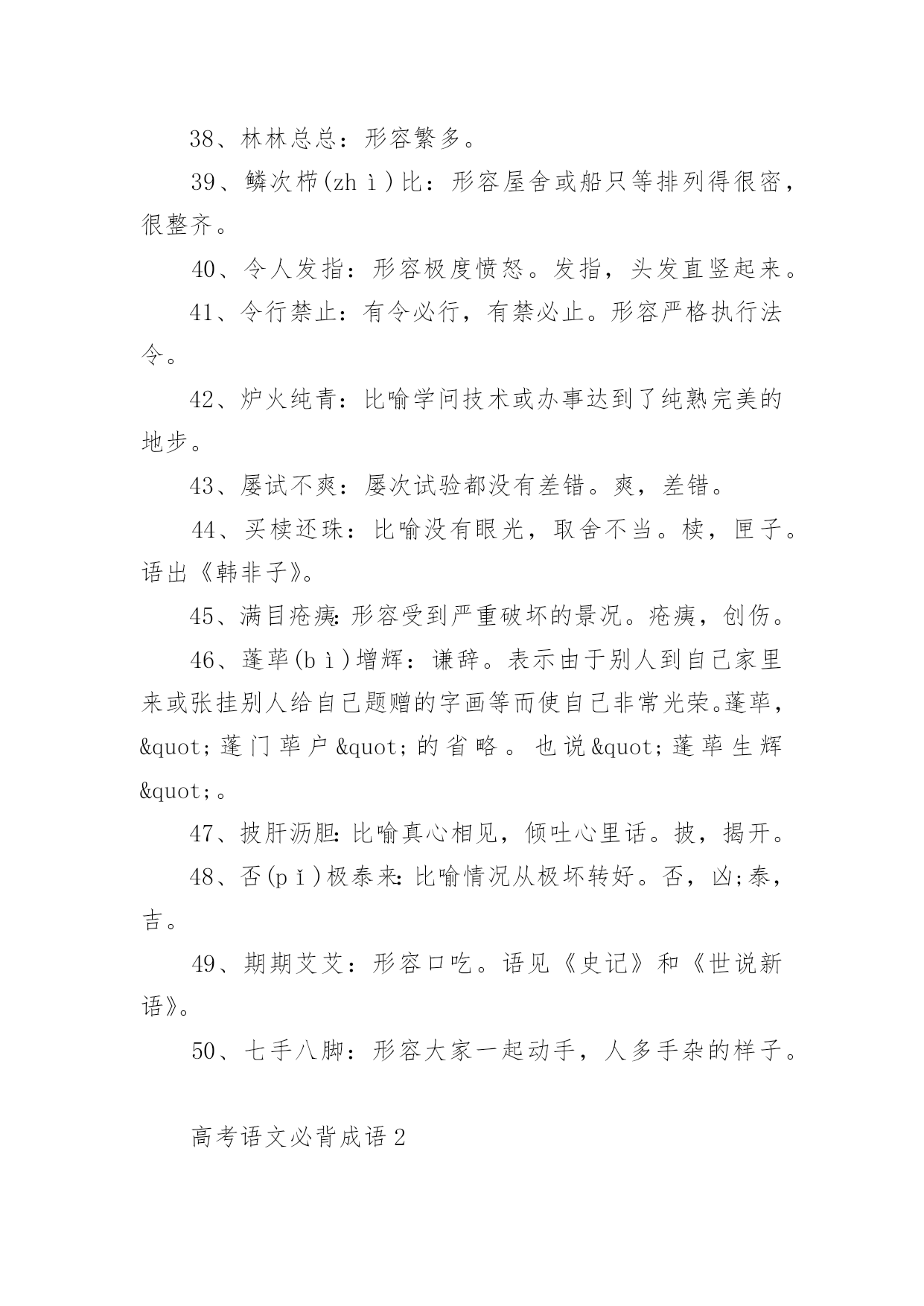 高考语文必背成语在日常生活或是工作学习中,大家都经常接触到成语吧,成语是中国传统文化的一大特色,在语句中是作为一个整体来应用的,承担主语、宾语、定语等成分。还苦于找不到优秀的成语?下面是小编收集整理的高考语文必背成语,欢迎阅读与收藏。高考语文必背成语11、纷至沓来:纷纷到来,连续不断地到来。2、粉墨登场:化妆上台演戏。今多比喻登上政治舞台(含讥讽意)。3、俯拾皆是:只要弯下身子来捡,到处都是。形容地上的某一些东西要找的某一类例证文章中的错别字等很多。也说"俯拾即是"。4、感同身受:心里很感谢,如同亲身感受到恩惠一样。多用于代人向对方致谢。5、高屋建瓴(líng):形容居高临下,不可阻挡的形势。建,倾倒;瓴,水瓶。6、革故鼎新:去掉旧的,建立新的。7、各行其是:各自按照自己以为正确的一套做。是,对,正确。8、狗尾续貂:比喻拿不好的东西接到好的东西后面,显得好坏不相称(多指文学作品)。9、功亏一篑(kuì):比喻事情只差最后一点没有完成。亏,缺少;篑,土筐。10、故步自封:比喻安于现状,不求进步。故步,走老步子;封,限制住。"故"也作"固"。11、光怪陆离:形容奇形怪状,五颜六色。光怪,光彩奇异;陆离,色彩繁杂。12、管窥蠡(lí)测:比喻对事物的观察和了解很狭窄很片面。蠡,贝壳做的瓢。13、鬼斧神工:形容建筑雕塑等技艺的精巧。也说神工鬼斧。14、过眼云烟:比喻很快就消失的事物。15、海市蜃楼:比喻人世繁华的虚幻,虚幻的事物。16、邯郸学步:比喻模仿不到家,却把自己原来会的东西忘了。语出《庄子》。17、沆瀣(hàngxiè)一气:比喻臭味相投的人结合在一起。18、好为人师:喜欢以教育者自居,不谦虚。19、鹤发童颜:形容老年人气色好。20、怙(hù)恶不悛(quān):坚持作恶,不肯悔改。怙,依靠,依仗;悛,悔改。21、涣然冰释:形容疑虑误会隔阂等完成消除。涣然,消散的样子;冰释,像水一样消融。22、讳莫如深:隐瞒得再没有比它更深的了。23、祸起萧墙:祸乱从内部发生。萧墙,照壁,比喻内部。24、济济(jǐ)一堂:形容很多有才能的人聚含有在一起。济济,众多。25、集腋成裘:积少可以成多。26、计日程功:可以数着日子计算进度。形容在较短期间就可以成功。程,计算。27、间(jiān)不容发:距离极近,中间不能放进一根头发。比喻情势危急到了极点。28、()见微知著:见到微小的迹象,就能察知发展的趋势。微,小,指刚显露出的苗头;著,明显。29、江郎才尽:比喻才思枯竭。30、江河日下:江河的水天天向下游流。比喻情况一天天坏下去。31、胶柱鼓瑟(sè):比喻拘泥固执,不知变通。柱瑟上调弦的.短木,被粘住,就不能调整音高。32、金科玉律:必须遵守不能改烃的信条。多含贬义。33、开门揖盗:比喻引进坏人,自招祸患。揖,作揖,表示欢迎。34、空穴来风:有了洞穴才有风进来。比喻消息和传说不是完全没有原因的。35、梁上君子:代称窃贼。语见《后汉书》。36、两小无猜:男女小的时候在一起玩耍,天真烂漫,没有猜疑。37、廖若晨星:稀少得好像早晨的星星。38、林林总总:形容繁多。39、鳞次栉(zhì)比:形容屋舍或船只等排列得很密,很整齐。40、令人发指:形容极度愤怒。发指,头发直竖起来。41、令行禁止:有令必行,有禁必止。形容严格执行法令。42、炉火纯青:比喻学问技术或办事达到了纯熟完美的地步。43、屡试不爽:屡次试验都没有差错。爽,差错。44、买椟还珠:比喻没有眼光,取舍不当。椟,匣子。语出《韩非子》。45、满目疮痍:形容受到严重破坏的景况。疮痍,创伤。46、蓬荜(bì)增辉:谦辞。表示由于别人到自己家里来或张挂别人给自己题赠的字画等而使自己非常光荣。蓬荜,"蓬门荜户"的省略。也说"蓬荜生辉"。47、披肝沥胆:比喻真心相见,倾吐心里话。披,揭开。48、否(pǐ)极泰来:比喻情况从极坏转好。否,凶;泰,吉。49、期期艾艾:形容口吃。语见《史记》和《世说新语》。50、七手八脚:形容大家一起动手,人多手杂的样子。高考语文必背成语21.改头换面:比喻只改外表和形式,内容实质不变。【易错点】易误解为:旧貌换新颜。2.甘之如饴:指为了从事某项工作,甘愿承受艰难痛苦。【易错点】易误解为:生活甜蜜。3.高山景行:指崇高的德行。【易错点】易误解为:高山美景。4.高山流水:比喻知己或知音,也比喻乐曲高妙。【易错点】易误解为:大自然的山水;自然流畅。5.高山仰止:比喻道德高尚。【易错点】易误解为:望着高山就停止,像山一样的高度。6.高屋建瓴:比喻居高临下,不可阻挡的形势。【易错点】易误解为:行为高尚,觉悟或水平高。7.格格不入:形容彼此不协调,不相容。【易错点】易误解为:互不相同,