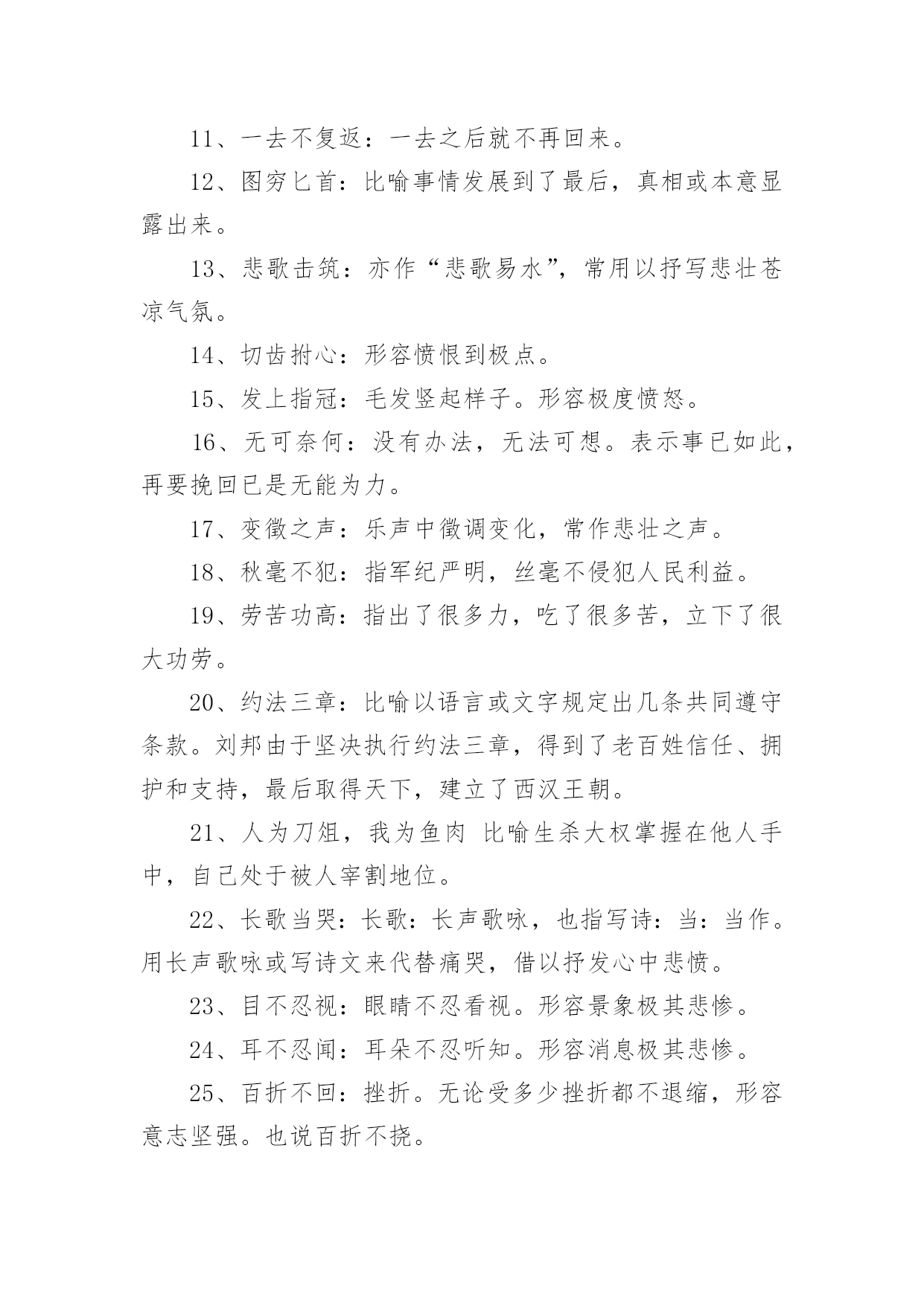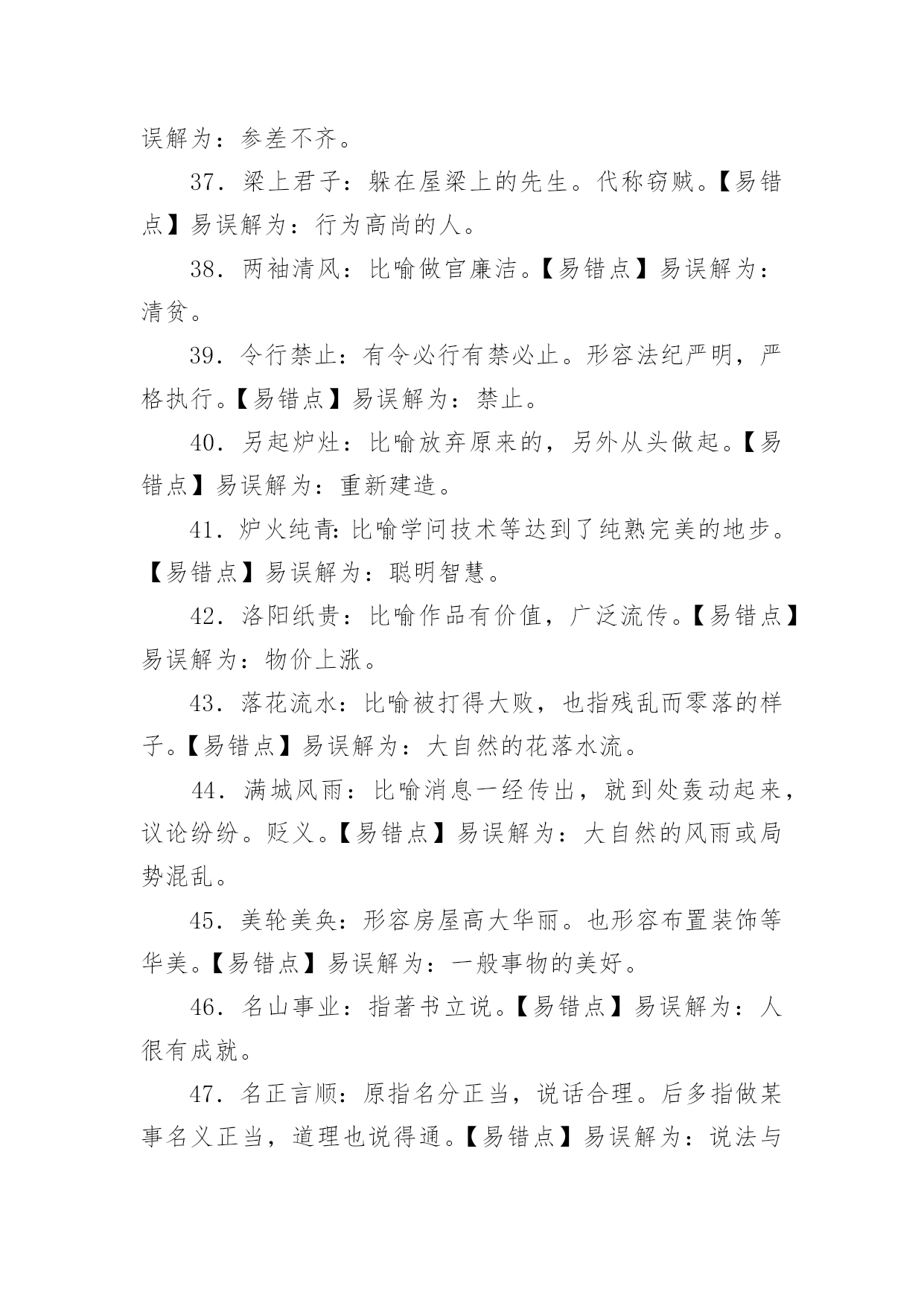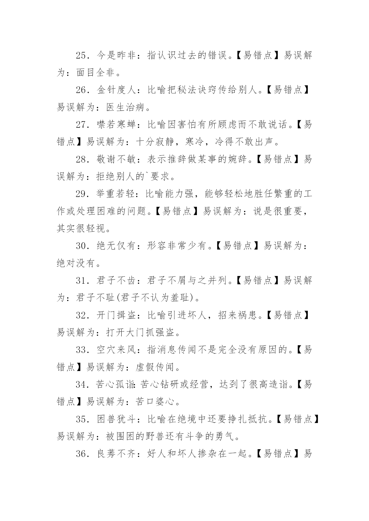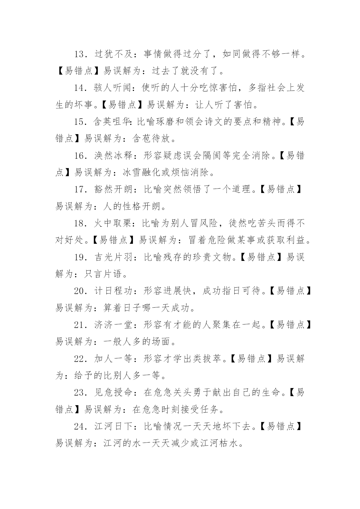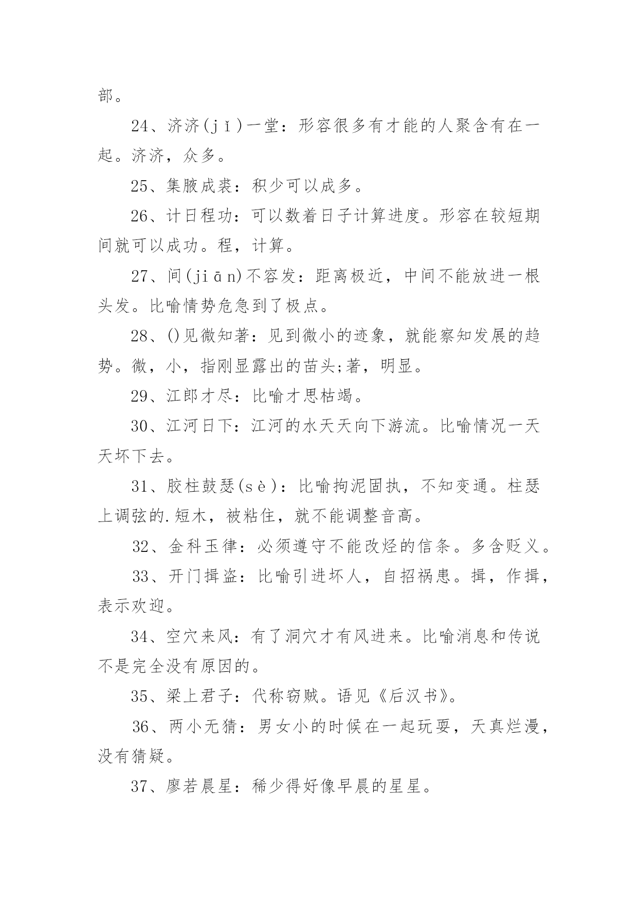 高考语文必背成语在日常生活或是工作学习中,大家都经常接触到成语吧,成语是中国传统文化的一大特色,在语句中是作为一个整体来应用的,承担主语、宾语、定语等成分。还苦于找不到优秀的成语?下面是小编收集整理的高考语文必背成语,欢迎阅读与收藏。高考语文必背成语11、纷至沓来:纷纷到来,连续不断地到来。2、粉墨登场:化妆上台演戏。今多比喻登上政治舞台(含讥讽意)。3、俯拾皆是:只要弯下身子来捡,到处都是。形容地上的某一些东西要找的某一类例证文章中的错别字等很多。也说"俯拾即是"。4、感同身受:心里很感谢,如同亲身感受到恩惠一样。多用于代人向对方致谢。5、高屋建瓴(líng):形容居高临下,不可阻挡的形势。建,倾倒;瓴,水瓶。6、革故鼎新:去掉旧的,建立新的。7、各行其是:各自按照自己以为正确的一套做。是,对,正确。8、狗尾续貂:比喻拿不好的东西接到好的东西后面,显得好坏不相称(多指文学作品)。9、功亏一篑(kuì):比喻事情只差最后一点没有完成。亏,缺少;篑,土筐。10、故步自封:比喻安于现状,不求进步。故步,走老步子;封,限制住。"故"也作"固"。11、光怪陆离:形容奇形怪状,五颜六色。光怪,光彩奇异;陆离,色彩繁杂。12、管窥蠡(lí)测:比喻对事物的观察和了解很狭窄很片面。蠡,贝壳做的瓢。13、鬼斧神工:形容建筑雕塑等技艺的精巧。也说神工鬼斧。14、过眼云烟:比喻很快就消失的事物。15、海市蜃楼:比喻人世繁华的虚幻,虚幻的事物。16、邯郸学步:比喻模仿不到家,却把自己原来会的东西忘了。语出《庄子》。17、沆瀣(hàngxiè)一气:比喻臭味相投的人结合在一起。18、好为人师:喜欢以教育者自居,不谦虚。19、鹤发童颜:形容老年人气色好。20、怙(hù)恶不悛(quān):坚持作恶,不肯悔改。怙,依靠,依仗;悛,悔改。21、涣然冰释:形容疑虑误会隔阂等完成消除。涣然,消散的样子;冰释,像水一样消融。22、讳莫如深:隐瞒得再没有比它更深的了。23、祸起萧墙:祸乱从内部发生。萧墙,照壁,比喻内部。24、济济(jǐ)一堂:形容很多有才能的人聚含有在一起。济济,众多。25、集腋成裘:积少可以成多。26、计日程功:可以数着日子计算进度。形容在较短期间就可以成功。程,计算。27、间(jiān)不容发:距离极近,中间不能放进一根头发。比喻情势危急到了极点。28、()见微知著:见到微小的迹象,就能察知发展的趋势。微,小,指刚显露出的苗头;著,明显。29、江郎才尽:比喻才思枯竭。30、江河日下:江河的水天天向下游流。比喻情况一天天坏下去。31、胶柱鼓瑟(sè):比喻拘泥固执,不知变通。柱瑟上调弦的.短木,被粘住,就不能调整音高。32、金科玉律:必须遵守不能改烃的信条。多含贬义。33、开门揖盗:比喻引进坏人,自招祸患。揖,作揖,表示欢迎。34、空穴来风:有了洞穴才有风进来。比喻消息和传说不是完全没有原因的。35、梁上君子:代称窃贼。语见《后汉书》。36、两小无猜:男女小的时候在一起玩耍,天真烂漫,没有猜疑。37、廖若晨星:稀少得好像早晨的星星。38、林林总总:形容繁多。39、鳞次栉(zhì)比:形容屋舍或船只等排列得很密,很整齐。40、令人发指:形容极度愤怒。发指,头发直竖起来。41、令行禁止:有令必行,有禁必止。形容严格执行法令。42、炉火纯青:比喻学问技术或办事达到了纯熟完美的地步。43、屡试不爽:屡次试验都没有差错。爽,差错。44、买椟还珠:比喻没有眼光,取舍不当。椟,匣子。语出《韩非子》。45、满目疮痍:形容受到严重破坏的景况。疮痍,创伤。46、蓬荜(bì)增辉:谦辞。表示由于别人到自己家里来或张挂别人给自己题赠的字画等而使自己非常光荣。蓬荜,"蓬门荜户"的省略。也说"蓬荜生辉"。47、披肝沥胆:比喻真心相见,倾吐心里话。披,揭开。48、否(pǐ)极泰来:比喻情况从极坏转好。否,凶;泰,吉。49、期期艾艾:形容口吃。语见《史记》和《世说新语》。50、七手八脚:形容大家一起动手,人多手杂的样子。高考语文必背成语21.改头换面:比喻只改外表和形式,内容实质不变。【易错点】易误解为:旧貌换新颜。2.甘之如饴:指为了从事某项工作,甘愿承受艰难痛苦。【易错点】易误解为:生活甜蜜。3.高山景行:指崇高的德行。【易错点】易误解为:高山美景。4.高山流水:比喻知己或知音,也比喻乐曲高妙。【易错点】易误解为:大自然的山水;自然流畅。5.高山仰止:比喻道德高尚。【易错点】易误解为:望着高山就停止,像山一样的高度。6.高屋建瓴:比喻居高临下,不可阻挡的形势。【易错点】易误解为:行为高尚,觉悟或水平高。7.格格不入:形容彼此不协调,不相容。【易错点】易误解为:互不相同,