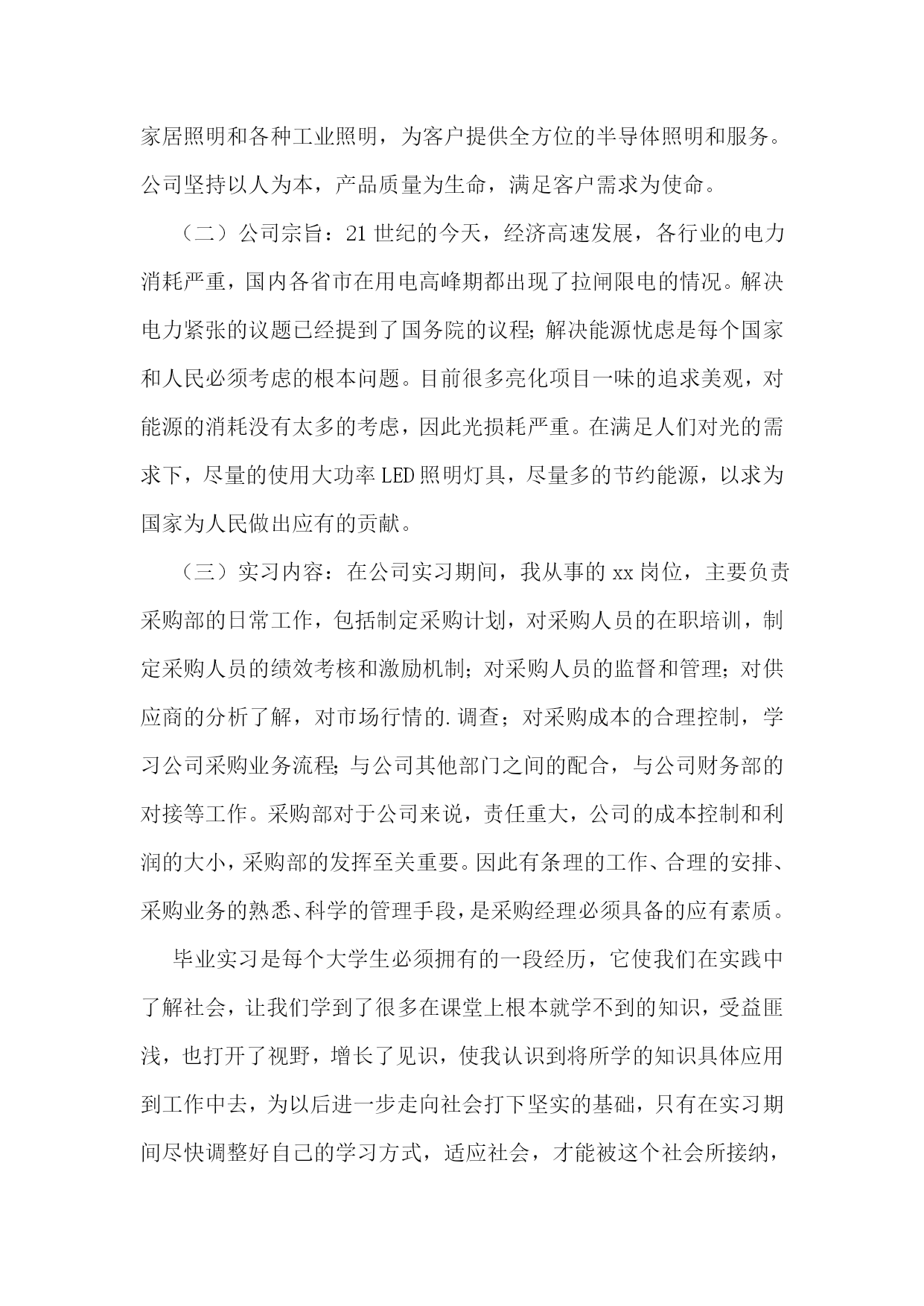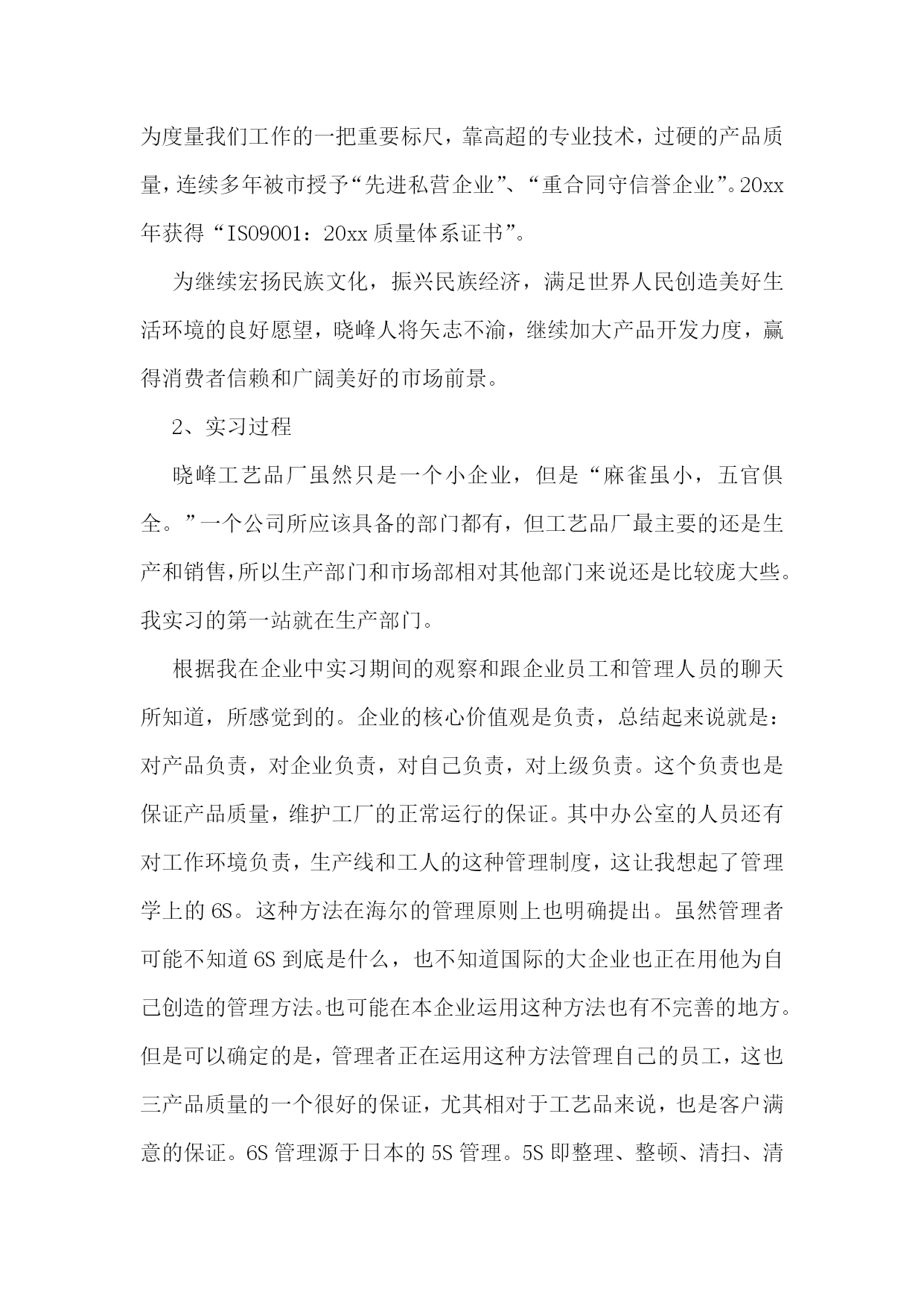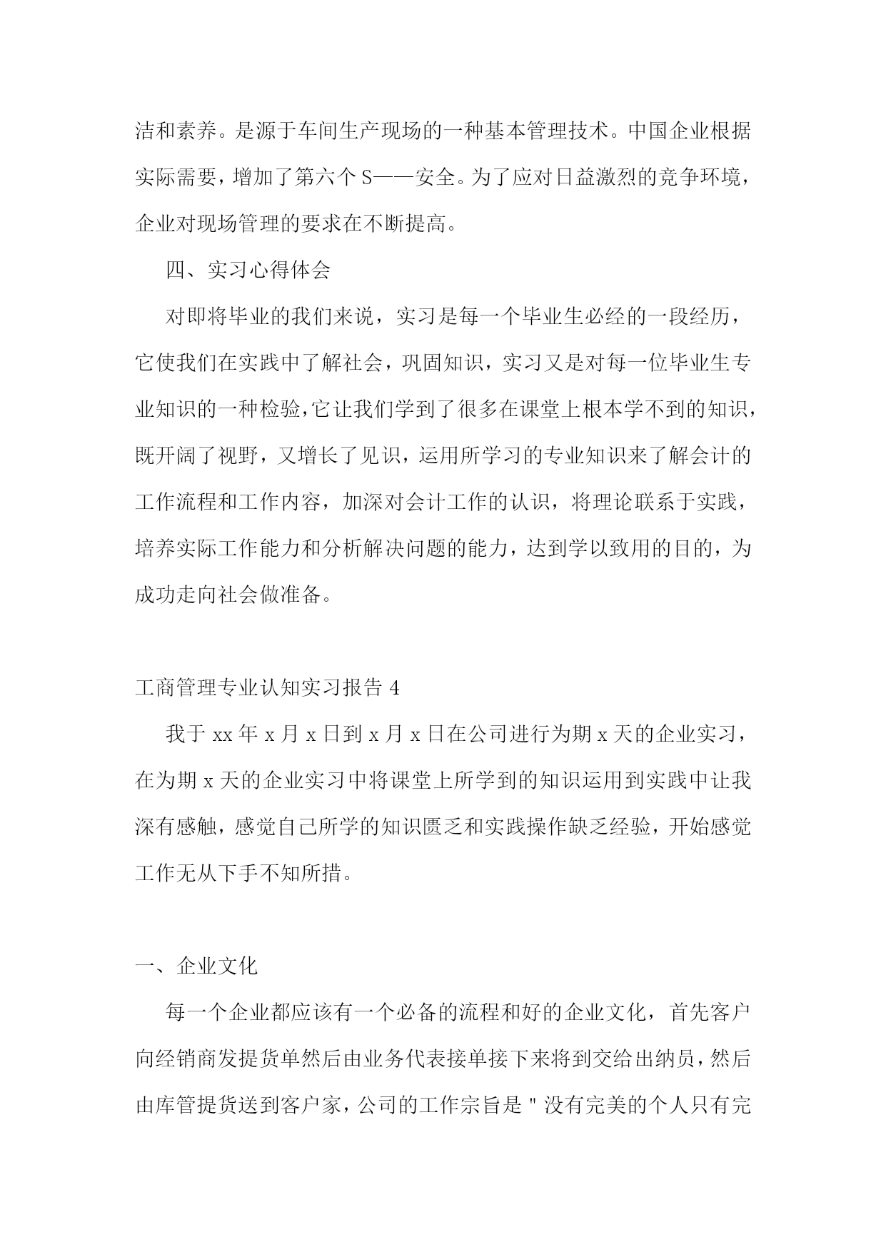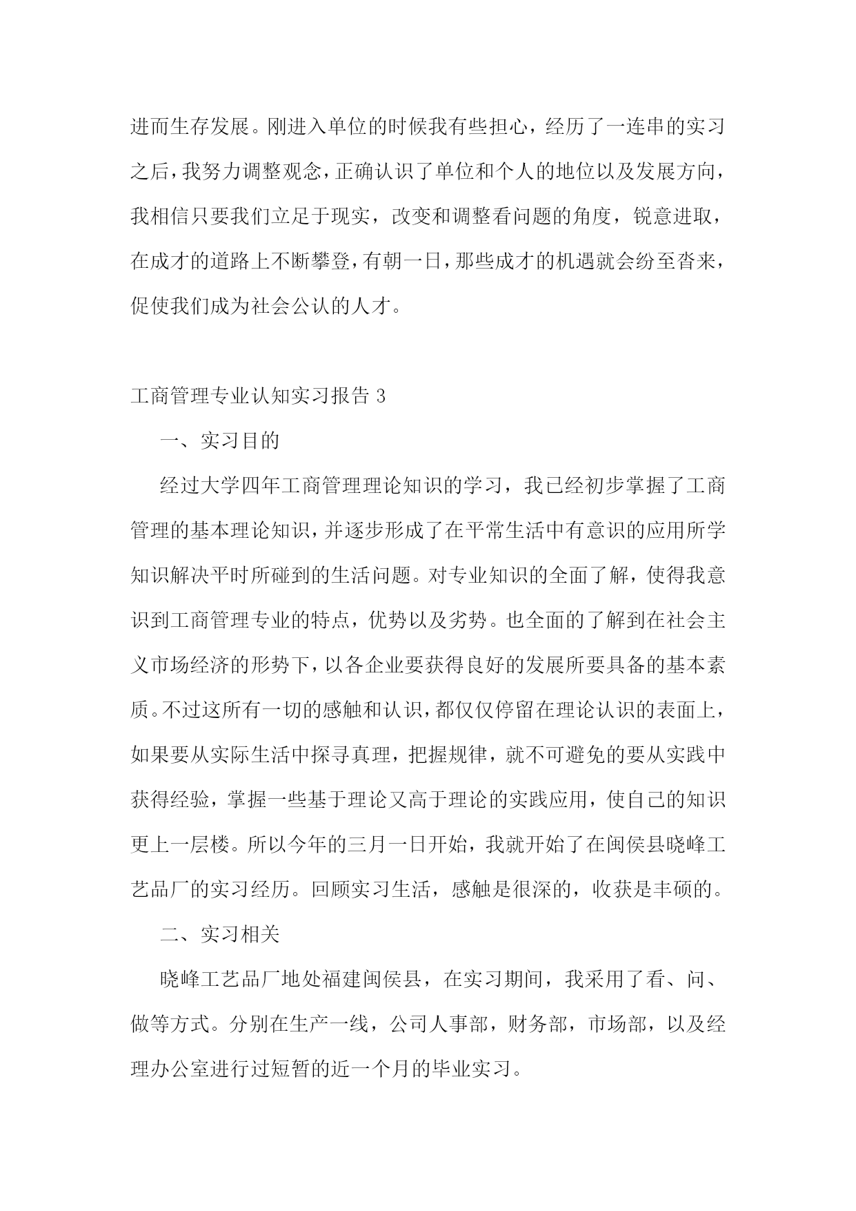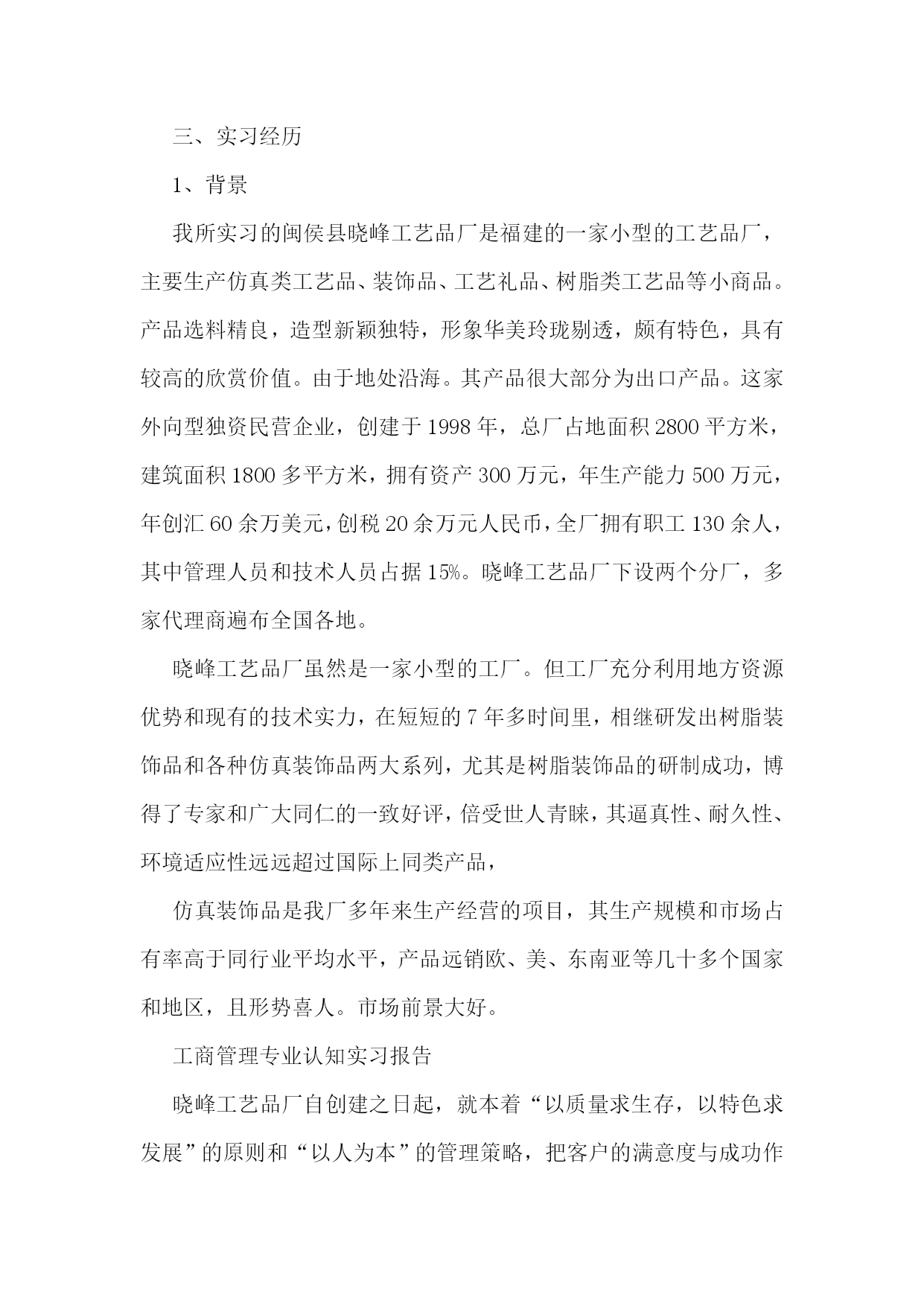 工商管理专业认知实习报告工商管理专业认知实习报告2一、实习目的了解工商企业管理的先进方式和现代化管理方法,提高调查研究、文献检索和搜集资料的能力,提高理论与实际相结合的能力,提高协同合作及组织工作的能力,培养独立分析问题和解决实际问题的能力。二、实习时间20xx.x.x——20xx.x.x。三、实习地点xx市。四、实习单位xx公司。实习部门。xx部。五、实习主要内容(一)公司是一家专业从事大功率LED照明灯具集研发、生产、销售为一体的专业公司。其产品涵盖了工程(商业)户外和室内照明、家居照明和各种工业照明,为客户提供全方位的半导体照明和服务。公司坚持以人为本,产品质量为生命,满足客户需求为使命。(二)公司宗旨:21世纪的今天,经济高速发展,各行业的电力消耗严重,国内各省市在用电高峰期都出现了拉闸限电的情况。解决电力紧张的议题已经提到了国务院的议程;解决能源忧虑是每个国家和人民必须考虑的根本问题。目前很多亮化项目一味的追求美观,对能源的消耗没有太多的考虑,因此光损耗严重。在满足人们对光的需求下,尽量的使用大功率LED照明灯具,尽量多的节约能源,以求为国家为人民做出应有的贡献。(三)实习内容:在公司实习期间,我从事的xx岗位,主要负责采购部的日常工作,包括制定采购计划,对采购人员的在职培训,制定采购人员的绩效考核和激励机制;对采购人员的监督和管理;对供应商的分析了解,对市场行情的.调查;对采购成本的合理控制,学习公司采购业务流程;与公司其他部门之间的配合,与公司财务部的对接等工作。采购部对于公司来说,责任重大,公司的成本控制和利润的大小,采购部的发挥至关重要。因此有条理的工作、合理的安排、采购业务的熟悉、科学的管理手段,是采购经理必须具备的应有素质。毕业实习是每个大学生必须拥有的一段经历,它使我们在实践中了解社会,让我们学到了很多在课堂上根本就学不到的知识,受益匪浅,也打开了视野,增长了见识,使我认识到将所学的知识具体应用到工作中去,为以后进一步走向社会打下坚实的基础,只有在实习期间尽快调整好自己的学习方式,适应社会,才能被这个社会所接纳,进而生存发展。刚进入单位的时候我有些担心,经历了一连串的实习之后,我努力调整观念,正确认识了单位和个人的地位以及发展方向,我相信只要我们立足于现实,改变和调整看问题的角度,锐意进取,在成才的道路上不断攀登,有朝一日,那些成才的机遇就会纷至沓来,促使我们成为社会公认的人才。工商管理专业认知实习报告3一、实习目的经过大学四年工商管理理论知识的学习,我已经初步掌握了工商管理的基本理论知识,并逐步形成了在平常生活中有意识的应用所学知识解决平时所碰到的生活问题。对专业知识的全面了解,使得我意识到工商管理专业的特点,优势以及劣势。也全面的了解到在社会主义市场经济的形势下,以各企业要获得良好的发展所要具备的基本素质。不过这所有一切的感触和认识,都仅仅停留在理论认识的表面上,如果要从实际生活中探寻真理,把握规律,就不可避免的要从实践中获得经验,掌握一些基于理论又高于理论的实践应用,使自己的知识更上一层楼。所以今年的三月一日开始,我就开始了在闽侯县晓峰工艺品厂的实习经历。回顾实习生活,感触是很深的,收获是丰硕的。二、实习相关晓峰工艺品厂地处福建闽侯县,在实习期间,我采用了看、问、做等方式。分别在生产一线,公司人事部,财务部,市场部,以及经理办公室进行过短暂的近一个月的毕业实习。三、实习经历1、背景我所实习的闽侯县晓峰工艺品厂是福建的一家小型的工艺品厂,主要生产仿真类工艺品、装饰品、工艺礼品、树脂类工艺品等小商品。产品选料精良,造型新颖独特,形象华美玲珑剔透,颇有特色,具有较高的欣赏价值。由于地处沿海。其产品很大部分为出口产品。这家外向型独资民营企业,创建于1998年,总厂占地面积2800平方米,建筑面积1800多平方米,拥有资产300万元,年生产能力500万元,年创汇60余万美元,创税20余万元人民币,全厂拥有职工130余人,其中管理人员和技术人员占据15%。晓峰工艺品厂下设两个分厂,多家代理商遍布全国各地。晓峰工艺品厂虽然是一家小型的工厂。但工厂充分利用地方资源优势和现有的技术实力,在短短的7年多时间里,相继研发出树脂装饰品和各种仿真装饰品两大系列,尤其是树脂装饰品的研制成功,博得了专家和广大同仁的一致好评,倍受世人青睐,其逼真性、耐久性、环境适应性远远超过国际上同类产品,仿真装饰品是我厂多年来生产经营的项目,其生产规模和市场占有率高于同行业平均水平,产品远销欧、美、东南亚等几十多个国家和地区,且形势喜人。市场前景大好。工商管理专业认知实习报告晓峰工艺品厂自创建之日起,就本着“以质量求生存,以特色求发展”的原则和“以人为本”的管理策略,把客户的