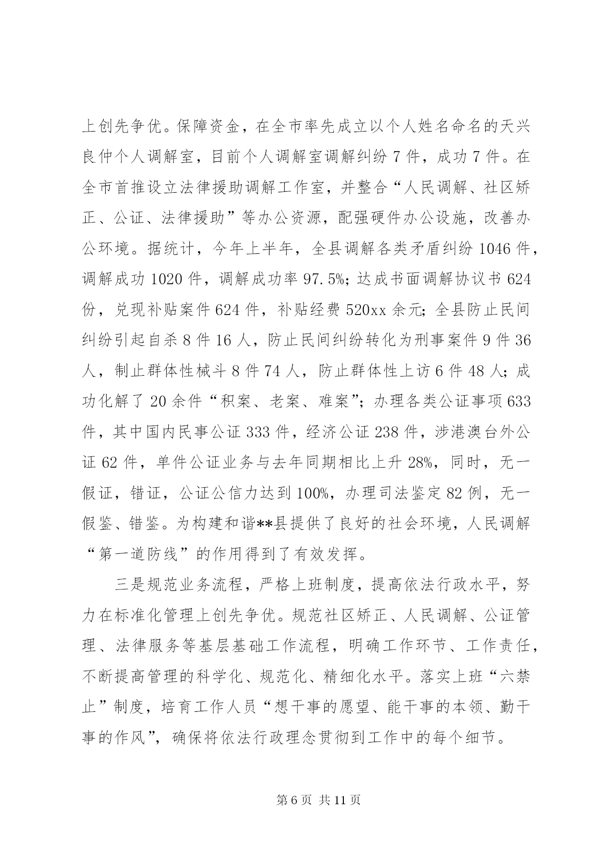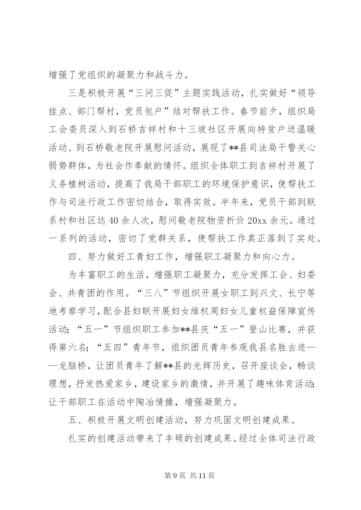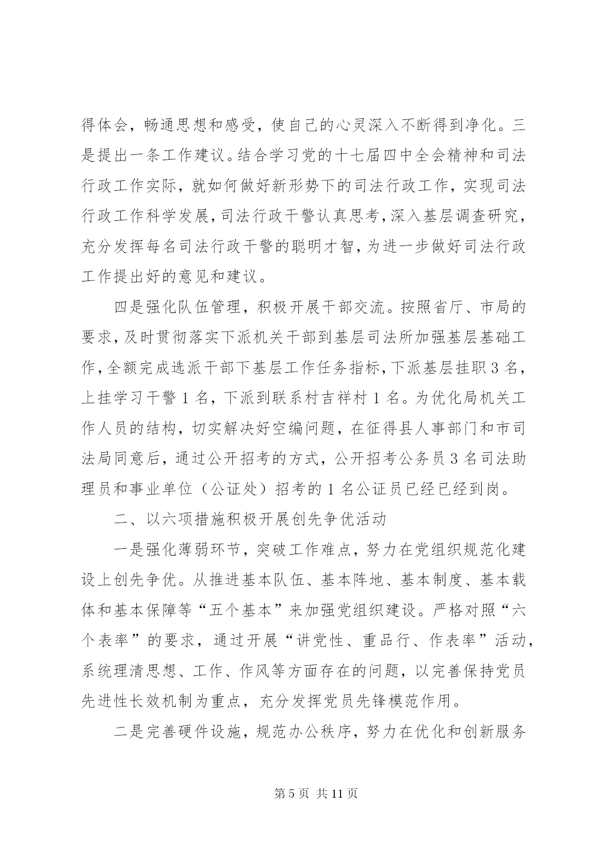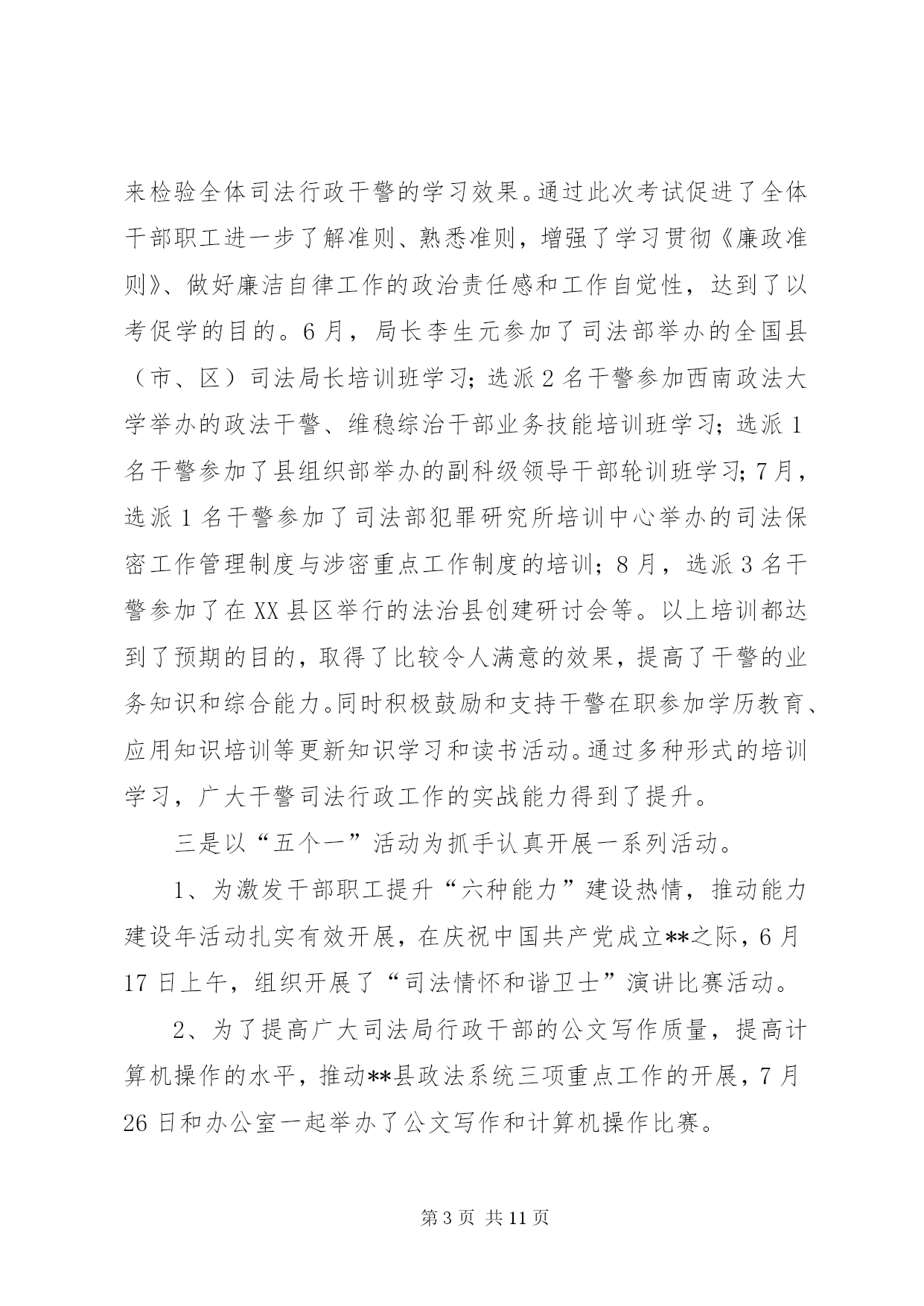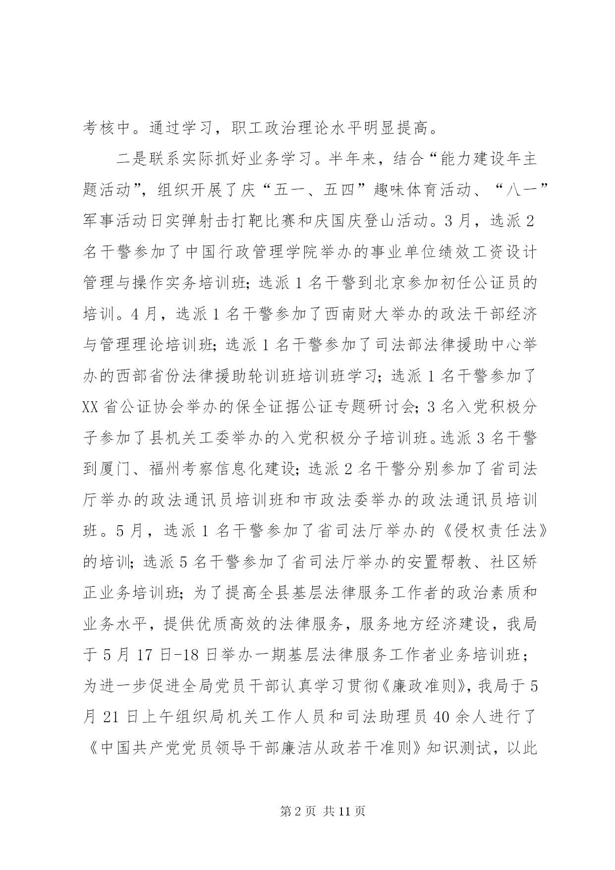 第PAGE\*Arabic\*MERGEFORMAT11页共NUMPAGES\*MERGEFORMAT11页县司法局政治处工作总结20xx年,我局政工工作以邓小平理论、“三个代表”重要思想和科学发展观为指导,认真贯彻党的十七大、十七届四中、五中全会、省委九届七次全会XX县区委有关会议精神,积极贯彻落实全国司法厅(局)长会议、全省司法行政工作会议和全市政法工作的部署,以“能力建设年”主题活动、“基层党组织建设年”活动、创先争优活动和“三项”制度建设为载体,全面参与“三项重点工作”,切实加强“三项重点建设”,不断完善“三大机制”,积极围绕司法行政中心工作,以加强效能建设,推进规范化管理,促进队伍素质的整体提高为目标,围绕局党组工作大局,认真贯彻落实局党组各项工作任务。一、认真开展“能力建设年”主题活动,全面提高队伍素质一年来,政工科按照局党组和上级主管部门的的要求,结合“能力建设年”主题活动,切实加强司法行政队伍建设工作。一是强化政治理论学习。半年来,通过集中学习和自学等形式,认真组织开展了以十七大、十七届四中、五中全会精神和《党章》、科学发展观、社会主义法治理念等为主要内容的政治理论学习和讨论活动,将《无法改变事情可以改变心情》等读本发放给每个部门,要求机关全体职工一年读一本好书并记一万字读书笔记,写一篇有价值文章学习心得。政工科对职工参加学习、培训的情况进行登记,建立学习档案,并将职工的学习纳入年度考核中。通过学习,职工政治理论水平明显提高。二是联系实际抓好业务学习。半年来,结合“能力建设年主题活动”,组织开展了庆“五一、五四”趣味体育活动、“八一”军事活动日实弹射击打靶比赛和庆国庆登山活动。3月,选派2名干警参加了中国行政管理学院举办的事业单位绩效工资设计管理与操作实务培训班;选派1名干警到北京参加初任公证员的培训。4月,选派1名干警参加了西南财大举办的政法干部经济与管理理论培训班;选派1名干警参加了司法部法律援助中心举办的西部省份法律援助轮训班培训班学习;选派1名干警参加了XX省公证协会举办的保全证据公证专题研讨会;3名入党积极分子参加了县机关工委举办的入党积极分子培训班。选派3名干警到厦门、福州考察信息化建设;选派2名干警分别参加了省司法厅举办的政法通讯员培训班和市政法委举办的政法通讯员培训班。5月,选派1名干警参加了省司法厅举办的《侵权责任法》的培训;选派5名干警参加了省司法厅举办的安置帮教、社区矫正业务培训班;为了提高全县基层法律服务工作者的政治素质和业务水平,提供优质高效的法律服务,服务地方经济建设,我局于5月17日-18日举办一期基层法律服务工作者业务培训班;为进一步促进全局党员干部认真学习贯彻《廉政准则》,我局于5月21日上午组织局机关工作人员和司法助理员40余人进行了《中国共产党党员领导干部廉洁从政若干准则》知识测试,以此来检验全体司法行政干警的学习效果。通过此次考试促进了全体干部职工进一步了解准则、熟悉准则,增强了学习贯彻《廉政准则》、做好廉洁自律工作的政治责任感和工作自觉性,达到了以考促学的目的。6月,局长李生元参加了司法部举办的全国县(市、区)司法局长培训班学习;选派2名干警参加西南政法大学举办的政法干警、维稳综治干部业务技能培训班学习;选派1名干警参加了县组织部举办的副科级领导干部轮训班学习;7月,选派1名干警参加了司法部犯罪研究所培训中心举办的司法保密工作管理制度与涉密重点工作制度的培训;8月,选派3名干警参加了在XX县区举行的法治县创建研讨会等。以上培训都达到了预期的目的,取得了比较令人满意的效果,提高了干警的业务知识和综合能力。同时积极鼓励和支持干警在职参加学历教育、应用知识培训等更新知识学习和读书活动。通过多种形式的培训学习,广大干警司法行政工作的实战能力得到了提升。三是以“五个一”活动为抓手认真开展一系列活动。1、为激发干部职工提升“六种能力”建设热情,推动能力建设年活动扎实有效开展,在庆祝中国共产党成立**之际,6月17日上午,组织开展了“司法情怀和谐卫士”演讲比赛活动。2、为了提高广大司法局行政干部的公文写作质量,提高计算机操作的水平,推动**县政法系统三项重点工作的开展,7月26日和办公室一起举办了公文写作和计算机操作比赛。3、为进一步推进并深化“五五普法”,提高律师的素质,7月21日下午,与公律科一起举办了首届律师辩论赛。4、组织全局干警进一步深入查找思想作风、学习作风、工作作风、领导作风和生活作风等方面的问题,积极在全局干警中开展“三个一”主题实践活动,即:到红色革命圣地开展一次革命传统教育(4月初组织部分干警到邓小平故居和华蓥山革命老区接受革命传统教育);开展一次访贫问苦县司法局政治处工作总结活动(6月底,结合建党89周年纪念日组织机关干警到联系村开展访