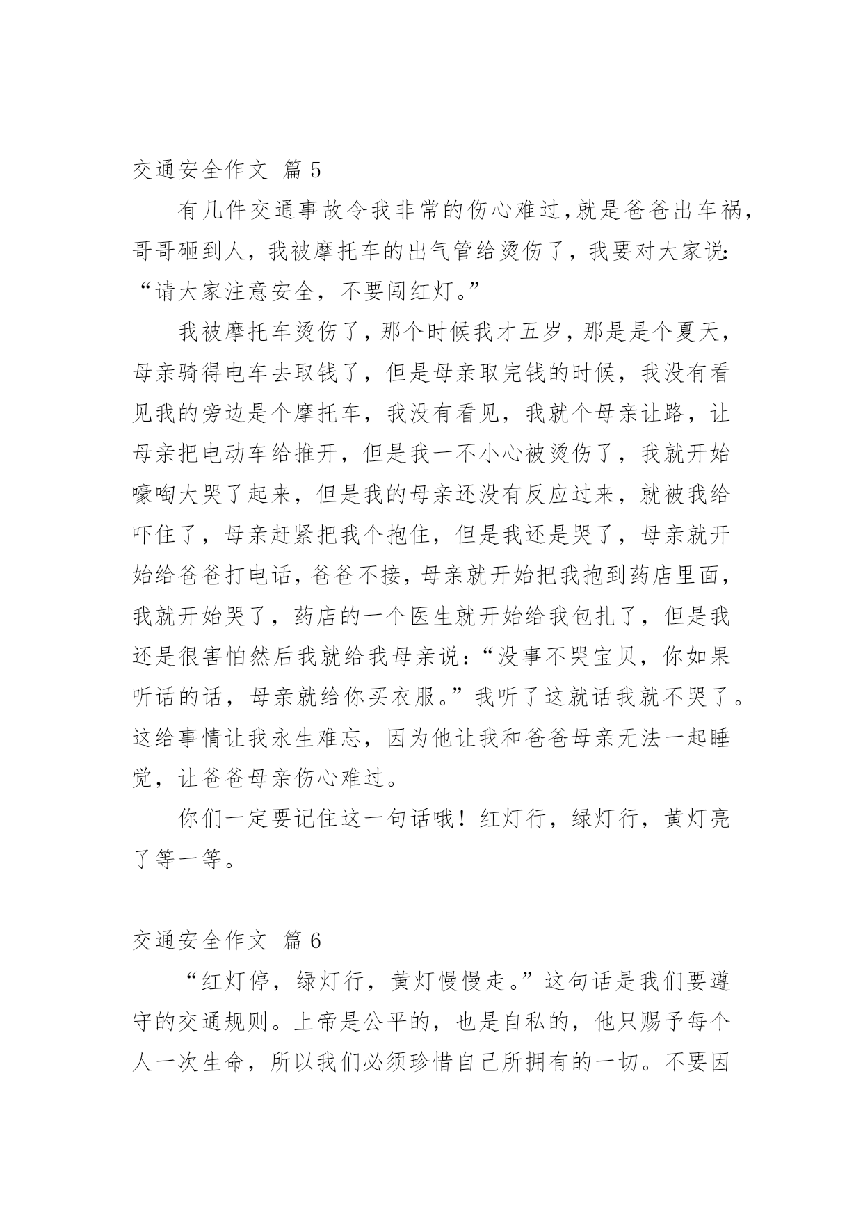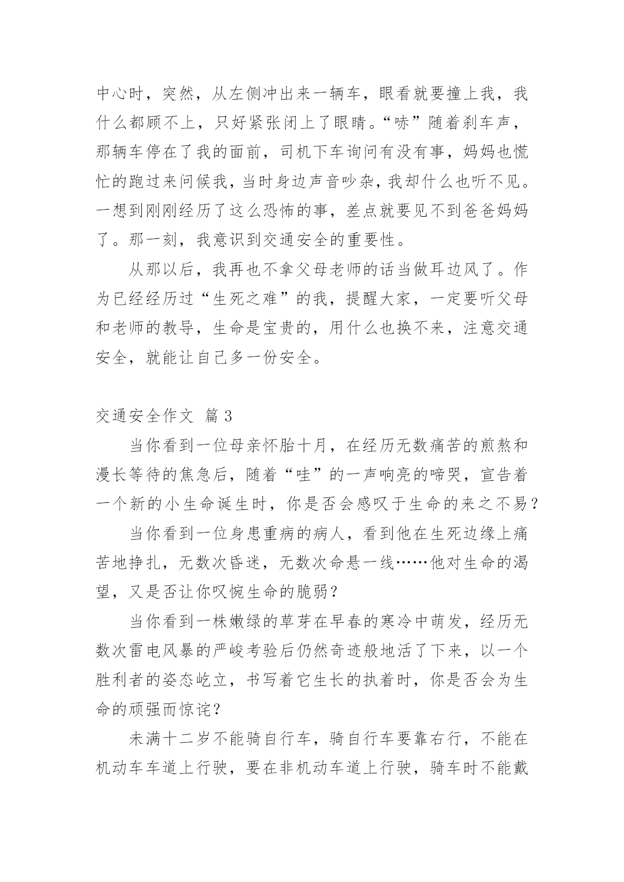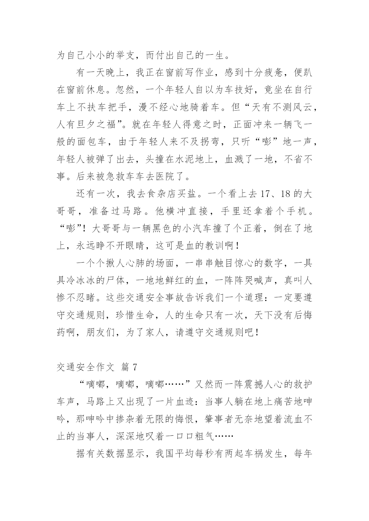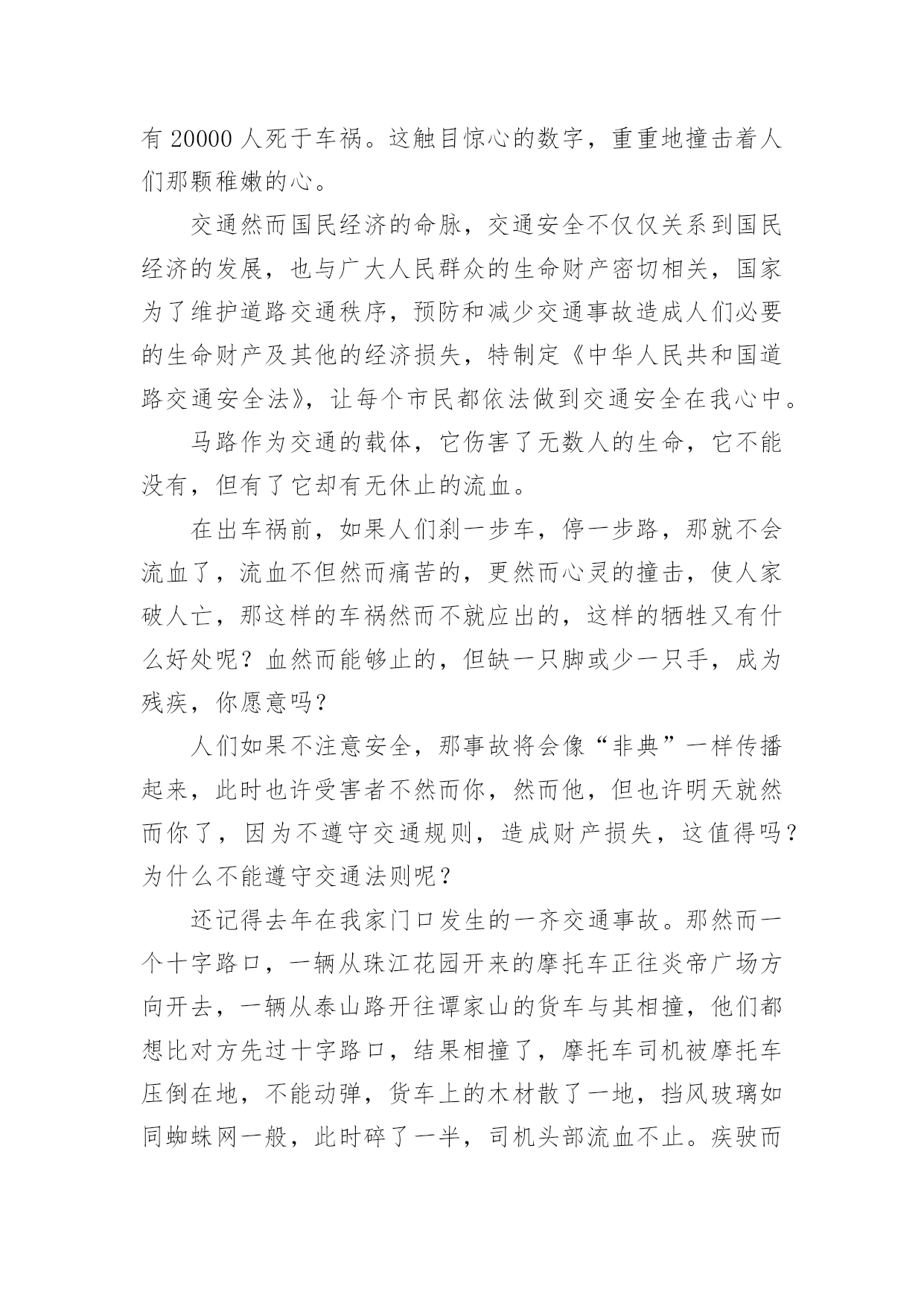 交通安全作文【精华】交通安全作文合集7篇在学习、工作乃至生活中,大家都写过作文吧,作文是一种言语活动,具有高度的综合性和创造性。那么问题来了,到底应如何写一篇优秀的作文呢?下面是小编收集整理的交通安全作文8篇,供大家参考借鉴,希望可以帮助到有需要的朋友。交通安全作文篇1大家应该都明白安全是最重要的吧!你们都知道哪些不遵守交通法规的现象呢?比如说:有开车闯红绿灯的;有横穿马路的;有过马路不走人行道的;有在马路中间乱跑的;还有的翻越路中隔离栏的……安全最重要,千万不要不遵守交通规则哦!我给大家讲一则交通事故的事情。有一天,我在家看电视,电视上说:“有一位女士开车还是新手,结果,一不小心,把油门才成刹车了,车便像离弦的箭一样快,“噌”得下窜了出去,前面刚好有一辆汽车刚刚停了下来,正好撞到那辆汽车上了,后面又来了一辆轿车,没有看到,也没踩住刹车,就也撞了上去,三辆车中见又来了一辆车,因刹车不灵,撞了上去。结果,出现了这个城市的第一起“连环车祸”。我要提醒所有开车的同志们,千万不要疲劳或酒后驾车,这样很容易出交通事故,所以,开车的司机们,象这样一幕血的教训,历历在我们眼前出现。我们大家一定要遵守交通规则。我还要提醒那些司机朋友们,开车时,注意红绿灯,思想集中,不违反交通规则。一定要把这几个字切记在心:安全第一,平平安安回家。交通安全作文篇2从小我对交通安全方面的知识很薄弱,只知道红灯停,绿灯行,过马路要走斑马线这些连三岁小孩都懂的事。虽然交通安全父母和老师经常会提起,但我每次都当做耳边风,左耳进,右耳出。甚至有些反感他们总是念叨这些。现在想想,要不是以前一直把他们的话当做耳边风,也不会差点命丧黄泉了。记得有一次,我和同学一起出去逛街。准备过马路时,我发现绿灯的时间只剩几秒了,一想再等必定又要等很久,我便因为贪图一时拉着同学朝马路对面飞奔而去。可就在我们跑到一半时,红灯亮了。一辆小轿车就我们身后驶过,凉风久久没有散去,吹到我身上,顿时,我的冷汗豆大豆大往下落。连现在想起来都有点心有余悸。从那以后,我每次过马路都小心翼翼,深怕又有一辆轿车突然驶出来。不过,好景不长,过了一段时间,我便忘了这个教训。又有一次我骑车和妈妈出去玩,妈妈骑车在前面,我跟着妈妈的后面。骑到一个十字路口,我和妈妈的距离已经拉开了距离,为了追上妈妈,我加快了速度,到达十字路口的中心时,突然,从左侧冲出来一辆车,眼看就要撞上我,我什么都顾不上,只好紧张闭上了眼睛。“哧”随着刹车声,那辆车停在了我的面前,司机下车询问有没有事,妈妈也慌忙的跑过来问候我,当时身边声音吵杂,我却什么也听不见。一想到刚刚经历了这么恐怖的事,差点就要见不到爸爸妈妈了。那一刻,我意识到交通安全的重要性。从那以后,我再也不拿父母老师的话当做耳边风了。作为已经经历过“生死之难”的我,提醒大家,一定要听父母和老师的教导,生命是宝贵的,用什么也换不来,注意交通安全,就能让自己多一份安全。交通安全作文篇3当你看到一位母亲怀胎十月,在经历无数痛苦的煎熬和漫长等待的焦急后,随着“哇”的一声响亮的啼哭,宣告着一个新的小生命诞生时,你是否会感叹于生命的来之不易?当你看到一位身患重病的病人,看到他在生死边缘上痛苦地挣扎,无数次昏迷,无数次命悬一线……他对生命的渴望,又是否让你叹惋生命的脆弱?当你看到一株嫩绿的草芽在早春的寒冷中萌发,经历无数次雷电风暴的严峻考验后仍然奇迹般地活了下来,以一个胜利者的姿态屹立,书写着它生长的执着时,你是否会为生命的顽强而惊诧?未满十二岁不能骑自行车,骑自行车要靠右行,不能在机动车车道上行驶,要在非机动车道上行驶,骑车时不能戴耳机听歌,这样很容易使耳朵不灵,不能用一只手或放手骑,骑自行车不能在后架上载人,不能超速行驶。过马路时要看“红绿灯”,红灯停、绿灯行、有句名言说的好:红灯有无数次,但是生命只有一次,如果闯红灯,有可能就会丢去生命。去外面游玩时一定不能乘坐三轮摩托车和龙马车,因为三轮摩托车和龙马车的的后厢是用来装货物的,而不是用来载人的,有些三轮摩托车没有安装镜子,坐在上面很危险。坐两轮摩托车一定要戴好安全帽,只能载一个人。乘坐公共汽车不能拥挤,要先让车上要下的人先先下来,然后才可以上,乘坐公共汽车要系好安全带,双手扶稳,不能把头或手伸出窗外,不能往外面扔垃圾,不能站在上下门边上,不能带易燃烧物品上车,比如爆竹、烟花之类的易燃烧物品上车,不能乘坐一些不正规的车,没有合格证的车。在车内不能看书,这样很容易成近视眼。生命对每个人都是平等的。无论是衣着鲜艳的达官贵人,还是衣衫丑陋的街头乞丐,无论是知识深渊的秀才,还是目不识丁的文盲,无论是年老的老者,还是未经世事的儿童,在生命面前都平等的。在生命面前,我们要努力奋斗,有句话说得好:好好活着便没有不幸。认真对待生命的每一分钟,生命便会向你绽放最美