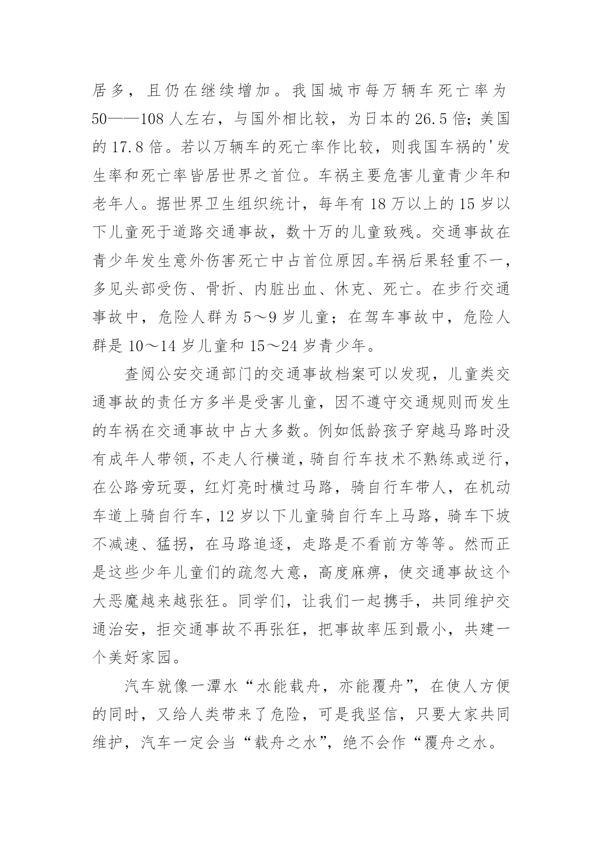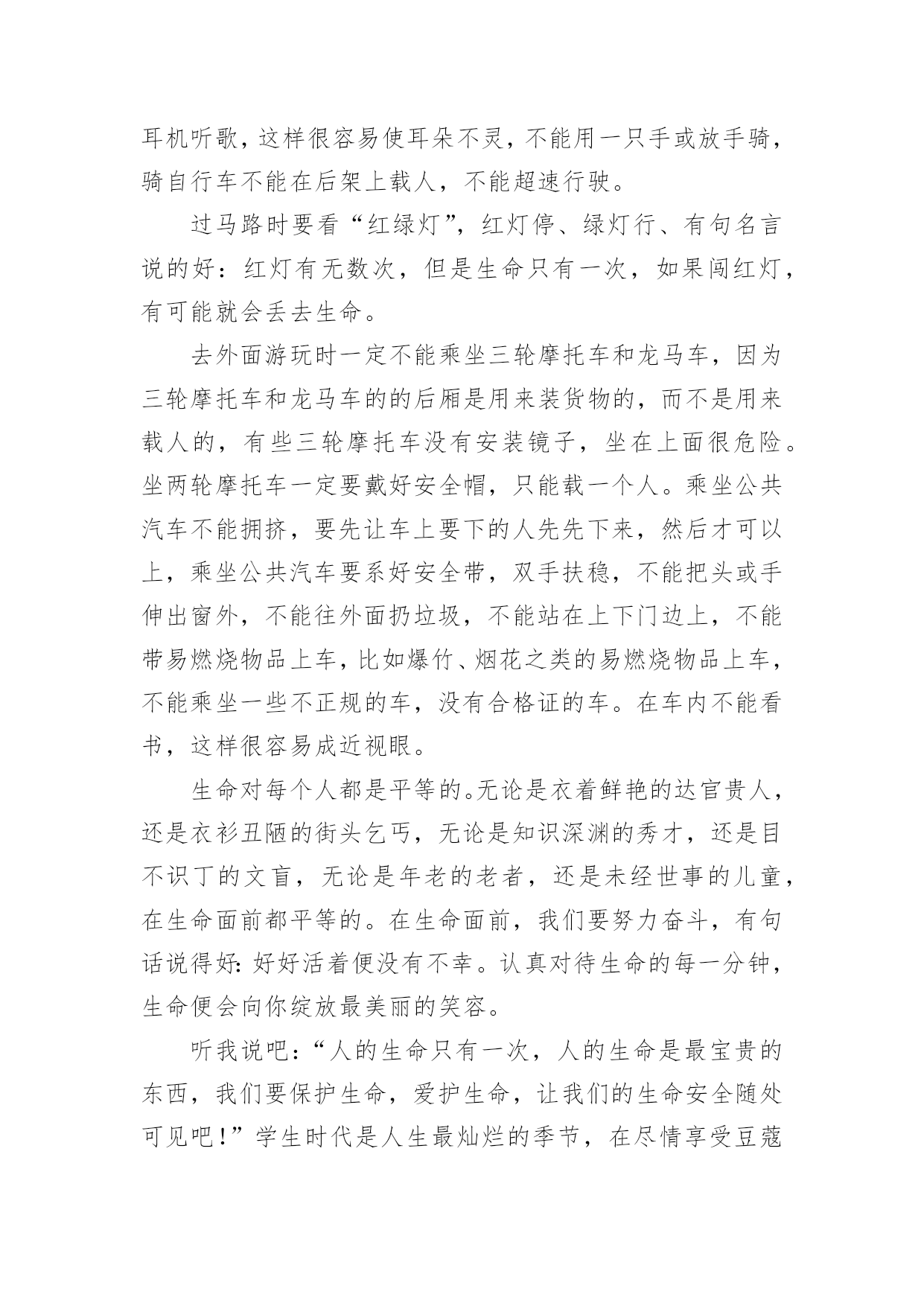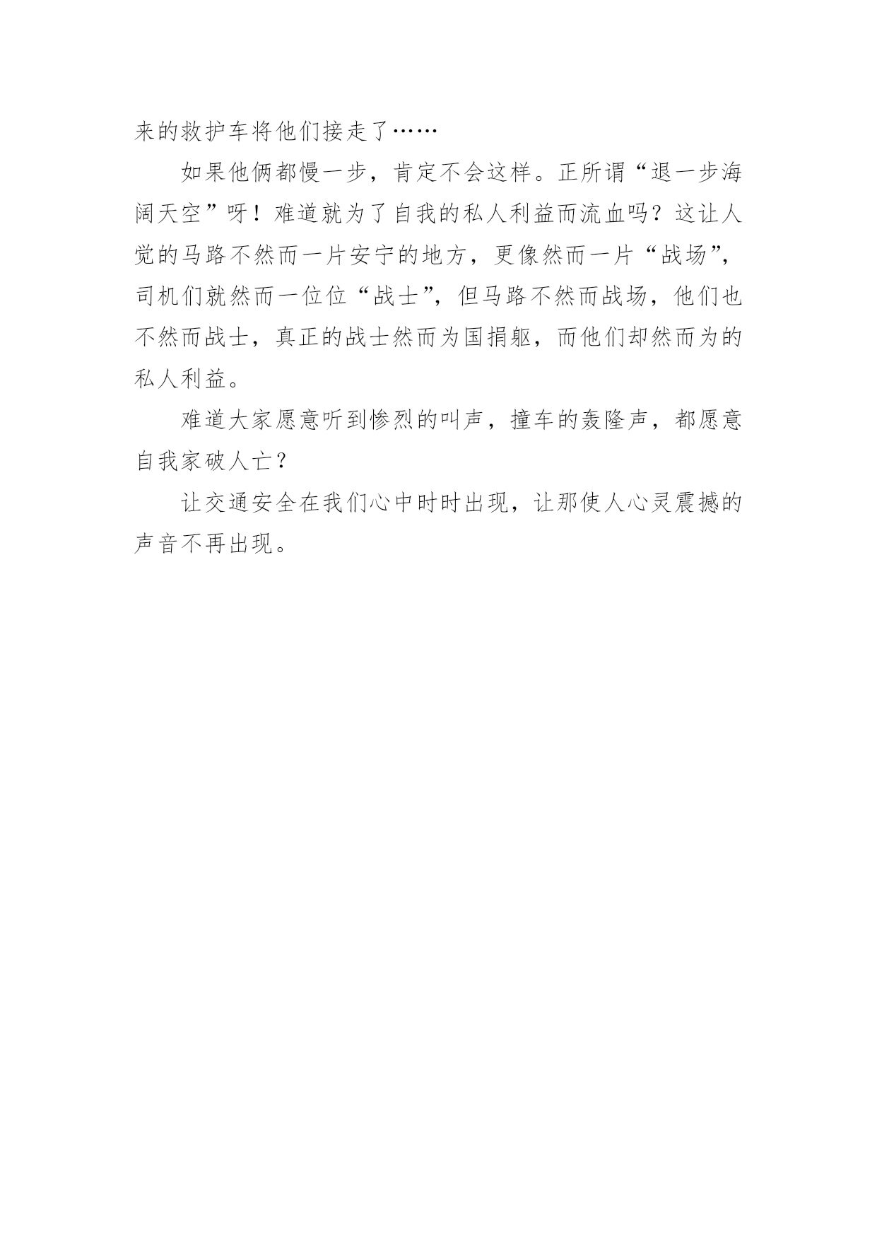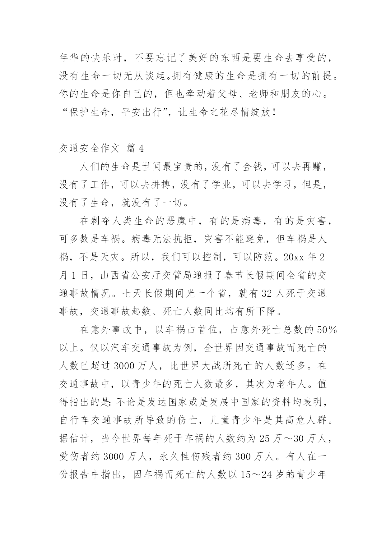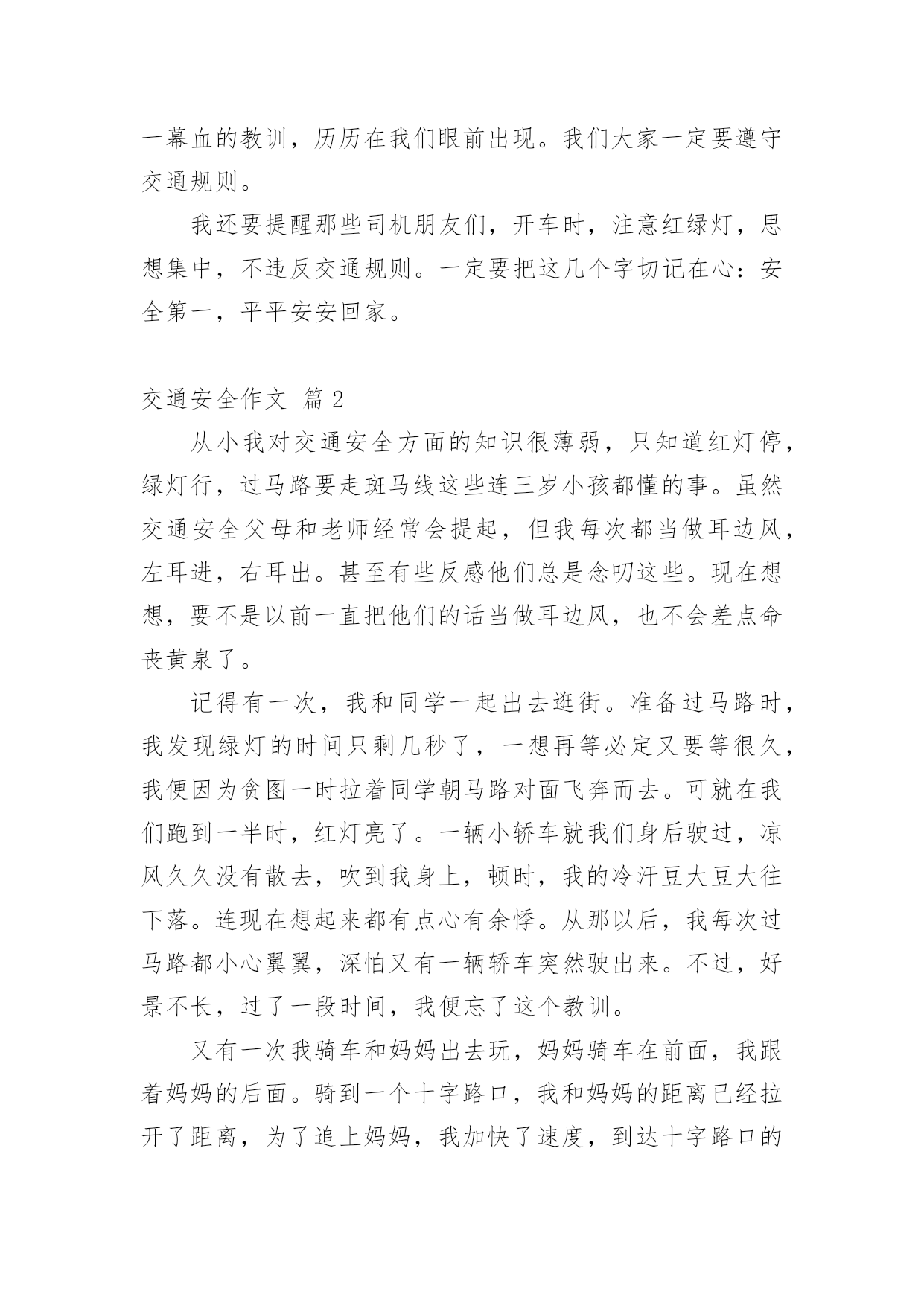 交通安全作文【精华】交通安全作文合集7篇在学习、工作乃至生活中,大家都写过作文吧,作文是一种言语活动,具有高度的综合性和创造性。那么问题来了,到底应如何写一篇优秀的作文呢?下面是小编收集整理的交通安全作文8篇,供大家参考借鉴,希望可以帮助到有需要的朋友。交通安全作文篇1大家应该都明白安全是最重要的吧!你们都知道哪些不遵守交通法规的现象呢?比如说:有开车闯红绿灯的;有横穿马路的;有过马路不走人行道的;有在马路中间乱跑的;还有的翻越路中隔离栏的……安全最重要,千万不要不遵守交通规则哦!我给大家讲一则交通事故的事情。有一天,我在家看电视,电视上说:“有一位女士开车还是新手,结果,一不小心,把油门才成刹车了,车便像离弦的箭一样快,“噌”得下窜了出去,前面刚好有一辆汽车刚刚停了下来,正好撞到那辆汽车上了,后面又来了一辆轿车,没有看到,也没踩住刹车,就也撞了上去,三辆车中见又来了一辆车,因刹车不灵,撞了上去。结果,出现了这个城市的第一起“连环车祸”。我要提醒所有开车的同志们,千万不要疲劳或酒后驾车,这样很容易出交通事故,所以,开车的司机们,象这样一幕血的教训,历历在我们眼前出现。我们大家一定要遵守交通规则。我还要提醒那些司机朋友们,开车时,注意红绿灯,思想集中,不违反交通规则。一定要把这几个字切记在心:安全第一,平平安安回家。交通安全作文篇2从小我对交通安全方面的知识很薄弱,只知道红灯停,绿灯行,过马路要走斑马线这些连三岁小孩都懂的事。虽然交通安全父母和老师经常会提起,但我每次都当做耳边风,左耳进,右耳出。甚至有些反感他们总是念叨这些。现在想想,要不是以前一直把他们的话当做耳边风,也不会差点命丧黄泉了。记得有一次,我和同学一起出去逛街。准备过马路时,我发现绿灯的时间只剩几秒了,一想再等必定又要等很久,我便因为贪图一时拉着同学朝马路对面飞奔而去。可就在我们跑到一半时,红灯亮了。一辆小轿车就我们身后驶过,凉风久久没有散去,吹到我身上,顿时,我的冷汗豆大豆大往下落。连现在想起来都有点心有余悸。从那以后,我每次过马路都小心翼翼,深怕又有一辆轿车突然驶出来。不过,好景不长,过了一段时间,我便忘了这个教训。又有一次我骑车和妈妈出去玩,妈妈骑车在前面,我跟着妈妈的后面。骑到一个十字路口,我和妈妈的距离已经拉开了距离,为了追上妈妈,我加快了速度,到达十字路口的中心时,突然,从左侧冲出来一辆车,眼看就要撞上我,我什么都顾不上,只好紧张闭上了眼睛。“哧”随着刹车声,那辆车停在了我的面前,司机下车询问有没有事,妈妈也慌忙的跑过来问候我,当时身边声音吵杂,我却什么也听不见。一想到刚刚经历了这么恐怖的事,差点就要见不到爸爸妈妈了。那一刻,我意识到交通安全的重要性。从那以后,我再也不拿父母老师的话当做耳边风了。作为已经经历过“生死之难”的我,提醒大家,一定要听父母和老师的教导,生命是宝贵的,用什么也换不来,注意交通安全,就能让自己多一份安全。交通安全作文篇3当你看到一位母亲怀胎十月,在经历无数痛苦的煎熬和漫长等待的焦急后,随着“哇”的一声响亮的啼哭,宣告着一个新的小生命诞生时,你是否会感叹于生命的来之不易?当你看到一位身患重病的病人,看到他在生死边缘上痛苦地挣扎,无数次昏迷,无数次命悬一线……他对生命的渴望,又是否让你叹惋生命的脆弱?当你看到一株嫩绿的草芽在早春的寒冷中萌发,经历无数次雷电风暴的严峻考验后仍然奇迹般地活了下来,以一个胜利者的姿态屹立,书写着它生长的执着时,你是否会为生命的顽强而惊诧?未满十二岁不能骑自行车,骑自行车要靠右行,不能在机动车车道上行驶,要在非机动车道上行驶,骑车时不能戴耳机听歌,这样很容易使耳朵不灵,不能用一只手或放手骑,骑自行车不能在后架上载人,不能超速行驶。过马路时要看“红绿灯”,红灯停、绿灯行、有句名言说的好:红灯有无数次,但是生命只有一次,如果闯红灯,有可能就会丢去生命。去外面游玩时一定不能乘坐三轮摩托车和龙马车,因为三轮摩托车和龙马车的的后厢是用来装货物的,而不是用来载人的,有些三轮摩托车没有安装镜子,坐在上面很危险。坐两轮摩托车一定要戴好安全帽,只能载一个人。乘坐公共汽车不能拥挤,要先让车上要下的人先先下来,然后才可以上,乘坐公共汽车要系好安全带,双手扶稳,不能把头或手伸出窗外,不能往外面扔垃圾,不能站在上下门边上,不能带易燃烧物品上车,比如爆竹、烟花之类的易燃烧物品上车,不能乘坐一些不正规的车,没有合格证的车。在车内不能看书,这样很容易成近视眼。生命对每个人都是平等的。无论是衣着鲜艳的达官贵人,还是衣衫丑陋的街头乞丐,无论是知识深渊的秀才,还是目不识丁的文盲,无论是年老的老者,还是未经世事的儿童,在生命面前都平等的。在生命面前,我们要努力奋斗,有句话说得好:好好活着便没有不幸。认真对待生命的每一分钟,生命便会向你绽放最美