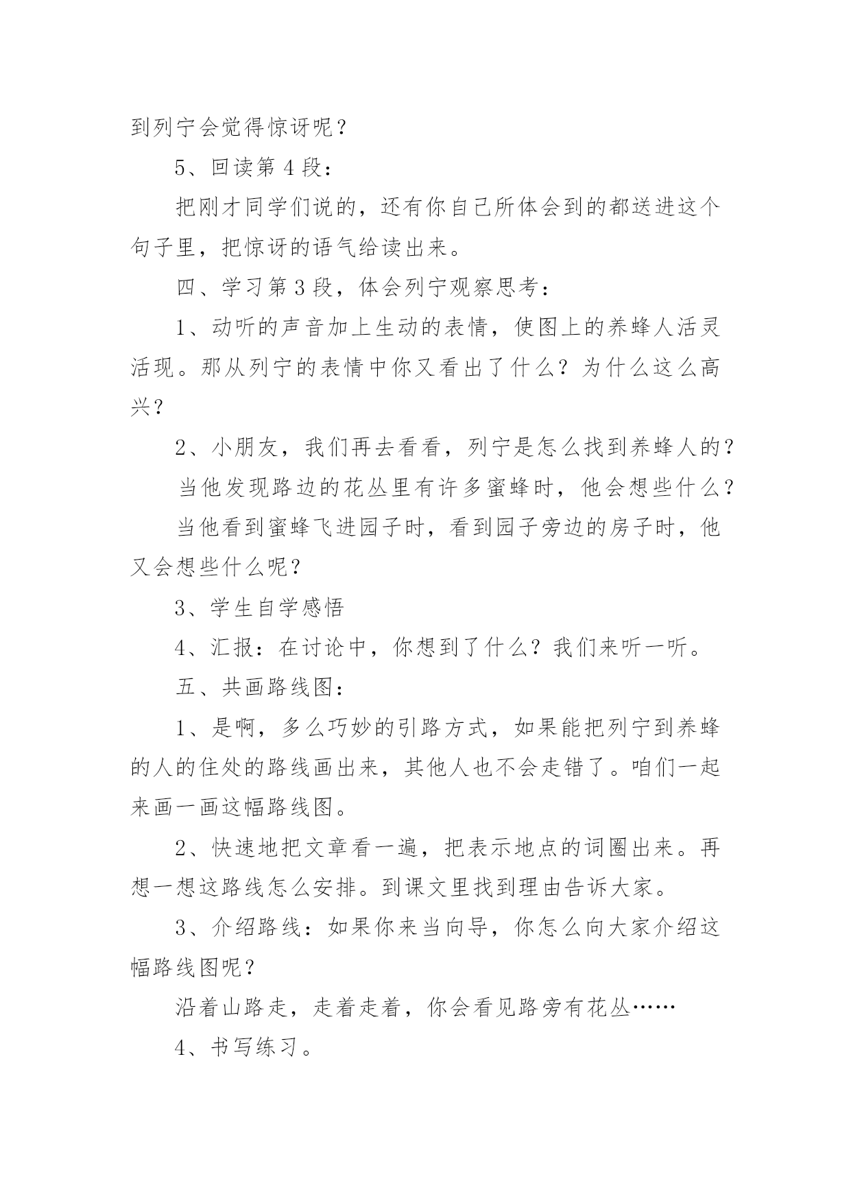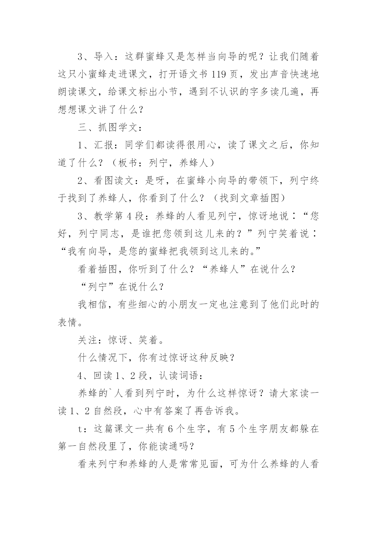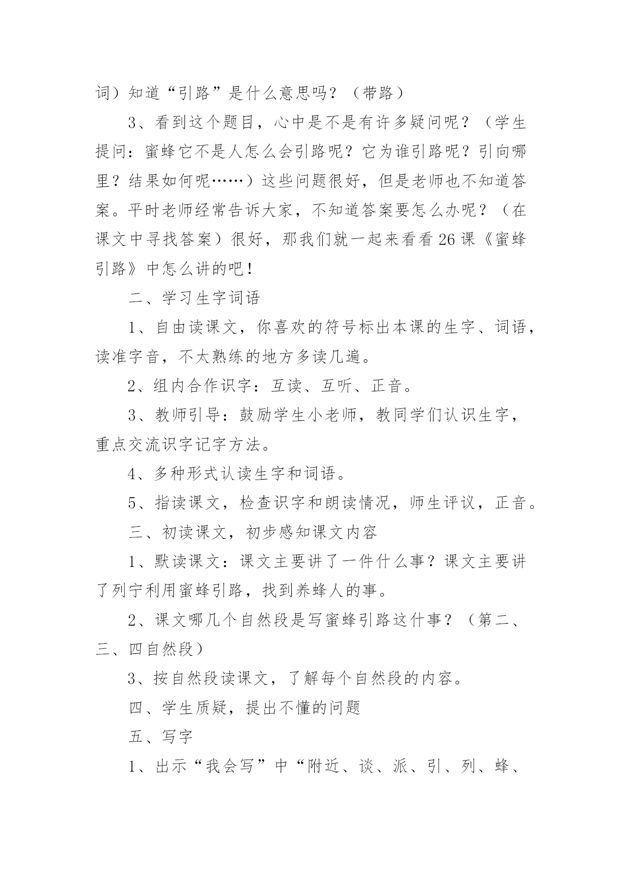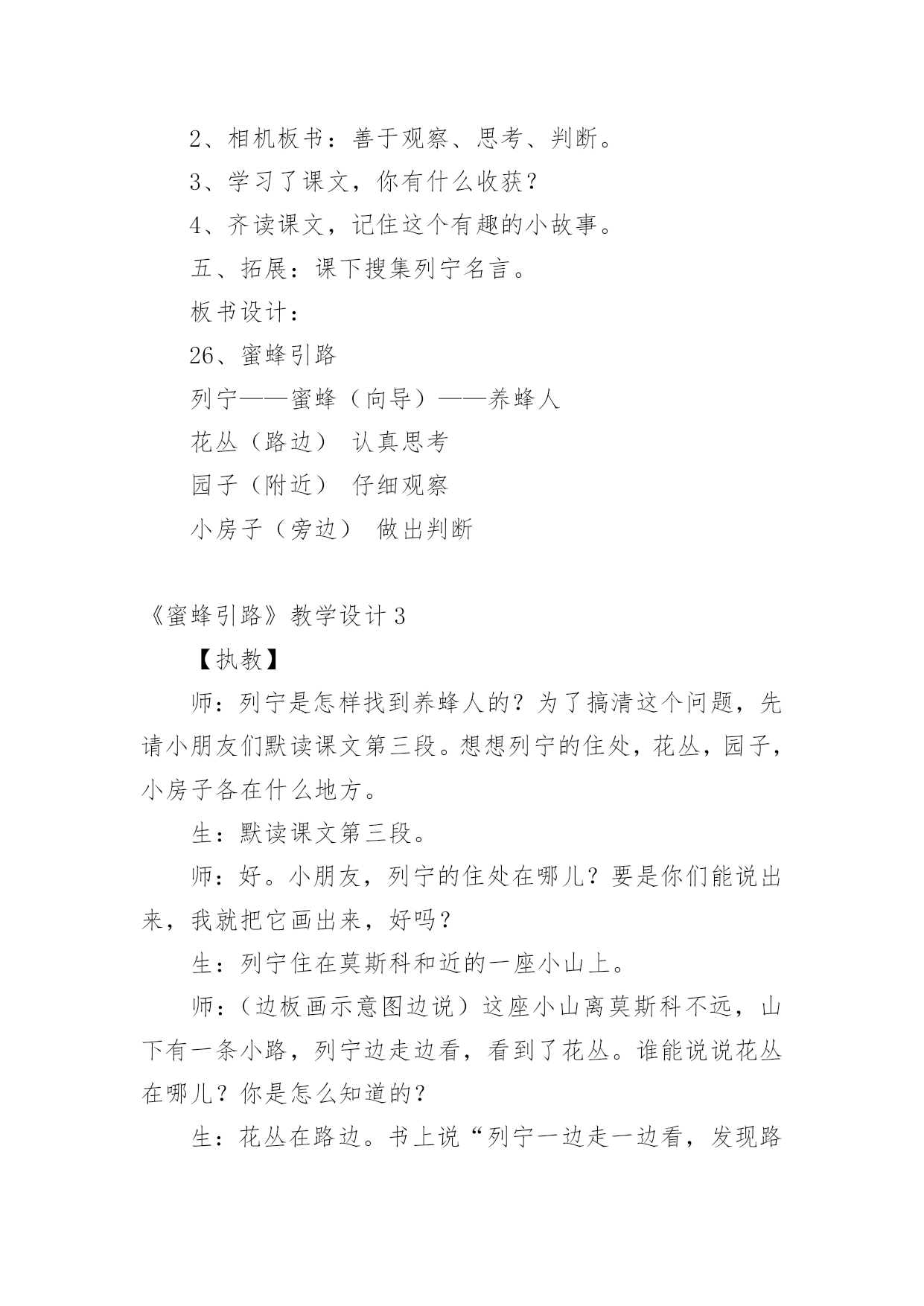 《蜜蜂引路》教学设计作为一位兢兢业业的人民教师,时常需要准备好教学设计,借助教学设计可使学生在单位时间内能够学到更多的知识。那要怎么写好教学设计呢?下面是小编帮大家整理的《蜜蜂引路》教学设计,供大家参考借鉴,希望可以帮助到有需要的朋友。《蜜蜂引路》教学设计1教学目标:1、会认“莫、斯”等6个生字,会写“讶、谈”等9个字。2、正确流利地朗读课文,理解课文内容。3、感受遇到问题要仔细观察、认真思考的道理。教学过程:一、复习中谈话:我们已经学习了课文《要是你在野外迷了路》,谁来说说你可以找什么做你的向导?二、审题导入:1、蜜蜂:大自然中有许多天然的指南针,今天我们还要认识一位新的小向导,它就是——蜜蜂。看着这两个字,咱们一起读一读,蜜蜂,细心的小朋友在读的时候一定发现了什么?都有“虫”字。2、引路:你知道什么是引路吗?3、导入:这群蜜蜂又是怎样当向导的呢?让我们随着这只小蜜蜂走进课文,打开语文书119页,发出声音快速地朗读课文,给课文标出小节,遇到不认识的字多读几遍,再想想课文讲了什么?三、抓图学文:1、汇报:同学们都读得很用心,读了课文之后,你知道了什么?(板书:列宁,养蜂人)2、看图读文:是呀,在蜜蜂小向导的带领下,列宁终于找到了养蜂人,你看到了什么?(找到文章插图)3、教学第4段:养蜂的人看见列宁,惊讶地说∶“您好,列宁同志,是谁把您领到这儿来的?”列宁笑着说∶“我有向导,是您的蜜蜂把我领到这儿来的。”看着插图,你听到了什么?“养蜂人”在说什么?“列宁”在说什么?我相信,有些细心的小朋友一定也注意到了他们此时的表情。关注:惊讶、笑着。什么情况下,你有过惊讶这种反映?4、回读1、2段,认读词语:养蜂的`人看到列宁时,为什么这样惊讶?请大家读一读1、2自然段,心中有答案了再告诉我。t:这篇课文一共有6个生字,有5个生字朋友都躲在第一自然段里了,你能读通吗?看来列宁和养蜂的人是常常见面,可为什么养蜂的人看到列宁会觉得惊讶呢?5、回读第4段:把刚才同学们说的,还有你自己所体会到的都送进这个句子里,把惊讶的语气给读出来。四、学习第3段,体会列宁观察思考:1、动听的声音加上生动的表情,使图上的养蜂人活灵活现。那从列宁的表情中你又看出了什么?为什么这么高兴?2、小朋友,我们再去看看,列宁是怎么找到养蜂人的?当他发现路边的花丛里有许多蜜蜂时,他会想些什么?当他看到蜜蜂飞进园子时,看到园子旁边的房子时,他又会想些什么呢?3、学生自学感悟4、汇报:在讨论中,你想到了什么?我们来听一听。五、共画路线图:1、是啊,多么巧妙的引路方式,如果能把列宁到养蜂的人的住处的路线画出来,其他人也不会走错了。咱们一起来画一画这幅路线图。2、快速地把文章看一遍,把表示地点的词圈出来。再想一想这路线怎么安排。到课文里找到理由告诉大家。3、介绍路线:如果你来当向导,你怎么向大家介绍这幅路线图呢?沿着山路走,走着走着,你会看见路旁有花丛……4、书写练习。六、课堂小结:小朋友,看来只要仔细观察,认真思考,小蜜蜂就会成为我们的向导。其实,在神奇的大自然中,还有许多比蜜蜂更有趣的向导呢!不管是太阳、大树、北极星还是积雪,还是今天的小蜜蜂,要找到这些向导的法宝是:细细观察,多多去想。《蜜蜂引路》教学设计2学习目标:1、会认6个生字,会写9个生字。2、正确、流利、有感情地朗读课文,能区别“常常”和“往常”的意思,并会用“常常”造句。3、能领会列宁善于观察和思考的特点。教学重难点:1、识字、写字,理解课文内容是本课学习的重点。2、指导学生理解“列宁是怎样找到养蜂人的”是教学的难点。教学准备:小黑板、图片、生字卡片、练习纸课时安排:2课时第一课时一、创设情景,导入新课1、猜一猜:有一种昆虫,专门在花丛中采蜜、传授花粉,本领可大了。你们知道它是谁吗?(蜜蜂)板书2、顺势提问:你们知道蜜蜂是干什么的吗?(采蜜)可别小瞧了这些小蜜蜂,它还会引路呢?(添加“引路”一词)知道“引路”是什么意思吗?(带路)3、看到这个题目,心中是不是有许多疑问呢?(学生提问:蜜蜂它不是人怎么会引路呢?它为谁引路呢?引向哪里?结果如何呢……)这些问题很好,但是老师也不知道答案。平时老师经常告诉大家,不知道答案要怎么办呢?(在课文中寻找答案)很好,那我们就一起来看看26课《蜜蜂引路》中怎么讲的吧!二、学习生字词语1、自由读课文,你喜欢的符号标出本课的生字、词语,读准字音,不太熟练的地方多读几遍。2、组内合作识字:互读、互听、正音。3、教师引导:鼓励学生小老师,教同学们认识生字,重点交流识字记字方法。4、多种形式认读生字和词语。5、指读课文,检查识字和朗读情况,师生评议,正音。三、初读课文,初步感知课文内容1、默读课文:课文主要讲了一件什么事?课文主要讲了列宁利用蜜蜂引路,找到养蜂人的事。2、课文哪几个自然段是写蜜