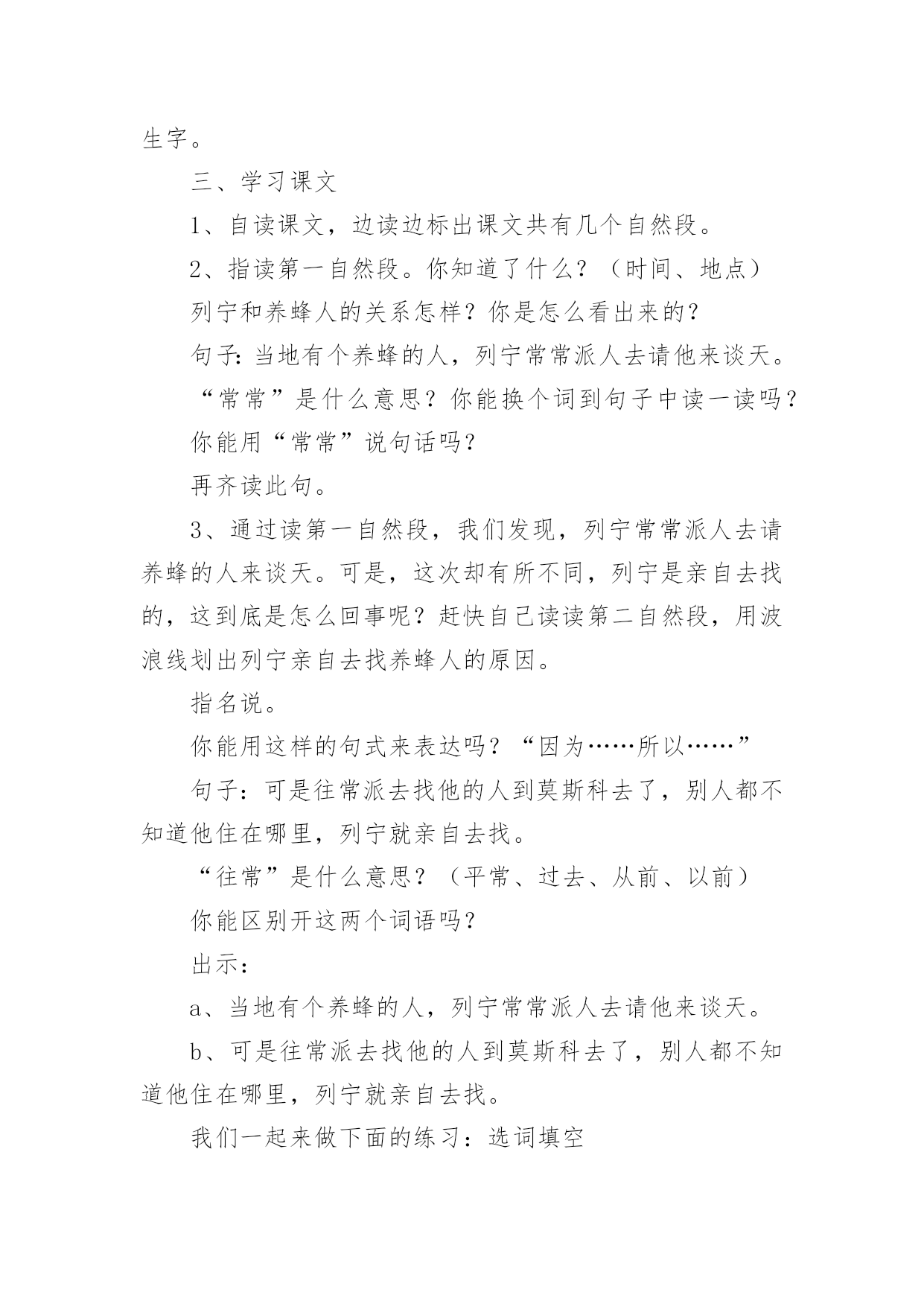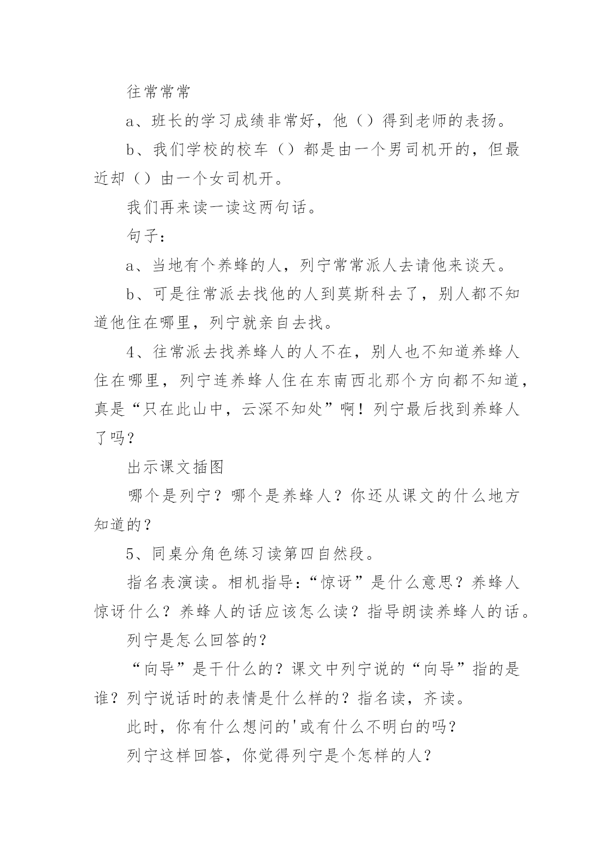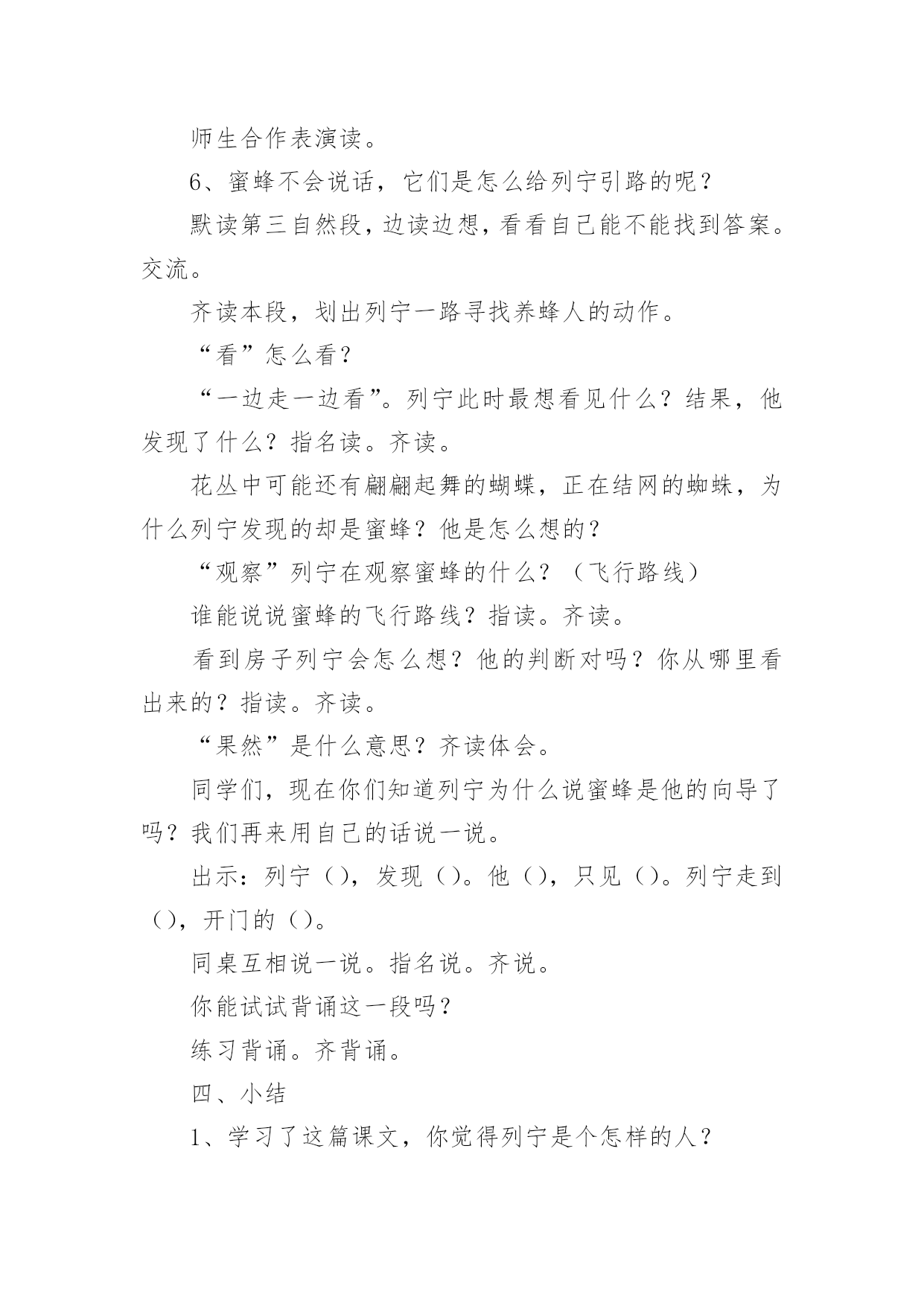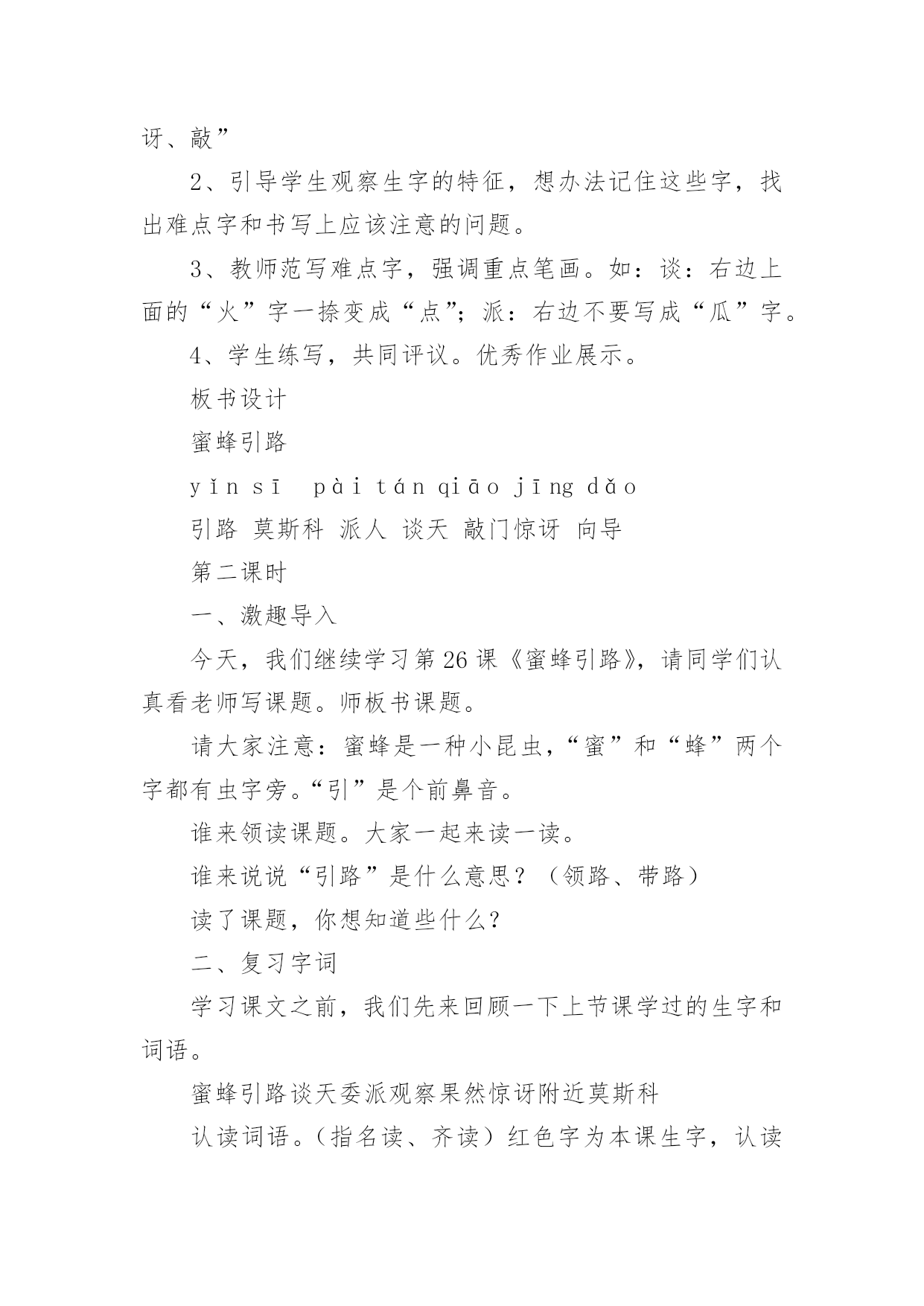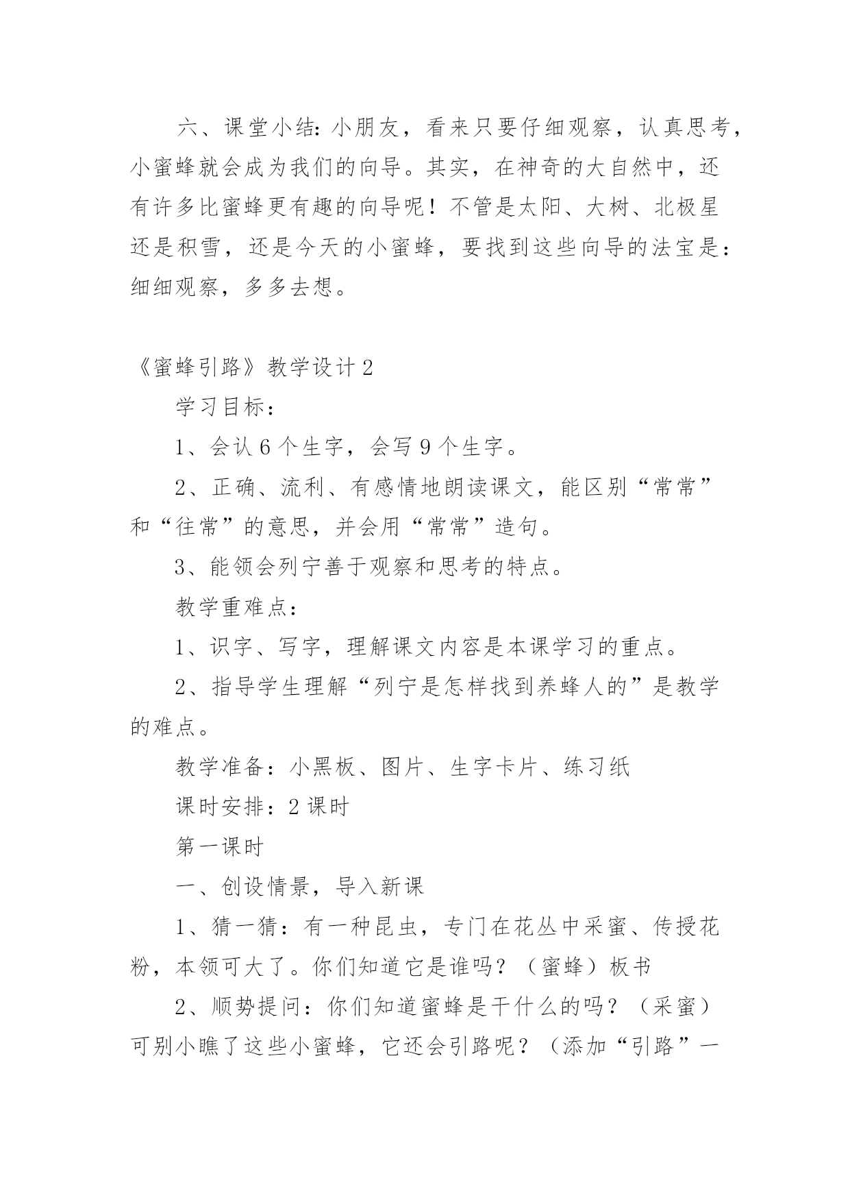 《蜜蜂引路》教学设计作为一位兢兢业业的人民教师,时常需要准备好教学设计,借助教学设计可使学生在单位时间内能够学到更多的知识。那要怎么写好教学设计呢?下面是小编帮大家整理的《蜜蜂引路》教学设计,供大家参考借鉴,希望可以帮助到有需要的朋友。《蜜蜂引路》教学设计1教学目标:1、会认“莫、斯”等6个生字,会写“讶、谈”等9个字。2、正确流利地朗读课文,理解课文内容。3、感受遇到问题要仔细观察、认真思考的道理。教学过程:一、复习中谈话:我们已经学习了课文《要是你在野外迷了路》,谁来说说你可以找什么做你的向导?二、审题导入:1、蜜蜂:大自然中有许多天然的指南针,今天我们还要认识一位新的小向导,它就是——蜜蜂。看着这两个字,咱们一起读一读,蜜蜂,细心的小朋友在读的时候一定发现了什么?都有“虫”字。2、引路:你知道什么是引路吗?3、导入:这群蜜蜂又是怎样当向导的呢?让我们随着这只小蜜蜂走进课文,打开语文书119页,发出声音快速地朗读课文,给课文标出小节,遇到不认识的字多读几遍,再想想课文讲了什么?三、抓图学文:1、汇报:同学们都读得很用心,读了课文之后,你知道了什么?(板书:列宁,养蜂人)2、看图读文:是呀,在蜜蜂小向导的带领下,列宁终于找到了养蜂人,你看到了什么?(找到文章插图)3、教学第4段:养蜂的人看见列宁,惊讶地说∶“您好,列宁同志,是谁把您领到这儿来的?”列宁笑着说∶“我有向导,是您的蜜蜂把我领到这儿来的。”看着插图,你听到了什么?“养蜂人”在说什么?“列宁”在说什么?我相信,有些细心的小朋友一定也注意到了他们此时的表情。关注:惊讶、笑着。什么情况下,你有过惊讶这种反映?4、回读1、2段,认读词语:养蜂的`人看到列宁时,为什么这样惊讶?请大家读一读1、2自然段,心中有答案了再告诉我。t:这篇课文一共有6个生字,有5个生字朋友都躲在第一自然段里了,你能读通吗?看来列宁和养蜂的人是常常见面,可为什么养蜂的人看到列宁会觉得惊讶呢?5、回读第4段:把刚才同学们说的,还有你自己所体会到的都送进这个句子里,把惊讶的语气给读出来。四、学习第3段,体会列宁观察思考:1、动听的声音加上生动的表情,使图上的养蜂人活灵活现。那从列宁的表情中你又看出了什么?为什么这么高兴?2、小朋友,我们再去看看,列宁是怎么找到养蜂人的?当他发现路边的花丛里有许多蜜蜂时,他会想些什么?当他看到蜜蜂飞进园子时,看到园子旁边的房子时,他又会想些什么呢?3、学生自学感悟4、汇报:在讨论中,你想到了什么?我们来听一听。五、共画路线图:1、是啊,多么巧妙的引路方式,如果能把列宁到养蜂的人的住处的路线画出来,其他人也不会走错了。咱们一起来画一画这幅路线图。2、快速地把文章看一遍,把表示地点的词圈出来。再想一想这路线怎么安排。到课文里找到理由告诉大家。3、介绍路线:如果你来当向导,你怎么向大家介绍这幅路线图呢?沿着山路走,走着走着,你会看见路旁有花丛……4、书写练习。六、课堂小结:小朋友,看来只要仔细观察,认真思考,小蜜蜂就会成为我们的向导。其实,在神奇的大自然中,还有许多比蜜蜂更有趣的向导呢!不管是太阳、大树、北极星还是积雪,还是今天的小蜜蜂,要找到这些向导的法宝是:细细观察,多多去想。《蜜蜂引路》教学设计2学习目标:1、会认6个生字,会写9个生字。2、正确、流利、有感情地朗读课文,能区别“常常”和“往常”的意思,并会用“常常”造句。3、能领会列宁善于观察和思考的特点。教学重难点:1、识字、写字,理解课文内容是本课学习的重点。2、指导学生理解“列宁是怎样找到养蜂人的”是教学的难点。教学准备:小黑板、图片、生字卡片、练习纸课时安排:2课时第一课时一、创设情景,导入新课1、猜一猜:有一种昆虫,专门在花丛中采蜜、传授花粉,本领可大了。你们知道它是谁吗?(蜜蜂)板书2、顺势提问:你们知道蜜蜂是干什么的吗?(采蜜)可别小瞧了这些小蜜蜂,它还会引路呢?(添加“引路”一词)知道“引路”是什么意思吗?(带路)3、看到这个题目,心中是不是有许多疑问呢?(学生提问:蜜蜂它不是人怎么会引路呢?它为谁引路呢?引向哪里?结果如何呢……)这些问题很好,但是老师也不知道答案。平时老师经常告诉大家,不知道答案要怎么办呢?(在课文中寻找答案)很好,那我们就一起来看看26课《蜜蜂引路》中怎么讲的吧!二、学习生字词语1、自由读课文,你喜欢的符号标出本课的生字、词语,读准字音,不太熟练的地方多读几遍。2、组内合作识字:互读、互听、正音。3、教师引导:鼓励学生小老师,教同学们认识生字,重点交流识字记字方法。4、多种形式认读生字和词语。5、指读课文,检查识字和朗读情况,师生评议,正音。三、初读课文,初步感知课文内容1、默读课文:课文主要讲了一件什么事?课文主要讲了列宁利用蜜蜂引路,找到养蜂人的事。2、课文哪几个自然段是写蜜