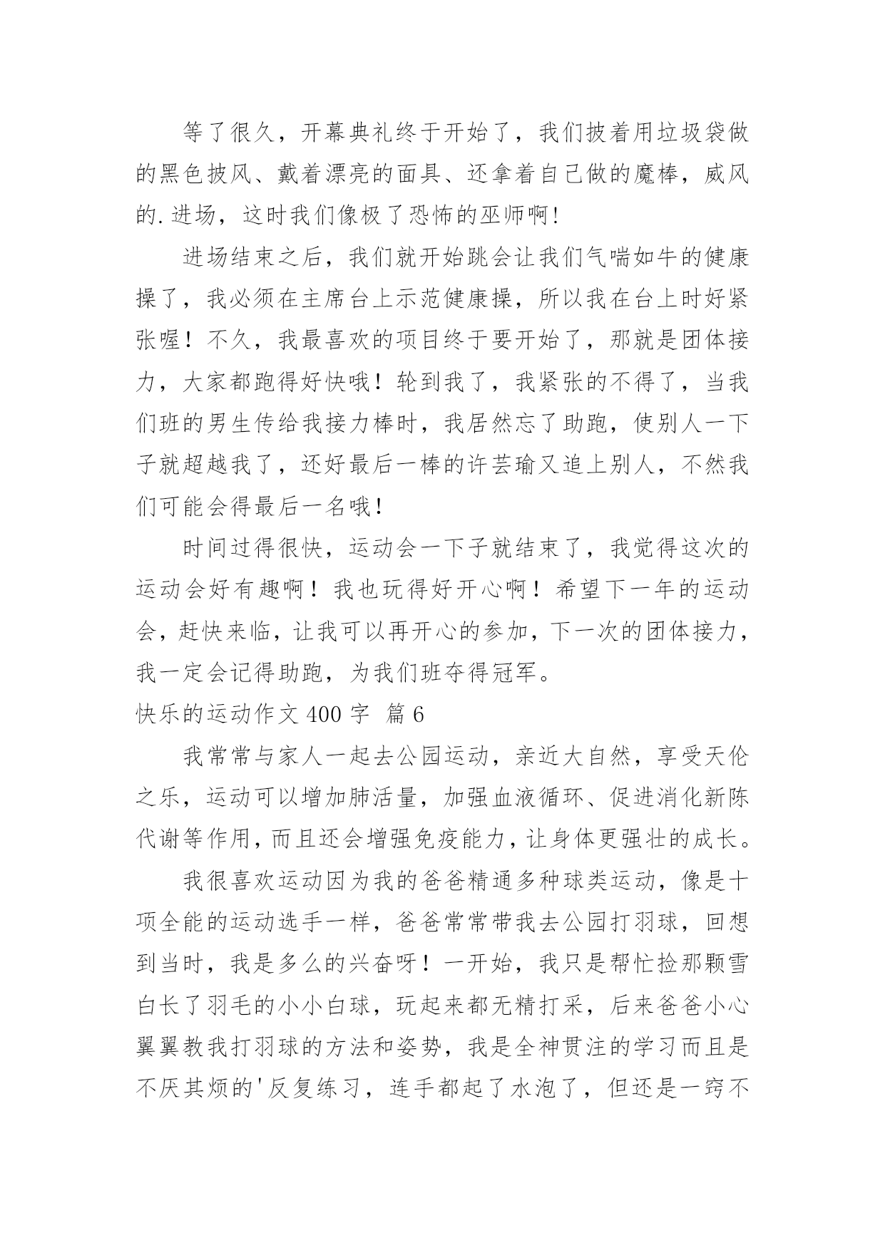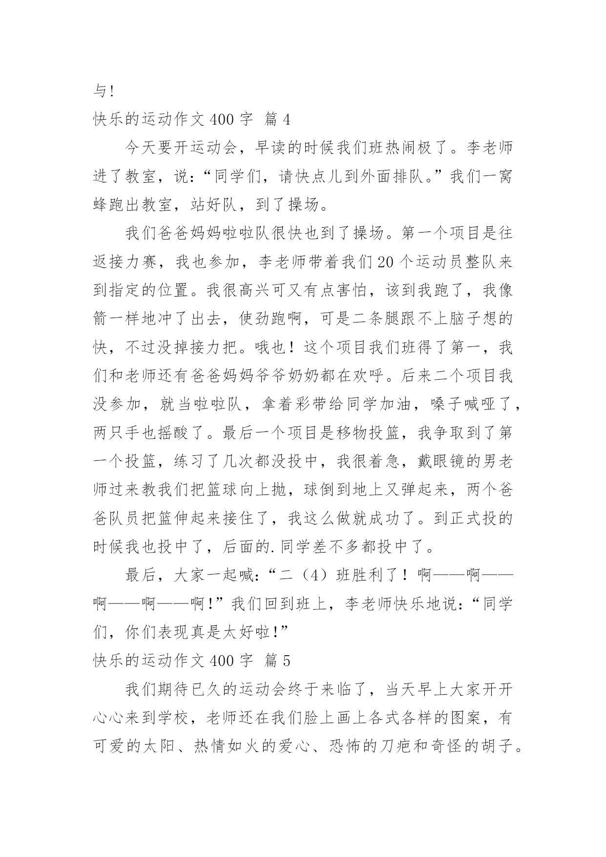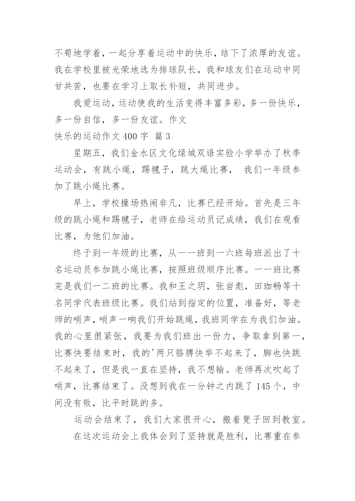 快乐的运动作文400字快乐的运动作文400字【通用】在平平淡淡的学习、工作、生活中,说到作文,大家肯定都不陌生吧,作文要求篇章结构完整,一定要避免无结尾作文的出现。那么你有了解过作文吗?下面是小编收集整理的快乐的运动作文400字8篇,供大家参考借鉴,希望可以帮助到有需要的朋友。快乐的运动作文400字篇1近几天,我们举行了运动会,本次运动会的主题是“体育、文化、科技、创新、综合运动会”首先我们进行了运动会开幕式,接着是运动员入场,然后各个级部展示了特色操……,展示完后运动员退场,运动会就正式开始了!运动会中的项目繁多,有关于运动的,用脑的……可是因为我脚扭伤了没能才加运动会的项目,真是可惜,看着同学拿奖满赞而归的时候,我有说不出的羡慕与嫉妒,可那又能怎样的?哎……但是老师很照顾我们这些没有项目的同学,只要写关于运动会的稿被念了,就可以给自己加五颗星给自己组加500分,于是我便“拼命”得写稿,从运动会开始到结束,我已经中了7篇稿了呢!在运动会的第二天,我们班的高明同学才加了4年级女子组3000米跑得比赛,最后一圈的时候,高铭用尽全身力气冲向终点取得了4年级女子组3000米跑第一名的`好成绩,这真是让我钦佩不已……虽然运动会只有短短的两天半的时间,但是我们却十分开心,希望以后能够多举办几次!快乐的运动作文400字篇2“生命在于运动”,我喜爱运动,运动给我带来了极大的乐趣。小时候,我喜欢上了羽毛球,一向热爱羽毛球的妈妈当然不会放过这个教我的好机会。于是,当我还没有羽毛球拍高的时候,就拖着拍子在场地上开始了我的“运动生涯”。一开始,我指东打西,一点不会规则,慢慢地,随着岁月的.增长,我已经可以和妈妈pk了。看着羽毛球在空中像个快乐的小精灵跳跃,引得楼下的小朋友们都跃跃欲试。结果一个个都败下阵来,在运动中我享受到了无比的快乐!运动让我健康,快乐,更让我感受到了自信。在校园运动会上,我被选为踢毽子的选手,比赛时,我静下心来,一个一个慢慢踢。当我使出全力创造奇迹的那一刻,运动场上沸腾起来了,我不仅得了第一名,而且破了学校记录,我非常激动,比赛前的紧张一下消失到九霄云外。运动伴随我成长,排球的球星们成为我的偶像,排球也成为我运动生涯中的最爱。放假了,我报了梦寐以求的排球班,每天早晨,我和球友们聚到了排球场上,站在被太阳烤得滚烫的大地上,一起练习跑步,发球……汗水湿透了衣服,汗水滴入了眼睛,我们的脸都糟蹋得跟花猫一样。我们一丝不苟地学着,一起分享着运动中的快乐,结下了浓厚的友谊。我在学校里被光荣地选为排球队长,我和球友们在运动中同甘共苦,也要在学习上取长补短,共同进步。我爱运动,运动使我的生活变得丰富多彩,多一份快乐,多一份自信,多一份友谊。作文快乐的运动作文400字篇3星期五,我们金水区文化绿城双语实验小学举办了秋季运动会,有跳小绳,踢毽子,跳大绳比赛,我们一年级参加了跳小绳比赛。早上,学校操场热闹非凡,比赛已经开始。首先是三年级的跳小绳和踢毽子,老师在给运动员记成绩,我们在观看比赛,为他们加油。终于到一年级的比赛,从一一班到一六班每班派出了十名运动员参加跳小绳比赛,按照班级顺序比赛。一一班比赛完是我们一二班的比赛。我和王之玥,张岩彪,田珈畅等十名同学代表班级比赛。我们站到指定的位置,准备好,等老师的哨声,哨声一响我们开始跳绳,我班同学在为我们加油。我的心里很紧张,我要为我们班出一份力,争取拿到第一,比赛快要结束时,我的'两只胳膊快举不起来了,脚也快跳不起来了,但是我一直在坚持,我不想输。老师再次吹起了哨声,比赛结束了。没想到我在一分钟之内跳了145个,中间没有败,比平时跳的多。运动会结束了,我们大家很开心,搬着凳子回到教室。在这次运动会上我体会到了坚持就是胜利,比赛重在参与!快乐的运动作文400字篇4今天要开运动会,早读的时候我们班热闹极了。李老师进了教室,说:“同学们,请快点儿到外面排队。”我们一窝蜂跑出教室,站好队,到了操场。我们爸爸妈妈啦啦队很快也到了操场。第一个项目是往返接力赛,我也参加,李老师带着我们20个运动员整队来到指定的位置。我很高兴可又有点害怕,该到我跑了,我像箭一样地冲了出去,使劲跑啊,可是二条腿跟不上脑子想的快,不过没掉接力把。哦也!这个项目我们班得了第一,我们和老师还有爸爸妈妈爷爷奶奶都在欢呼。后来二个项目我没参加,就当啦啦队,拿着彩带给同学加油,嗓子喊哑了,两只手也摇酸了。最后一个项目是移物投篮,我争取到了第一个投篮,练习了几次都没投中,我很着急,戴眼镜的男老师过来教我们把篮球向上抛,球倒到地上又弹起来,两个爸爸队员把篮伸起来接住了,我这么做就成功了。到正式投的时候我也投中了,后面的.同学差不多都投中了。最后,大家一起喊:“二(4)班胜利了!啊——啊——啊——啊——啊!”我们回到班上,李老师快乐地说:“同学们,你