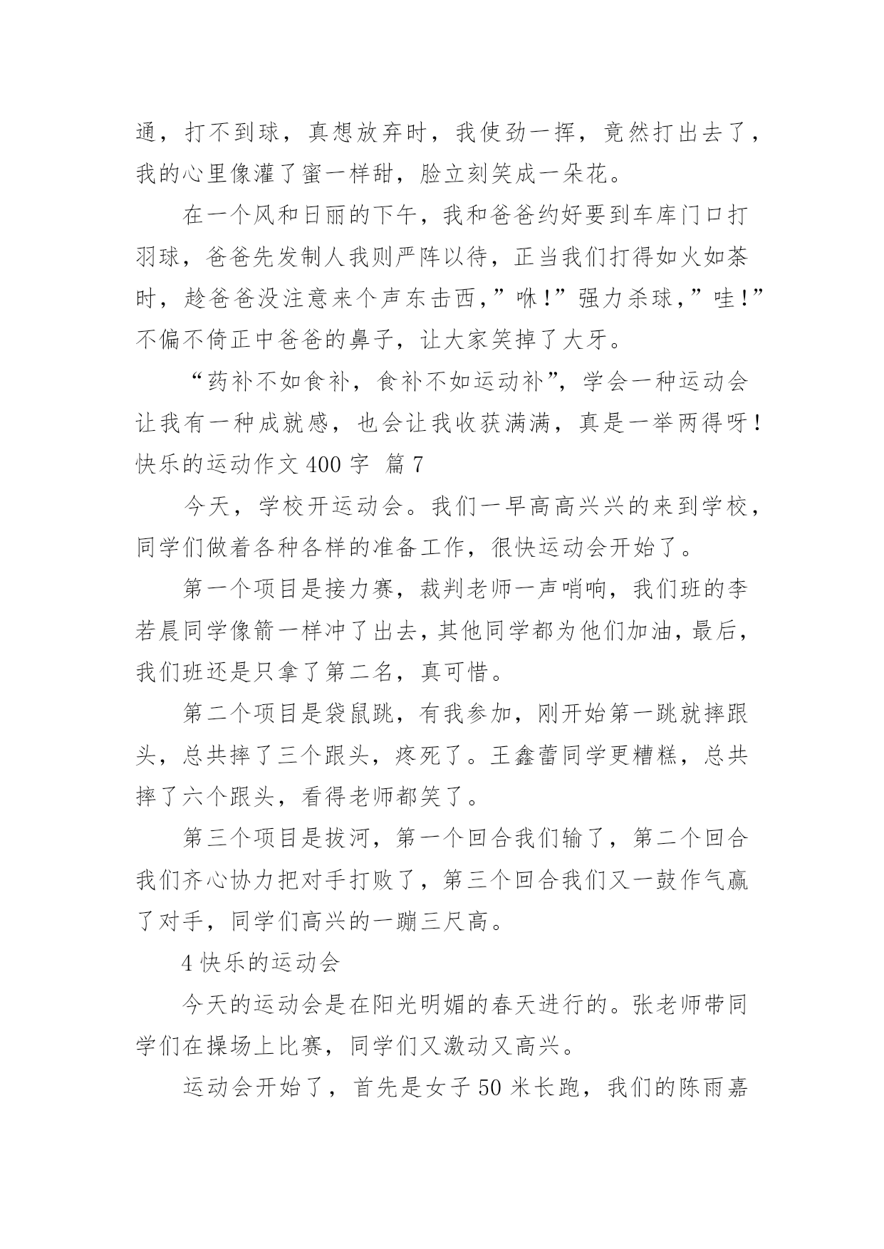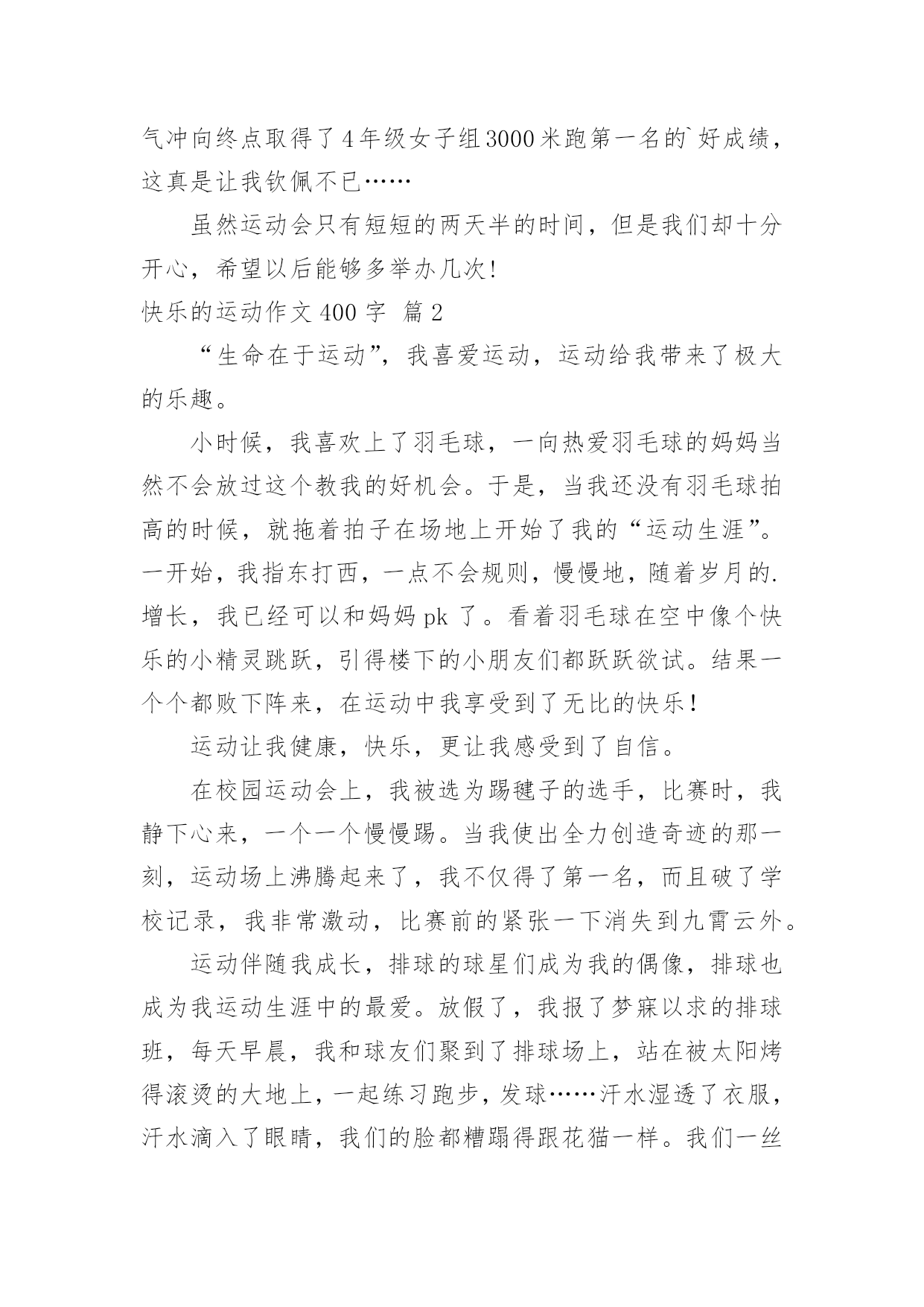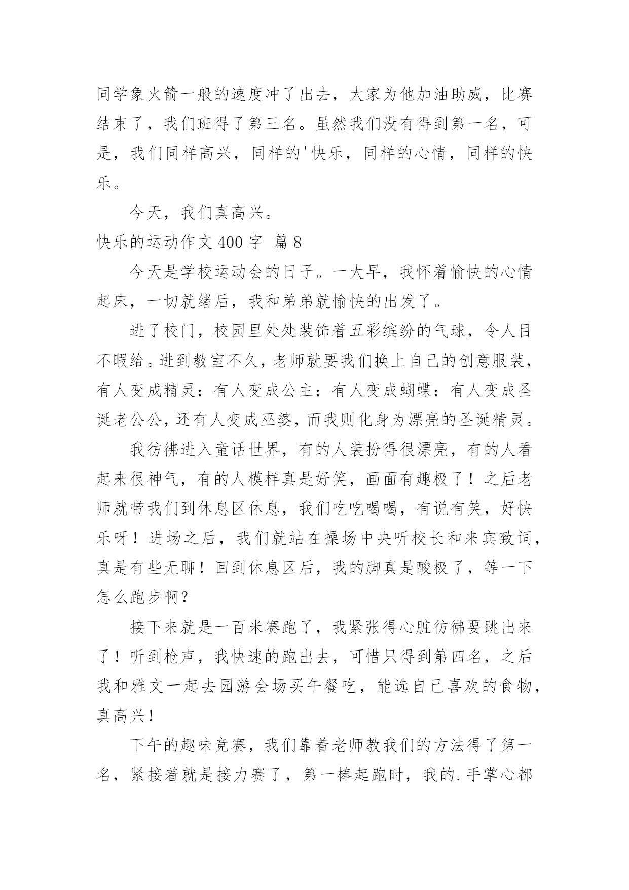 快乐的运动作文400字快乐的运动作文400字【通用】在平平淡淡的学习、工作、生活中,说到作文,大家肯定都不陌生吧,作文要求篇章结构完整,一定要避免无结尾作文的出现。那么你有了解过作文吗?下面是小编收集整理的快乐的运动作文400字8篇,供大家参考借鉴,希望可以帮助到有需要的朋友。快乐的运动作文400字篇1近几天,我们举行了运动会,本次运动会的主题是“体育、文化、科技、创新、综合运动会”首先我们进行了运动会开幕式,接着是运动员入场,然后各个级部展示了特色操……,展示完后运动员退场,运动会就正式开始了!运动会中的项目繁多,有关于运动的,用脑的……可是因为我脚扭伤了没能才加运动会的项目,真是可惜,看着同学拿奖满赞而归的时候,我有说不出的羡慕与嫉妒,可那又能怎样的?哎……但是老师很照顾我们这些没有项目的同学,只要写关于运动会的稿被念了,就可以给自己加五颗星给自己组加500分,于是我便“拼命”得写稿,从运动会开始到结束,我已经中了7篇稿了呢!在运动会的第二天,我们班的高明同学才加了4年级女子组3000米跑得比赛,最后一圈的时候,高铭用尽全身力气冲向终点取得了4年级女子组3000米跑第一名的`好成绩,这真是让我钦佩不已……虽然运动会只有短短的两天半的时间,但是我们却十分开心,希望以后能够多举办几次!快乐的运动作文400字篇2“生命在于运动”,我喜爱运动,运动给我带来了极大的乐趣。小时候,我喜欢上了羽毛球,一向热爱羽毛球的妈妈当然不会放过这个教我的好机会。于是,当我还没有羽毛球拍高的时候,就拖着拍子在场地上开始了我的“运动生涯”。一开始,我指东打西,一点不会规则,慢慢地,随着岁月的.增长,我已经可以和妈妈pk了。看着羽毛球在空中像个快乐的小精灵跳跃,引得楼下的小朋友们都跃跃欲试。结果一个个都败下阵来,在运动中我享受到了无比的快乐!运动让我健康,快乐,更让我感受到了自信。在校园运动会上,我被选为踢毽子的选手,比赛时,我静下心来,一个一个慢慢踢。当我使出全力创造奇迹的那一刻,运动场上沸腾起来了,我不仅得了第一名,而且破了学校记录,我非常激动,比赛前的紧张一下消失到九霄云外。运动伴随我成长,排球的球星们成为我的偶像,排球也成为我运动生涯中的最爱。放假了,我报了梦寐以求的排球班,每天早晨,我和球友们聚到了排球场上,站在被太阳烤得滚烫的大地上,一起练习跑步,发球……汗水湿透了衣服,汗水滴入了眼睛,我们的脸都糟蹋得跟花猫一样。我们一丝不苟地学着,一起分享着运动中的快乐,结下了浓厚的友谊。我在学校里被光荣地选为排球队长,我和球友们在运动中同甘共苦,也要在学习上取长补短,共同进步。我爱运动,运动使我的生活变得丰富多彩,多一份快乐,多一份自信,多一份友谊。作文快乐的运动作文400字篇3星期五,我们金水区文化绿城双语实验小学举办了秋季运动会,有跳小绳,踢毽子,跳大绳比赛,我们一年级参加了跳小绳比赛。早上,学校操场热闹非凡,比赛已经开始。首先是三年级的跳小绳和踢毽子,老师在给运动员记成绩,我们在观看比赛,为他们加油。终于到一年级的比赛,从一一班到一六班每班派出了十名运动员参加跳小绳比赛,按照班级顺序比赛。一一班比赛完是我们一二班的比赛。我和王之玥,张岩彪,田珈畅等十名同学代表班级比赛。我们站到指定的位置,准备好,等老师的哨声,哨声一响我们开始跳绳,我班同学在为我们加油。我的心里很紧张,我要为我们班出一份力,争取拿到第一,比赛快要结束时,我的'两只胳膊快举不起来了,脚也快跳不起来了,但是我一直在坚持,我不想输。老师再次吹起了哨声,比赛结束了。没想到我在一分钟之内跳了145个,中间没有败,比平时跳的多。运动会结束了,我们大家很开心,搬着凳子回到教室。在这次运动会上我体会到了坚持就是胜利,比赛重在参与!快乐的运动作文400字篇4今天要开运动会,早读的时候我们班热闹极了。李老师进了教室,说:“同学们,请快点儿到外面排队。”我们一窝蜂跑出教室,站好队,到了操场。我们爸爸妈妈啦啦队很快也到了操场。第一个项目是往返接力赛,我也参加,李老师带着我们20个运动员整队来到指定的位置。我很高兴可又有点害怕,该到我跑了,我像箭一样地冲了出去,使劲跑啊,可是二条腿跟不上脑子想的快,不过没掉接力把。哦也!这个项目我们班得了第一,我们和老师还有爸爸妈妈爷爷奶奶都在欢呼。后来二个项目我没参加,就当啦啦队,拿着彩带给同学加油,嗓子喊哑了,两只手也摇酸了。最后一个项目是移物投篮,我争取到了第一个投篮,练习了几次都没投中,我很着急,戴眼镜的男老师过来教我们把篮球向上抛,球倒到地上又弹起来,两个爸爸队员把篮伸起来接住了,我这么做就成功了。到正式投的时候我也投中了,后面的.同学差不多都投中了。最后,大家一起喊:“二(4)班胜利了!啊——啊——啊——啊——啊!”我们回到班上,李老师快乐地说:“同学们,你