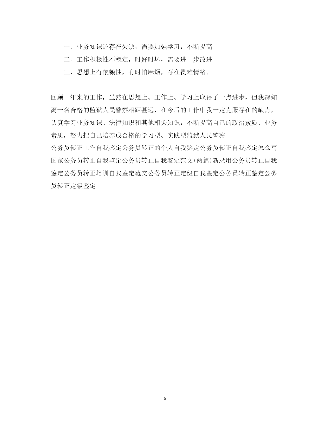 此资料由网络收集而来,如有侵权请告知上传者立即删除。资料共分享,我们负责传递知识。PAGEPAGE6公务员转正自我鉴定最新的本人在一年的试用期中,热衷于本职工作,严格要求自己,时刻保持谦虚、谨慎、律己的态度,勤奋学习、积极进取,努力提高自我。思想上加强政治学习,牢固树立全心全意为人民服务的宗旨和正确的世界观、人生观、价值观,使自己思想认识和自身素质都有了新的提高。2017年3月的公务员入职培训,使我对公务员的工作性质有了大致的了解,对公务员必须遵守的规章制度以及办事准则有了明确认识。这一年来,陆续参加了环境创优年深化作风建设活动、守纪律、强素质作风建设活动及回头看等活动的学习。通过这一系列学习,使我在政治上更加清醒,始终坚持与党的组织保持高度一致;纪律上不断加强自身约束,始终把作风建设放在首位。做到了政治纪律严明,自觉维护**部门在人民群众中的整体形象。重视加强理论和业务知识学习。在工作中,我坚持一边工作一边学习,不断提高自身的综合素质。作为机关工作人员,应具备开口能讲、下笔能写、有事能做、无事能思的基本能力。我通过近一年的学习,日常事务处理能力得到了提高,公文拟定、情况收集、报表统计逐渐规范,已能自如地完成本职工作。另外,通过环保法律、法规及环境相关书籍的学习,从理论上武装了自己,为开展好各项工作夯实了基础。自我鉴定回顾这一年来的工作,我在思想上、学习上、工作上取得了一定的成绩,但我也清醒地认识到自己的不足之处,还需要在实践中不断的完善自我、充实自我。今后,我一定会勤奋工作,进一步加强学习,不断的提高自身综合素质,为**工作作出应有的贡献。【公务员转正自我鉴定范文二】**年**月,经过**省公务员录用考试,我非常荣幸的成为了一名国家公务员。一年来,在领导的关心培养下、在同志们的帮助支持下,我圆满地完成了自己所承担的工作任务,思想政治素质和业务工作能力等都取得了较大的进步和提高。现将我一年来的工作总结如下:一、严于律己、坚定信念,坚持全心全意为人民服务。一年来,我始终坚持运用辩证唯物主义和历史唯物主义去分析、解决问题,坚持实践是检验真理的唯一标准。始终坚持共产主义信念,坚持正确的世界观、人生观、价值观,认真贯彻执行党的路线、方针、政策,坚持全心全意为人民服务。同时,恪守职业道德,遵守党校规章,认真工作,勤奋学习,尊敬领导,团结同事。二、勤奋刻苦、加强学习,不断提高理论知识水平和业务水平。一年来,我始终坚持加强理论学习,不断提高自身理论知识素养。一是积极参加单位组织的各项学习活动。认真参加了党员春训、党风廉政建设学习会等理论学习活动,深入学习了科学发展观和十七届六中全会精神,切实提高了自己的理论知识水平。二是积极参加公务员学习培训。**年**月,我参加了**公务员初任培训,学习并掌握了国家公务职人员的行为规范准则及专业技术知识,明确了全心全意为人民服务的工作宗旨。三是坚持自主学习。在工作之余,我不断加强自主学习,关注社会热点时事,了解民生动态,学习党的理论新成果,同时,积极学习优秀教学经验和业务知识,认真做好各项工作。三、认真工作、坚持进取,认真完成各项工作任务。在工作中,我始终坚持履行工作规范,不迟到不早退,按时按质完成领导交办的各项工作任务。同时,始终坚持多动手、多动脑、多请教,不断学习,不断积累,不断改进工作方式,努力做好各项工作。一是认真做好人事报表、文件收发、文件撰写、会务组织、档案处理等办公室各项工作;二是科学安排时间,按照分工协作、全力配合的原则,做好领导交办的工作任务和调研任务。通过一年来的努力,我在学习和工作中逐渐成长、成熟,积累了一定的实践工作经验。但是,我清楚自身还存在一些不足,尤其在政治理论学习和工作方面还需要进一步加强和完善。在今后的学习和工作中,我将继续加强理论学习,不断解放思想,转变作风,坚持与时俱进,扎实工作。【公务员转正自我鉴定范文三】我于2017年参加xx省公务员考试,被录用为公务员,20xx年11月被分配到xx省**监狱工作。一年来,在各级领导的关心培养和同事们的支持帮助下,我立足本职工作,严格要求自己,时刻保持谦虚、认真、务实的工作态度,始终坚持刻苦钻研、勤奋学习,切实履行好岗位职责,认真完成各项工作任务,在实际工作中不断锻炼自己、磨练自己,工作能力有了很大的提高,但同时还存在着欠缺和不足,现从德、能、勤、绩、廉五个方面将一年来的思想、工作、学习情况总结如下:一、坚定立场,加强学习,不断增强自身素质和修养。作为一名新时期的监狱人民警察,首先要有坚定的政治立场,时刻同党中央保持高度的一致。一年来,我认真学习和贯彻执行党的基本路线、方针、政策,自觉践行三个代表重要思想和党的十七大精神,严格遵守《监狱法》、《人民警察法》、《公务员法》等法律和司法