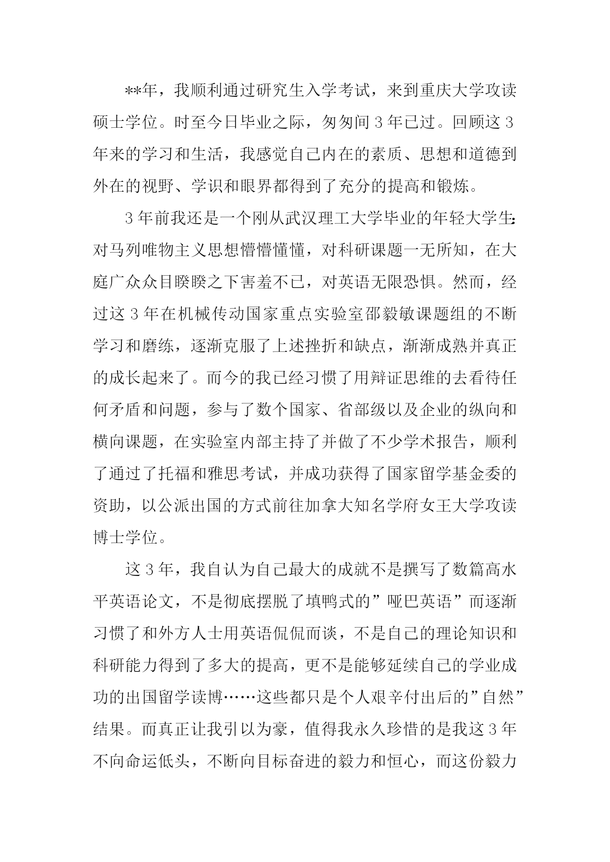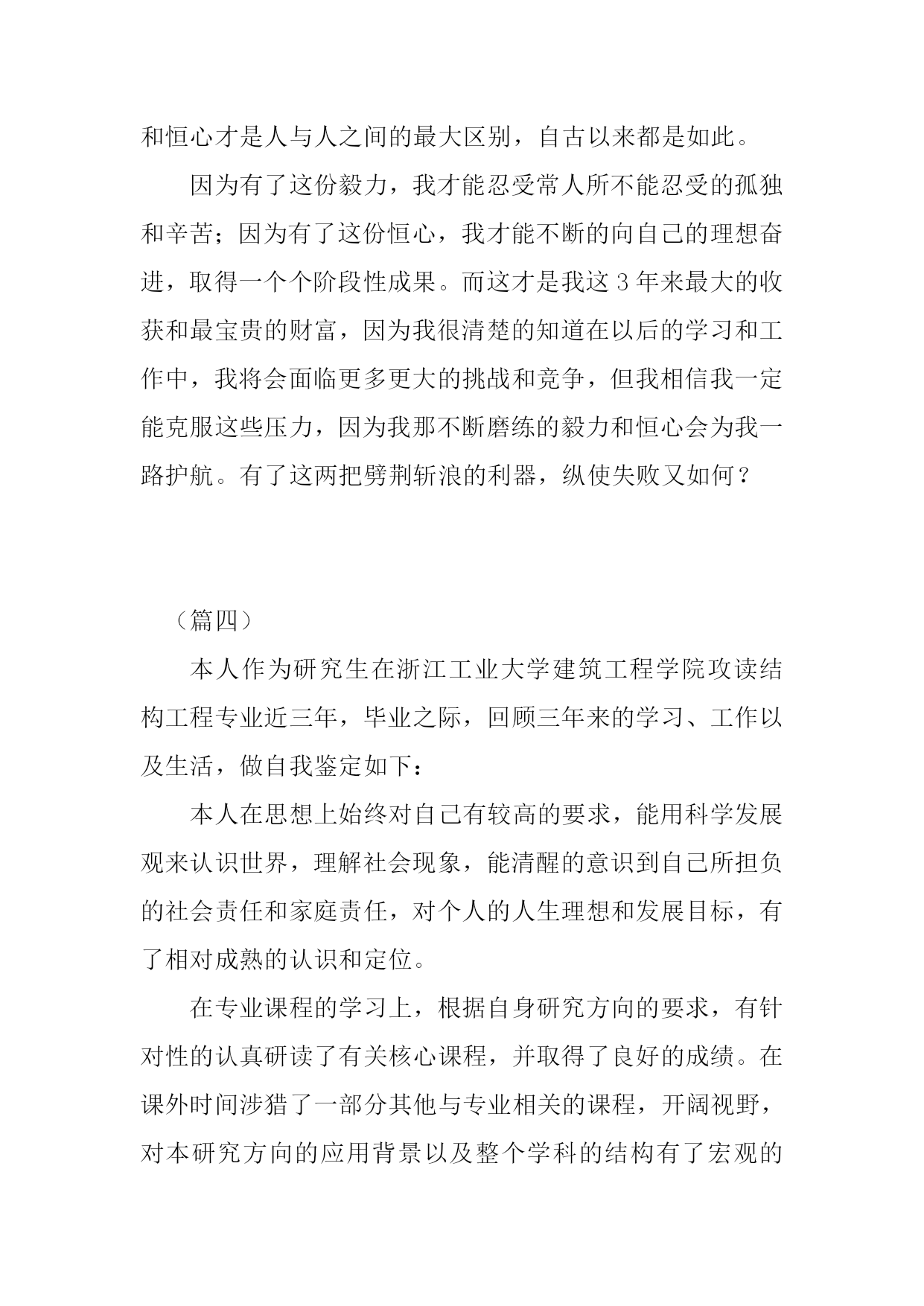 精选研究生毕业自我鉴定书11篇(篇一)回首研究生三年,心怀感恩。这三年来我获得的最好的礼物就是学会独立思考,批判的吸收知识。并且对于学习,找到了最初的初心。学习不是功利性目的的手段,而它本来就是一件快乐的事,我们生而为人,与动物最大的差别就在于除了满足生存的需要,我们有好奇心,会为了探索了解这个世界而不断前进,一代代传承。作为重点大学的毕业生,我们不仅仅是要找一份好工作,还应有一份责任感,作为先锋和引领者,为我们人类的进步与社会的幸福做出一点点微薄的贡献。在学习方法上,通过实践与总结,也有了一些心得。不管学任何东西,都要踏踏实实打好基础,基础是后面进步的加速度。一是不会迷失在爆炸的大量信息中,二是掌握最本质的东西,才能真正理解,并提出自己独特的方法。做事与学习也不只局限于眼前的利益,做事本身都有成长,做自己该做的事,都自己喜欢的书。做过的事读过的书不会白费,所有这些都是我成为现在的我的原因。多年来父母过高的期待让自己一直有一种焦虑感,过于看中目标,而对自己太苛责,并且无法享受过程。通过三年的学习与思考与自己和解了,渐渐找到真正的自己。眼界不再局限于身边,拥有开阔的眼界后,发现世界之大,任何生活方式都值得尊重,成功不只是有个好工作,获得自己内心的认可与喜悦是最大的成功。生活方面,坚持每周健身四次已经一年零三个月了,不仅带给我健康的身体,也慢慢改变着我的品格。渐渐不再那么急功近利,学会享受每一次流汗,学会耐心,学会坚持。明白坚持的意义,发现不功利的进步有多快乐。处在信息爆炸的时代,很容易被巨量的信息吞没,也很容易在一个地方生活久了,眼界狭窄,感谢我在这三年中学会的独立思考能力,能够在这纷繁的世界中坚定前行。(篇二)自*年9月入校以来,这两年半的研究生生活充实而有意义,本人觉得成长迅速,收获颇丰,现做自我鉴定如下:在思想上,认真学习马列主义、毛泽东思想、邓小平理论和“三个代表”重要思想,关心时政,坚决拥护党的路线、方针和政策。虽然组织上未入党,但在思想上时刻以合格党员的标准要求自己,用科学发展观认识世界,清醒地意识到,只有通过自身发展,才能与社会接轨,实现理想和目标。在学习上,刻苦勤奋,各门课程的成绩均达到了研究生培养计划的要求。在努力掌握好专业基础理论知识的同时,理论联系实际,加强实际动手、开展实验的能力。在英语方面,极大地提高了听、说、读、写能力,具备较强的外文专业资料阅读和写作能力。在科研上,我的研究方向信息安全与图像处理,在导师的指导下,我很快确定了自己的研究方向,并有针对性的认真研读了大量书籍文献,为自己的科研工作打下了扎实的基础。积极参与国家863计划课题,主动开展研究并取得了较为满意的成果,极大地锻炼了科研能力,尤其是在独立思考判断和自主研究方面有了很大进步,相信这些对于未来从事的工作是有帮助的。在生活中,和同学相处融洽,为人诚实守信,与同学交往时,积极寻找并改正自身缺点,发现并学习他人优点,完善自我。在研究生阶段,本人从思想、学习、科研到处世,都得到了充分的培养和锻炼,相信这两年半的积累和沉淀将使我终身受益,在以后的工作和学习中,我将继续充实自我,提高自我,争取为社会做出一个合格的工科研究生应有的贡献。(篇三)**年,我顺利通过研究生入学考试,来到重庆大学攻读硕士学位。时至今日毕业之际,匆匆间3年已过。回顾这3年来的学习和生活,我感觉自己内在的素质、思想和道德到外在的视野、学识和眼界都得到了充分的提高和锻炼。3年前我还是一个刚从武汉理工大学毕业的年轻大学生:对马列唯物主义思想懵懵懂懂,对科研课题一无所知,在大庭广众众目睽睽之下害羞不已,对英语无限恐惧。然而,经过这3年在机械传动国家重点实验室邵毅敏课题组的不断学习和磨练,逐渐克服了上述挫折和缺点,渐渐成熟并真正的成长起来了。而今的我已经习惯了用辩证思维的去看待任何矛盾和问题,参与了数个国家、省部级以及企业的纵向和横向课题,在实验室内部主持了并做了不少学术报告,顺利了通过了托福和雅思考试,并成功获得了国家留学基金委的资助,以公派出国的方式前往加拿大知名学府女王大学攻读博士学位。这3年,我自认为自己最大的成就不是撰写了数篇高水平英语论文,不是彻底摆脱了填鸭式的”哑巴英语”而逐渐习惯了和外方人士用英语侃侃而谈,不是自己的理论知识和科研能力得到了多大的提高,更不是能够延续自己的学业成功的出国留学读博……这些都只是个人艰辛付出后的”自然”结果。而真正让我引以为豪,值得我永久珍惜的是我这3年不向命运低头,不断向目标奋进的毅力和恒心,而这份毅力和恒心才是人与人之间的最大区别,自古以来都是如此。因为有了这份毅力,我才能忍受常人所不能忍受的孤独和辛苦;因为有了这份恒心,我才能不断的向自己的理想奋进,取得一个个阶段性成