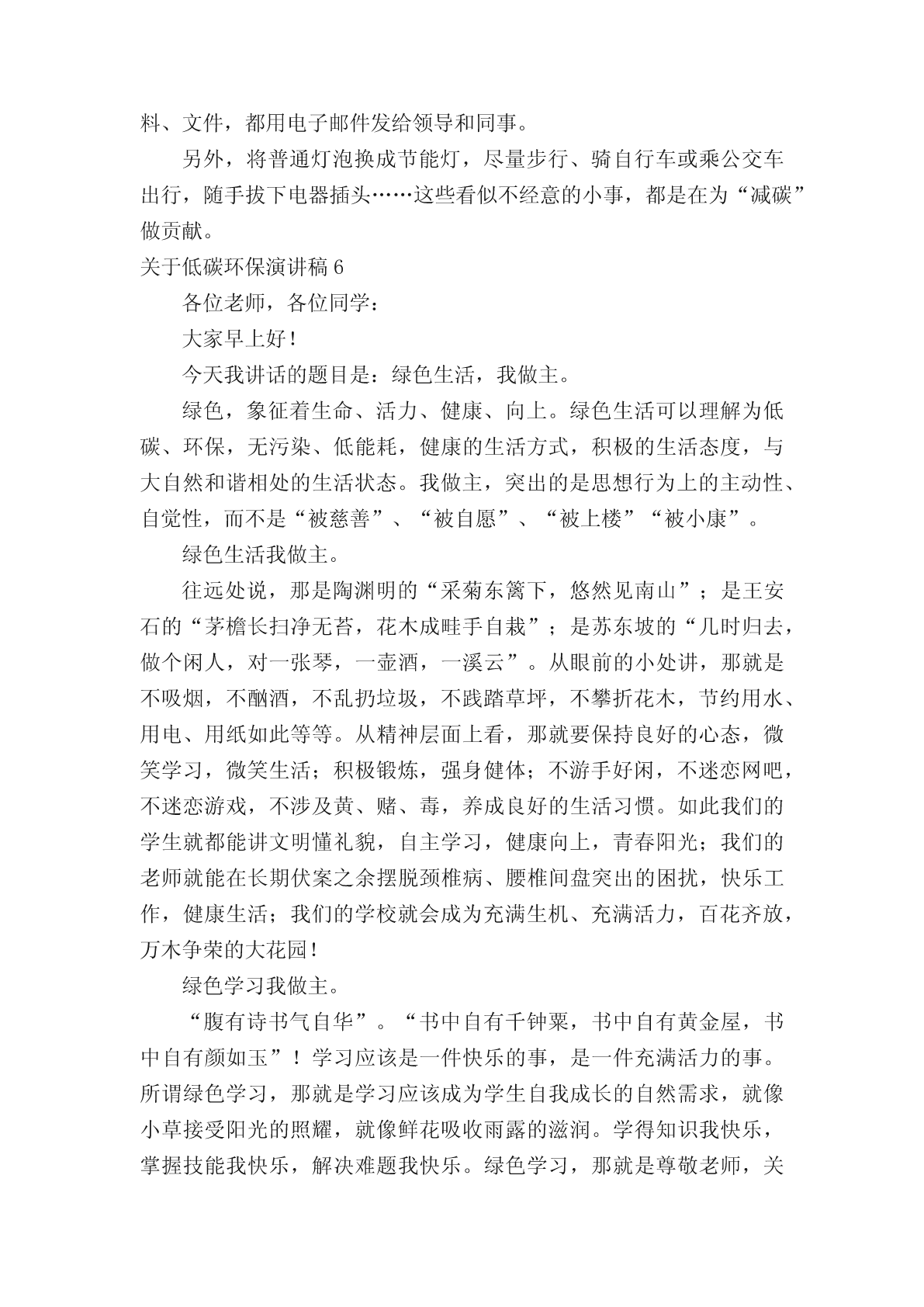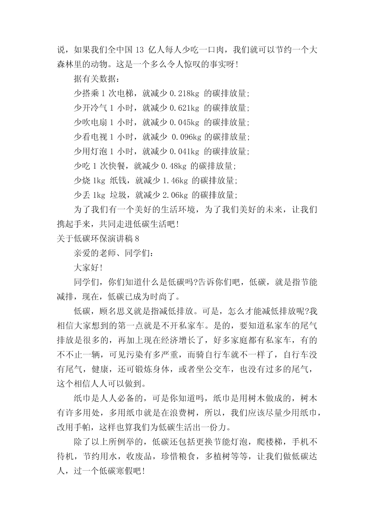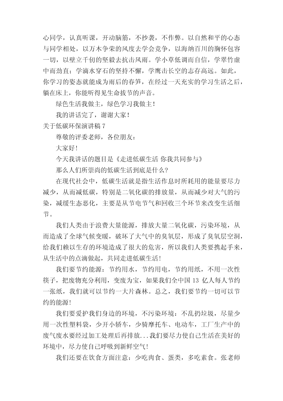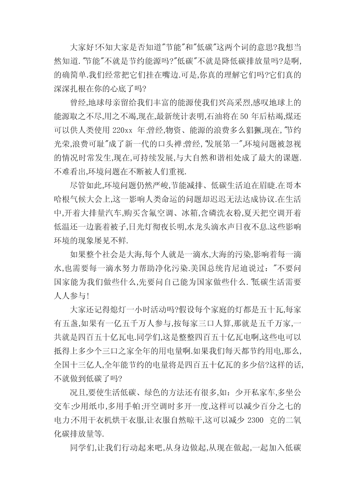 低碳环保演讲稿关于低碳环保演讲稿(通用15篇)关于低碳环保演讲稿1亲爱的同学们我们经常在网上、电视、报纸上看到“低碳生活”这个词语。什么是低碳生活?低碳,意指较低的温室气体排放。就是低能量,低消耗的生活方式。简单理解,低碳生活就是返璞归真地去进行人与自然的活动。因此低碳生活是我国提倡生活方式之一。低碳生活代表着更健康、更自然、更安全的生活,同时也是一种低成本、低代价的生活方式。如何做到低碳生活呢?只有从小事做起,身体力行。我准备这样做:随手关灯、开关、拔插头,这是第一步,也是个人修养的表现;不坐电梯爬楼梯,省下大家的电,换自己的健康;第二、在我们玩电脑、看电视时应尽量将屏幕亮度调低一点,这样就能减少一些电耗;第三、多步行,骑自行车,少坐汽车;四、少用纸巾,重拾手帕,保护森林;五、少用塑料袋和快餐盒,减少白色污染。让我们行动起来吧!从我做起,从小事做起,走进低碳生活,创造美好的生活环境!关于低碳环保演讲稿2亲爱的老师、同学们:大家好!低碳生活,就是指生活作息时所耗用的能量要尽力减少,从而减低二氧化碳的排放量。我们应该积极提倡并去实践低碳生活,注意节电、节油、节气,从点滴做起。我可是个低碳能手。关于低碳,我知道许多妙点子:选用节能空调,省电每天做到,同样的制冷效果,更少的耗电需求,这就是节能空调的妙处。用完电器拔插头,省电又安全,看完了电视和DVD,摁下遥控器并不是彻底关机,其实它还在耗电,只有将电源拔下,它才彻底不耗电。少买不必要的衣服,服装在生产,加工和运输过程中,要消耗大量的能源,同时产生废气,废水等污染物。在保证生活需要的前提下,每人每年少买一件不必要的衣服可节能约2。5千克标准煤,相应减排二氧化碳6。4千克。在学习做功课时,我也有许多妙招。纸张的双面使用,节约用纸;铅笔短了,用笔套套着又可以用一两个星期;收集所有作业本未用完的纸,订成一本又是新本子;写字台前用节能灯……告诉你们,我们家也是低碳家庭。妈妈将洗脸之后的水用来洗脚;将洗衣、洗菜的生活废水收集起来冲厕所等。爸爸爱开车,现在为了低碳,他每天尽量骑自行车出门。奶奶爱剪纸,每次剩下的纸都会给我打草稿。爷爷爱看电视,可现在为了低碳,少看电视多运动。而我,暂时不用电脑时,会将电脑开到睡眠状态。我们一家人都是低碳能手。低碳生活,体现在一件件小事中。让我们行动起来,人人争做低碳能手!关于低碳环保演讲稿3亲爱的老师、同学们:大家好!为什么自然灾害总是靠近我们?为什么地球会受到这么的灾害?那是因为我们不会保护地球,还有人肆意破坏地球。20××年刚刚过去,澳大利亚就迎接20××年第一次灾害——洪水。这次的洪水把整个澳大利亚南部吞没在海水里。人们不得不逃到屋顶上避难,自己的家园也被毁灭了。对于人类社会来说,自然灾害是恶魔,无数人辛苦创造的物质财富、文明成果在它的肆虐下毁于一旦。造成这种现象的发生,与人类排放温室气体有密切的关系。所以我们要保护好地球,我向大家提出以下建议:1、少买车,少开车,多乘坐使用公共交通工具。2、少用耗电产品,多用节能产品,如,变频空调、节能灯等。3、不浪费水资源,把用过的水存起来,可以用作浇花、冲马桶。4、把旧报纸、废电池、塑胶、玻璃等可以循环利用的物品拿去回收站,循环利用保护环境。5、多种绿色植物,美化生活,美化环境。低碳生活,保护地球。地球只有一个,我们不能让地球受到更多灾难。关于低碳环保演讲稿4亲爱的老师、同学们:大家好!现在,全球都在实行低碳生活。“今天你低碳了吗?”这句子话几乎人人都挂在嘴边,一见朋友就会问。可是说到底,你真的每天都低碳吗?恐怕没有。但是不管怎么样,大家一定要有这样的意识。其实,我也有不低碳的时候,就拿这件事来说吧。有一次,妈妈让我去超市买点水果。我拿了钱正要冲出去,妈妈叫住了我,说:“阳阳,等一等!你忘拿了一样东西。”我停下了脚步,摸摸口袋,没有忘拿东西呀!我又望望天空,太阳大得很,没有要下雨的意思。于是,我问妈妈:“我忘拿了什么?”妈妈一脸严肃地说:“环保袋!”我一听顿时恍然大悟。妈妈接着说:“你不是常常说要低碳、要低碳吗?怎么轮到自己就做不到了?低碳要从一件件小事做起,要从一个个细节做起!”听了妈妈语重心长的话后,我惭愧得无地自容,深深地低下了头。少用一滴水,节约一度电,多用环保袋,少开一天车,少砍一棵树……这样的种种表现,都是低碳的体现。低碳要从点点滴滴做起,日积月累,积少成多,这样一天又一天地下去,一定可以使我们的家园——地球,再次焕发生机!今天你低碳了吗?我相信,再有人问起你时,你一定会自信地回答:“我低碳了!”关于低碳环保演讲稿5尊敬的评委老师,各位朋