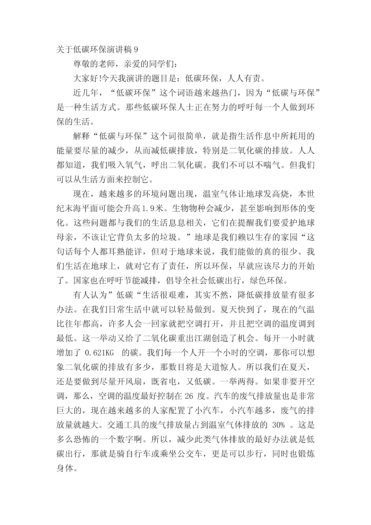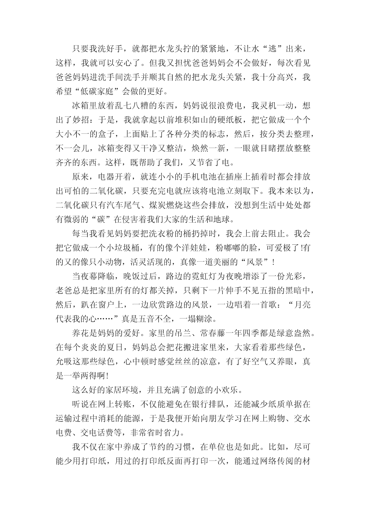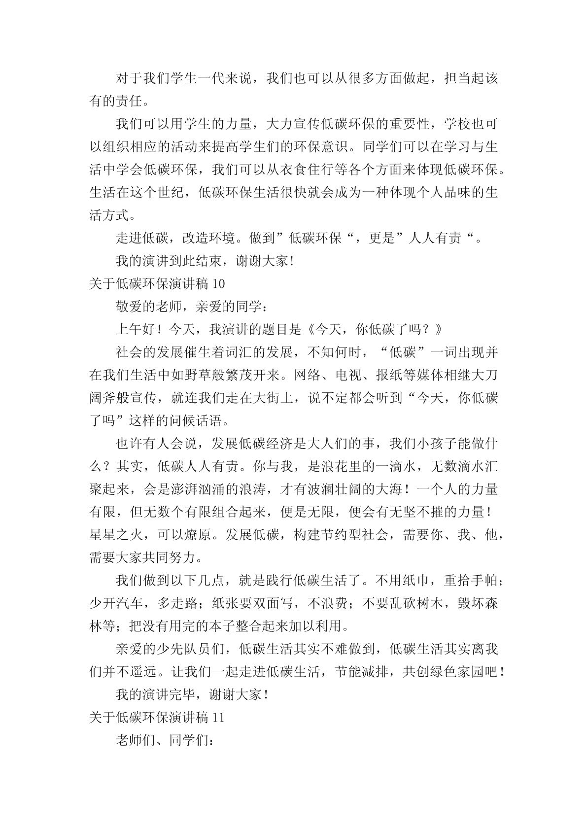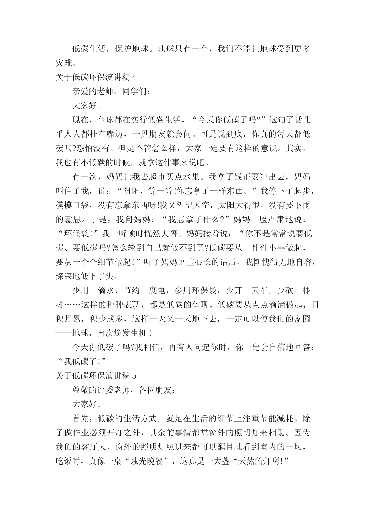 低碳环保演讲稿关于低碳环保演讲稿(通用15篇)关于低碳环保演讲稿1亲爱的同学们我们经常在网上、电视、报纸上看到“低碳生活”这个词语。什么是低碳生活?低碳,意指较低的温室气体排放。就是低能量,低消耗的生活方式。简单理解,低碳生活就是返璞归真地去进行人与自然的活动。因此低碳生活是我国提倡生活方式之一。低碳生活代表着更健康、更自然、更安全的生活,同时也是一种低成本、低代价的生活方式。如何做到低碳生活呢?只有从小事做起,身体力行。我准备这样做:随手关灯、开关、拔插头,这是第一步,也是个人修养的表现;不坐电梯爬楼梯,省下大家的电,换自己的健康;第二、在我们玩电脑、看电视时应尽量将屏幕亮度调低一点,这样就能减少一些电耗;第三、多步行,骑自行车,少坐汽车;四、少用纸巾,重拾手帕,保护森林;五、少用塑料袋和快餐盒,减少白色污染。让我们行动起来吧!从我做起,从小事做起,走进低碳生活,创造美好的生活环境!关于低碳环保演讲稿2亲爱的老师、同学们:大家好!低碳生活,就是指生活作息时所耗用的能量要尽力减少,从而减低二氧化碳的排放量。我们应该积极提倡并去实践低碳生活,注意节电、节油、节气,从点滴做起。我可是个低碳能手。关于低碳,我知道许多妙点子:选用节能空调,省电每天做到,同样的制冷效果,更少的耗电需求,这就是节能空调的妙处。用完电器拔插头,省电又安全,看完了电视和DVD,摁下遥控器并不是彻底关机,其实它还在耗电,只有将电源拔下,它才彻底不耗电。少买不必要的衣服,服装在生产,加工和运输过程中,要消耗大量的能源,同时产生废气,废水等污染物。在保证生活需要的前提下,每人每年少买一件不必要的衣服可节能约2。5千克标准煤,相应减排二氧化碳6。4千克。在学习做功课时,我也有许多妙招。纸张的双面使用,节约用纸;铅笔短了,用笔套套着又可以用一两个星期;收集所有作业本未用完的纸,订成一本又是新本子;写字台前用节能灯……告诉你们,我们家也是低碳家庭。妈妈将洗脸之后的水用来洗脚;将洗衣、洗菜的生活废水收集起来冲厕所等。爸爸爱开车,现在为了低碳,他每天尽量骑自行车出门。奶奶爱剪纸,每次剩下的纸都会给我打草稿。爷爷爱看电视,可现在为了低碳,少看电视多运动。而我,暂时不用电脑时,会将电脑开到睡眠状态。我们一家人都是低碳能手。低碳生活,体现在一件件小事中。让我们行动起来,人人争做低碳能手!关于低碳环保演讲稿3亲爱的老师、同学们:大家好!为什么自然灾害总是靠近我们?为什么地球会受到这么的灾害?那是因为我们不会保护地球,还有人肆意破坏地球。20××年刚刚过去,澳大利亚就迎接20××年第一次灾害——洪水。这次的洪水把整个澳大利亚南部吞没在海水里。人们不得不逃到屋顶上避难,自己的家园也被毁灭了。对于人类社会来说,自然灾害是恶魔,无数人辛苦创造的物质财富、文明成果在它的肆虐下毁于一旦。造成这种现象的发生,与人类排放温室气体有密切的关系。所以我们要保护好地球,我向大家提出以下建议:1、少买车,少开车,多乘坐使用公共交通工具。2、少用耗电产品,多用节能产品,如,变频空调、节能灯等。3、不浪费水资源,把用过的水存起来,可以用作浇花、冲马桶。4、把旧报纸、废电池、塑胶、玻璃等可以循环利用的物品拿去回收站,循环利用保护环境。5、多种绿色植物,美化生活,美化环境。低碳生活,保护地球。地球只有一个,我们不能让地球受到更多灾难。关于低碳环保演讲稿4亲爱的老师、同学们:大家好!现在,全球都在实行低碳生活。“今天你低碳了吗?”这句子话几乎人人都挂在嘴边,一见朋友就会问。可是说到底,你真的每天都低碳吗?恐怕没有。但是不管怎么样,大家一定要有这样的意识。其实,我也有不低碳的时候,就拿这件事来说吧。有一次,妈妈让我去超市买点水果。我拿了钱正要冲出去,妈妈叫住了我,说:“阳阳,等一等!你忘拿了一样东西。”我停下了脚步,摸摸口袋,没有忘拿东西呀!我又望望天空,太阳大得很,没有要下雨的意思。于是,我问妈妈:“我忘拿了什么?”妈妈一脸严肃地说:“环保袋!”我一听顿时恍然大悟。妈妈接着说:“你不是常常说要低碳、要低碳吗?怎么轮到自己就做不到了?低碳要从一件件小事做起,要从一个个细节做起!”听了妈妈语重心长的话后,我惭愧得无地自容,深深地低下了头。少用一滴水,节约一度电,多用环保袋,少开一天车,少砍一棵树……这样的种种表现,都是低碳的体现。低碳要从点点滴滴做起,日积月累,积少成多,这样一天又一天地下去,一定可以使我们的家园——地球,再次焕发生机!今天你低碳了吗?我相信,再有人问起你时,你一定会自信地回答:“我低碳了!”关于低碳环保演讲稿5尊敬的评委老师,各位朋