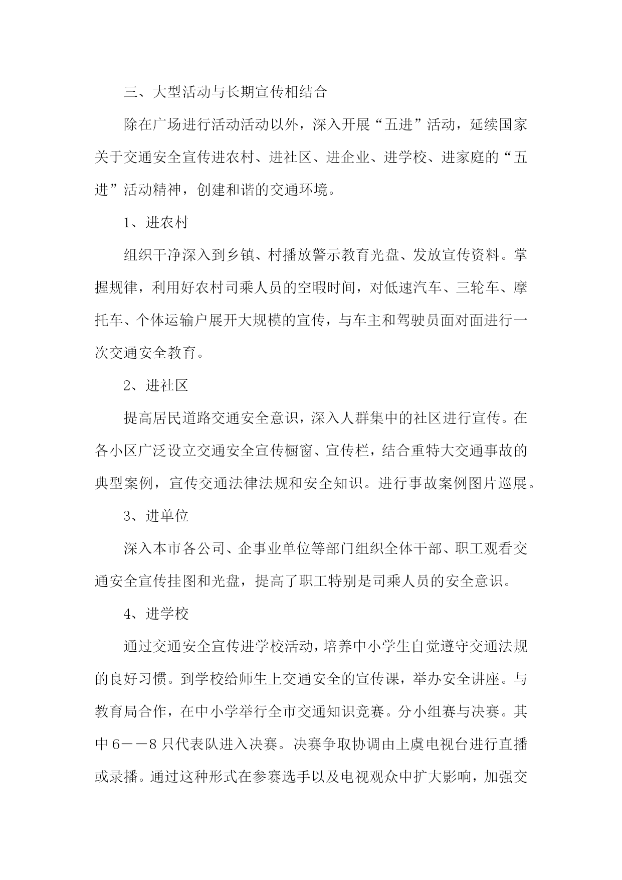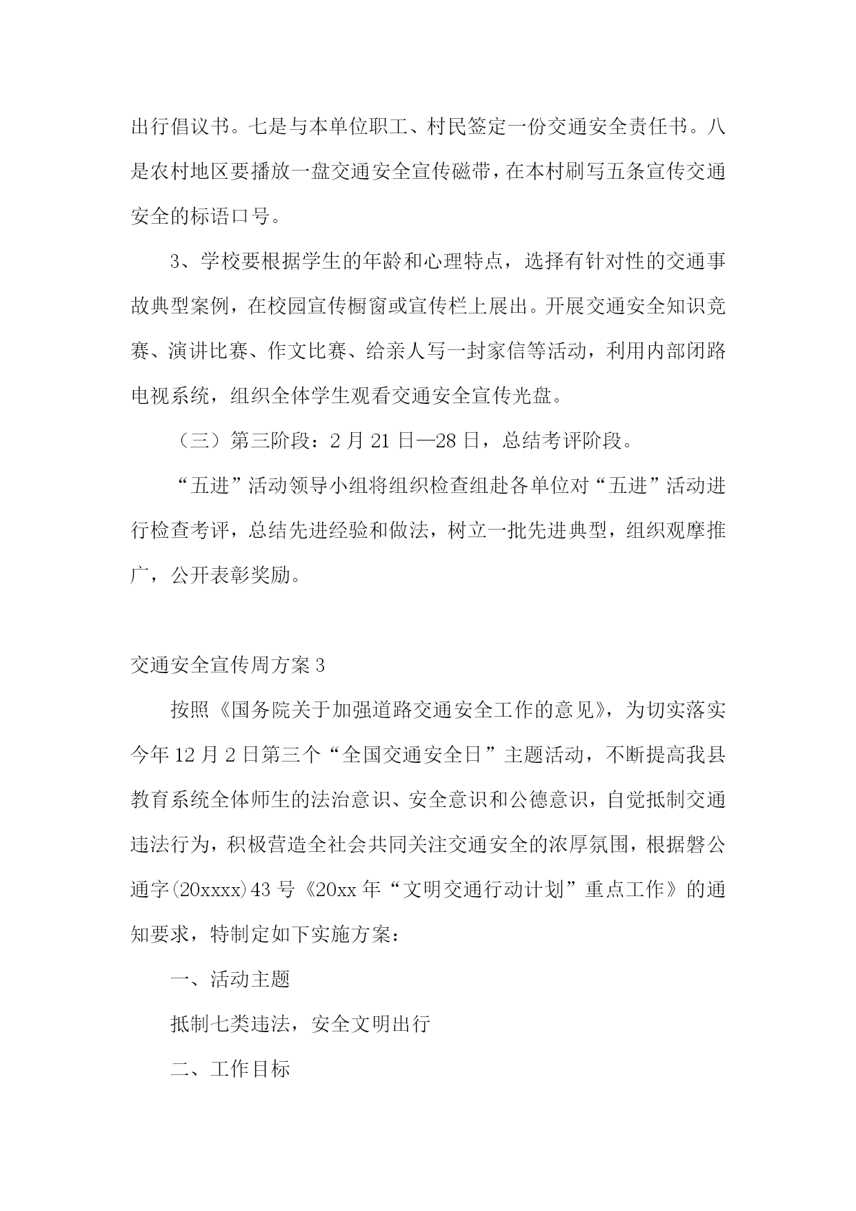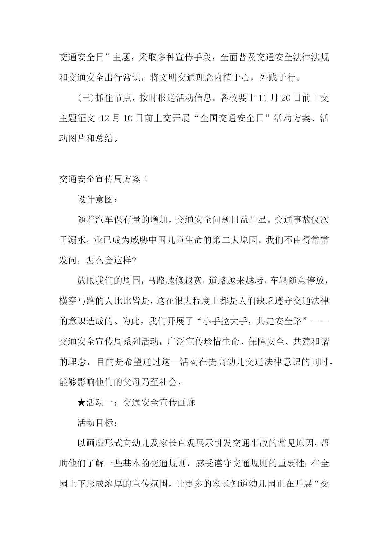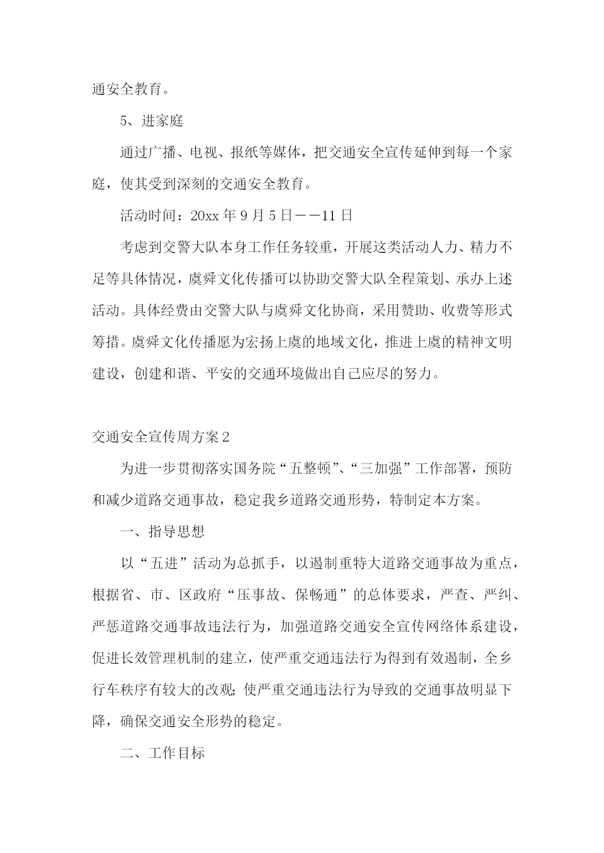 交通安全宣传周方案交通安全宣传周方案1道路交通安全关系着每个市民的日常生活甚至生命安全,关系到企业正常的经营秩序。在维护交通安全,宣传交通法规,妥善处理事故等方面,上虞交警大队付出了辛勤的劳动,也取得了让人振奋的成绩。为了尽一步的开展交通安全工作,动员社会各方面力量来关注交通安全,切实把交通法规宣传教育深入人心。本文来源于公文易爱心文提高广大群众的交通安全意识和自我保护意识,充分发挥交通安全宣传工作在预防和减少道路交通事故中的重要作用,最大限度地减少道路交通事故造成的危害,减少违章行为,我们虞舜文化传播策划这次以“珍惜生命,平安是福”为主题的交通安全宣传周活动。对广大群众深入开展交通安全的教育,希望能为交警大队的工作以及安全交通环境的创造等等方面起到一点参考作用,不当之处请多多指正。活动时间:20xx年9月5日――11日活动形式:一、开展为期一日的换位试岗试岗前通过交通伴你行栏目进行人员与岗位征集,同时为此次活动进行宣传。替换下来的司机作为交通协管员,在市区各路口执勤。交警则换位作为司机。活动结束后展开关于这次换岗的讨论,通过这种换位思考和彼此沟通,密切警民关系,改进工作作风,为上虞的交通状况改善创造一个良好的环境。时间:20xx年9月10日二、大型活动在文化广场举行一场别开生面的普及交通安全法文艺演出。活动期间编排演出有关交通安全的文艺节目。并穿插交通指挥手势表演与竟猜,交通标志竟猜等互动活动。提高观众的参与热情。活动期间在广场设立了交警宣传站,搭建不同展台,开展不同的互动活动1、向群众宣传解答有关问题2、违章处理咨询3、交通安全片资料播放4、事故案例图片展5、编印《交通安全知识实用读本》,活动期间组织民警向群众发放6、交通安全知识讲解7、与电台合作与上虞人民广播电台交通伴你行栏目合作,利用交通台观众的针对性强,与广大司机朋友联系紧密等特点。在活动进行前,对本次活动进行宣传,活动期间邀请交通伴你行栏目组在广场对整个活动进行直播,或部分直播。交通台主持兼作本次活动主持,设计一些的活动版快,吸引活动期间,广大司机朋友的参与热情。并邀请参加换岗的警察和司机代表参加活动,并在节目中畅谈换岗感受。时间:20xx年9月11日三、大型活动与长期宣传相结合除在广场进行活动活动以外,深入开展“五进”活动,延续国家关于交通安全宣传进农村、进社区、进企业、进学校、进家庭的“五进”活动精神,创建和谐的交通环境。1、进农村组织干净深入到乡镇、村播放警示教育光盘、发放宣传资料。掌握规律,利用好农村司乘人员的空暇时间,对低速汽车、三轮车、摩托车、个体运输户展开大规模的宣传,与车主和驾驶员面对面进行一次交通安全教育。2、进社区提高居民道路交通安全意识,深入人群集中的社区进行宣传。在各小区广泛设立交通安全宣传橱窗、宣传栏,结合重特大交通事故的典型案例,宣传交通法律法规和安全知识。进行事故案例图片巡展。3、进单位深入本市各公司、企事业单位等部门组织全体干部、职工观看交通安全宣传挂图和光盘,提高了职工特别是司乘人员的安全意识。4、进学校通过交通安全宣传进学校活动,培养中小学生自觉遵守交通法规的良好习惯。到学校给师生上交通安全的宣传课,举办安全讲座。与教育局合作,在中小学举行全市交通知识竞赛。分小组赛与决赛。其中6――8只代表队进入决赛。决赛争取协调由上虞电视台进行直播或录播。通过这种形式在参赛选手以及电视观众中扩大影响,加强交通安全教育。5、进家庭通过广播、电视、报纸等媒体,把交通安全宣传延伸到每一个家庭,使其受到深刻的交通安全教育。活动时间:20xx年9月5日――11日考虑到交警大队本身工作任务较重,开展这类活动人力、精力不足等具体情况,虞舜文化传播可以协助交警大队全程策划、承办上述活动。具体经费由交警大队与虞舜文化协商,采用赞助、收费等形式筹措。虞舜文化传播愿为宏扬上虞的地域文化,推进上虞的精神文明建设,创建和谐、平安的交通环境做出自己应尽的努力。交通安全宣传周方案2为进一步贯彻落实国务院“五整顿”、“三加强”工作部署,预防和减少道路交通事故,稳定我乡道路交通形势,特制定本方案。一、指导思想以“五进”活动为总抓手,以遏制重特大道路交通事故为重点,根据省、市、区政府“压事故、保畅通”的总体要求,严查、严纠、严惩道路交通事故违法行为,加强道路交通安全宣传网络体系建设,促进长效管理机制的建立,使严重交通违法行为得到有效遏制,全乡行车秩序有较大的改观;使严重交通违法行为导致的交通事故明显下降,确保交通安全形势的稳定。二、工作目标通过道路交通安全宣传进社区、进农村、进学校、进企业、进家庭“五进”活动的开展,全面提高群众交通安全意识,逐步建立交通安全教育社会化制度;努力实现村镇居民、单位职工、社区居民、机动车驾驶人、在校学生交通法规教育率分别达到65%、75%、80%