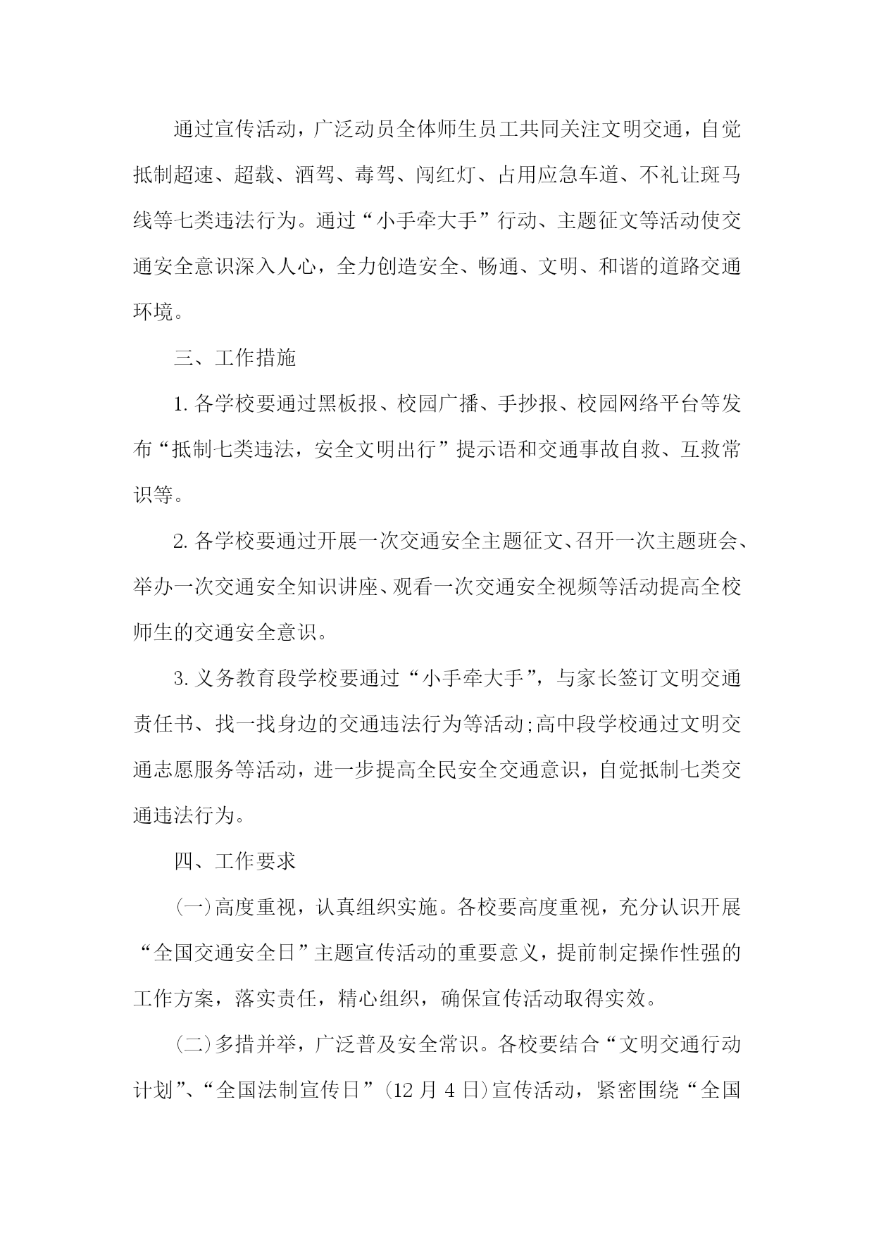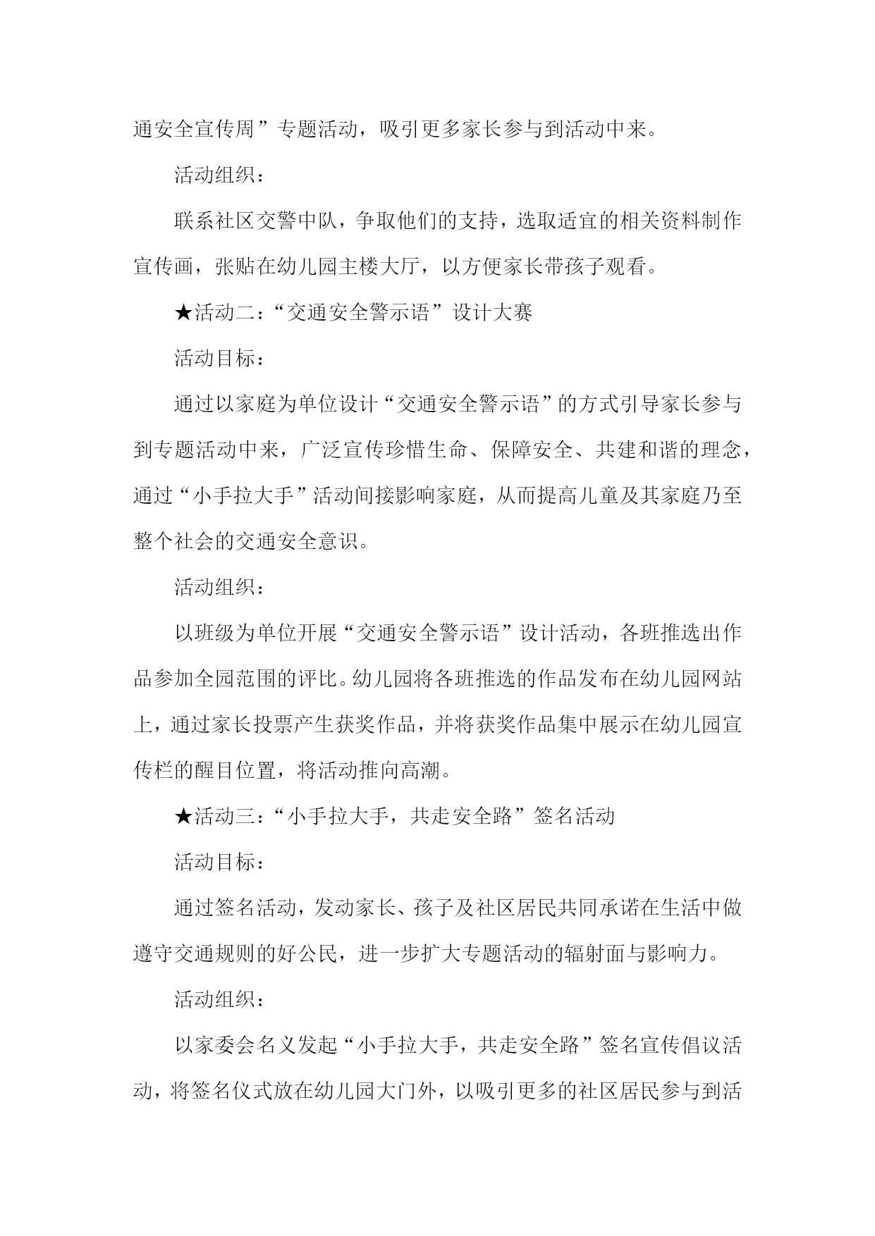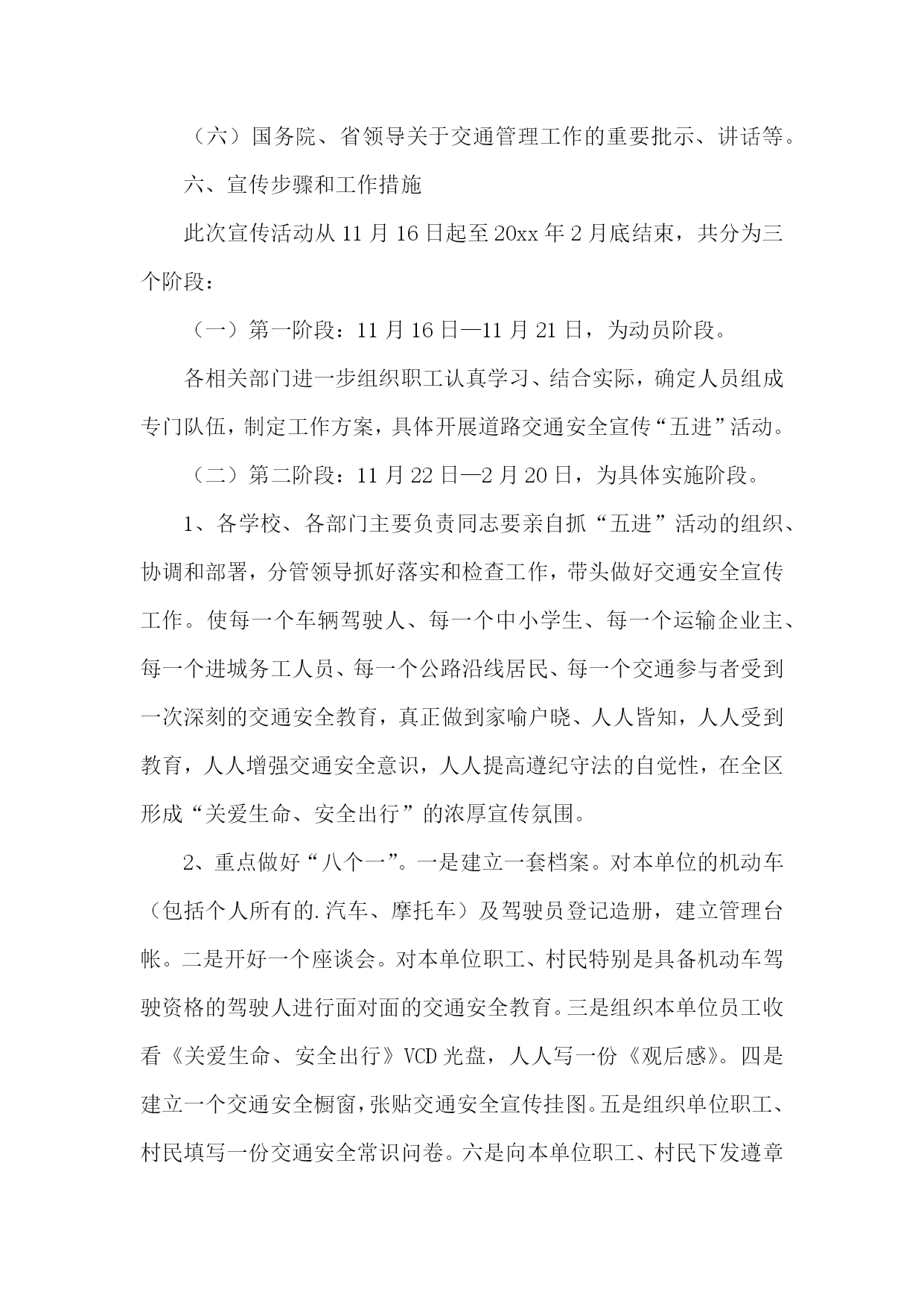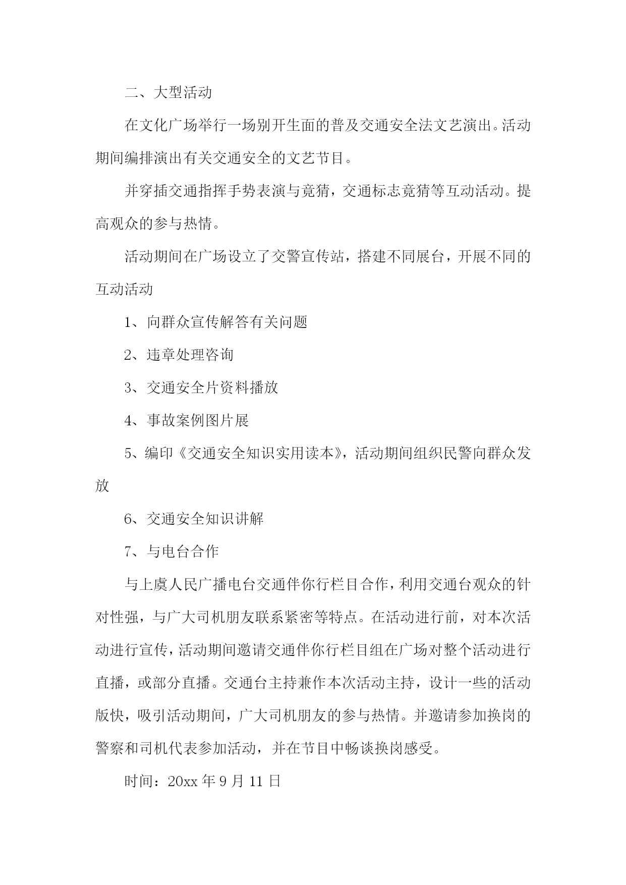 交通安全宣传周方案交通安全宣传周方案1道路交通安全关系着每个市民的日常生活甚至生命安全,关系到企业正常的经营秩序。在维护交通安全,宣传交通法规,妥善处理事故等方面,上虞交警大队付出了辛勤的劳动,也取得了让人振奋的成绩。为了尽一步的开展交通安全工作,动员社会各方面力量来关注交通安全,切实把交通法规宣传教育深入人心。本文来源于公文易爱心文提高广大群众的交通安全意识和自我保护意识,充分发挥交通安全宣传工作在预防和减少道路交通事故中的重要作用,最大限度地减少道路交通事故造成的危害,减少违章行为,我们虞舜文化传播策划这次以“珍惜生命,平安是福”为主题的交通安全宣传周活动。对广大群众深入开展交通安全的教育,希望能为交警大队的工作以及安全交通环境的创造等等方面起到一点参考作用,不当之处请多多指正。活动时间:20xx年9月5日――11日活动形式:一、开展为期一日的换位试岗试岗前通过交通伴你行栏目进行人员与岗位征集,同时为此次活动进行宣传。替换下来的司机作为交通协管员,在市区各路口执勤。交警则换位作为司机。活动结束后展开关于这次换岗的讨论,通过这种换位思考和彼此沟通,密切警民关系,改进工作作风,为上虞的交通状况改善创造一个良好的环境。时间:20xx年9月10日二、大型活动在文化广场举行一场别开生面的普及交通安全法文艺演出。活动期间编排演出有关交通安全的文艺节目。并穿插交通指挥手势表演与竟猜,交通标志竟猜等互动活动。提高观众的参与热情。活动期间在广场设立了交警宣传站,搭建不同展台,开展不同的互动活动1、向群众宣传解答有关问题2、违章处理咨询3、交通安全片资料播放4、事故案例图片展5、编印《交通安全知识实用读本》,活动期间组织民警向群众发放6、交通安全知识讲解7、与电台合作与上虞人民广播电台交通伴你行栏目合作,利用交通台观众的针对性强,与广大司机朋友联系紧密等特点。在活动进行前,对本次活动进行宣传,活动期间邀请交通伴你行栏目组在广场对整个活动进行直播,或部分直播。交通台主持兼作本次活动主持,设计一些的活动版快,吸引活动期间,广大司机朋友的参与热情。并邀请参加换岗的警察和司机代表参加活动,并在节目中畅谈换岗感受。时间:20xx年9月11日三、大型活动与长期宣传相结合除在广场进行活动活动以外,深入开展“五进”活动,延续国家关于交通安全宣传进农村、进社区、进企业、进学校、进家庭的“五进”活动精神,创建和谐的交通环境。1、进农村组织干净深入到乡镇、村播放警示教育光盘、发放宣传资料。掌握规律,利用好农村司乘人员的空暇时间,对低速汽车、三轮车、摩托车、个体运输户展开大规模的宣传,与车主和驾驶员面对面进行一次交通安全教育。2、进社区提高居民道路交通安全意识,深入人群集中的社区进行宣传。在各小区广泛设立交通安全宣传橱窗、宣传栏,结合重特大交通事故的典型案例,宣传交通法律法规和安全知识。进行事故案例图片巡展。3、进单位深入本市各公司、企事业单位等部门组织全体干部、职工观看交通安全宣传挂图和光盘,提高了职工特别是司乘人员的安全意识。4、进学校通过交通安全宣传进学校活动,培养中小学生自觉遵守交通法规的良好习惯。到学校给师生上交通安全的宣传课,举办安全讲座。与教育局合作,在中小学举行全市交通知识竞赛。分小组赛与决赛。其中6――8只代表队进入决赛。决赛争取协调由上虞电视台进行直播或录播。通过这种形式在参赛选手以及电视观众中扩大影响,加强交通安全教育。5、进家庭通过广播、电视、报纸等媒体,把交通安全宣传延伸到每一个家庭,使其受到深刻的交通安全教育。活动时间:20xx年9月5日――11日考虑到交警大队本身工作任务较重,开展这类活动人力、精力不足等具体情况,虞舜文化传播可以协助交警大队全程策划、承办上述活动。具体经费由交警大队与虞舜文化协商,采用赞助、收费等形式筹措。虞舜文化传播愿为宏扬上虞的地域文化,推进上虞的精神文明建设,创建和谐、平安的交通环境做出自己应尽的努力。交通安全宣传周方案2为进一步贯彻落实国务院“五整顿”、“三加强”工作部署,预防和减少道路交通事故,稳定我乡道路交通形势,特制定本方案。一、指导思想以“五进”活动为总抓手,以遏制重特大道路交通事故为重点,根据省、市、区政府“压事故、保畅通”的总体要求,严查、严纠、严惩道路交通事故违法行为,加强道路交通安全宣传网络体系建设,促进长效管理机制的建立,使严重交通违法行为得到有效遏制,全乡行车秩序有较大的改观;使严重交通违法行为导致的交通事故明显下降,确保交通安全形势的稳定。二、工作目标通过道路交通安全宣传进社区、进农村、进学校、进企业、进家庭“五进”活动的开展,全面提高群众交通安全意识,逐步建立交通安全教育社会化制度;努力实现村镇居民、单位职工、社区居民、机动车驾驶人、在校学生交通法规教育率分别达到65%、75%、80%