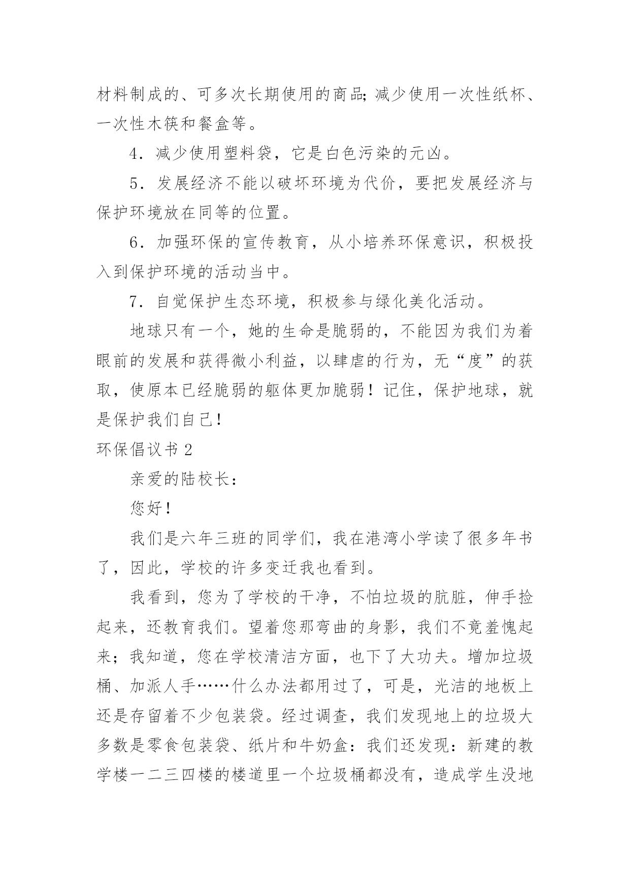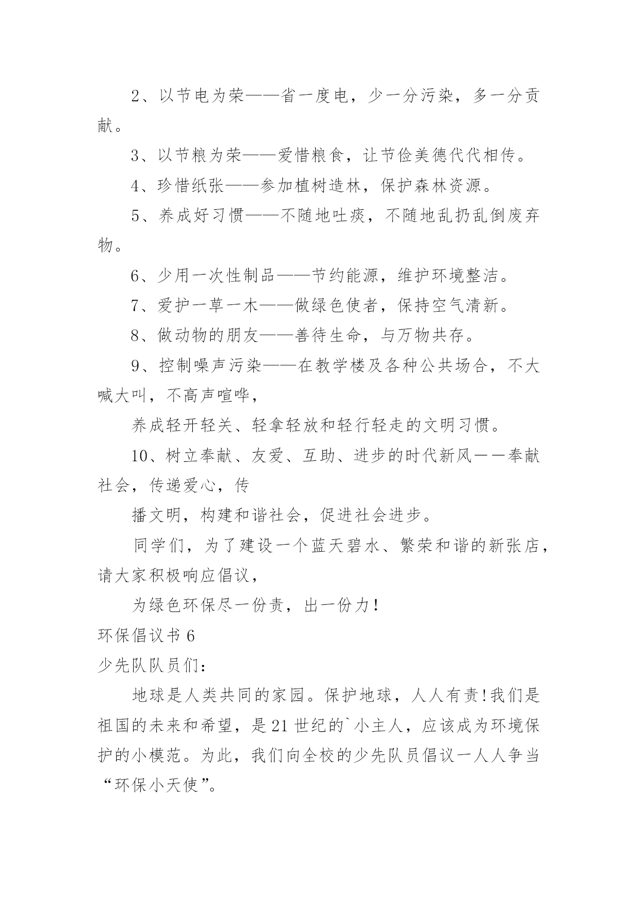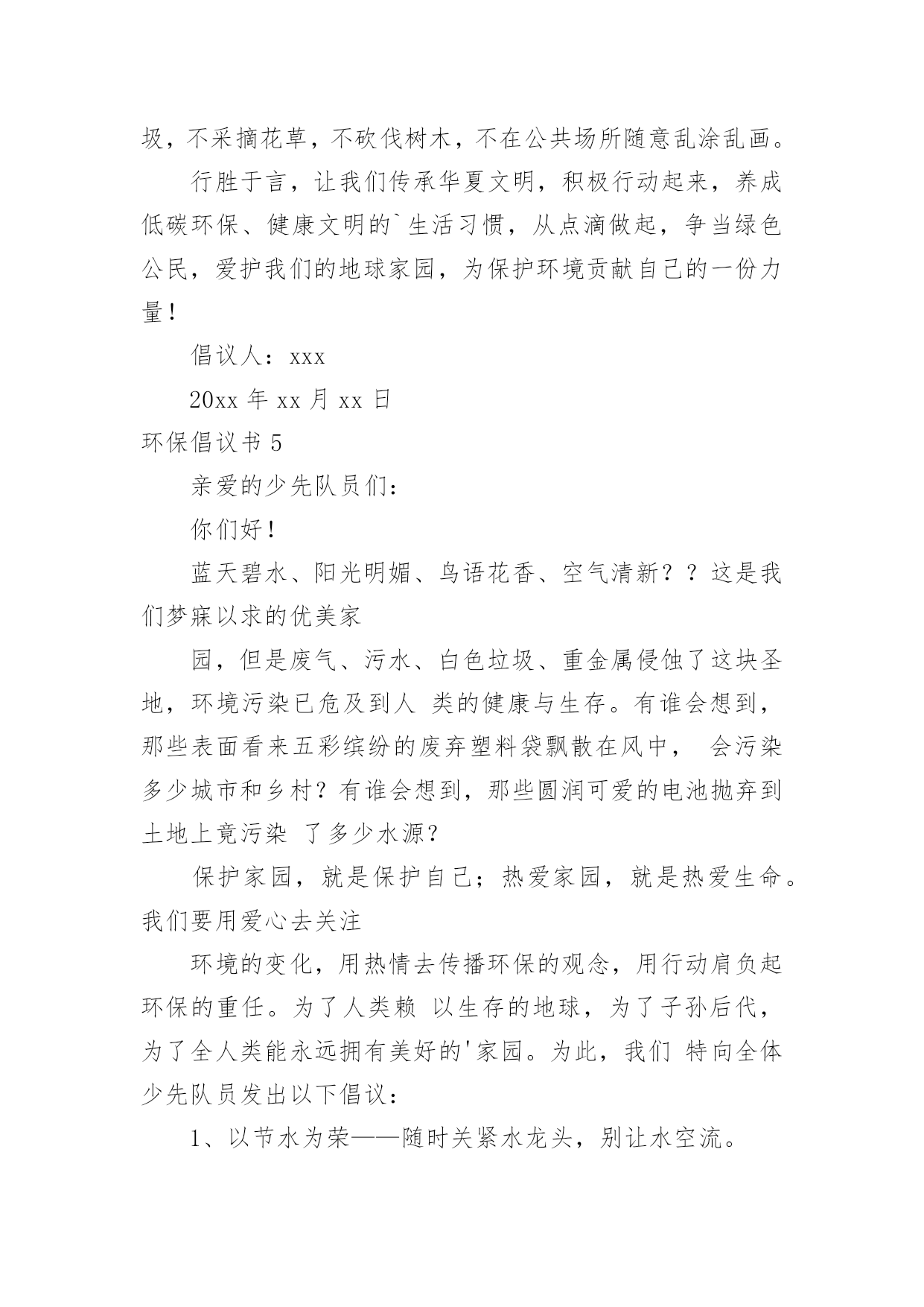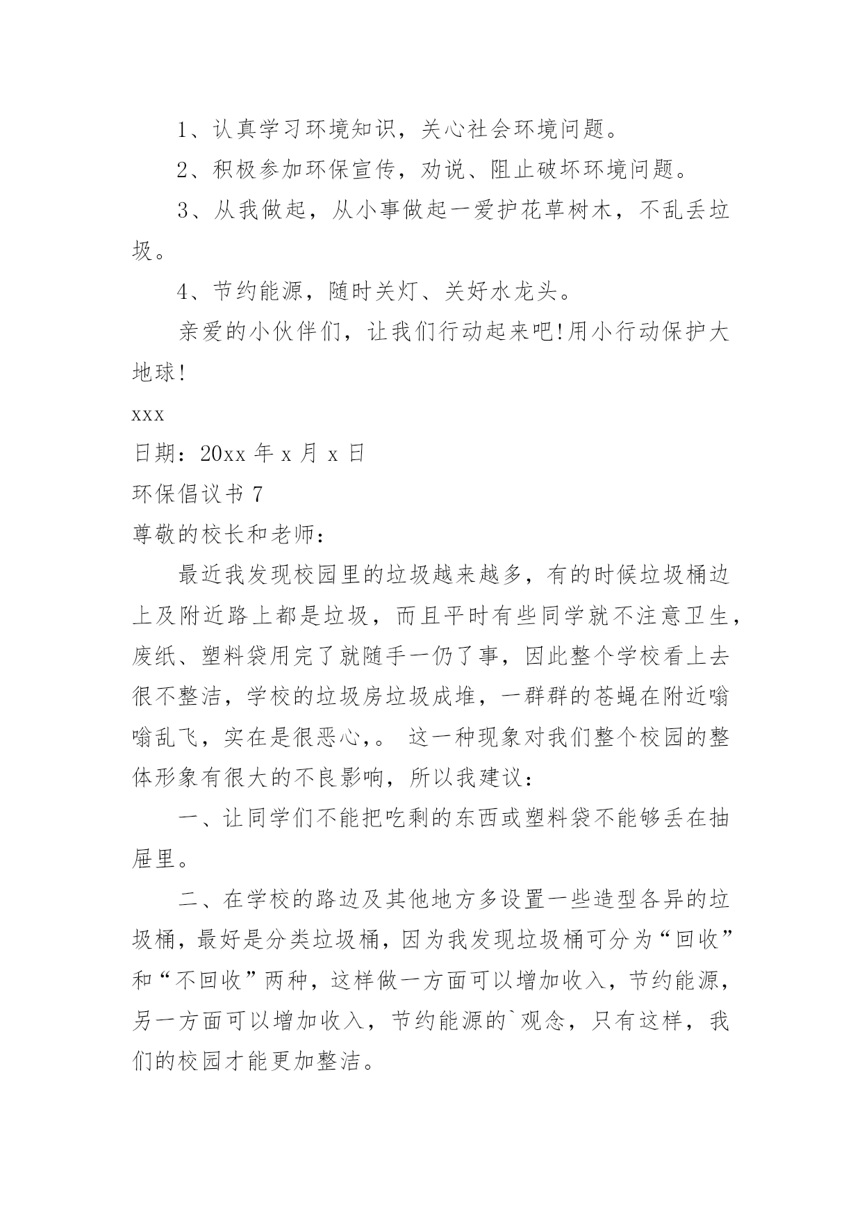 环保倡议书环保倡议书在现在社会,倡议书与我们的生活息息相关,倡议书是日常应用写作中的一种常用文体。写起倡议书来就毫无头绪?下面是小编帮大家整理的环保倡议书,欢迎大家分享。环保倡议书11.相信每个人都想在良好的生活环境里度过岁月吧!要想给自己和他人营造一个良好的生活环境,就要注意身边的生活。由于世界环保卫生过差,这些都表现在生活垃圾的处理上,它会给人类带来环境污染的影响,所以,我真诚的大家提出以下几点倡议:1.不要乱扔垃圾,不随地吐痰。2.节约用纸:打印过的纸用来做草稿纸;用打印过的纸的背面再打印。3.为环保作出贡献:多种花草树木。4.爱护好自己身边的环境。5.用完水或电就及时关紧。我知道,这几点小小的倡议还不足以代表我的爱国之心,所以我决定再为祖国写更多的倡议书,希望你们能接受我提出的意见,我也希望能有更多人爱国。从现在起,从我做起,不乱丢垃圾,不随地吐痰,做好小主人的榜样。从现在起,从我做起,不管去到那,不乱丢垃圾,都不随地吐痰,做好一个小客人,不让人取笑。让我们行动起来,从我做起,从现在做起。2.在新的世纪里,我们渴望美丽的地球,绿色的家园,湛蓝的天空,清新的空气。但是,由于人类的肆意破坏、污染、浪费,使地球变得千疮百孔、遍体鳞伤。人类受到了大自然的惩罚,逐渐意识到了环保的重要性。在我的`家乡陆川,一条九州江贯穿县城。听老人说,以前九州江的水清澈见底,河畔的沙滩上还不断地涌出温泉,吸引着四面八方的游人,夏天,人们还常常到江里游泳。而现在,九州江变成了“排污江”。河水混浊,还夹带着恶臭,各种垃圾漂浮在江面上,温泉大大减少,需要用抽水机才能抽上来,人们再也不敢到江里游泳了。难道这不是人们破坏环境的恶果吗?我们应该吸取教训,好好保护环境、清洁环境、美化环境,从我做起,从现在做起,为了地球,为了人类的将来,也为了让我们永远拥有一个美好的生存环境,我真诚地向大家发出如下倡议:1.共同建设“节约型社会”,节约一滴水,节约一度电,节约一张纸。节约用水,用完水后及时拧紧水龙头,避免大开水龙头,提倡用脸盆洗手、洗脸;节约用电,电器不使用时应关闭电源;节约用纸,多用手绢、抹布,尽量两面使用纸张。2.为减少空气污染、节约能源,尽量使用公共交通工具、自行车或步行。3.为保护森林、矿产等自然资源,尽量购买使用再生材料制成的、可多次长期使用的商品;减少使用一次性纸杯、一次性木筷和餐盒等。4.减少使用塑料袋,它是白色污染的元凶。5.发展经济不能以破坏环境为代价,要把发展经济与保护环境放在同等的位置。6.加强环保的宣传教育,从小培养环保意识,积极投入到保护环境的活动当中。7.自觉保护生态环境,积极参与绿化美化活动。地球只有一个,她的生命是脆弱的,不能因为我们为着眼前的发展和获得微小利益,以肆虐的行为,无“度”的获取,使原本已经脆弱的躯体更加脆弱!记住,保护地球,就是保护我们自己!环保倡议书2亲爱的陆校长:您好!我们是六年三班的同学们,我在港湾小学读了很多年书了,因此,学校的许多变迁我也看到。我看到,您为了学校的干净,不怕垃圾的肮脏,伸手捡起来,还教育我们。望着您那弯曲的身影,我们不竟羞愧起来;我知道,您在学校清洁方面,也下了大功夫。增加垃圾桶、加派人手……什么办法都用过了,可是,光洁的地板上还是存留着不少包装袋。经过调查,我们发现地上的垃圾大多数是零食包装袋、纸片和牛奶盒:我们还发现:新建的教学楼一二三四楼的楼道里一个垃圾桶都没有,造成学生没地方扔垃圾。因此许多人就图方便,不愿走去远一点的垃圾桶,随手一扔。对此,班里的'同学都想出了几条对策:1.建议学校在购置一些容量大而邮又漂亮的垃圾桶。2.建议学校再增加一些清洁工,因为只有几个而已作文学校不仅有垃圾的问题,还有学校中餐的问题。不少中午在学校搭食的同学,都向我们反映学校的中餐不好吃,大部分的菜肴都是茄子、芋头和蕃茄炒蛋。这些都是同学们不爱吃的,而且长期吃下去,同学们的身体会没有营养。陆校长,我们觉得,虽然学校为我们提供了场所,免去了吃饭的麻烦,但是,您是否能与快餐公司联系一下,让他们将饭菜做的好吃一点。这样才能解决问题的根本。作文希望陆校长看完这封建议书后,能采取我们的意见,让我们的校园变得更加美好!更加美丽!20xx年4月杨倩洵环保倡议书3尊敬的市领导:你们好!在我还是一年级的时候,我们的校园到处都是节约的榜样,这让我们的校园更加的鸟语花香、生机勃勃。可今昔不同往日,这几年深圳飞速发展,现在我们的校园随处可见“白色垃圾”,浪费水资源的现象等等。据资料显示,我国每天制造”出的垃圾达几十亿吨,甚至更多。然而,人类处理它们的办法,只是埋到土里去。人们啊!你们可知道,这是在为地球的毁灭的时间缩短呀!据资料显示全中国每一天要流失60亿立方米的水,全世界每天要流失800亿立方米的.水。据资料显示,一个关不紧的