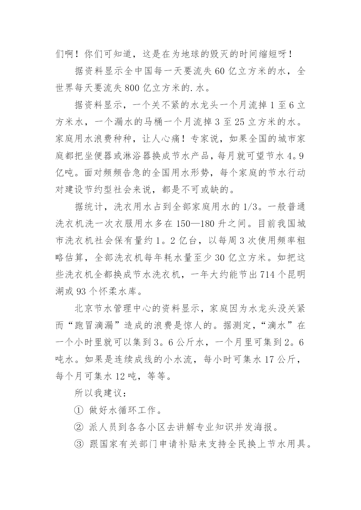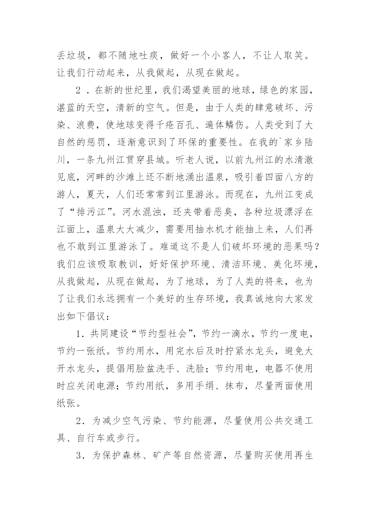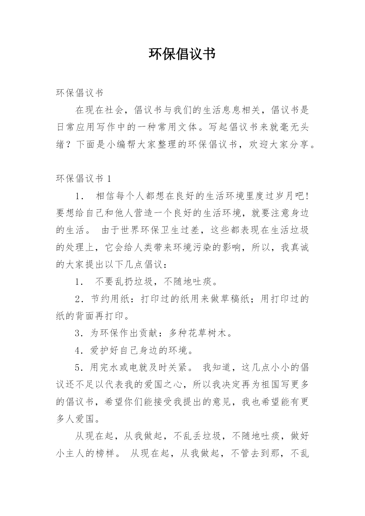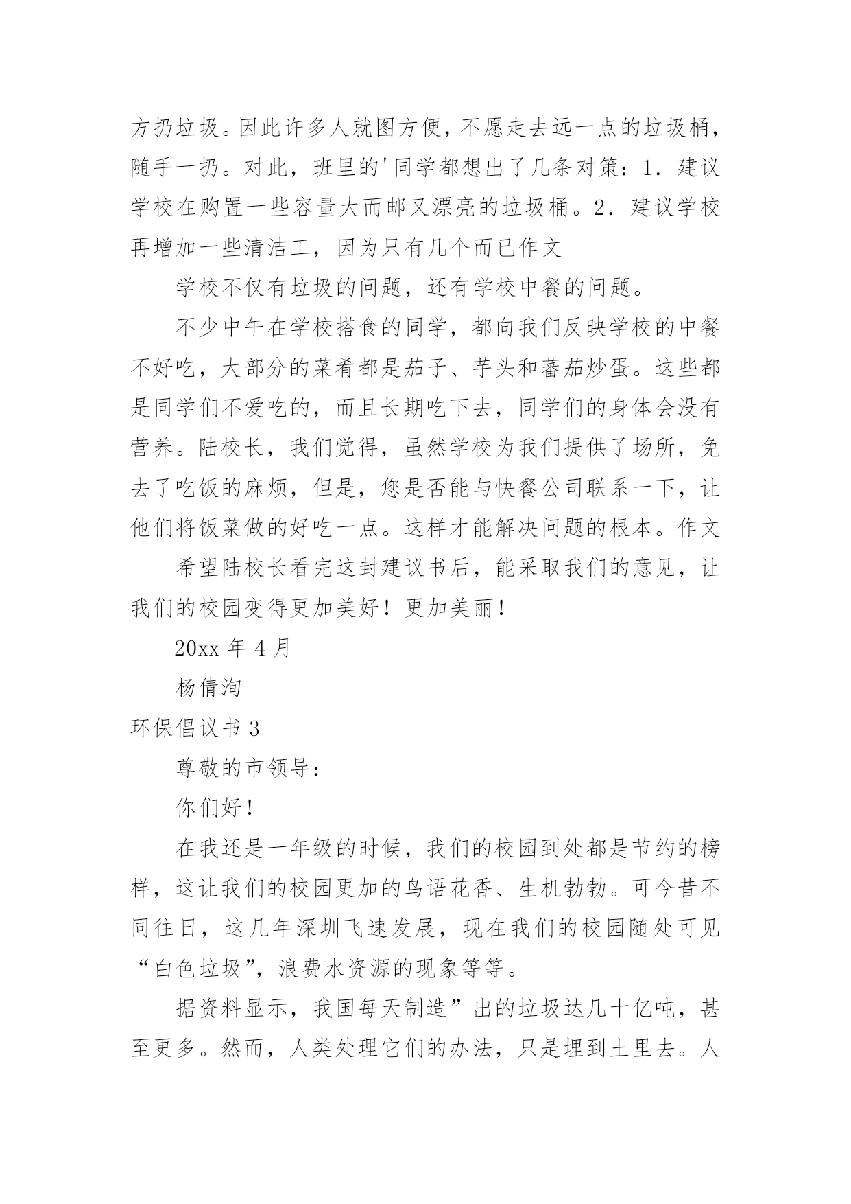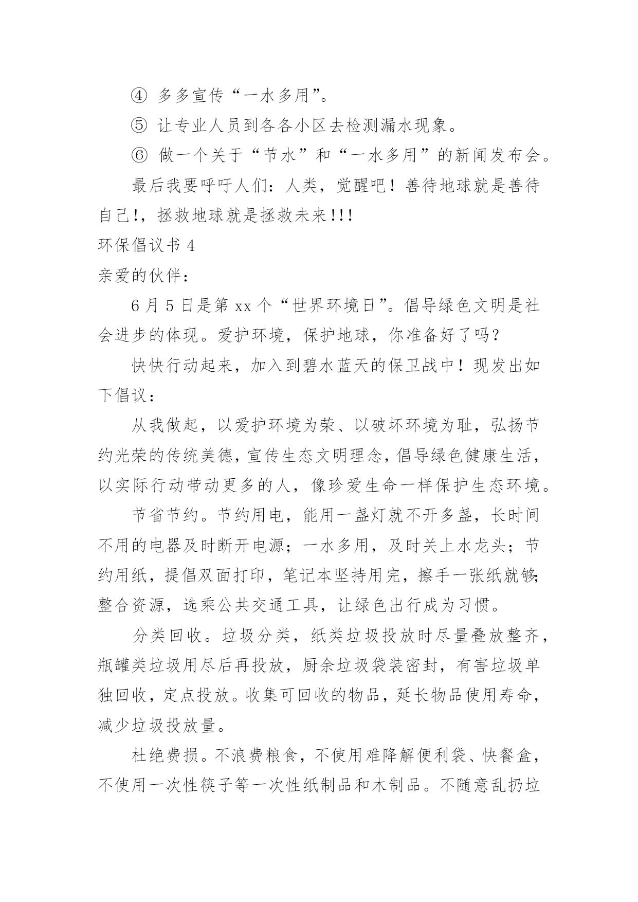 环保倡议书环保倡议书在现在社会,倡议书与我们的生活息息相关,倡议书是日常应用写作中的一种常用文体。写起倡议书来就毫无头绪?下面是小编帮大家整理的环保倡议书,欢迎大家分享。环保倡议书11.相信每个人都想在良好的生活环境里度过岁月吧!要想给自己和他人营造一个良好的生活环境,就要注意身边的生活。由于世界环保卫生过差,这些都表现在生活垃圾的处理上,它会给人类带来环境污染的影响,所以,我真诚的大家提出以下几点倡议:1.不要乱扔垃圾,不随地吐痰。2.节约用纸:打印过的纸用来做草稿纸;用打印过的纸的背面再打印。3.为环保作出贡献:多种花草树木。4.爱护好自己身边的环境。5.用完水或电就及时关紧。我知道,这几点小小的倡议还不足以代表我的爱国之心,所以我决定再为祖国写更多的倡议书,希望你们能接受我提出的意见,我也希望能有更多人爱国。从现在起,从我做起,不乱丢垃圾,不随地吐痰,做好小主人的榜样。从现在起,从我做起,不管去到那,不乱丢垃圾,都不随地吐痰,做好一个小客人,不让人取笑。让我们行动起来,从我做起,从现在做起。2.在新的世纪里,我们渴望美丽的地球,绿色的家园,湛蓝的天空,清新的空气。但是,由于人类的肆意破坏、污染、浪费,使地球变得千疮百孔、遍体鳞伤。人类受到了大自然的惩罚,逐渐意识到了环保的重要性。在我的`家乡陆川,一条九州江贯穿县城。听老人说,以前九州江的水清澈见底,河畔的沙滩上还不断地涌出温泉,吸引着四面八方的游人,夏天,人们还常常到江里游泳。而现在,九州江变成了“排污江”。河水混浊,还夹带着恶臭,各种垃圾漂浮在江面上,温泉大大减少,需要用抽水机才能抽上来,人们再也不敢到江里游泳了。难道这不是人们破坏环境的恶果吗?我们应该吸取教训,好好保护环境、清洁环境、美化环境,从我做起,从现在做起,为了地球,为了人类的将来,也为了让我们永远拥有一个美好的生存环境,我真诚地向大家发出如下倡议:1.共同建设“节约型社会”,节约一滴水,节约一度电,节约一张纸。节约用水,用完水后及时拧紧水龙头,避免大开水龙头,提倡用脸盆洗手、洗脸;节约用电,电器不使用时应关闭电源;节约用纸,多用手绢、抹布,尽量两面使用纸张。2.为减少空气污染、节约能源,尽量使用公共交通工具、自行车或步行。3.为保护森林、矿产等自然资源,尽量购买使用再生材料制成的、可多次长期使用的商品;减少使用一次性纸杯、一次性木筷和餐盒等。4.减少使用塑料袋,它是白色污染的元凶。5.发展经济不能以破坏环境为代价,要把发展经济与保护环境放在同等的位置。6.加强环保的宣传教育,从小培养环保意识,积极投入到保护环境的活动当中。7.自觉保护生态环境,积极参与绿化美化活动。地球只有一个,她的生命是脆弱的,不能因为我们为着眼前的发展和获得微小利益,以肆虐的行为,无“度”的获取,使原本已经脆弱的躯体更加脆弱!记住,保护地球,就是保护我们自己!环保倡议书2亲爱的陆校长:您好!我们是六年三班的同学们,我在港湾小学读了很多年书了,因此,学校的许多变迁我也看到。我看到,您为了学校的干净,不怕垃圾的肮脏,伸手捡起来,还教育我们。望着您那弯曲的身影,我们不竟羞愧起来;我知道,您在学校清洁方面,也下了大功夫。增加垃圾桶、加派人手……什么办法都用过了,可是,光洁的地板上还是存留着不少包装袋。经过调查,我们发现地上的垃圾大多数是零食包装袋、纸片和牛奶盒:我们还发现:新建的教学楼一二三四楼的楼道里一个垃圾桶都没有,造成学生没地方扔垃圾。因此许多人就图方便,不愿走去远一点的垃圾桶,随手一扔。对此,班里的'同学都想出了几条对策:1.建议学校在购置一些容量大而邮又漂亮的垃圾桶。2.建议学校再增加一些清洁工,因为只有几个而已作文学校不仅有垃圾的问题,还有学校中餐的问题。不少中午在学校搭食的同学,都向我们反映学校的中餐不好吃,大部分的菜肴都是茄子、芋头和蕃茄炒蛋。这些都是同学们不爱吃的,而且长期吃下去,同学们的身体会没有营养。陆校长,我们觉得,虽然学校为我们提供了场所,免去了吃饭的麻烦,但是,您是否能与快餐公司联系一下,让他们将饭菜做的好吃一点。这样才能解决问题的根本。作文希望陆校长看完这封建议书后,能采取我们的意见,让我们的校园变得更加美好!更加美丽!20xx年4月杨倩洵环保倡议书3尊敬的市领导:你们好!在我还是一年级的时候,我们的校园到处都是节约的榜样,这让我们的校园更加的鸟语花香、生机勃勃。可今昔不同往日,这几年深圳飞速发展,现在我们的校园随处可见“白色垃圾”,浪费水资源的现象等等。据资料显示,我国每天制造”出的垃圾达几十亿吨,甚至更多。然而,人类处理它们的办法,只是埋到土里去。人们啊!你们可知道,这是在为地球的毁灭的时间缩短呀!据资料显示全中国每一天要流失60亿立方米的水,全世界每天要流失800亿立方米的.水。据资料显示,一个关不紧的
