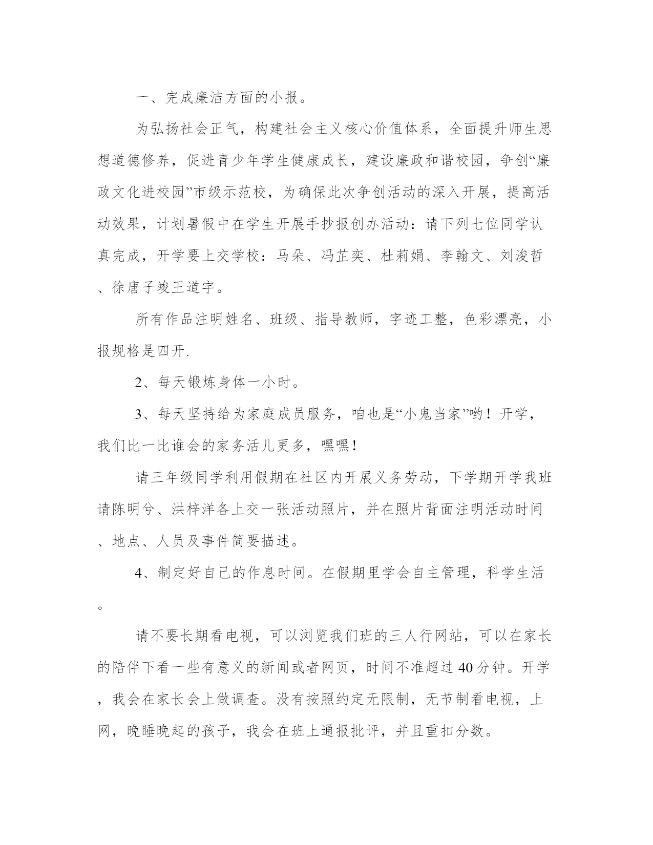 2017暑假生活安排计划愉快暑假生活开始了!该怎样让自己度过一个有意义的暑假呢?老师给大家的建议就是,提前做好安排。修整好自己的同时,合理安排好时间,让自己的暑假生活充满意义。语文:1、读书。请根据老师给大家的建议进行阅读。(方法和格式见后面附页说明。)完成读书心得20篇。老师推荐的数目能够读完5本是基本任务,多读多加分哈!2、练字。请以下同学必须进行练字:3、4、5、7、8、9、10、11、12、14、17、18、19、20、22、24、25、26、28、29、31、32、34、35、37、39、40、42、44、45、46、49、50、51.根据老师的练字安排进行练习。3、将自己的暑假生活的精彩瞬间用笔记录下来。每人2篇以上。数学:完成计算题单,每天4道竖式计算和4道脱式计算。完成在作业本上。每天写上时间,完成后由家长批改签字。暑假生活自主选择完成,不做要求。英语:根据毛老师的安排表进行英语学习。(见后面附页)其他:社会实践作业:(点名的同学必做)一、完成廉洁方面的小报。为弘扬社会正气,构建社会主义核心价值体系,全面提升师生思想道德修养,促进青少年学生健康成长,建设廉政和谐校园,争创“廉政文化进校园”市级示范校,为确保此次争创活动的深入开展,提高活动效果,计划暑假中在学生开展手抄报创办活动:请下列七位同学认真完成,开学要上交学校:马朵、冯芷奕、杜莉娟、李翰文、刘浚哲、徐唐子竣王道宇。所有作品注明姓名、班级、指导教师,字迹工整,色彩漂亮,小报规格是四开.2、每天锻炼身体一小时。3、每天坚持给为家庭成员服务,咱也是“小鬼当家”哟!开学,我们比一比谁会的家务活儿更多,嘿嘿!请三年级同学利用假期在社区内开展义务劳动,下学期开学我班请陈明兮、洪梓洋各上交一张活动照片,并在照片背面注明活动时间、地点、人员及事件简要描述。4、制定好自己的作息时间。在假期里学会自主管理,科学生活。请不要长期看电视,可以浏览我们班的三人行网站,可以在家长的陪伴下看一些有意义的新闻或者网页,时间不准超过40分钟。开学,我会在家长会上做调查。没有按照约定无限制,无节制看电视,上网,晚睡晚起的孩子,我会在班上通报批评,并且重扣分数。开学报到时间:XX年8月31日上午8:00——10:00。请孩子们提前整理好自己的物品,作业,准时报名。准备好向四年级进发!暑假愉快!爱你们的老师