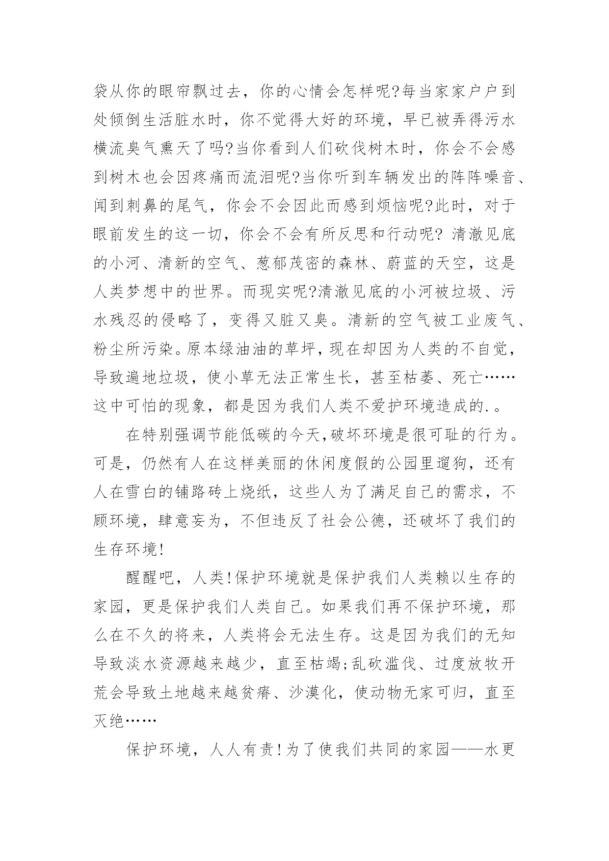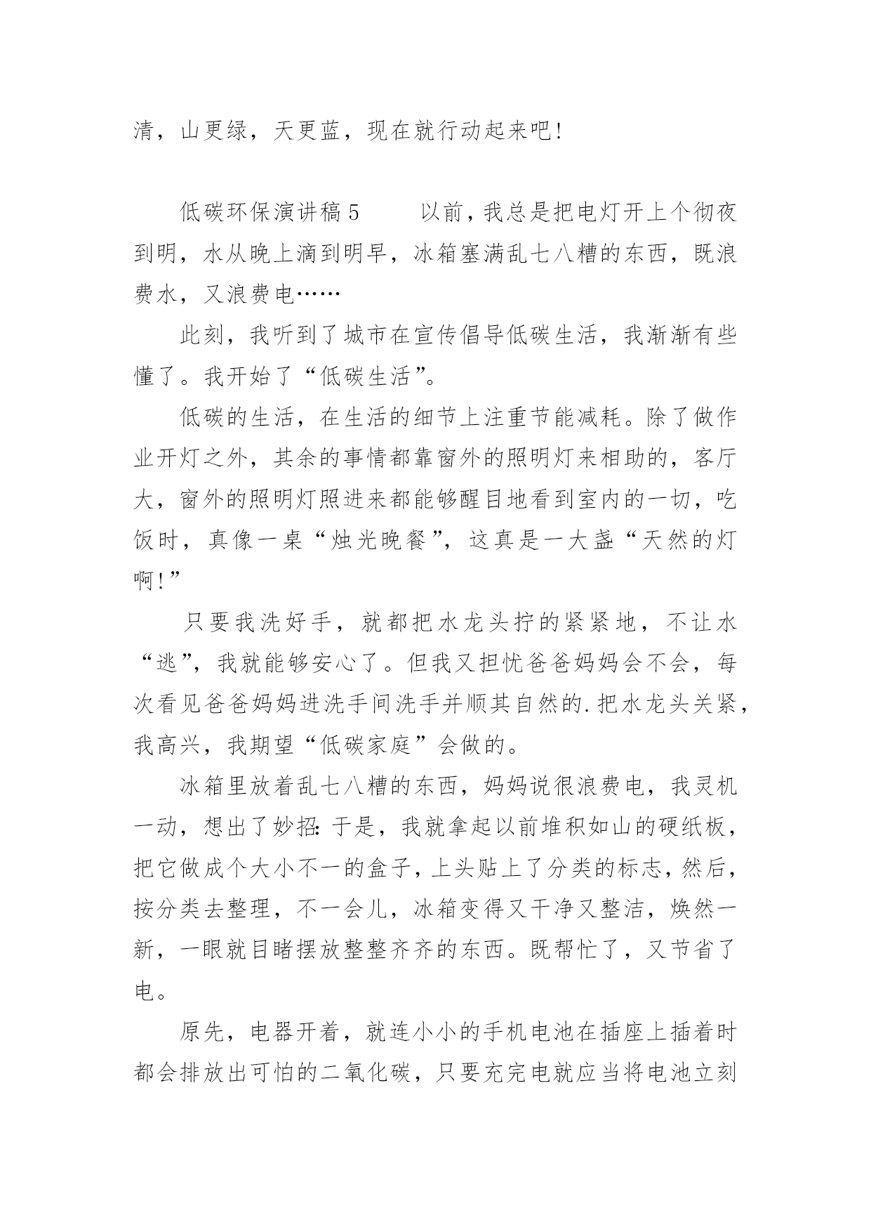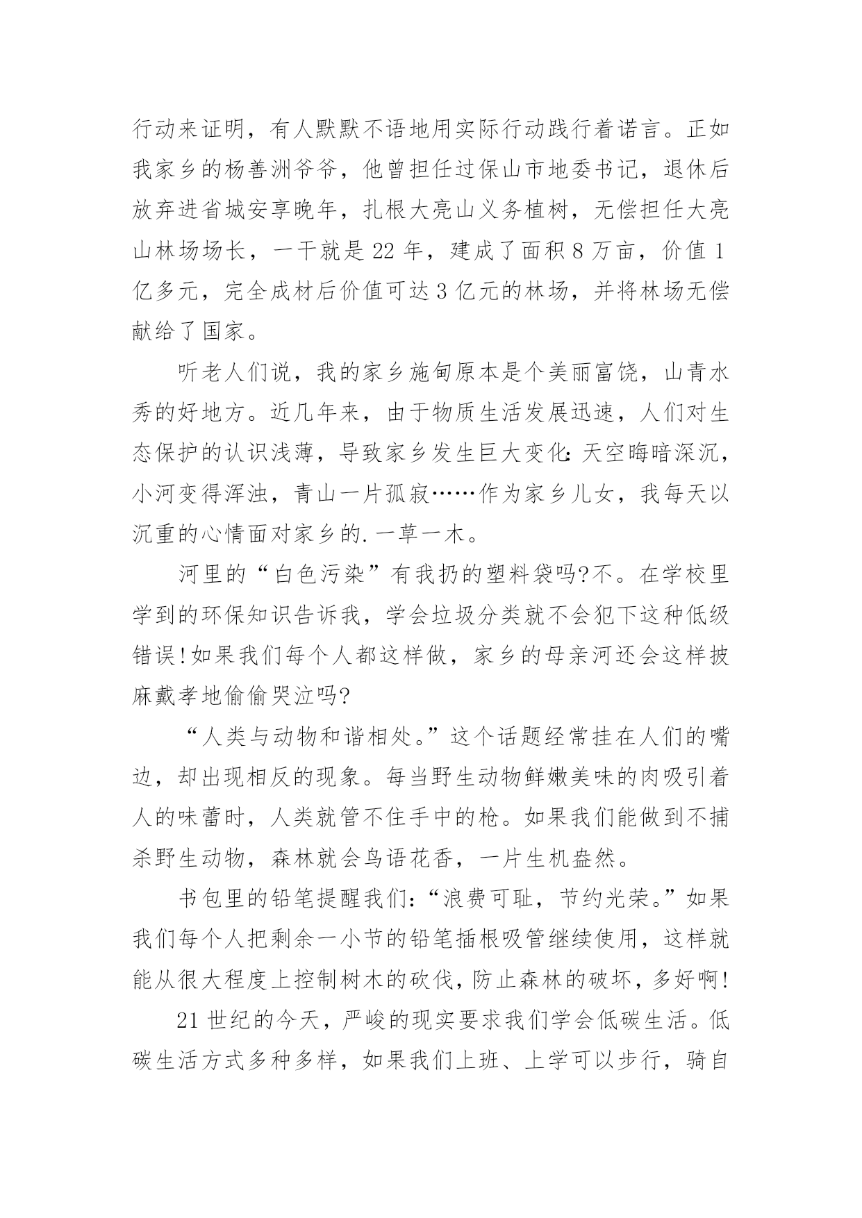 低碳环保演讲稿有关低碳环保演讲稿模板演讲稿可以起到整理演讲者的思路、提示演讲的内容、限定演讲的速度的作用。在不断进步的时代,接触并使用演讲稿的人越来越多,那么,怎么去写演讲稿呢?下面是小编为大家收集的有关低碳环保演讲稿模板,欢迎阅读与收藏。低碳环保演讲稿1亲爱的老师、同学们:大家好!为了保护环境,现在报纸、电视上一直宣传,提倡我们要过低碳生活。什么是低碳生活呢?我的理解是:低碳生活就是在生活细节上注重节能消耗,注意节电、节水、节油、节气。低碳生活我们家做的可好了,其中也有我的一份功劳,因为我是我们家低碳生活的'监督员。记得有一次,奶奶洗好菜要倒洗菜水,正好被我看见,我马上阻止奶奶说:“奶奶别倒,洗菜水可以再次利用:冲厕所呀。”奶奶说:“好,我听你的,咱们就留着,来个废物再利用:洗菜水冲厕所。”从此以后我们家就多了个大水桶,专门盛洗菜水。我妈妈做的也不错,她由原来的骑电动车该骑自行车啦。有一次,妈妈有事要出去,刚往外推电动车,我就跑到了她面前,还没等我说话,妈妈却不好意思的说:“我知道你要说什么,我骑自行车,不骑电动车了。”妈妈真的骑自行车出去了。我爸爸和爷爷做的也很好。爸爸的单位离家比较近,他每天步行上班。爷爷退休在家,他每天尽量减少看电视的时间,并且把烟也戒了。爷爷说这样既节约用电,也减少污染,减少开支。我们家做的不错吧,希望每个小朋友都能做小小监督员,使每个家庭都能过低碳生活,保护我们的环境。低碳环保演讲稿2尊敬的老师,亲爱的同学们:大家好!绿色是甚么的意味,绿色是生命的意味,绿色代表了希看。没法想象,假如有一天地球上没有了绿色,那人类的文明将会如何,到那时,或许只是灰飞烟灭,一切的一切都只会沉没在漫天飞沙当中。当一片片绿波汹涌的森林被无垠的荒漠黄尘所取代,当无忧地在湛蓝的天空飘荡的白云被漫天滚滚黑烟所替换,当为地球遮风挡雨的臭氧层被无情的氟里昂所破坏,我分明闻声了森林的哭泣,白云的叹息,臭氧层的悲伤。回忆一下自己平时的'一举一动,你是否是做到了保护,保持这美好的环境而努力。你有过随便踏进草坪的行为吗?你有过胡乱打扫教室,包干区卫生而不往想这是不对的情况吗?你有过随手扔下一张废纸,一个零食袋吗?你有过打开学校的自来水笼头,而没有及时关上吗?你有过为我们长寿桥小学建成“绿色学校”提一个建议,出一个点子吗?同学们,我们长寿桥小学在上个学期已被评上了杭州市“绿色学校”,所谓“绿色学校”就是指我们校园里的每位师生都优环保意识,我们这个学期的一个重要要任务,就是要维护这得来不轻易的荣誉,这需要我们师生一起努力,从我做起,从身边的小事做起,从力所能及的事情做起,参与环保活动,培养环保素养,人人争做环保卫士。不要把它想象成很大的事情,环保就在我们身边。当你捡起他人掉下的一张纸时,你就已做成了一件环保的事情;当你记得及时关灯,不浪用度电;当你用好水笼头能及时关掉,而不让水白白流掉;当你下课,活动时能做到有秩序,有克制,而不是高声喧哗;你就已在做着环保卫士应当作的事情了。诸如此类的太多太多小事,我们实在都能做到,但可能我们同学之前都是没有往仔细面对和想过的。固然,创“绿色学校”,争做环保卫士,我们的眼光还要看得更远。一节小小的电池就可以够污染一个人一生所需要的水;一棵树一年产生的氧气可让一个人受用一生,一只塑料袋需要经过420__年才可能被完全分解掉;对这些环保的知识,你了解吗?我们在工作、学习、生活的各个领域,都要用环保的眼光来看发展,用环保的行为来做事,只有这样,才能留给后人们一个能让他们安然生存的,干净的,美丽的,环保的地球。同学们,我们是21世纪的主人,环保意识是现代人的重要标志。为了我们共同的家园,我们每个人都应当也必须有勇气站起来对大自然做出承诺,承诺用我们的双手使地球母亲恢复青春容颜,承诺用我们的行动来感动大自然,承诺用我们的实际行动来保证我们长寿的校园永久美丽,干净。但承诺自然实在不单单是做出承诺,更应是以行动来实现我们的承诺。多弯弯腰捡捡果皮纸屑,多走几步,不要穿越绿化带,践踏绿地。同学们,“勿以善小而不为,勿以恶小而为之”,让我们从我做起,从小做起,从身边做起。低碳环保演讲稿3尊敬的老师,亲爱的同学们:大家好!我是xx学校xx班的xx,今天我演讲的题目是《低碳环保,从我做起》!众所周知,《xx》的场景绝非无中生有,在地球家园的美丽倩影渐行渐远之际,倡导“低碳环保生活”刻不容缓!那什么是低碳环保生活呢?低碳环保生活就是减少二氧化碳排放的低能量、低消耗、低开支的节能减排生活方式。勿庸置疑,“低碳环保生活”有利于减缓全球气候变暖和环境恶化的速度。减少二氧化碳排放,选择“低碳环保生活”,是每位公民应尽的.责任,也是每位公民应尽的义务。那怎样才算低碳环保生活呢?今天,就让我们从小事说起吧!一、节约一张纸在场的同学,我相信大家都