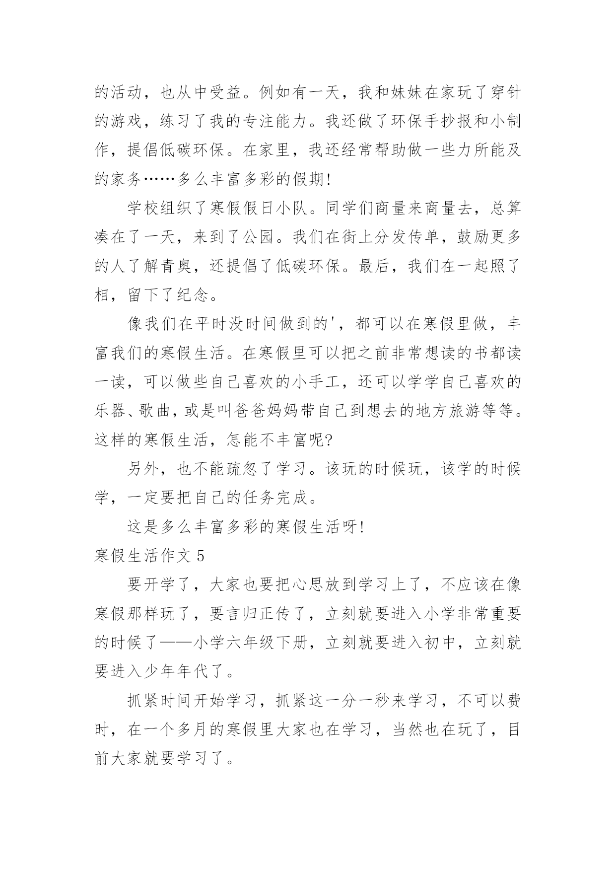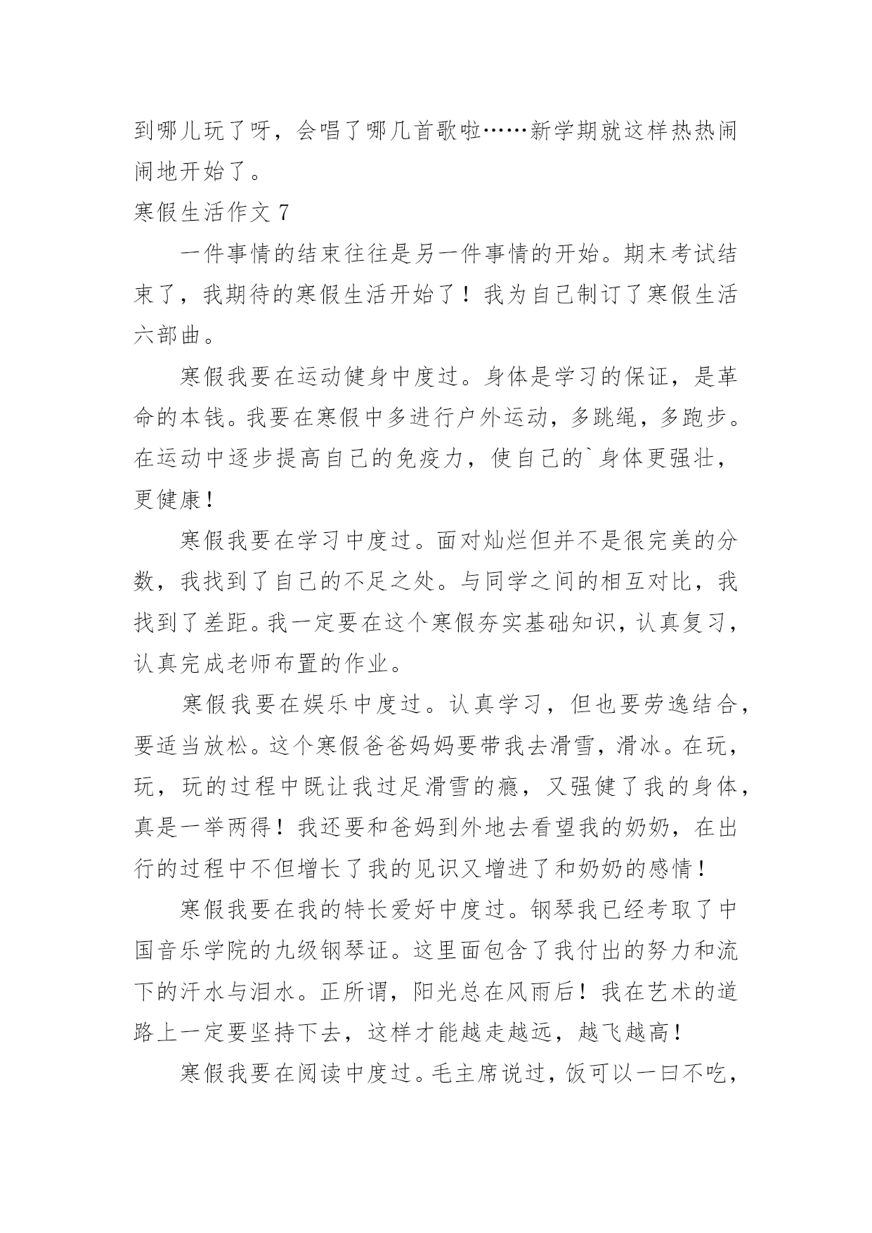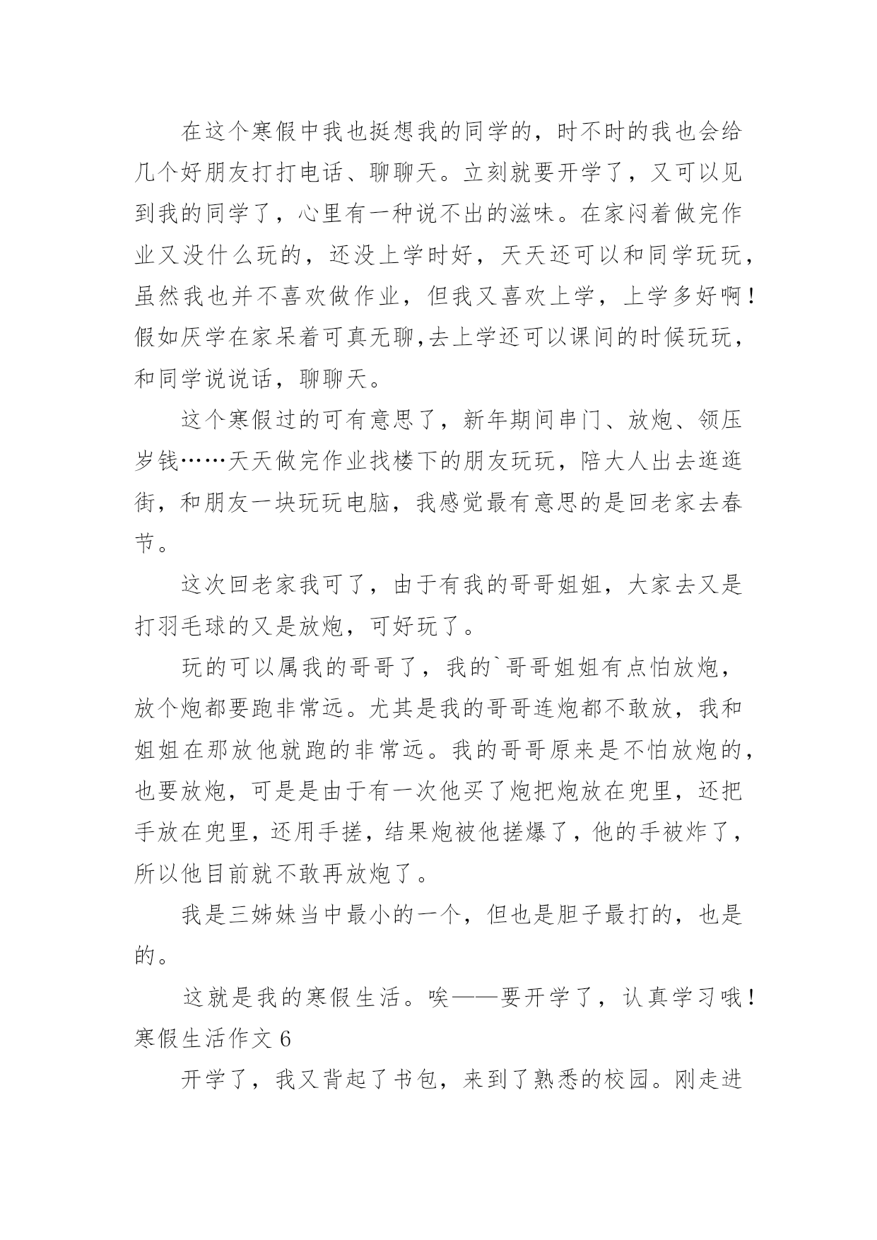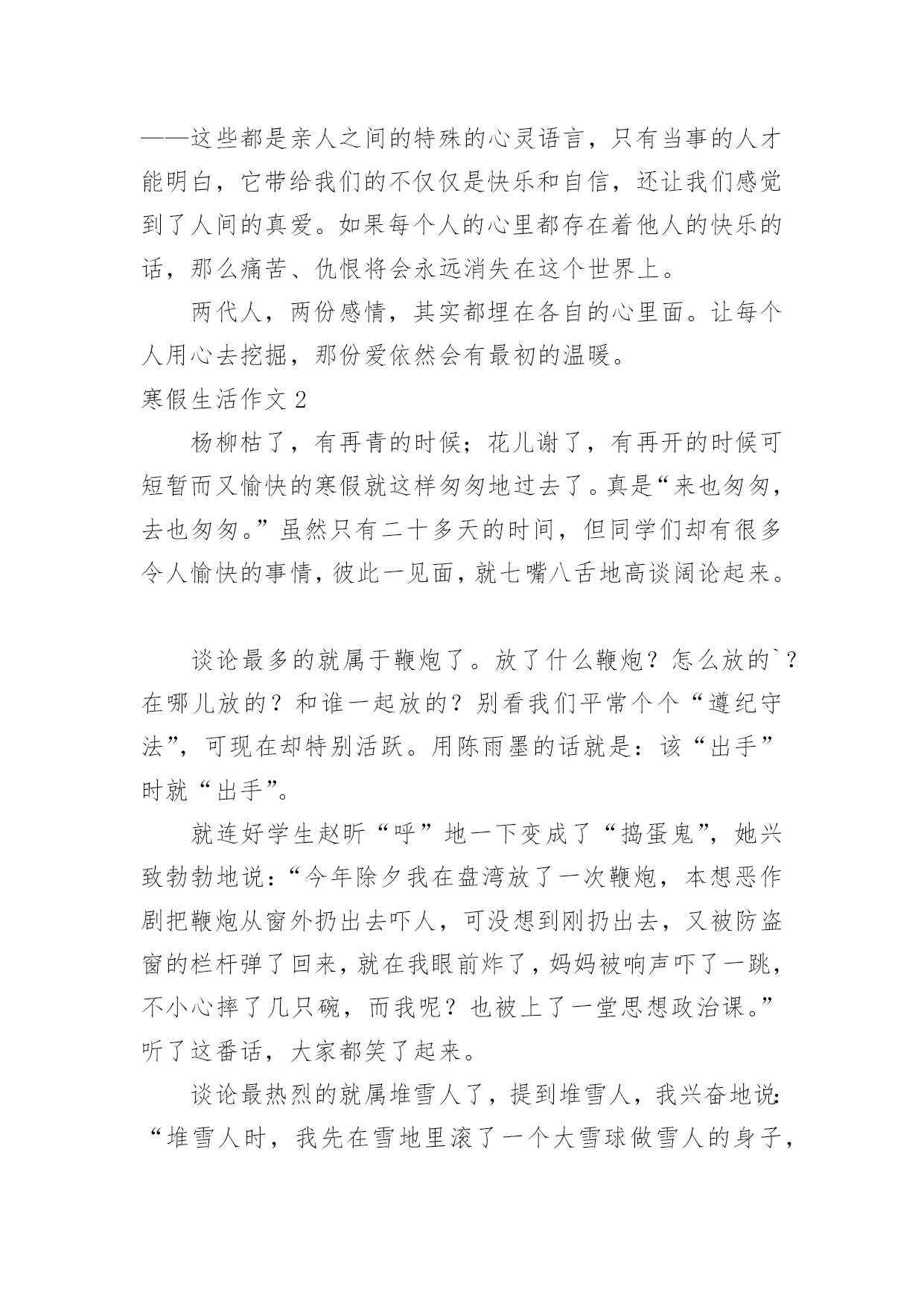 寒假生活作文寒假生活作文(精选)无论是身处学校还是步入社会,大家一定都接触过作文吧,通过作文可以把我们那些零零散散的思想,聚集在一块。写起作文来就毫无头绪?以下是小编精心整理的寒假生活作文,仅供参考,希望能够帮助到大家。寒假生活作文1寒假的生活是个调味盒,有辣的,酸的,甜的,苦的,各种各样的味道夹杂其中,真是丰富多彩。同时,也发生了许多令人伤心、烦恼和愉快的事。这一个月来,给我印象最深的是几次的“打工”。这些“打工”可使我赚到了不少的“报酬”。“打工”的.第一天,我一大早吃完饭就自觉地干起活来,先擦玻璃窗,然后扫地、拖地,最后把桌椅和橱柜都擦干净了。花了整整一个小时的时间,累得我满头大汗。刚打扫完,我还来不及欣赏自己的“杰作”,妈妈就推开门要进我的房间。我马上把她的眼睛遮住,说:“妈妈,我要给你一个惊喜!”我慢慢地张开手,说:“你看!”妈妈见了这明亮的房间,笑得多么灿烂啊!她用闪着亮光的眸子看着我。看见妈妈的表情,我觉得自己的辛苦都算不了什么,都是值得的了。这时,我的心间充满了爱,因为我走进了爱的世界。没错,妈妈给我的“报酬”就是一次微笑和一次肯定——这些都是亲人之间的特殊的心灵语言,只有当事的人才能明白,它带给我们的不仅仅是快乐和自信,还让我们感觉到了人间的真爱。如果每个人的心里都存在着他人的快乐的话,那么痛苦、仇恨将会永远消失在这个世界上。两代人,两份感情,其实都埋在各自的心里面。让每个人用心去挖掘,那份爱依然会有最初的温暖。寒假生活作文2杨柳枯了,有再青的时候;花儿谢了,有再开的时候可短暂而又愉快的寒假就这样匆匆地过去了。真是“来也匆匆,去也匆匆。”虽然只有二十多天的时间,但同学们却有很多令人愉快的事情,彼此一见面,就七嘴八舌地高谈阔论起来。谈论最多的就属于鞭炮了。放了什么鞭炮?怎么放的`?在哪儿放的?和谁一起放的?别看我们平常个个“遵纪守法”,可现在却特别活跃。用陈雨墨的话就是:该“出手”时就“出手”。就连好学生赵昕“呼”地一下变成了“捣蛋鬼”,她兴致勃勃地说:“今年除夕我在盘湾放了一次鞭炮,本想恶作剧把鞭炮从窗外扔出去吓人,可没想到刚扔出去,又被防盗窗的栏杆弹了回来,就在我眼前炸了,妈妈被响声吓了一跳,不小心摔了几只碗,而我呢?也被上了一堂思想政治课。”听了这番话,大家都笑了起来。谈论最热烈的就属堆雪人了,提到堆雪人,我兴奋地说:“堆雪人时,我先在雪地里滚了一个大雪球做雪人的身子,又滚了一个小雪球做雪人的头,我又从家里拿来了两个龙眼做雪人的双眸,胡萝卜做雪人的鼻子,不一会儿,一个栩栩如生的雪人呱呱落地,最后我回家找来了一个水桶做雪人的帽子。一看,你们知道怎么了?雪人的眼睛不知被哪家的小谗猫给偷吃了。”听了我的叙述,教室里一阵哄堂大笑。“你们是怎么用压岁钱的”?张梦月问大家。有的说买书了,有的说买学习用品了,还有的说都交给父母了,张梦月说:“我们真是同病相连,钱都给父母了,他们还是不放心我们用钱。”“是啊!”大家异口同声地说。六年的小学生活快结束了,我希望这次所说的寒假生活能永远铭记在我们心中。寒假生活作文3放完寒假后,没几天母亲就带着我去了外婆家。一路坐车来到外婆家的小镇,小镇里人不多不少,不会太寂静,但也不会太喧嚣。小时候我在这呆了好几年,也认识不少的小镇里的叔叔阿姨。这次寒假回来的时候,一见到他们,我就甜甜地喊着,他们瞧见我,大都会走过来,上上下下打量一番,就好像看我身上多了哪些变化一般。不过,今年暑假我才来过,这不长不短的时间里,我身上自然是没有什么变化的。我性子较为活波,叔叔阿姨见着我也会打趣我一番。于我而言,他们是我的长辈,但也像是我的朋友。说起朋友,我在外婆家也是有好几个伙伴的。一到假期,我来外婆家的时候,我都会去这些伙伴家与他们打声招呼。今年寒假里,我大部分时间也都是与这些伙伴们度过的。我们年龄相仿,兴趣爱好也大都相同,玩在一起的时候,只能说是玩得不亦乐乎。既然寒假里,我是在外婆家度过的,那么我的'寒假生活里外婆自然是最主要的人了。外婆也已经上了年纪,灰灰的头发虽还不至于全都花白,但是却也将整个人的气色压下了不少。可外婆却不是一个愿意服老的人,天天都闲不下来。家里的活儿,外婆干得火热。在外婆家里,一有时间,我也就帮着外婆干一干这些事儿。也将屋子里打扫一番,好好整理干净。我的寒假生活并没有什么补习班,我不过在自己的行李箱里拖了一箱子的书本,这些就是我寒假里的任务了。我很喜欢外婆家小镇里的生活,这儿幽静又不乏味。我最期待的,就是一场雪落下后,小镇里的模样。我的寒假生活过得很惬意,也很开心!寒假生活作文4一个学期的努力学习,同学们都有些疲倦。但期末考试之后,迎来了这个同学们期盼已久的寒假。寒假的生活是丰富多彩的。其中最有趣的活动就属过春节了。辞旧迎新,家家户户放鞭炮、吃饺子或是全家团圆在家里温温馨馨和和睦