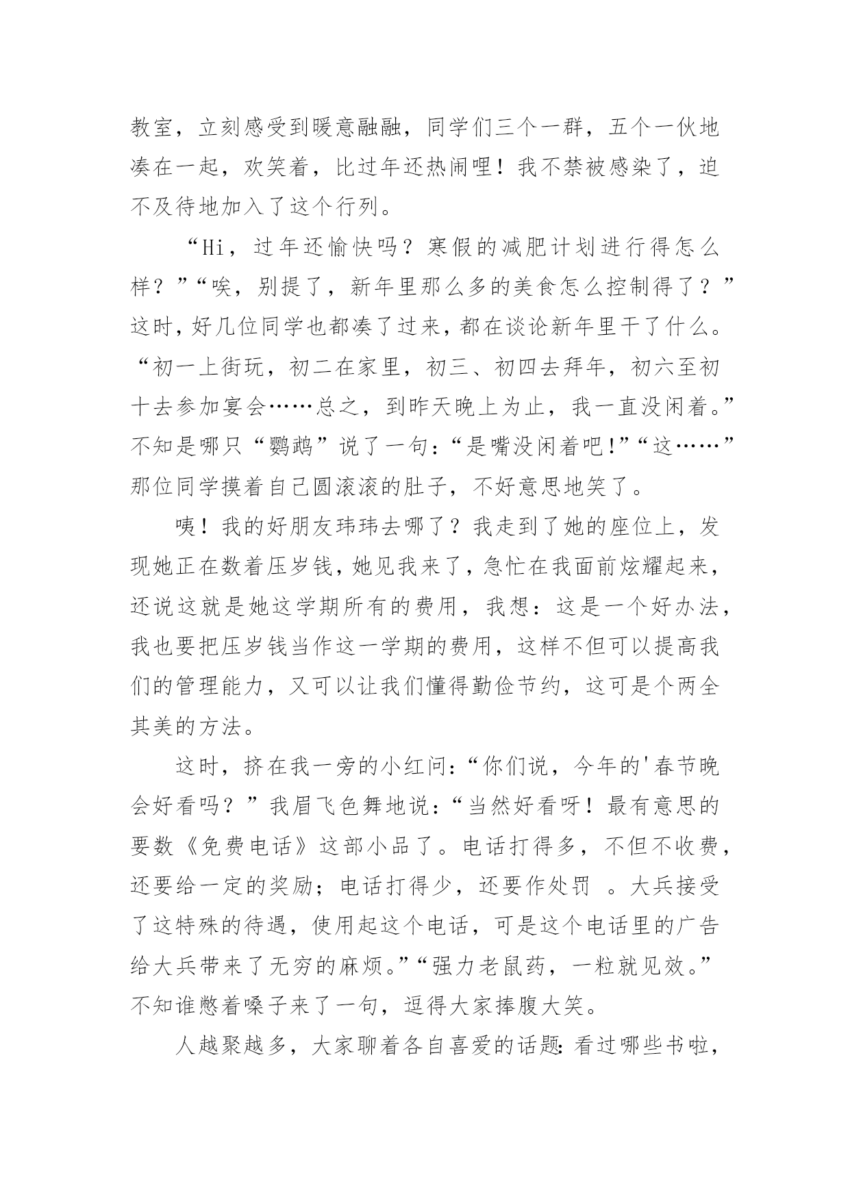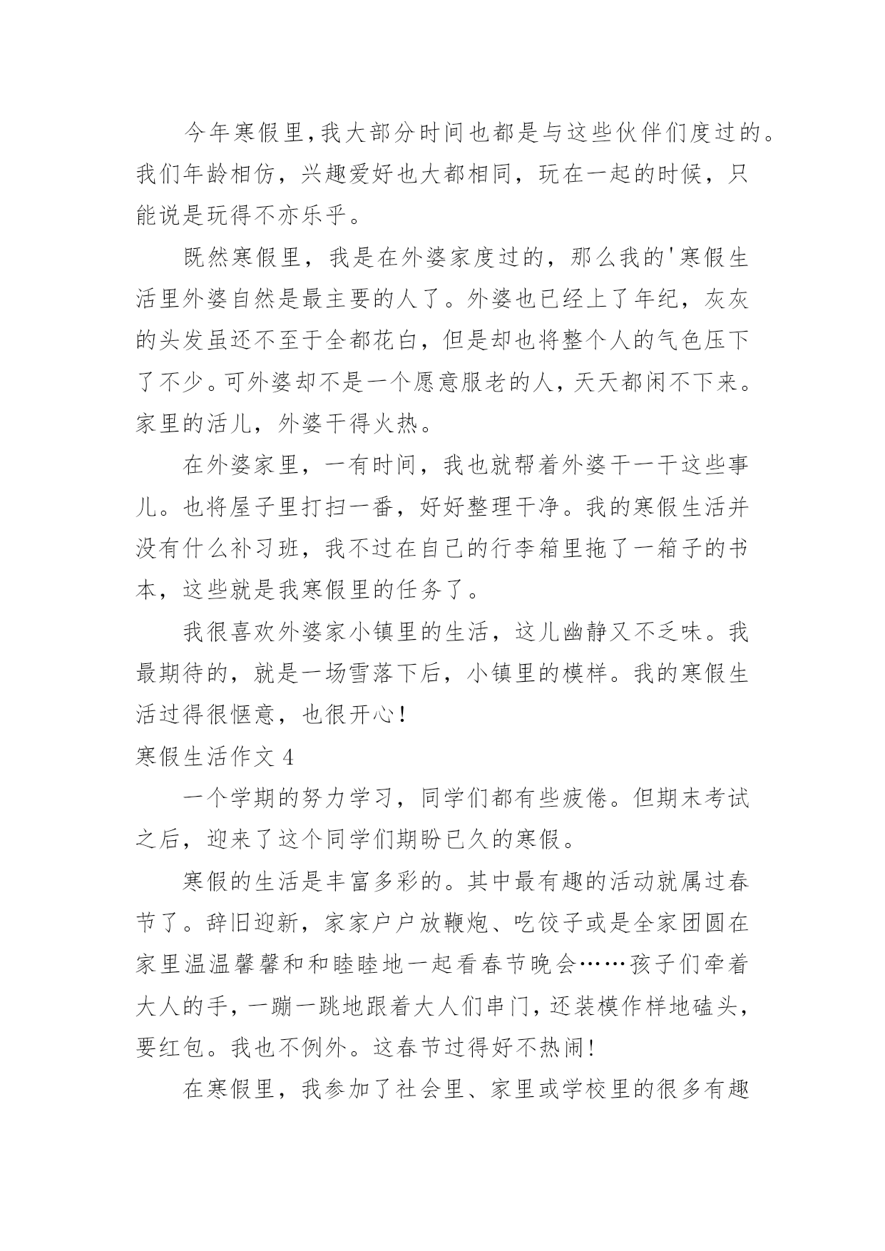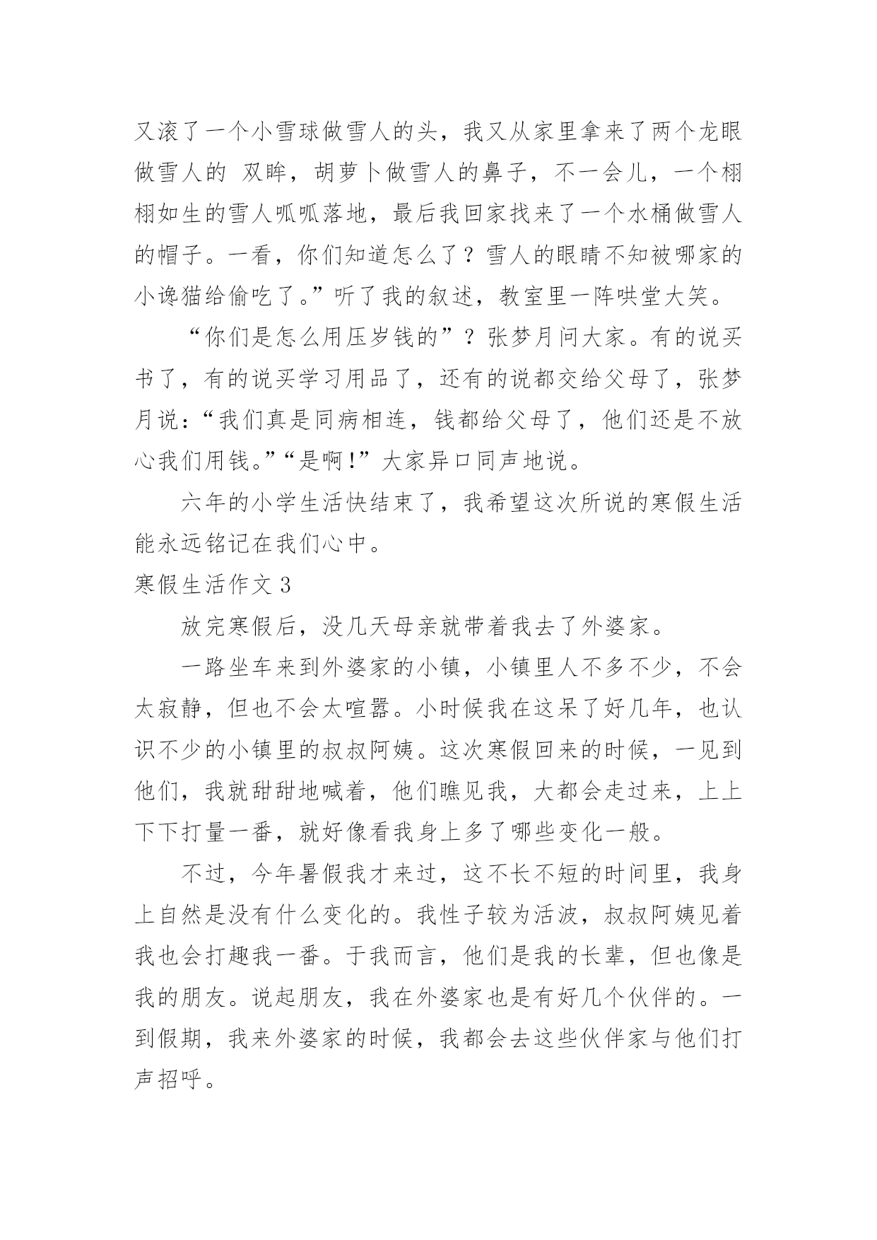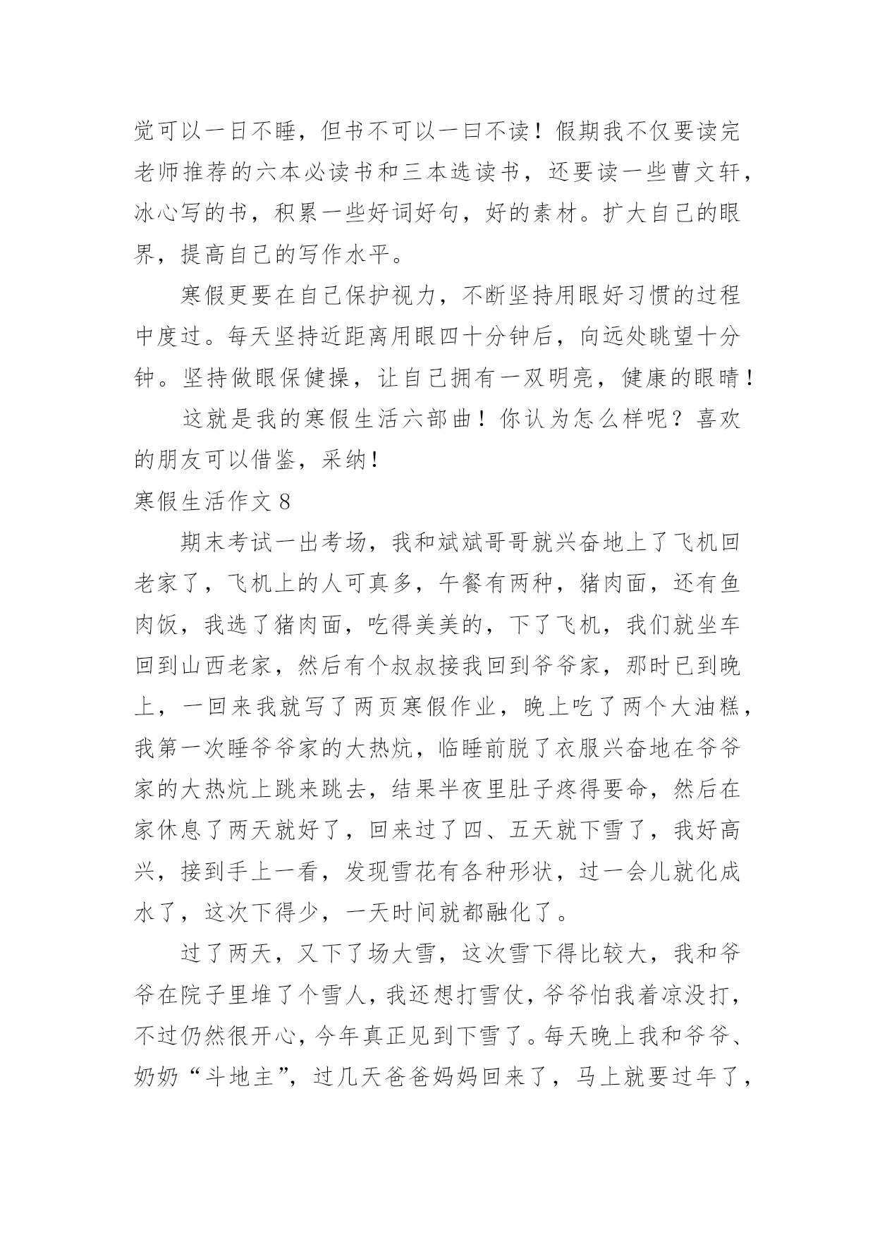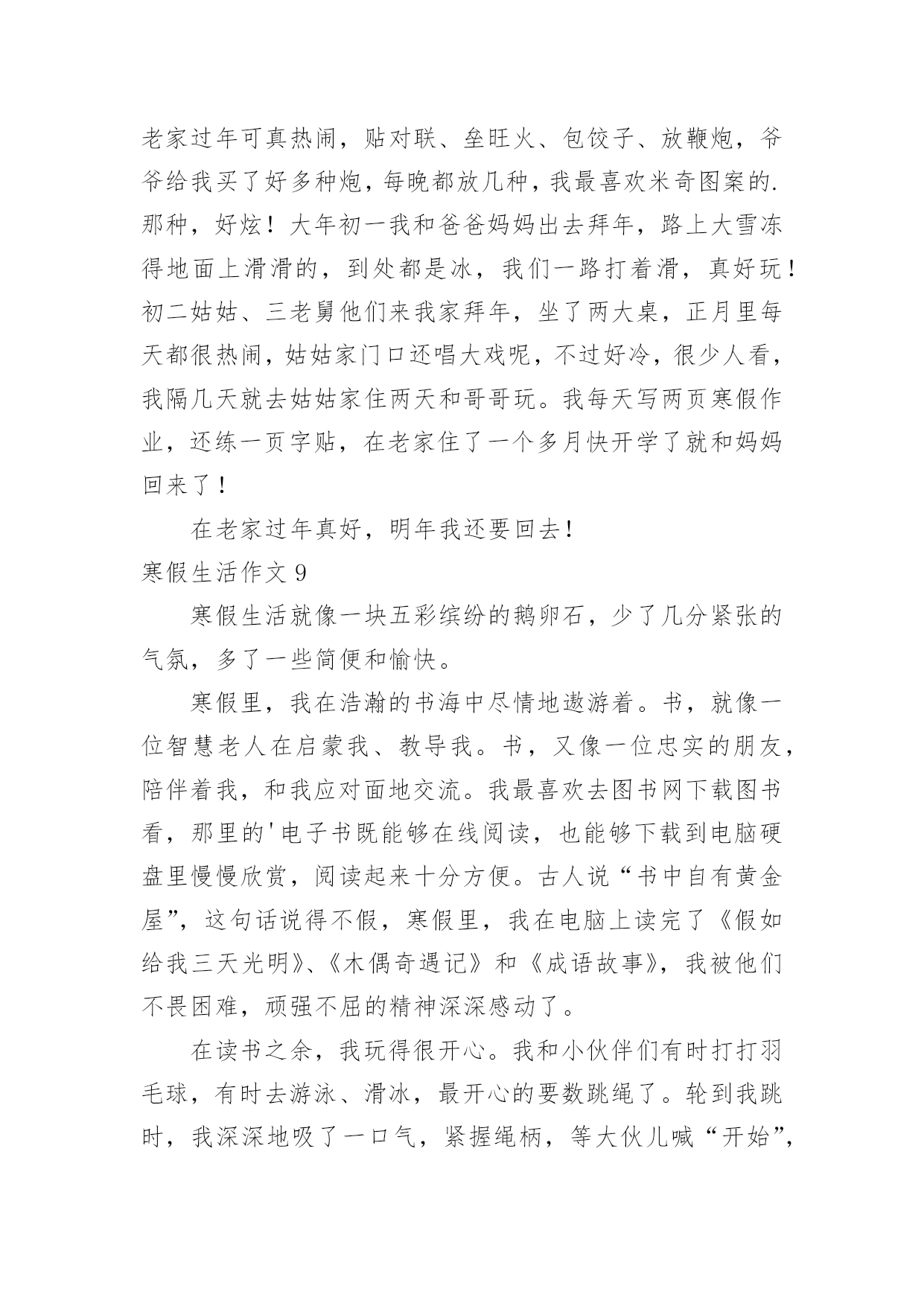 寒假生活作文寒假生活作文(精选)无论是身处学校还是步入社会,大家一定都接触过作文吧,通过作文可以把我们那些零零散散的思想,聚集在一块。写起作文来就毫无头绪?以下是小编精心整理的寒假生活作文,仅供参考,希望能够帮助到大家。寒假生活作文1寒假的生活是个调味盒,有辣的,酸的,甜的,苦的,各种各样的味道夹杂其中,真是丰富多彩。同时,也发生了许多令人伤心、烦恼和愉快的事。这一个月来,给我印象最深的是几次的“打工”。这些“打工”可使我赚到了不少的“报酬”。“打工”的.第一天,我一大早吃完饭就自觉地干起活来,先擦玻璃窗,然后扫地、拖地,最后把桌椅和橱柜都擦干净了。花了整整一个小时的时间,累得我满头大汗。刚打扫完,我还来不及欣赏自己的“杰作”,妈妈就推开门要进我的房间。我马上把她的眼睛遮住,说:“妈妈,我要给你一个惊喜!”我慢慢地张开手,说:“你看!”妈妈见了这明亮的房间,笑得多么灿烂啊!她用闪着亮光的眸子看着我。看见妈妈的表情,我觉得自己的辛苦都算不了什么,都是值得的了。这时,我的心间充满了爱,因为我走进了爱的世界。没错,妈妈给我的“报酬”就是一次微笑和一次肯定——这些都是亲人之间的特殊的心灵语言,只有当事的人才能明白,它带给我们的不仅仅是快乐和自信,还让我们感觉到了人间的真爱。如果每个人的心里都存在着他人的快乐的话,那么痛苦、仇恨将会永远消失在这个世界上。两代人,两份感情,其实都埋在各自的心里面。让每个人用心去挖掘,那份爱依然会有最初的温暖。寒假生活作文2杨柳枯了,有再青的时候;花儿谢了,有再开的时候可短暂而又愉快的寒假就这样匆匆地过去了。真是“来也匆匆,去也匆匆。”虽然只有二十多天的时间,但同学们却有很多令人愉快的事情,彼此一见面,就七嘴八舌地高谈阔论起来。谈论最多的就属于鞭炮了。放了什么鞭炮?怎么放的`?在哪儿放的?和谁一起放的?别看我们平常个个“遵纪守法”,可现在却特别活跃。用陈雨墨的话就是:该“出手”时就“出手”。就连好学生赵昕“呼”地一下变成了“捣蛋鬼”,她兴致勃勃地说:“今年除夕我在盘湾放了一次鞭炮,本想恶作剧把鞭炮从窗外扔出去吓人,可没想到刚扔出去,又被防盗窗的栏杆弹了回来,就在我眼前炸了,妈妈被响声吓了一跳,不小心摔了几只碗,而我呢?也被上了一堂思想政治课。”听了这番话,大家都笑了起来。谈论最热烈的就属堆雪人了,提到堆雪人,我兴奋地说:“堆雪人时,我先在雪地里滚了一个大雪球做雪人的身子,又滚了一个小雪球做雪人的头,我又从家里拿来了两个龙眼做雪人的双眸,胡萝卜做雪人的鼻子,不一会儿,一个栩栩如生的雪人呱呱落地,最后我回家找来了一个水桶做雪人的帽子。一看,你们知道怎么了?雪人的眼睛不知被哪家的小谗猫给偷吃了。”听了我的叙述,教室里一阵哄堂大笑。“你们是怎么用压岁钱的”?张梦月问大家。有的说买书了,有的说买学习用品了,还有的说都交给父母了,张梦月说:“我们真是同病相连,钱都给父母了,他们还是不放心我们用钱。”“是啊!”大家异口同声地说。六年的小学生活快结束了,我希望这次所说的寒假生活能永远铭记在我们心中。寒假生活作文3放完寒假后,没几天母亲就带着我去了外婆家。一路坐车来到外婆家的小镇,小镇里人不多不少,不会太寂静,但也不会太喧嚣。小时候我在这呆了好几年,也认识不少的小镇里的叔叔阿姨。这次寒假回来的时候,一见到他们,我就甜甜地喊着,他们瞧见我,大都会走过来,上上下下打量一番,就好像看我身上多了哪些变化一般。不过,今年暑假我才来过,这不长不短的时间里,我身上自然是没有什么变化的。我性子较为活波,叔叔阿姨见着我也会打趣我一番。于我而言,他们是我的长辈,但也像是我的朋友。说起朋友,我在外婆家也是有好几个伙伴的。一到假期,我来外婆家的时候,我都会去这些伙伴家与他们打声招呼。今年寒假里,我大部分时间也都是与这些伙伴们度过的。我们年龄相仿,兴趣爱好也大都相同,玩在一起的时候,只能说是玩得不亦乐乎。既然寒假里,我是在外婆家度过的,那么我的'寒假生活里外婆自然是最主要的人了。外婆也已经上了年纪,灰灰的头发虽还不至于全都花白,但是却也将整个人的气色压下了不少。可外婆却不是一个愿意服老的人,天天都闲不下来。家里的活儿,外婆干得火热。在外婆家里,一有时间,我也就帮着外婆干一干这些事儿。也将屋子里打扫一番,好好整理干净。我的寒假生活并没有什么补习班,我不过在自己的行李箱里拖了一箱子的书本,这些就是我寒假里的任务了。我很喜欢外婆家小镇里的生活,这儿幽静又不乏味。我最期待的,就是一场雪落下后,小镇里的模样。我的寒假生活过得很惬意,也很开心!寒假生活作文4一个学期的努力学习,同学们都有些疲倦。但期末考试之后,迎来了这个同学们期盼已久的寒假。寒假的生活是丰富多彩的。其中最有趣的活动就属过春节了。辞旧迎新,家家户户放鞭炮、吃饺子或是全家团圆在家里温温馨馨和和睦