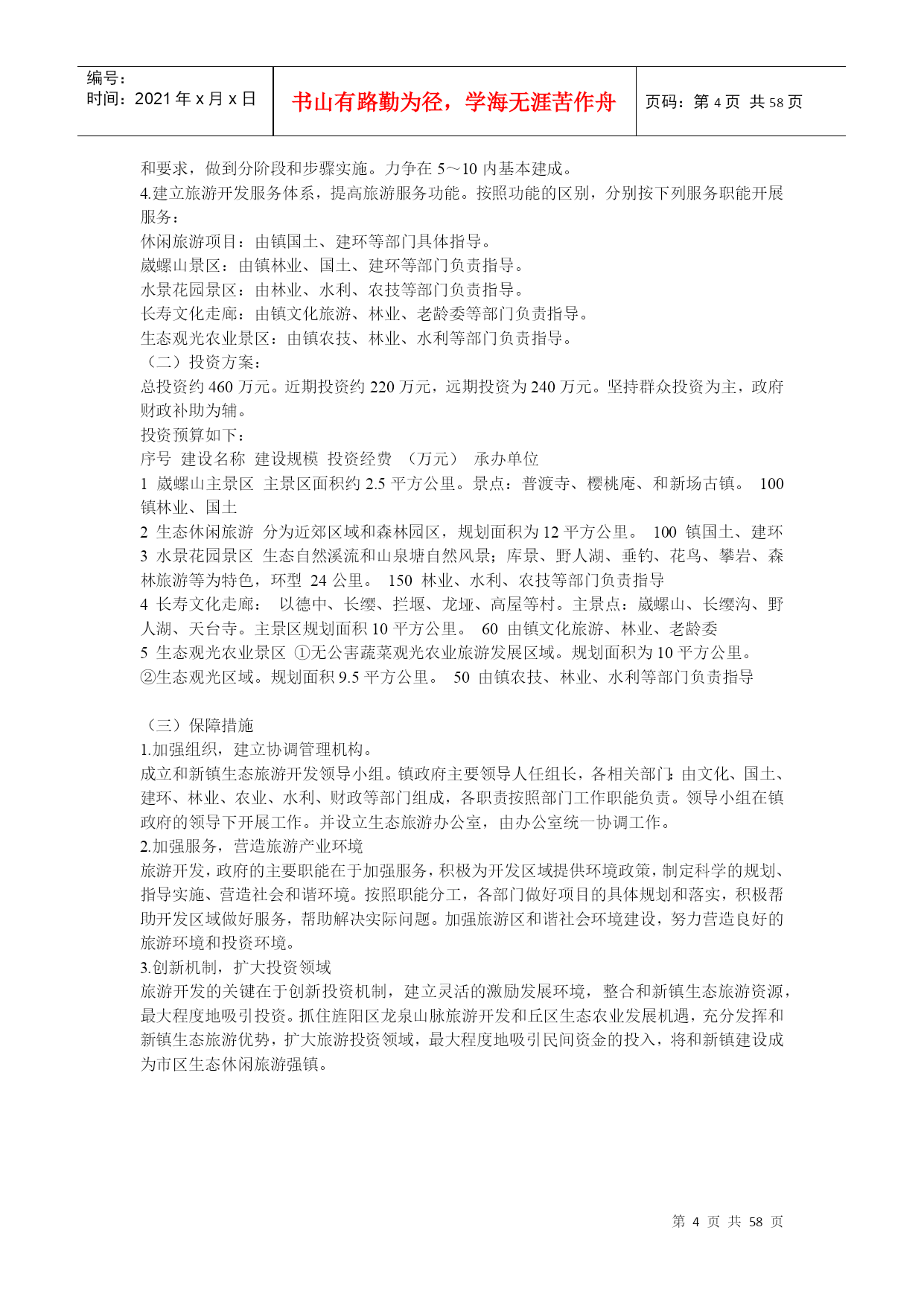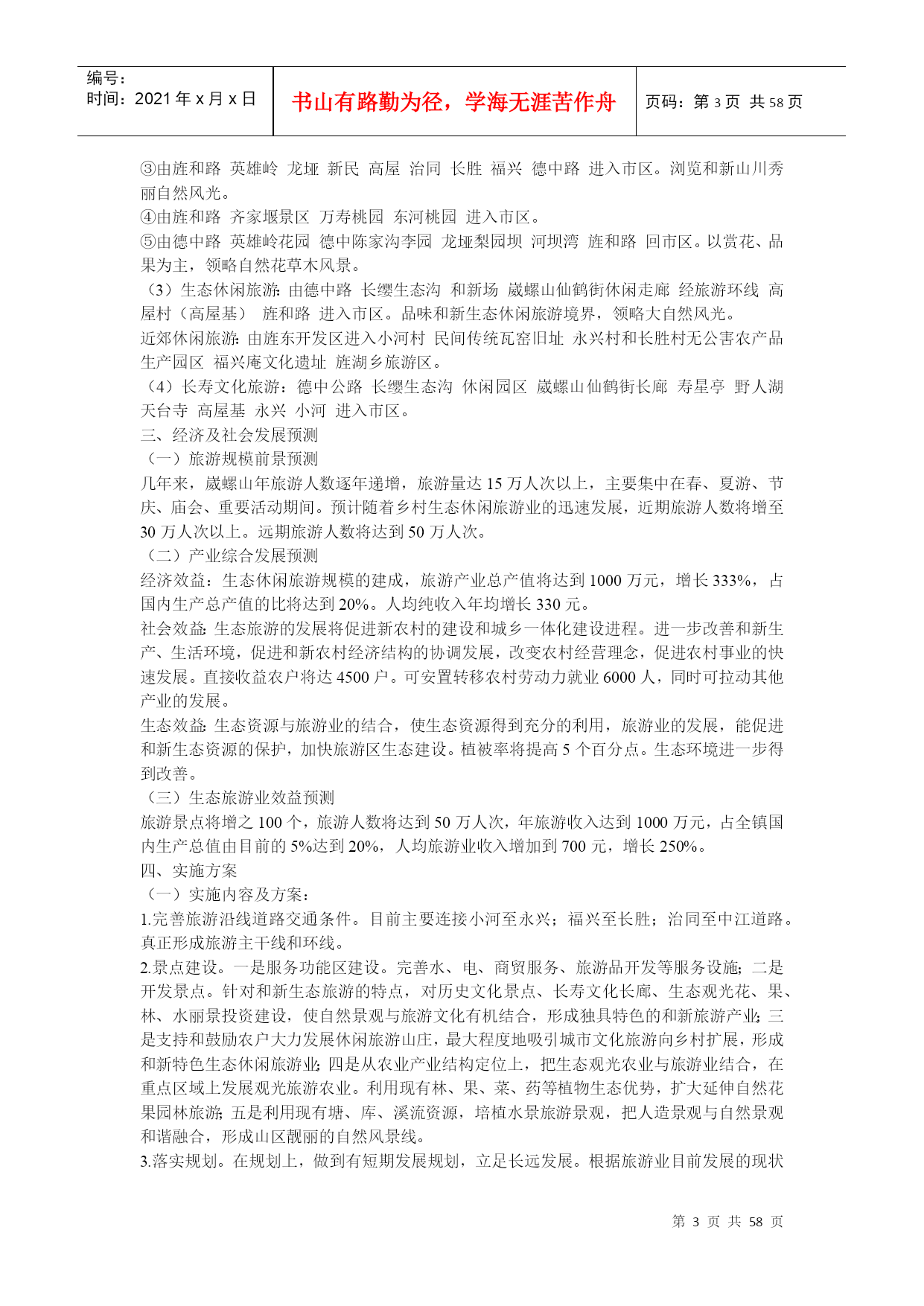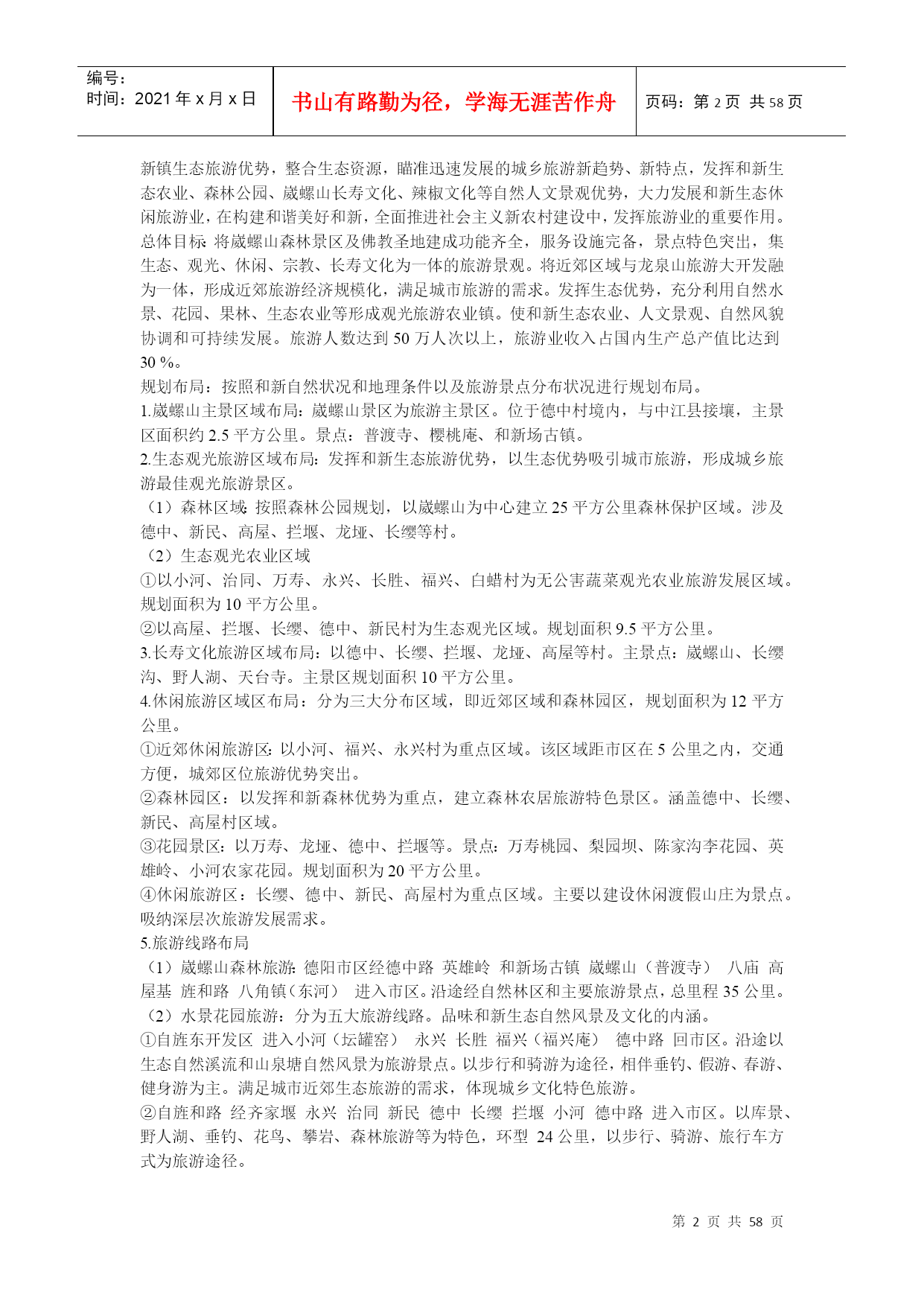 编号:时间:2021年x月x日书山有路勤为径,学海无涯苦作舟页码:第PAGE58页共NUMPAGES58页第PAGE\*MERGEFORMAT58页共NUMPAGES\*MERGEFORMAT58页一、概述(一)自然地理状况:和新镇位于德阳市旌阳区东南,与市区接壤,地处四川盆地北部龙泉山脉北端丘陵地区。海拔高度471.1~757.5米,幅员面积为58.05平方公里。全镇有13个行政村、126个村民小组,总人口16443人,5464户。主要旅游景点道路交通畅通,以旌和路、寿和路以及村通公路贯穿13个村98个组。水泥路总里程为75公里。现有80%以上的村民小组通上水泥路。全镇有3个集镇,即:河坝湾(政府所在地)、和兴场(德中村所在地)、福兴庵(福兴村所在地)。所在境内的单位11个,享有盛名的巍崴矿泉水厂就在和新生态林区。场镇常住人口1100人,其中非农业人口374人。水景资源设施状况良好,资源丰富。有水库5座,山坪塘172口,石河堰87节,蓄水池714口,景观十分自然优美。有人饮集中供水站8座,取地下150米以下的优质水,可供游客的品尝。(二)经济及社会发展状况;全镇经济发展结构:主要体现在生态农业经济和劳务经济,以农业产业以无公害蔬菜、畜牧养殖业、养蚕业、水果业等为主。无公害蔬菜基地集中在永兴、长胜、治同、福兴等村;畜牧养殖主要集中在高屋、拦堰、长缨、治同、白蜡等村;蚕桑集中在德中、新民、长缨、龙垭等村;水果集中在万寿、龙垭、德中、新民、白蜡等村。全镇有劳动力11342个,在外务工人员达4443人,其中跨省务工802余人,实现劳务收入1408万元。旅游业作为户新新兴产业,近年来发展迅速,全镇旅游业人数达15万人次,收入180万元。(三)生态状况:全镇森林覆盖率59.4%,位居全区首位,二00二年被省林业厅列为省级森林公园;二00三年被省环保厅列为环境优美小场镇示范镇;综合生态环境优势突出,土壤、水源、大气环境得到国家检测部门认定,农产品符合国家无公害农产品标准,二00一年被省农业厅确认为无公害蔬菜基地;二00五年和新蔬菜被国家确认为无公害农产品。(四)生态旅游状况:和新镇旅游业目前主要以巍螺山旅游风景区、普渡寺、休闲旅游为主。近年来,镇政府围绕生态旅游业发展,着力加强生态旅游环境建设,有重点和针对性在主要旅游景区实施退耕还林工程,增加森林植被,通过土地综合治理,保护土地资源,通过调整产业结构,发展生态农业,突出生态旅游优势,利用丰富的森林优势发展林、果、蚕、药等综合性农业,使生态农业与生态旅游业有机结合,创造一个人与自然和谐的理想景区。在结合我镇正在实施的文明新村走廊建设,把拦堰村八组、长缨村五组、治同十组作为新村建设示范点,进一步优化自然环境与人文环境,把和新建成市郊生态观光休闲型新村。在抓好生态经济建设方面。把巍螺山长寿文化与生态农业、生态旅游融为一体。弘扬“崴螺山长寿之乡”传统文化,做好崴螺山长寿文化品牌,提升崴螺山长寿文化形象。通过连续几年来举办“崴螺山长寿风情.辣椒节”文化旅游活动,提升崴螺山长寿文化形象,打造崴螺山长寿文化品牌。同时不断整合崴螺山森林旅游资源,充分发挥“省级森林公园”的资源优势,将崴螺山主景区已初步建成观光旅游、避暑休闲景区。在挖掘崴螺山传统历史过程中,商品旅游文化得到迅速发展,展示和新辣椒文化、绿色农产品特色。和新镇旅游文化内涵得到进一步充实,和新旅游业比较优势更加突出,已得到广大旅游者的高度评价和赞誉。二、发展规划指导思想:坚持以人为本,落实科学发展观,把握旌阳区龙泉山旅游开展战略机遇,依托和新镇生态旅游优势,整合生态资源,瞄准迅速发展的城乡旅游新趋势、新特点,发挥和新生态农业、森林公园、崴螺山长寿文化、辣椒文化等自然人文景观优势,大力发展和新生态休闲旅游业,在构建和谐美好和新,全面推进社会主义新农村建设中,发挥旅游业的重要作用。总体目标:将崴螺山森林景区及佛教圣地建成功能齐全,服务设施完备,景点特色突出,集生态、观光、休闲、宗教、长寿文化为一体的旅游景观。将近郊区域与龙泉山旅游大开发融为一体,形成近郊旅游经济规模化,满足城市旅游的需求。发挥生态优势,充分利用自然水景、花园、果林、生态农业等形成观光旅游农业镇。使和新生态农业、人文景观、自然风貌协调和可持续发展。旅游人数达到50万人次以上,旅游业收入占国内生产总产值比达到30%。规划布局:按照和新自然状况和地理条件以及旅游景点分布状况进行规划布局。1.崴螺山主景区域布局:崴螺山景区为旅游主景区。位于德中村境内,与中江县接壤,主景区面积约2.5平方公里。景点:普渡寺、樱桃庵、和新场古镇。2.生态观光旅游区域布局:发挥和新生态旅游优势,以生态优势吸引城市旅游,形成城乡旅游最佳观光旅