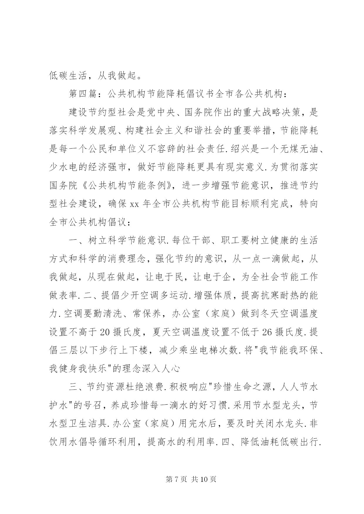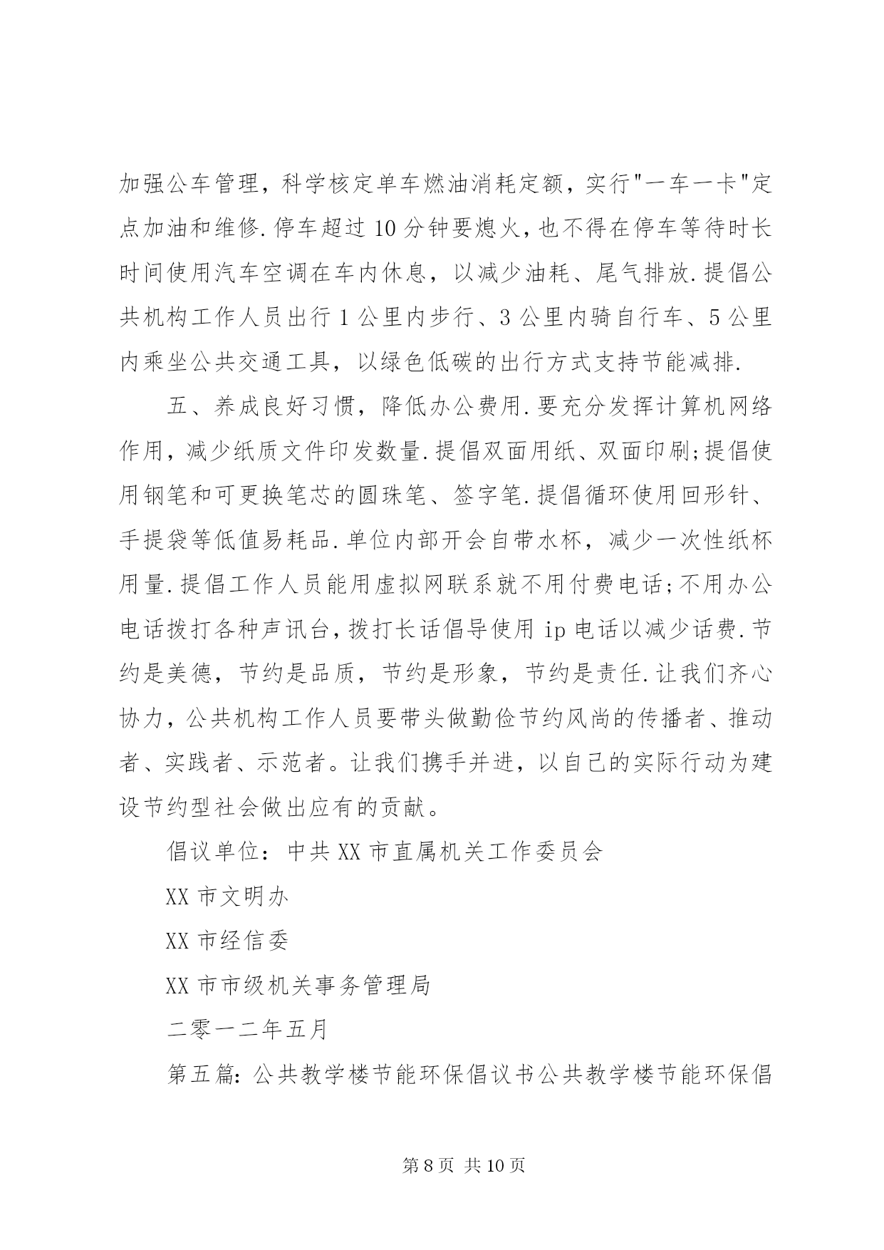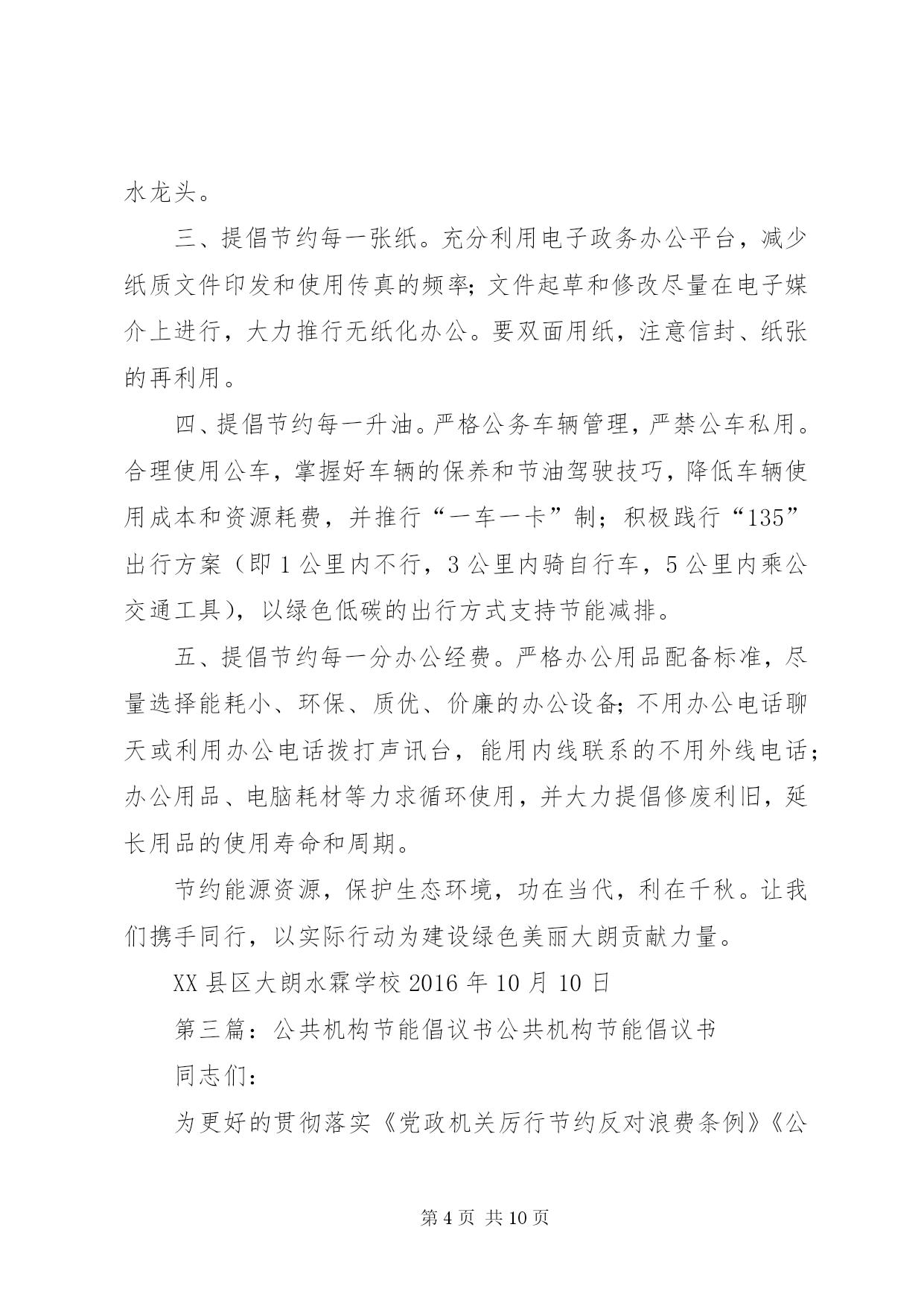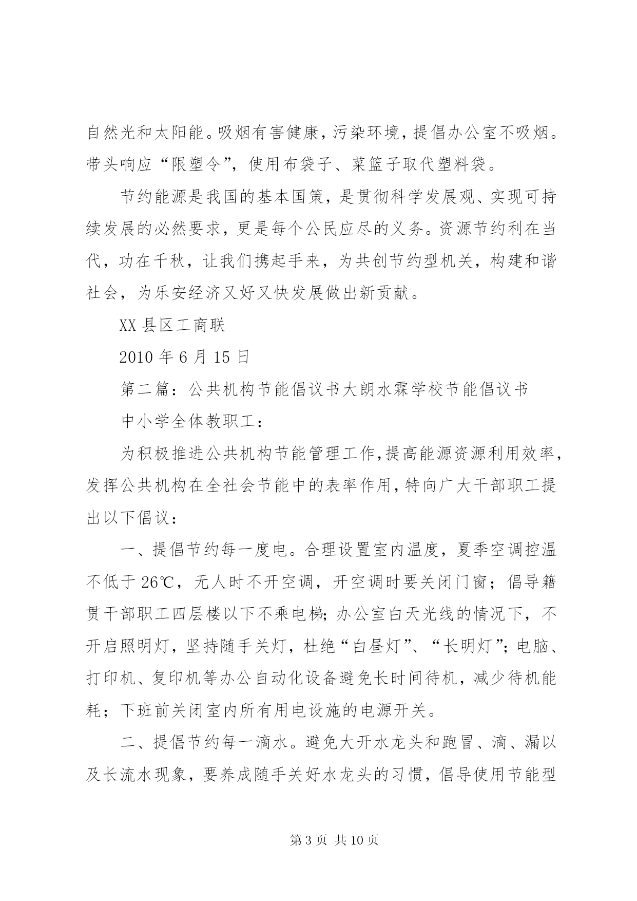第PAGE\*Arabic\*MERGEFORMAT10页共NUMPAGES\*MERGEFORMAT10页公共节能倡议书为贯彻落实国务院《公共机构节能条例》,积极响应国家“建设节约型、环境友好型社会”的号召,推进节约型机关建设,特向工商联全体干部职工发出节能倡议:一是强化节能意识。积极宣传贯彻《中华人民共和国节约能源法》和《公共机构节能条例》等节能有关政策法律法规条例,在全工商联形成“人人讲节约,处处讲节约”和“节约能源光荣,浪费能源可耻,反对奢侈浪费”的良好氛围。二是强化节能行为。全体干部职工积极投入到“节能”行动中来,在工作学习生活中,养成良好的节约习惯,创造节约方法,规范节约行为;从现在做起,从自身做起,从一点一滴做起,珍惜每一度电、每一滴水、每一张纸、每一分钱;坚持少花钱多办事原则,科学合理安排使用资金、资源。三是节约每一张纸。提倡纸张双面使用,倡导网上办公,推行无纸化办公;修改文稿尽量在电脑上进行,尽量在网络上传递资料,减少纸张浪费。四是节约每一滴水。全面使用节水型龙头、节水型卫生洁具;自觉养成节水习惯,做到爱水、惜水、节水;使用水龙头后及时关闭;加强供水设备的日常维护和管理,定期检查和更换老化的供水管道和用水设施,杜绝跑冒滴漏和“长流水”现象。五是节约每一度电。办公室、会议室采光充足时,不开灯;办公室人走灯灭,公共走廊、楼梯照明灯要安装自动控制和分路式开关,防止“白昼灯”和“长明灯”现象;工作完成后及时关闭电脑;夏季空调设定不低于26℃,冬季空调设定不高于20℃,无人时关闭空调,倡导下班前半小时关空调;多用自然通风,减少空调耗能。下班后所有的用电设备要切断电源。提倡绿色采购、集中采购,办公耗材选择能耗低、环保、质优、价廉的产品,不采购国家明令禁止使用的高能耗设备或产品。带头推广使用节能产品和节能技术。办公场所禁止使用电水壶、“热得快”等高耗能电器,主动淘汰高耗能设备、家用电器。六是节约每一滴油。按编制和标准配备公车,严禁超编制、超标准配备和使用车辆,购车要集中进行政府采购,优先选用节能环保车辆。加强公车使用管理,科学核定单车燃油消耗定额,实行定点加油和定点维修。公务活动用车,能几人同行的应共同搭乘;集体公务活动,提倡集中乘车。提高车辆管理人员和驾驶人员的业务技能,降低油耗。提倡骑自行车或乘公交车上下班。七是节约行政资源。认真遵守会议及接待制度,严格执行接待标准,严格控制公务活动规模,切实做到从简节约、体现效能,降低行政运行成本。电话办公做到语言精练准确,减少通话时间,严禁使用单位电话打私人长途。倡导务实工作作风,注重实际效果,不搞形式主义,发挥资源最大效益。八是提倡节能环保。建筑装修尽量选用环保材料,尽量采用自然光和太阳能。吸烟有害健康,污染环境,提倡办公室不吸烟。带头响应“限塑令”,使用布袋子、菜篮子取代塑料袋。节约能源是我国的基本国策,是贯彻科学发展观、实现可持续发展的必然要求,更是每个公民应尽的义务。资源节约利在当代,功在千秋,让我们携起手来,为共创节约型机关,构建和谐社会,为乐安经济又好又快发展做出新贡献。XX县区工商联2010年6月15日第二篇:公共机构节能倡议书大朗水霖学校节能倡议书中小学全体教职工:为积极推进公共机构节能管理工作,提高能源资源利用效率,发挥公共机构在全社会节能中的表率作用,特向广大干部职工提出以下倡议:一、提倡节约每一度电。合理设置室内温度,夏季空调控温不低于26℃,无人时不开空调,开空调时要关闭门窗;倡导籍贯干部职工四层楼以下不乘电梯;办公室白天光线的情况下,不开启照明灯,坚持随手关灯,杜绝“白昼灯”、“长明灯”;电脑、打印机、复印机等办公自动化设备避免长时间待机,减少待机能耗;下班前关闭室内所有用电设施的电源开关。二、提倡节约每一滴水。避免大开水龙头和跑冒、滴、漏以及长流水现象,要养成随手关好水龙头的习惯,倡导使用节能型水龙头。三、提倡节约每一张纸。充分利用电子政务办公平台,减少纸质文件印发和使用传真的频率;文件起草和修改尽量在电子媒介上进行,大力推行无纸化办公。要双面用纸,注意信封、纸张的再利用。四、提倡节约每一升油。严格公务车辆管理,严禁公车私用。合理使用公车,掌握好车辆的保养和节油驾驶技巧,降低车辆使用成本和资源耗费,并推行“一车一卡”制;积极践行“135”出行方案(即1公里内不行,3公里内骑自行车,5公里内乘公交通工具),以绿色低碳的出行方式支持节能减排。五、提倡节约每一分办公经费。严格办公用品配备标准,尽量选择能耗小、环保、质优、价廉的办公设备;不用办公电话聊天或利用办公电话拨打声讯台,能用内线联系的不用外线电话;办公用品、电脑耗材等力求循环使用,并大力提倡修废利旧,延长用品的使用寿命和周期。节约能源资源,保护生态环境,功在当代,利在千秋。让我