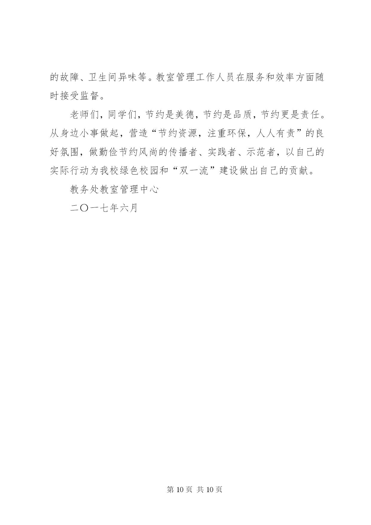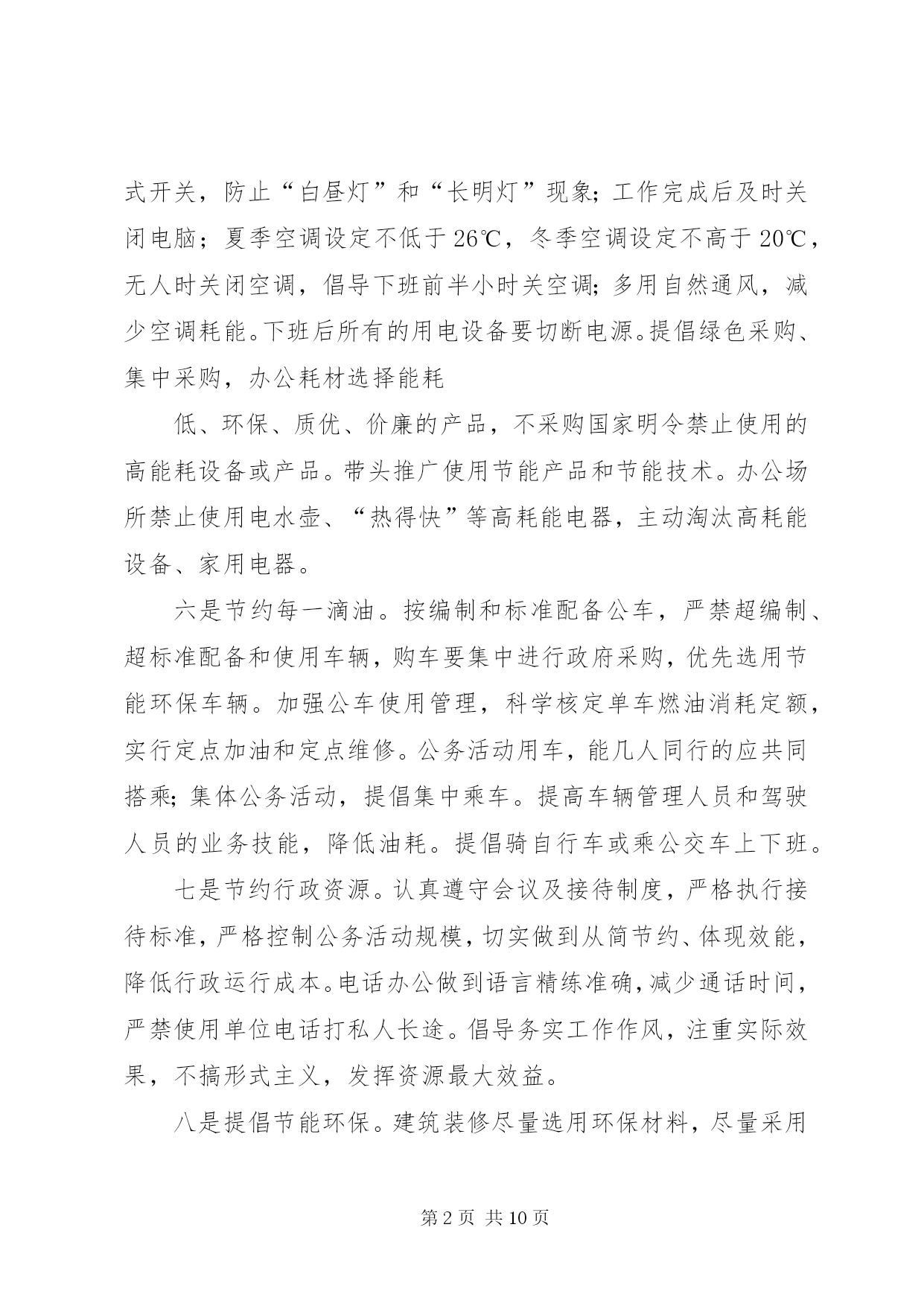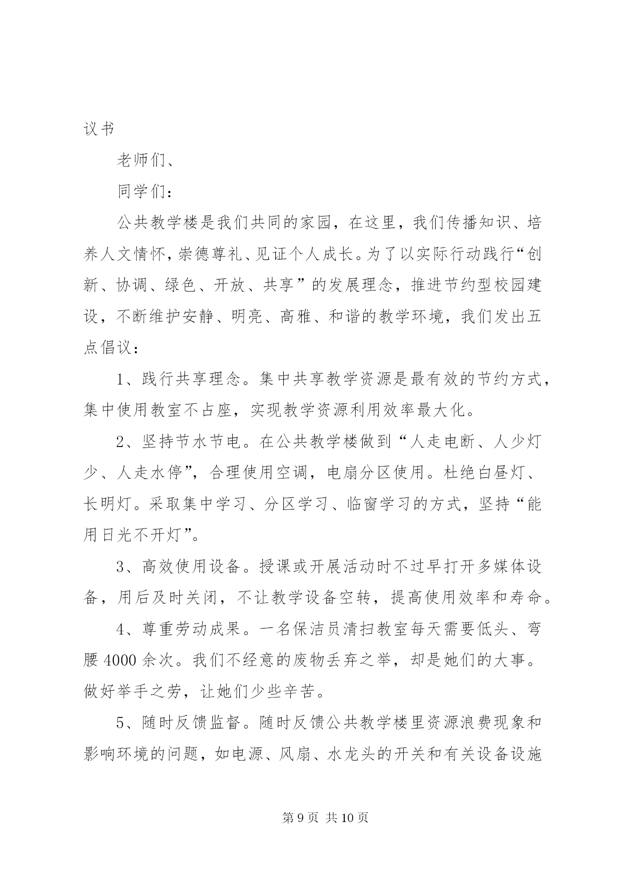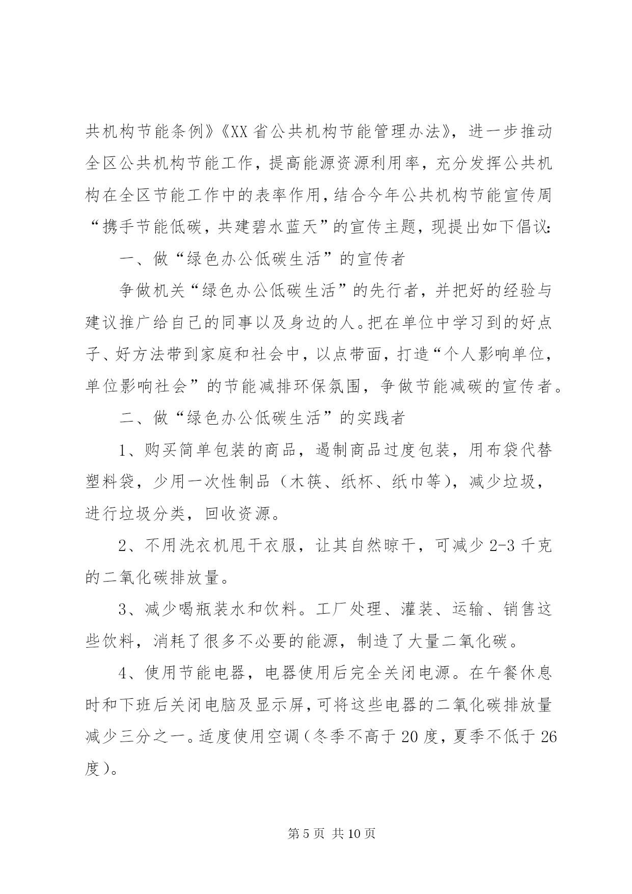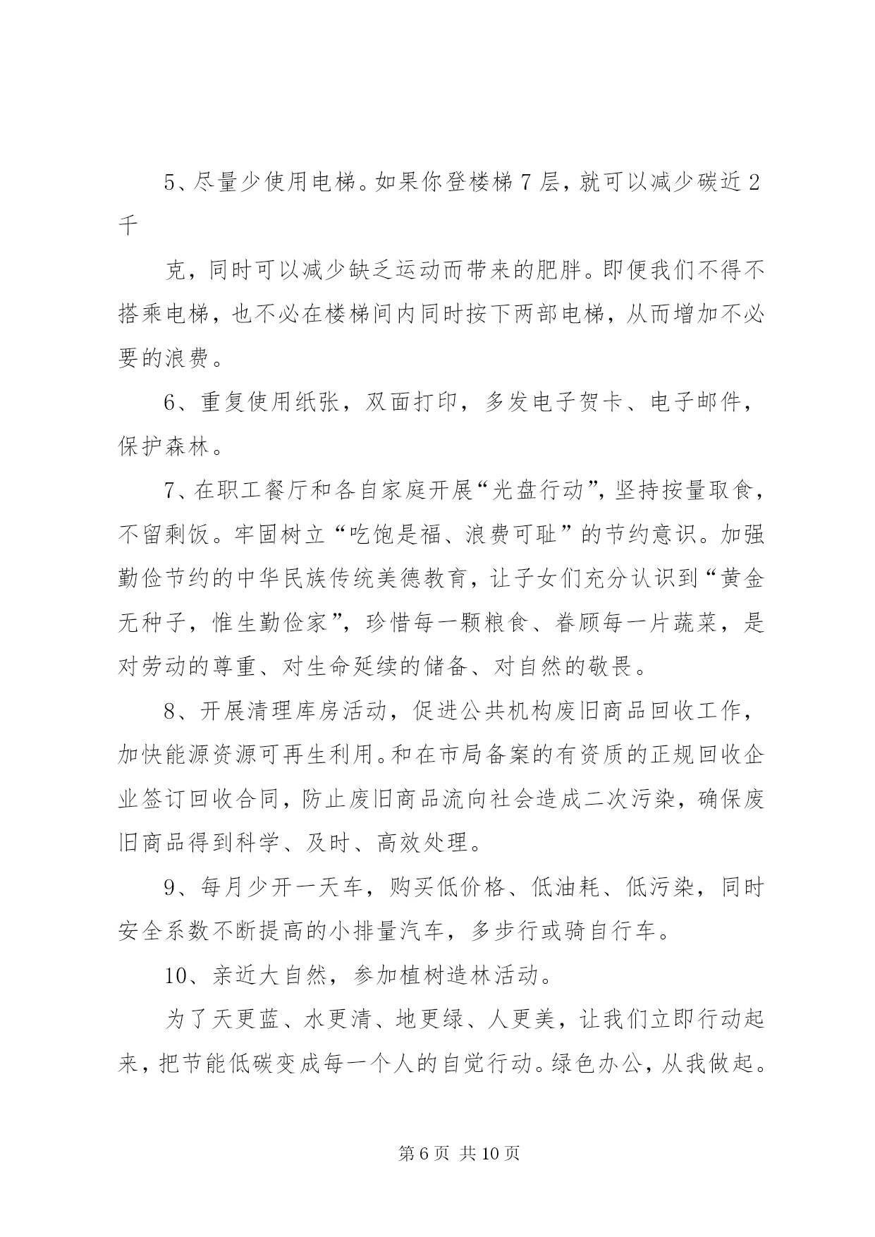 第PAGE\*Arabic\*MERGEFORMAT10页共NUMPAGES\*MERGEFORMAT10页公共节能倡议书为贯彻落实国务院《公共机构节能条例》,积极响应国家“建设节约型、环境友好型社会”的号召,推进节约型机关建设,特向工商联全体干部职工发出节能倡议:一是强化节能意识。积极宣传贯彻《中华人民共和国节约能源法》和《公共机构节能条例》等节能有关政策法律法规条例,在全工商联形成“人人讲节约,处处讲节约”和“节约能源光荣,浪费能源可耻,反对奢侈浪费”的良好氛围。二是强化节能行为。全体干部职工积极投入到“节能”行动中来,在工作学习生活中,养成良好的节约习惯,创造节约方法,规范节约行为;从现在做起,从自身做起,从一点一滴做起,珍惜每一度电、每一滴水、每一张纸、每一分钱;坚持少花钱多办事原则,科学合理安排使用资金、资源。三是节约每一张纸。提倡纸张双面使用,倡导网上办公,推行无纸化办公;修改文稿尽量在电脑上进行,尽量在网络上传递资料,减少纸张浪费。四是节约每一滴水。全面使用节水型龙头、节水型卫生洁具;自觉养成节水习惯,做到爱水、惜水、节水;使用水龙头后及时关闭;加强供水设备的日常维护和管理,定期检查和更换老化的供水管道和用水设施,杜绝跑冒滴漏和“长流水”现象。五是节约每一度电。办公室、会议室采光充足时,不开灯;办公室人走灯灭,公共走廊、楼梯照明灯要安装自动控制和分路式开关,防止“白昼灯”和“长明灯”现象;工作完成后及时关闭电脑;夏季空调设定不低于26℃,冬季空调设定不高于20℃,无人时关闭空调,倡导下班前半小时关空调;多用自然通风,减少空调耗能。下班后所有的用电设备要切断电源。提倡绿色采购、集中采购,办公耗材选择能耗低、环保、质优、价廉的产品,不采购国家明令禁止使用的高能耗设备或产品。带头推广使用节能产品和节能技术。办公场所禁止使用电水壶、“热得快”等高耗能电器,主动淘汰高耗能设备、家用电器。六是节约每一滴油。按编制和标准配备公车,严禁超编制、超标准配备和使用车辆,购车要集中进行政府采购,优先选用节能环保车辆。加强公车使用管理,科学核定单车燃油消耗定额,实行定点加油和定点维修。公务活动用车,能几人同行的应共同搭乘;集体公务活动,提倡集中乘车。提高车辆管理人员和驾驶人员的业务技能,降低油耗。提倡骑自行车或乘公交车上下班。七是节约行政资源。认真遵守会议及接待制度,严格执行接待标准,严格控制公务活动规模,切实做到从简节约、体现效能,降低行政运行成本。电话办公做到语言精练准确,减少通话时间,严禁使用单位电话打私人长途。倡导务实工作作风,注重实际效果,不搞形式主义,发挥资源最大效益。八是提倡节能环保。建筑装修尽量选用环保材料,尽量采用自然光和太阳能。吸烟有害健康,污染环境,提倡办公室不吸烟。带头响应“限塑令”,使用布袋子、菜篮子取代塑料袋。节约能源是我国的基本国策,是贯彻科学发展观、实现可持续发展的必然要求,更是每个公民应尽的义务。资源节约利在当代,功在千秋,让我们携起手来,为共创节约型机关,构建和谐社会,为乐安经济又好又快发展做出新贡献。XX县区工商联2010年6月15日第二篇:公共机构节能倡议书大朗水霖学校节能倡议书中小学全体教职工:为积极推进公共机构节能管理工作,提高能源资源利用效率,发挥公共机构在全社会节能中的表率作用,特向广大干部职工提出以下倡议:一、提倡节约每一度电。合理设置室内温度,夏季空调控温不低于26℃,无人时不开空调,开空调时要关闭门窗;倡导籍贯干部职工四层楼以下不乘电梯;办公室白天光线的情况下,不开启照明灯,坚持随手关灯,杜绝“白昼灯”、“长明灯”;电脑、打印机、复印机等办公自动化设备避免长时间待机,减少待机能耗;下班前关闭室内所有用电设施的电源开关。二、提倡节约每一滴水。避免大开水龙头和跑冒、滴、漏以及长流水现象,要养成随手关好水龙头的习惯,倡导使用节能型水龙头。三、提倡节约每一张纸。充分利用电子政务办公平台,减少纸质文件印发和使用传真的频率;文件起草和修改尽量在电子媒介上进行,大力推行无纸化办公。要双面用纸,注意信封、纸张的再利用。四、提倡节约每一升油。严格公务车辆管理,严禁公车私用。合理使用公车,掌握好车辆的保养和节油驾驶技巧,降低车辆使用成本和资源耗费,并推行“一车一卡”制;积极践行“135”出行方案(即1公里内不行,3公里内骑自行车,5公里内乘公交通工具),以绿色低碳的出行方式支持节能减排。五、提倡节约每一分办公经费。严格办公用品配备标准,尽量选择能耗小、环保、质优、价廉的办公设备;不用办公电话聊天或利用办公电话拨打声讯台,能用内线联系的不用外线电话;办公用品、电脑耗材等力求循环使用,并大力提倡修废利旧,延长用品的使用寿命和周期。节约能源资源,保护生态环境,功在当代,利在千秋。让我