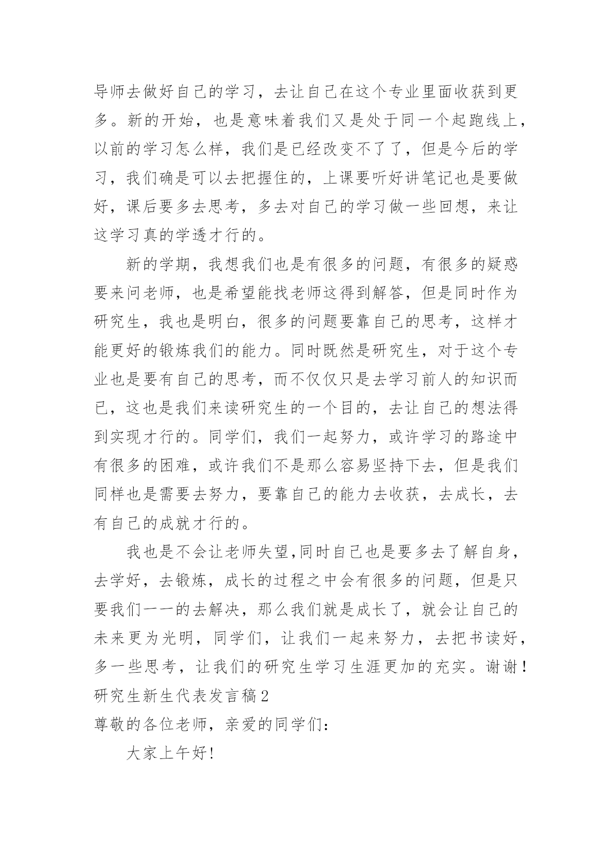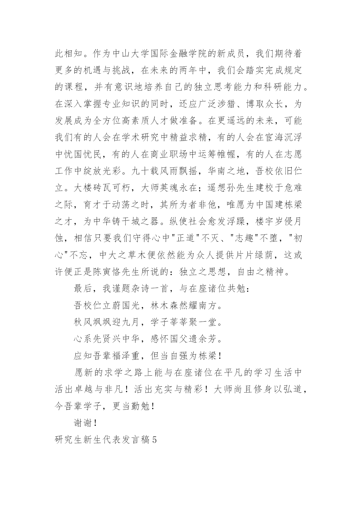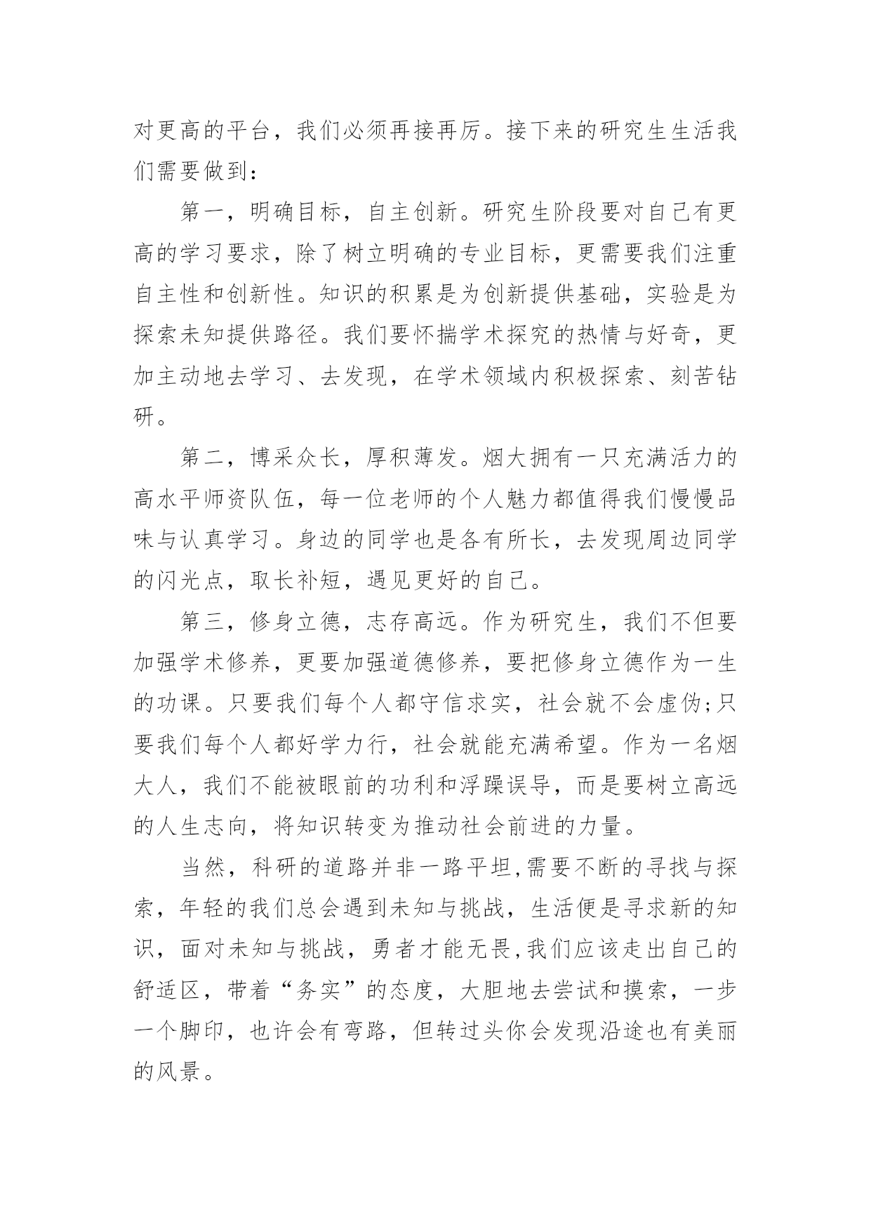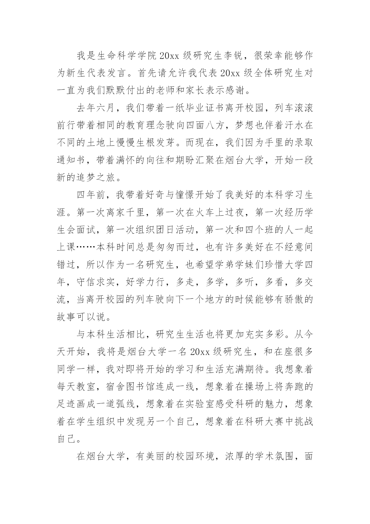 研究生新生代表发言稿研究生新生代表发言稿在不断进步的社会中,接触并使用发言稿的人越来越多,发言稿要求内容充实,条理清楚,重点突出。相信许多人会觉得发言稿很难写吧,以下是小编为大家整理的研究生新生代表发言稿,希望能够帮助到大家。研究生新生代表发言稿1尊敬的老师、亲爱的同学们:大家好!开学了,新的开始,也是意味着我们要去继续的学习,而我作为研究生被老师认可,选为代表而在这发言,我也是特别的荣幸,四年的学习结束,我开始也是以为自己可能会选择去到社会工作,但是最终我还是选择了读研,我想继续的努力,去学到更多,去让自己准备是更加充分的。无论我们身处在哪一个阶段,其实我们都是要以学习为第一要务,在学校的日子其实真的值得我们去珍惜,回想起来,我进入大学其实也是没有多长的时间,四年过得很快,同时也是很充实,没有去浪费掉,也是让我更加的明白学习的重要性,也是自己学的更多更是明白我们自己的能力其实进步的空间很大,优秀的人特别的多,但也是要更努力,才能让自己收获更大,而进入到研究生的阶段,我也是要跟着导师去做好自己的学习,去让自己在这个专业里面收获到更多。新的开始,也是意味着我们又是处于同一个起跑线上,以前的学习怎么样,我们是已经改变不了了,但是今后的学习,我们确是可以去把握住的,上课要听好讲笔记也是要做好,课后要多去思考,多去对自己的学习做一些回想,来让这学习真的学透才行的。新的学期,我想我们也是有很多的问题,有很多的疑惑要来问老师,也是希望能找老师这得到解答,但是同时作为研究生,我也是明白,很多的问题要靠自己的思考,这样才能更好的锻炼我们的能力。同时既然是研究生,对于这个专业也是要有自己的思考,而不仅仅只是去学习前人的知识而已,这也是我们来读研究生的一个目的,去让自己的想法得到实现才行的。同学们,我们一起努力,或许学习的路途中有很多的困难,或许我们不是那么容易坚持下去,但是我们同样也是需要去努力,要靠自己的能力去收获,去成长,去有自己的成就才行的。我也是不会让老师失望,同时自己也是要多去了解自身,去学好,去锻炼,成长的过程之中会有很多的问题,但是只要我们一一的去解决,那么我们就是成长了,就会让自己的未来更为光明,同学们,让我们一起来努力,去把书读好,多一些思考,让我们的研究生学习生涯更加的充实。谢谢!研究生新生代表发言稿2尊敬的各位老师,亲爱的同学们:大家上午好!我是生命科学学院20xx级研究生李锐,很荣幸能够作为新生代表发言。首先请允许我代表20xx级全体研究生对一直为我们默默付出的老师和家长表示感谢。去年六月,我们带着一纸毕业证书离开校园,列车滚滚前行带着相同的教育理念驶向四面八方,梦想也伴着汗水在不同的土地上慢慢生根发芽。而现在,我们因为手里的录取通知书,带着满怀的向往和期盼汇聚在烟台大学,开始一段新的追梦之旅。四年前,我带着好奇与憧憬开始了我美好的本科学习生涯。第一次离家千里,第一次在火车上过夜,第一次经历学生会面试,第一次组织团日活动,第一次和四个班的人一起上课……本科时间总是匆匆而过,也有许多美好在不经意间错过,所以作为一名研究生,也希望学弟学妹们珍惜大学四年,守信求实,好学力行,多走,多学,多听,多看,多交流,当离开校园的列车驶向下一个地方的时候能够有骄傲的故事可以说。与本科生活相比,研究生生活也将更加充实多彩。从今天开始,我将是烟台大学一名20xx级研究生,和在座很多同学一样,我对即将开始的学习和生活充满期待。我想象着每天教室,宿舍图书馆连成一线,想象着在操场上将奔跑的足迹画成一道弧线,想象着在实验室感受科研的魅力,想象着在学生组织中发现另一个自己,想象着在科研大赛中挑战自己。在烟台大学,有美丽的校园环境,浓厚的学术氛围,面对更高的平台,我们必须再接再厉。接下来的研究生生活我们需要做到:第一,明确目标,自主创新。研究生阶段要对自己有更高的学习要求,除了树立明确的专业目标,更需要我们注重自主性和创新性。知识的积累是为创新提供基础,实验是为探索未知提供路径。我们要怀揣学术探究的热情与好奇,更加主动地去学习、去发现,在学术领域内积极探索、刻苦钻研。第二,博采众长,厚积薄发。烟大拥有一只充满活力的高水平师资队伍,每一位老师的个人魅力都值得我们慢慢品味与认真学习。身边的同学也是各有所长,去发现周边同学的闪光点,取长补短,遇见更好的自己。第三,修身立德,志存高远。作为研究生,我们不但要加强学术修养,更要加强道德修养,要把修身立德作为一生的功课。只要我们每个人都守信求实,社会就不会虚伪;只要我们每个人都好学力行,社会就能充满希望。作为一名烟大人,我们不能被眼前的功利和浮躁误导,而是要树立高远的人生志向,将知识转变为推动社会前进的力量。当然,科研的道路并非一路平坦,需要不断的寻找与探索,年轻的我们总会遇到未知与挑战,生活便是寻求新的知识,面