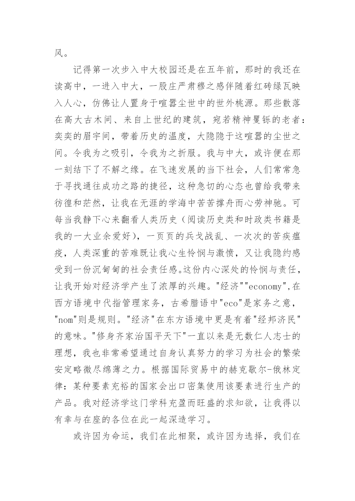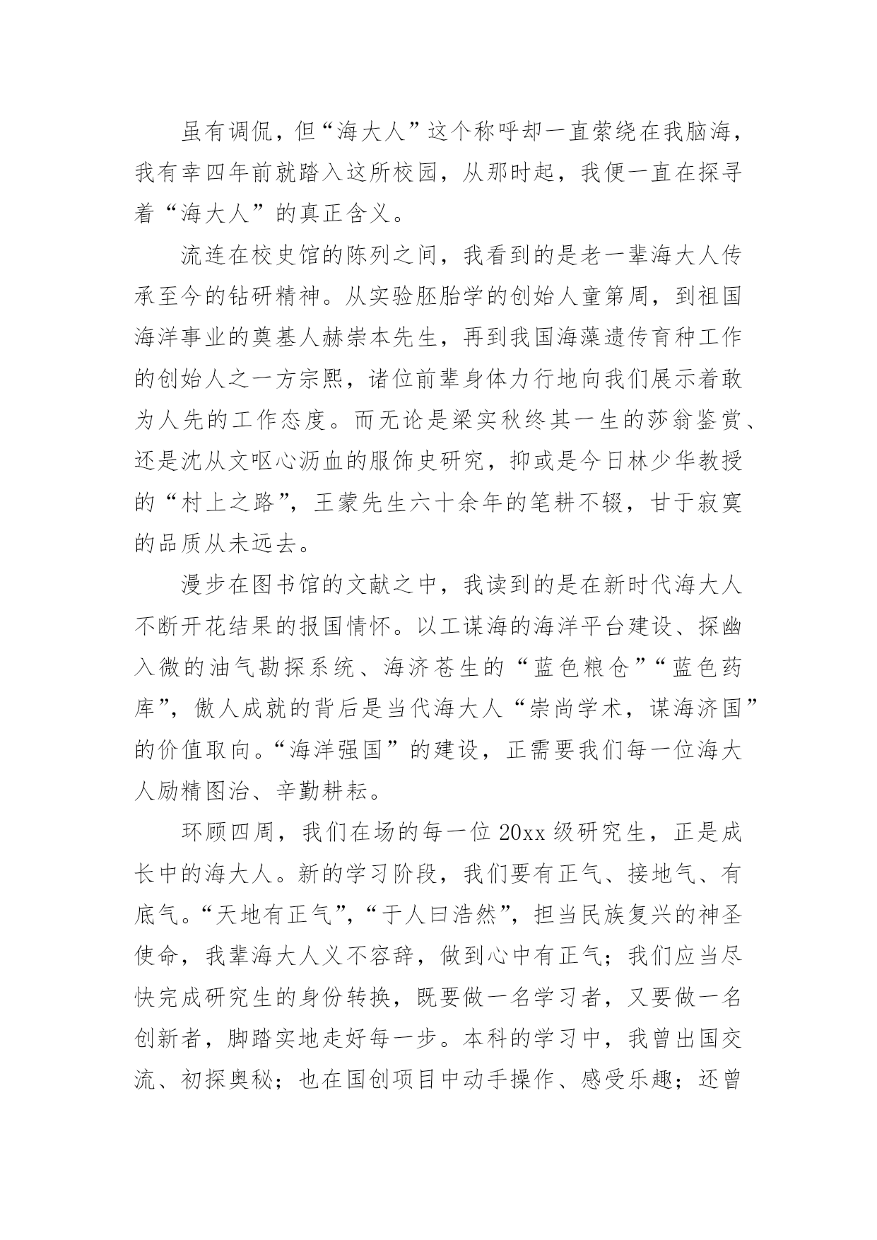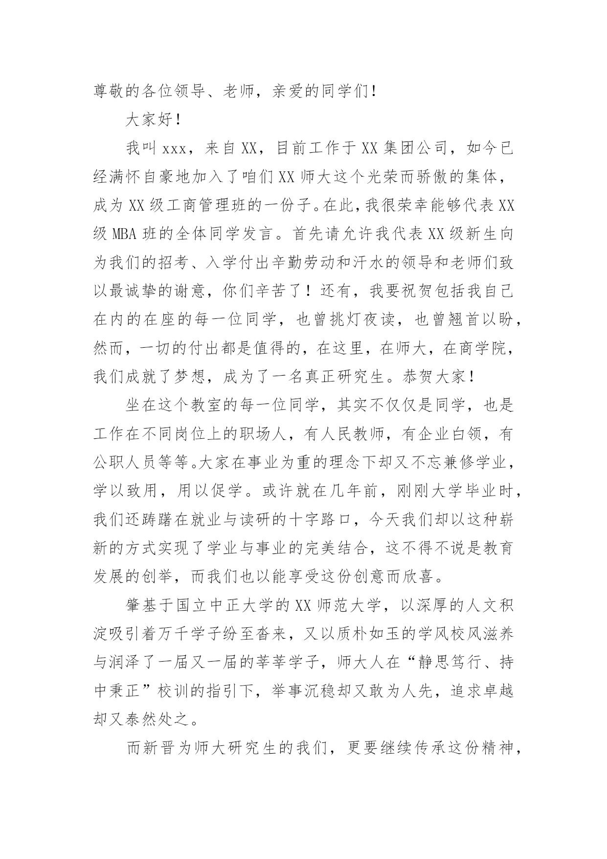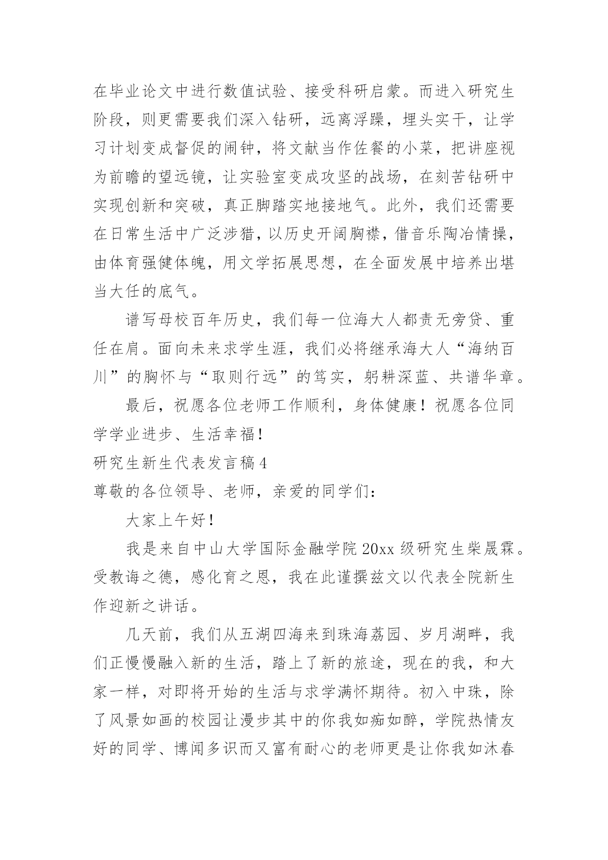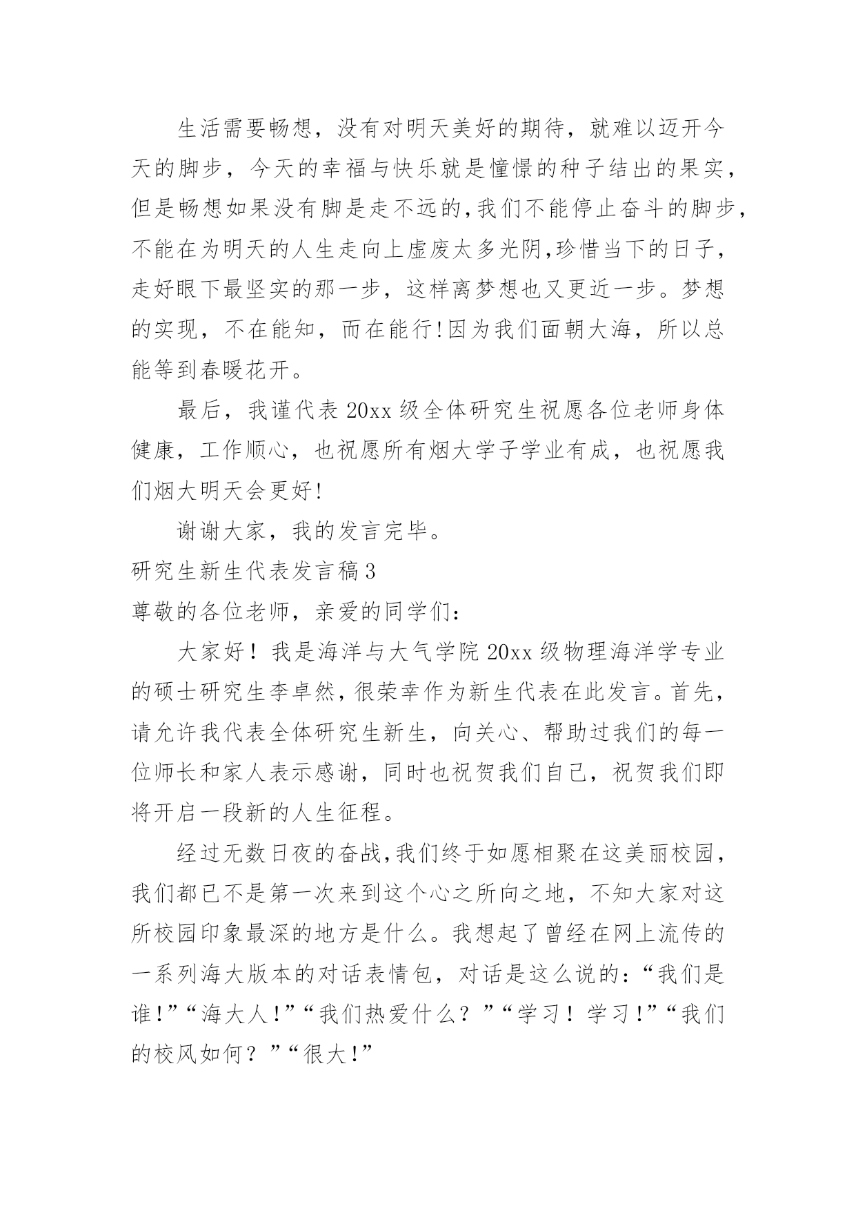 研究生新生代表发言稿研究生新生代表发言稿在不断进步的社会中,接触并使用发言稿的人越来越多,发言稿要求内容充实,条理清楚,重点突出。相信许多人会觉得发言稿很难写吧,以下是小编为大家整理的研究生新生代表发言稿,希望能够帮助到大家。研究生新生代表发言稿1尊敬的老师、亲爱的同学们:大家好!开学了,新的开始,也是意味着我们要去继续的学习,而我作为研究生被老师认可,选为代表而在这发言,我也是特别的荣幸,四年的学习结束,我开始也是以为自己可能会选择去到社会工作,但是最终我还是选择了读研,我想继续的努力,去学到更多,去让自己准备是更加充分的。无论我们身处在哪一个阶段,其实我们都是要以学习为第一要务,在学校的日子其实真的值得我们去珍惜,回想起来,我进入大学其实也是没有多长的时间,四年过得很快,同时也是很充实,没有去浪费掉,也是让我更加的明白学习的重要性,也是自己学的更多更是明白我们自己的能力其实进步的空间很大,优秀的人特别的多,但也是要更努力,才能让自己收获更大,而进入到研究生的阶段,我也是要跟着导师去做好自己的学习,去让自己在这个专业里面收获到更多。新的开始,也是意味着我们又是处于同一个起跑线上,以前的学习怎么样,我们是已经改变不了了,但是今后的学习,我们确是可以去把握住的,上课要听好讲笔记也是要做好,课后要多去思考,多去对自己的学习做一些回想,来让这学习真的学透才行的。新的学期,我想我们也是有很多的问题,有很多的疑惑要来问老师,也是希望能找老师这得到解答,但是同时作为研究生,我也是明白,很多的问题要靠自己的思考,这样才能更好的锻炼我们的能力。同时既然是研究生,对于这个专业也是要有自己的思考,而不仅仅只是去学习前人的知识而已,这也是我们来读研究生的一个目的,去让自己的想法得到实现才行的。同学们,我们一起努力,或许学习的路途中有很多的困难,或许我们不是那么容易坚持下去,但是我们同样也是需要去努力,要靠自己的能力去收获,去成长,去有自己的成就才行的。我也是不会让老师失望,同时自己也是要多去了解自身,去学好,去锻炼,成长的过程之中会有很多的问题,但是只要我们一一的去解决,那么我们就是成长了,就会让自己的未来更为光明,同学们,让我们一起来努力,去把书读好,多一些思考,让我们的研究生学习生涯更加的充实。谢谢!研究生新生代表发言稿2尊敬的各位老师,亲爱的同学们:大家上午好!我是生命科学学院20xx级研究生李锐,很荣幸能够作为新生代表发言。首先请允许我代表20xx级全体研究生对一直为我们默默付出的老师和家长表示感谢。去年六月,我们带着一纸毕业证书离开校园,列车滚滚前行带着相同的教育理念驶向四面八方,梦想也伴着汗水在不同的土地上慢慢生根发芽。而现在,我们因为手里的录取通知书,带着满怀的向往和期盼汇聚在烟台大学,开始一段新的追梦之旅。四年前,我带着好奇与憧憬开始了我美好的本科学习生涯。第一次离家千里,第一次在火车上过夜,第一次经历学生会面试,第一次组织团日活动,第一次和四个班的人一起上课……本科时间总是匆匆而过,也有许多美好在不经意间错过,所以作为一名研究生,也希望学弟学妹们珍惜大学四年,守信求实,好学力行,多走,多学,多听,多看,多交流,当离开校园的列车驶向下一个地方的时候能够有骄傲的故事可以说。与本科生活相比,研究生生活也将更加充实多彩。从今天开始,我将是烟台大学一名20xx级研究生,和在座很多同学一样,我对即将开始的学习和生活充满期待。我想象着每天教室,宿舍图书馆连成一线,想象着在操场上将奔跑的足迹画成一道弧线,想象着在实验室感受科研的魅力,想象着在学生组织中发现另一个自己,想象着在科研大赛中挑战自己。在烟台大学,有美丽的校园环境,浓厚的学术氛围,面对更高的平台,我们必须再接再厉。接下来的研究生生活我们需要做到:第一,明确目标,自主创新。研究生阶段要对自己有更高的学习要求,除了树立明确的专业目标,更需要我们注重自主性和创新性。知识的积累是为创新提供基础,实验是为探索未知提供路径。我们要怀揣学术探究的热情与好奇,更加主动地去学习、去发现,在学术领域内积极探索、刻苦钻研。第二,博采众长,厚积薄发。烟大拥有一只充满活力的高水平师资队伍,每一位老师的个人魅力都值得我们慢慢品味与认真学习。身边的同学也是各有所长,去发现周边同学的闪光点,取长补短,遇见更好的自己。第三,修身立德,志存高远。作为研究生,我们不但要加强学术修养,更要加强道德修养,要把修身立德作为一生的功课。只要我们每个人都守信求实,社会就不会虚伪;只要我们每个人都好学力行,社会就能充满希望。作为一名烟大人,我们不能被眼前的功利和浮躁误导,而是要树立高远的人生志向,将知识转变为推动社会前进的力量。当然,科研的道路并非一路平坦,需要不断的寻找与探索,年轻的我们总会遇到未知与挑战,生活便是寻求新的知识,面
