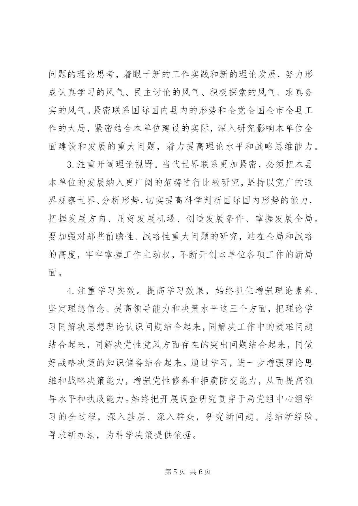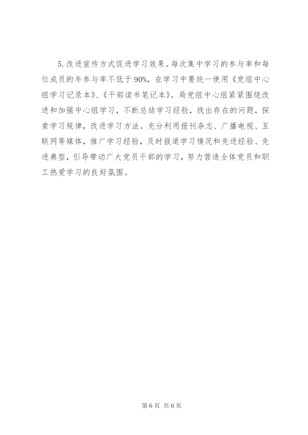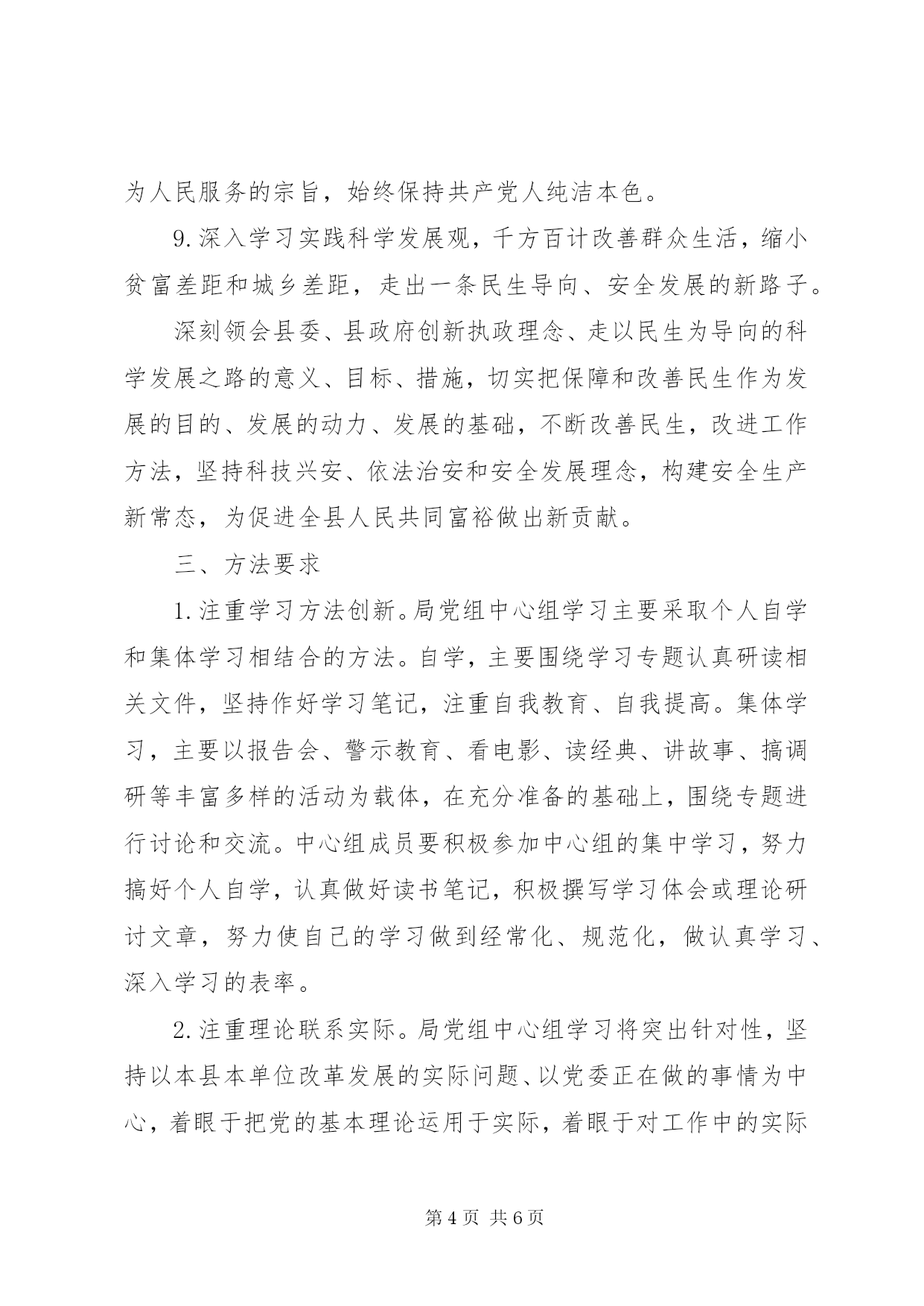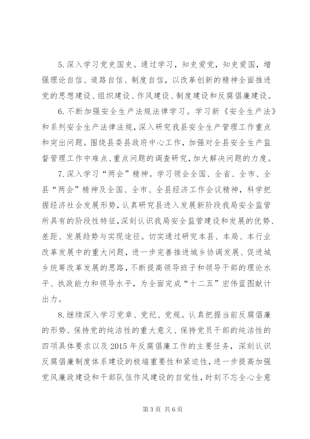 第PAGE\*Arabic\*MERGEFORMAT6页共NUMPAGES\*MERGEFORMAT6页XX年安监理论学习计划2015年,是全面贯彻落实党的十八大、十八届三中四中全会精神的重要一年,是全面深化改革的关键之年,是全面推进法治建设的开局之年,也是全面完成“十二五”规划的收官之年。局党组中心组理论学习紧紧围绕中央、省委、市委、县委的工作部署和重大决策展开,进一步提高党员干部的理论水平和科学分析、解决实际问题的能力,积极深化学习型党组织建设。现提出今年局党组中心组理论学习计划如下:一、指导思想以深入学习习近平总书记系列讲话精神,全面贯彻落实党的十八届三、四中全会、省、市、县委重要会议精神为主要内容,高举中国特色社会主义伟大旗帜,全面系统学习和掌握中国特色社会主义理论体系,弘扬理论联系实际的马克思主义学风,不断提高学习能力、创新能力和工作能力,引领局党组学习型党组织建设向纵深发展,为我局坚持走民生导向、安全发展、科技兴安、依法治安路子提供理论支撑和智力支持。二、学习内容1.深入学习习近平总书记系列讲话精神。深刻把握习近平总书记讲话所贯穿的立场观点方法,以坚持和发展中国特色社会主义、实现中华民族伟大复兴的中国梦、全面深化改革、推动科学发展、社会主义民主政治和依法治国、宣传思想工作、党的建设七个专题为学习要点,更好地用讲话精神武装头脑、指导实践、推动工作。2.认真学习领会党的十八届三、四中全会精神。把思想和行动统一到中央对形势的战略判断和决策部署上来,学习省、市委、县委政府会议精神,进一步认清形势、统一思想、明确任务,努力推动安全生产工作科学发展跨越发展。3.认真学习各级领导关于党的群众路线教育实践活动重要讲话精神。抓好党的群众路线教育实线活动成果巩固工作,切实增强思想自觉和行动自觉,认真抓好整改落实“回头看”和建立长效制度工作,以严的标准、严的措施、严的纪律坚决反对“四风”,推动思想认识进一步提高、作风进一步转变、党群干群关系进一步密切、为民务实清廉形象进一步树立。4.认真学习中央、省、市、县纪委全会精神。通过学习,深入领会、准确掌握、切实贯彻中央关于党风廉政建设和反腐败斗争的基本理念、总体思路和工作部署。把学习贯彻十八届中央纪委五次全会精神和学习贯彻习近平总书记系列讲话精神结合起来,自觉把思想行动统一到党中央对党风廉政建设和反腐败斗争的形势判断和任务部署上来,充分认识党风廉政建设和反腐败斗争的长期性、复杂性、艰巨性,坚持党要管党、从严治党,严明党的各项纪律,坚持不懈纠正“四风”,在局系统营造风清气正的良好氛围。5.深入学习党史国史。通过学习,知史爱党,知史爱国,增强理论自信、道路自信、制度自信,以改革创新的精神全面推进党的思想建设、组织建设、作风建设、制度建设和反腐倡廉建设。6.不断加强安全生产法规法律学习。学习新《安全生产法》和系列安全生产法律法规,深入研究我县安全生产管理工作重点和突出问题。围绕县委县政府中心工作,加强对全县安全生产监督管理工作中难点、重点问题的调查研究,加大解决问题的力度。7.深入学习“两会”精神。学习领会全国、全省、全市、全县“两会”精神及全国、全市、全县经济工作会议精神,科学把握经济社会发展形势,认真研究县进入发展新阶段我局安全监管所具有的阶段性特征,深刻认识我局安全监管建设和发展的优势、差距、发展趋势与实现途径。切实通过研究本县、本局、本行业改革发展中的重大问题,进一步完善推进城乡协调发展、促进城乡统筹改革发展的思路,不断提高领导班子和领导干部的理论水平、执政能力和领导水平,为全面完成“十二五”宏伟蓝图献计出力。8.继续深入学习党章、党纪、党规。认真把握当前反腐倡廉的形势、保持党的纯洁性的重大意义、保持党员干部的纯洁性的四项具体要求以及2015年反腐倡廉工作的主要任务,深刻认识反腐倡廉制度体系建设的极端重要性和紧迫性,进一步提高加强党风廉政建设和干部队伍作风建设的自觉性,时刻不忘全心全意为人民服务的宗旨,始终保持共产党人纯洁本色。9.深入学习实践科学发展观,千方百计改善群众生活,缩小贫富差距和城乡差距,走出一条民生导向、安全发展的新路子。深刻领会县委、县政府创新执政理念、走以民生为导向的科学发展之路的意义、目标、措施,切实把保障和改善民生作为发展的目的、发展的动力、发展的基础,不断改善民生,改进工作方法,坚持科技兴安、依法治安和安全发展理念,构建安全生产新常态,为促进全县人民共同富裕做出新贡献。三、方法要求1.注重学习方法创新。局党组中心组学习主要采取个人自学和集体学习相结合的方法。自学,主要围绕学习专题认真研读相关文件,坚持作好学习笔记,注重自我教育、自我提高。集体学习,主要以报告会、警示教育、看电影、读经典、讲故事、搞调研等丰富多样的活动为载体,在充分准备的基础上
