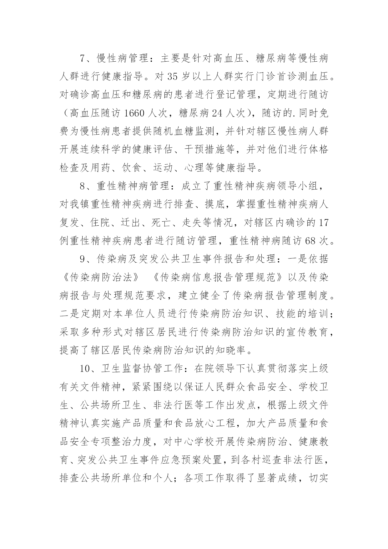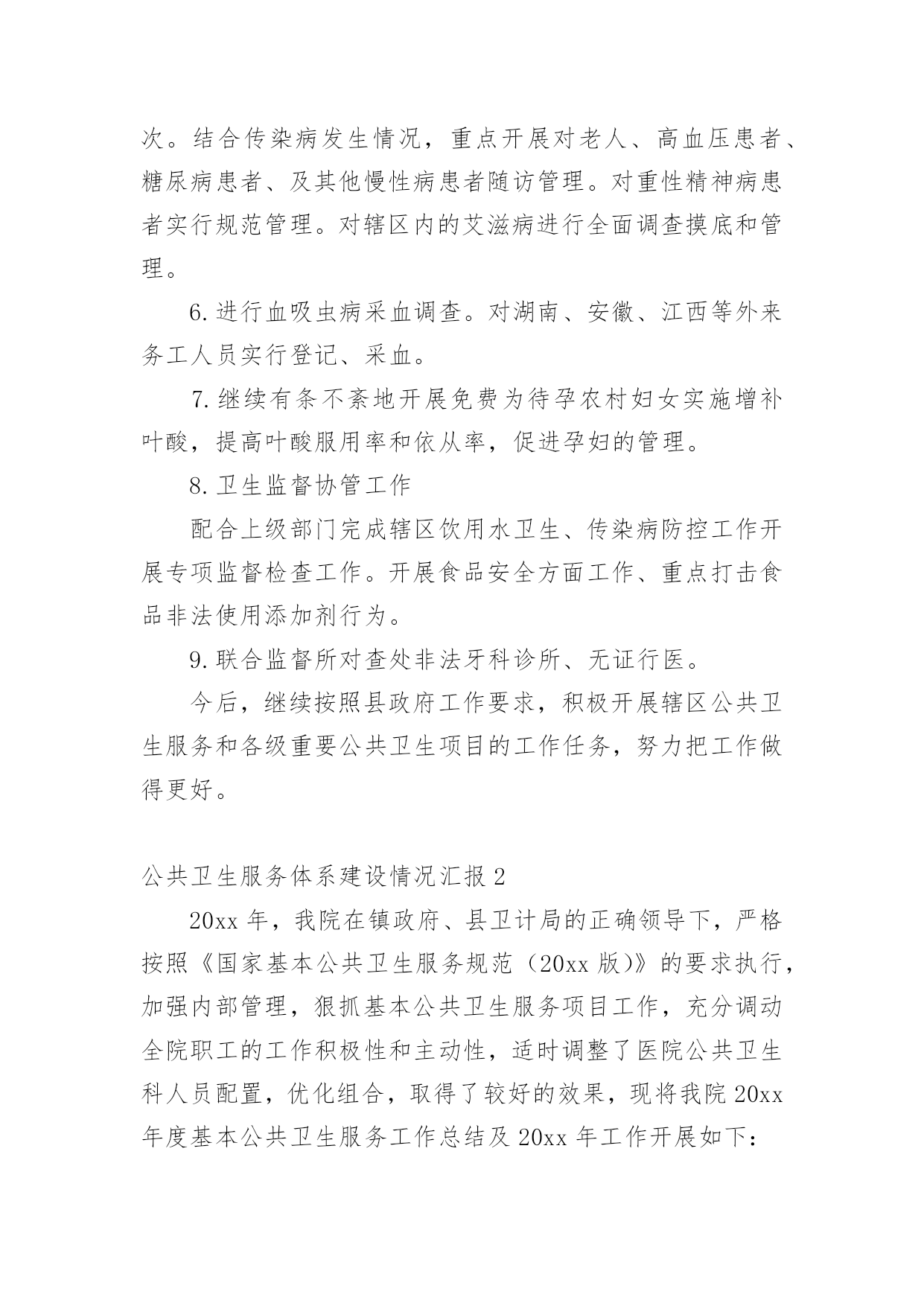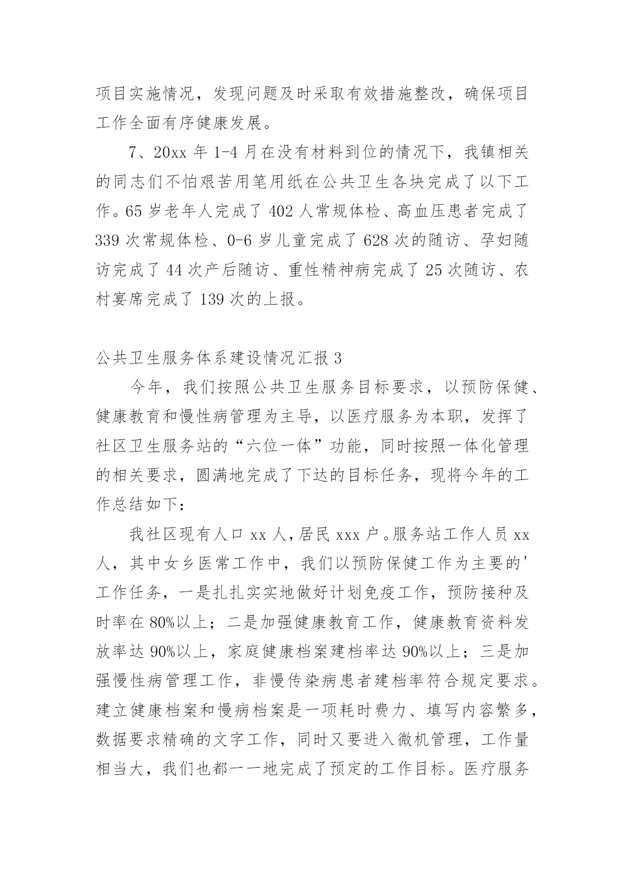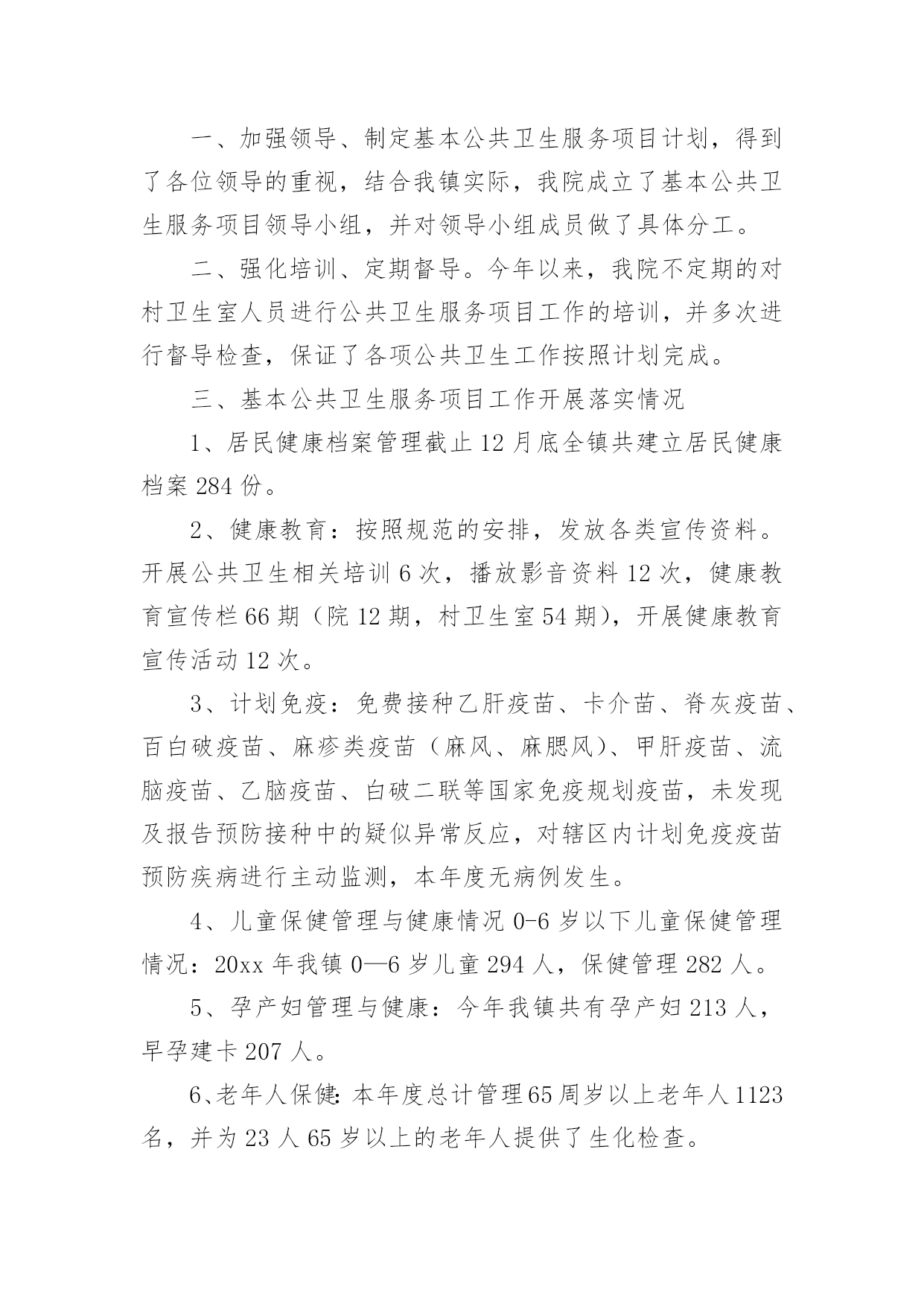 公共卫生服务体系建设情况汇报无论是在学校还是在社会中,用到汇报的地方越来越多,汇报是将某个项目的工作情况和工作结果向领导进行汇报,但是,每次要写汇报的时候都无从下手?以下是小编为大家收集的公共卫生服务体系建设情况汇报,仅供参考,希望能够帮助到大家。公共卫生服务体系建设情况汇报1王宅镇卫生工作,划分责任服务区。一年来,根据制定的年度工作目标计划,主要做了以下工作:1.根据卫生院干部人员变动等的情况,及时调整卫生管理领导小组组织。对社区责任医生实行全新的'“网格化管理,组团式服务”,全科医生签约服务。落实责任,开展工作。2.做好第四轮参合人员健康体检工作。成立领导小组,下设办公室。对新型农村合作医疗60岁以上老人和20xx年度未参加第四轮农民体检的18-60岁的人群。中小学生、儿童等对象。3.社区卫生服务方面。按照站建设计划,开展正常服务4.在完成王宅中心卫生院辅助用房建设,投入使用后,进行门面和围墙改造工程,现已基本完成建设任务。5.公共卫生方面。开展健康教育,并对卫生联络员作及时培训,邀请有关的领导和专业技术人员讲课。开展咨询6次。结合传染病发生情况,重点开展对老人、高血压患者、糖尿病患者、及其他慢性病患者随访管理。对重性精神病患者实行规范管理。对辖区内的艾滋病进行全面调查摸底和管理。6.进行血吸虫病采血调查。对湖南、安徽、江西等外来务工人员实行登记、采血。7.继续有条不紊地开展免费为待孕农村妇女实施增补叶酸,提高叶酸服用率和依从率,促进孕妇的管理。8.卫生监督协管工作配合上级部门完成辖区饮用水卫生、传染病防控工作开展专项监督检查工作。开展食品安全方面工作、重点打击食品非法使用添加剂行为。9.联合监督所对查处非法牙科诊所、无证行医。今后,继续按照县政府工作要求,积极开展辖区公共卫生服务和各级重要公共卫生项目的工作任务,努力把工作做得更好。公共卫生服务体系建设情况汇报220xx年,我院在镇政府、县卫计局的正确领导下,严格按照《国家基本公共卫生服务规范(20xx版)》的要求执行,加强内部管理,狠抓基本公共卫生服务项目工作,充分调动全院职工的工作积极性和主动性,适时调整了医院公共卫生科人员配置,优化组合,取得了较好的效果,现将我院20xx年度基本公共卫生服务工作总结及20xx年工作开展如下:一、加强领导、制定基本公共卫生服务项目计划,得到了各位领导的重视,结合我镇实际,我院成立了基本公共卫生服务项目领导小组,并对领导小组成员做了具体分工。二、强化培训、定期督导。今年以来,我院不定期的对村卫生室人员进行公共卫生服务项目工作的培训,并多次进行督导检查,保证了各项公共卫生工作按照计划完成。三、基本公共卫生服务项目工作开展落实情况1、居民健康档案管理截止12月底全镇共建立居民健康档案284份。2、健康教育:按照规范的安排,发放各类宣传资料。开展公共卫生相关培训6次,播放影音资料12次,健康教育宣传栏66期(院12期,村卫生室54期),开展健康教育宣传活动12次。3、计划免疫:免费接种乙肝疫苗、卡介苗、脊灰疫苗、百白破疫苗、麻疹类疫苗(麻风、麻腮风)、甲肝疫苗、流脑疫苗、乙脑疫苗、白破二联等国家免疫规划疫苗,未发现及报告预防接种中的疑似异常反应,对辖区内计划免疫疫苗预防疾病进行主动监测,本年度无病例发生。4、儿童保健管理与健康情况0-6岁以下儿童保健管理情况:20xx年我镇0—6岁儿童294人,保健管理282人。5、孕产妇管理与健康:今年我镇共有孕产妇213人,早孕建卡207人。6、老年人保健:本年度总计管理65周岁以上老年人1123名,并为23人65岁以上的老年人提供了生化检查。7、慢性病管理:主要是针对高血压、糖尿病等慢性病人群进行健康指导。对35岁以上人群实行门诊首诊测血压。对确诊高血压和糖尿病的患者进行登记管理,定期进行随访(高血压随访1660人次,糖尿病24人次),随访的.同时免费为慢性病患者提供随机血糖监测,并针对辖区慢性病人群开展连续科学的健康评估、干预措施等,并对他们进行体格检查及用药、饮食、运动、心理等健康指导。8、重性精神病管理:成立了重性精神疾病领导小组,对我镇重性精神疾病进行排查、摸底,掌握重性精神疾病人复发、住院、迁出、死亡、走失等情况,对辖区内确诊的17例重性精神疾病患者进行随访管理,重性精神病随访68次。9、传染病及突发公共卫生事件报告和处理:一是依据《传染病防治法》《传染病信息报告管理规范》以及传染病报告与处理规范要求,建立健全了传染病报告管理制度。二是定期对本单位人员进行传染病防治知识、技能的培训;采取多种形式对辖区居民进行传染病防治知识的宣传教育,提高了辖区居民传染病防治知识的知晓率。10、卫生监督协管工作:在院领导下认真贯彻落实上级有关文件精神,紧紧围绕以保证人民群众食品安全、学校卫生、公共场所卫生、
