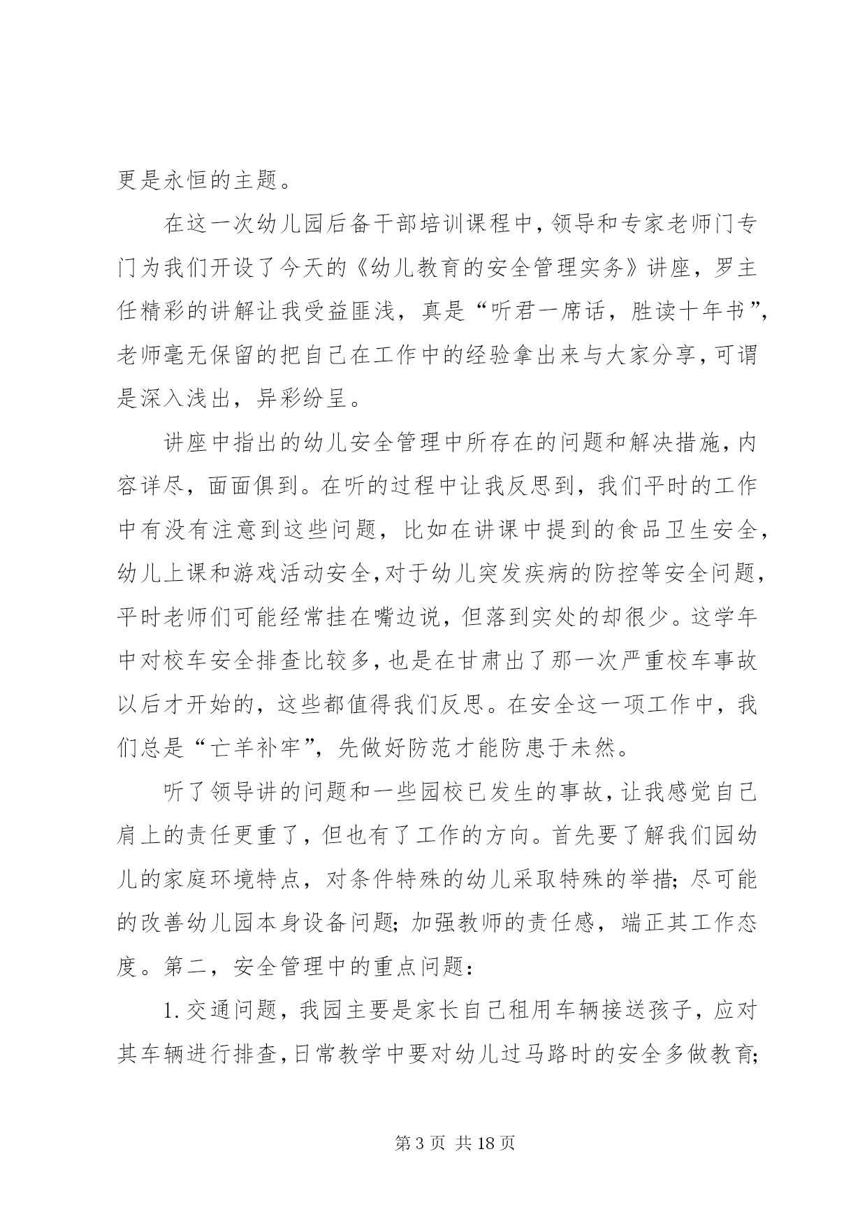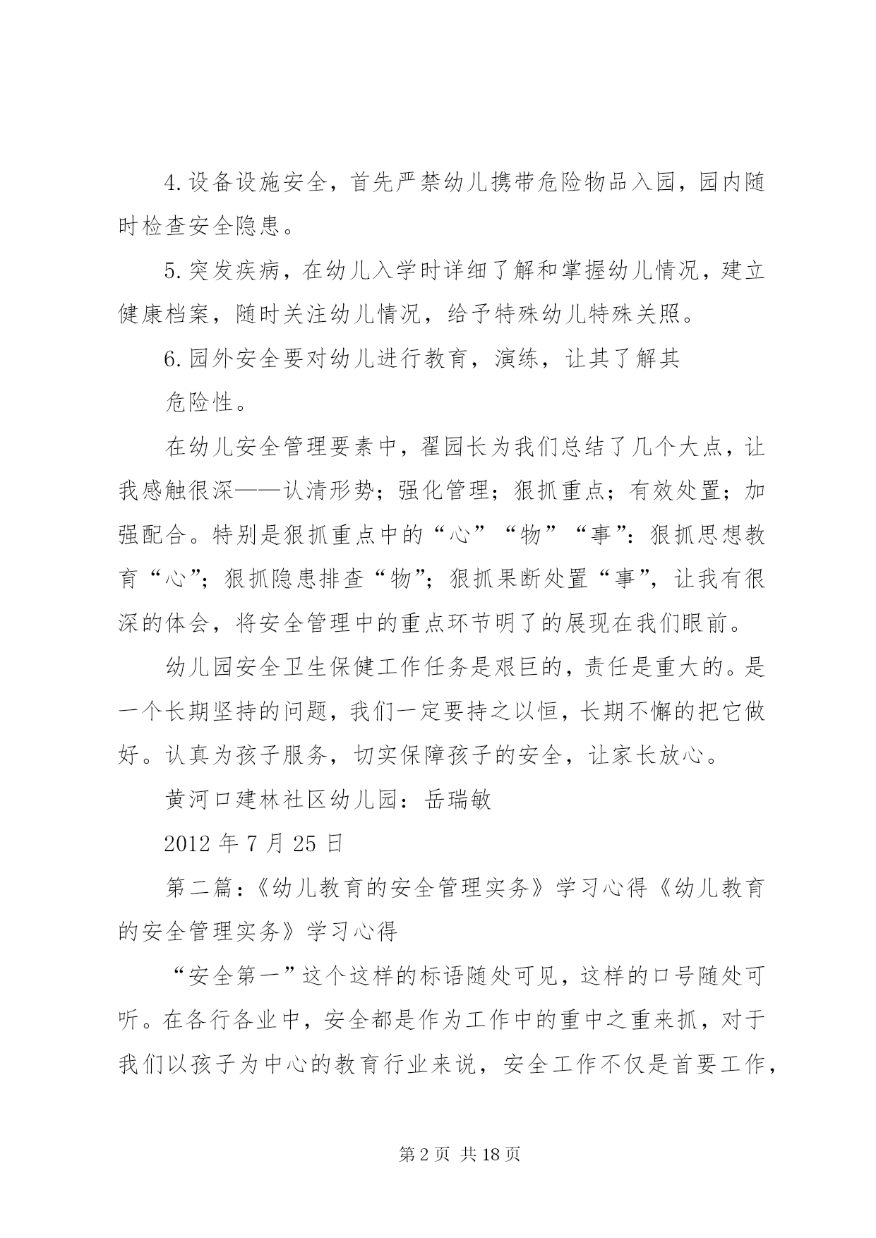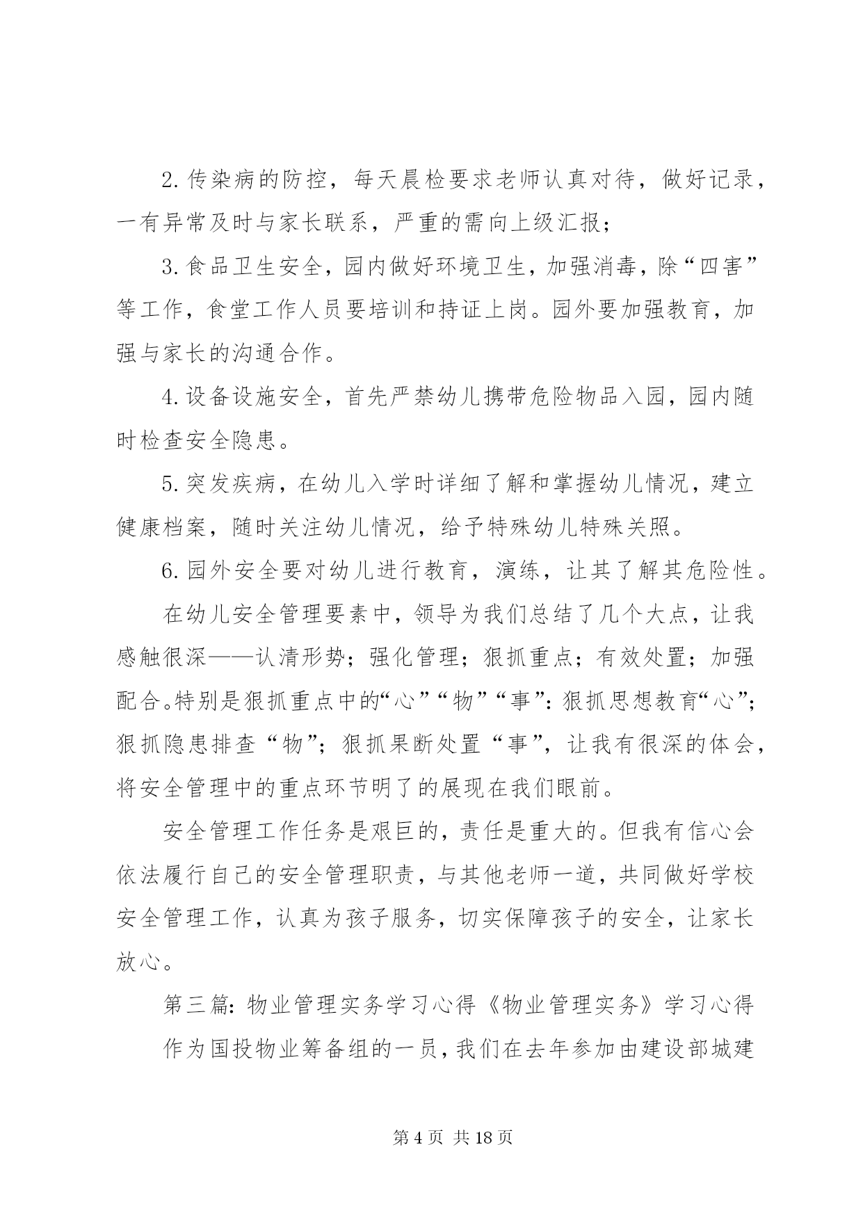 第PAGE\*Arabic\*MERGEFORMAT18页共NUMPAGES\*MERGEFORMAT18页《幼儿教育的安全管理实务》学习心得“安全第一”这样的标语随处可见,这样的口号随处可听。在各行各业中,安全都是作为工作中的重中之重来抓,对于我们以孩子为中心的教育行业来说,安全工作不仅是首要工作,更是永恒的主题。翟园长讲座中指出的幼儿安全管理中所存在的问题和解决措施,内容详尽,面面俱到。在听的过程中让我反思到,我们平时的工作中有没有注意到这些问题,比如在讲课中提到的食品卫生安全,幼儿上课和游戏活动安全,对于幼儿突发疾病的防控等安全问题,平时老师们可能经常挂在嘴边说,但落到实处的却很少。听了领导讲的问题和一些园校已发生的事故,让我感觉自己肩上的责任更重了,但也有了工作的方向。首先要了解我们园幼儿的家庭环境特点,对条件特殊的幼儿采取特殊的举措;尽可能的改善幼儿园本身设备问题;加强教师的责任感,端正其工作态度。第二,安全管理中的重点问题:1、日常教学中要对幼儿过马路时的安全多做教育;2.传染病的防控,每天晨检要求老师认真对待,做好记录,一有异常及时与家长联系,严重的需向上级汇报;3.食品卫生安全,园内做好环境卫生,加强消毒,除“四害”等工作,食堂工作人员要培训和持证上岗。园外要加强教育,加强与家长的沟通合作。4.设备设施安全,首先严禁幼儿携带危险物品入园,园内随时检查安全隐患。5.突发疾病,在幼儿入学时详细了解和掌握幼儿情况,建立健康档案,随时关注幼儿情况,给予特殊幼儿特殊关照。6.园外安全要对幼儿进行教育,演练,让其了解其危险性。在幼儿安全管理要素中,翟园长为我们总结了几个大点,让我感触很深——认清形势;强化管理;狠抓重点;有效处置;加强配合。特别是狠抓重点中的“心”“物”“事”:狠抓思想教育“心”;狠抓隐患排查“物”;狠抓果断处置“事”,让我有很深的体会,将安全管理中的重点环节明了的展现在我们眼前。幼儿园安全卫生保健工作任务是艰巨的,责任是重大的。是一个长期坚持的问题,我们一定要持之以恒,长期不懈的把它做好。认真为孩子服务,切实保障孩子的安全,让家长放心。黄河口建林社区幼儿园:岳瑞敏2012年7月25日第二篇:《幼儿教育的安全管理实务》学习心得《幼儿教育的安全管理实务》学习心得“安全第一”这个这样的标语随处可见,这样的口号随处可听。在各行各业中,安全都是作为工作中的重中之重来抓,对于我们以孩子为中心的教育行业来说,安全工作不仅是首要工作,更是永恒的主题。在这一次幼儿园后备干部培训课程中,领导和专家老师门专门为我们开设了今天的《幼儿教育的安全管理实务》讲座,罗主任精彩的讲解让我受益匪浅,真是“听君一席话,胜读十年书”,老师毫无保留的把自己在工作中的经验拿出来与大家分享,可谓是深入浅出,异彩纷呈。讲座中指出的幼儿安全管理中所存在的问题和解决措施,内容详尽,面面俱到。在听的过程中让我反思到,我们平时的工作中有没有注意到这些问题,比如在讲课中提到的食品卫生安全,幼儿上课和游戏活动安全,对于幼儿突发疾病的防控等安全问题,平时老师们可能经常挂在嘴边说,但落到实处的却很少。这学年中对校车安全排查比较多,也是在甘肃出了那一次严重校车事故以后才开始的,这些都值得我们反思。在安全这一项工作中,我们总是“亡羊补牢”,先做好防范才能防患于未然。听了领导讲的问题和一些园校已发生的事故,让我感觉自己肩上的责任更重了,但也有了工作的方向。首先要了解我们园幼儿的家庭环境特点,对条件特殊的幼儿采取特殊的举措;尽可能的改善幼儿园本身设备问题;加强教师的责任感,端正其工作态度。第二,安全管理中的重点问题:1.交通问题,我园主要是家长自己租用车辆接送孩子,应对其车辆进行排查,日常教学中要对幼儿过马路时的安全多做教育;2.传染病的防控,每天晨检要求老师认真对待,做好记录,一有异常及时与家长联系,严重的需向上级汇报;3.食品卫生安全,园内做好环境卫生,加强消毒,除“四害”等工作,食堂工作人员要培训和持证上岗。园外要加强教育,加强与家长的沟通合作。4.设备设施安全,首先严禁幼儿携带危险物品入园,园内随时检查安全隐患。5.突发疾病,在幼儿入学时详细了解和掌握幼儿情况,建立健康档案,随时关注幼儿情况,给予特殊幼儿特殊关照。6.园外安全要对幼儿进行教育,演练,让其了解其危险性。在幼儿安全管理要素中,领导为我们总结了几个大点,让我感触很深——认清形势;强化管理;狠抓重点;有效处置;加强配合。特别是狠抓重点中的“心”“物”“事”:狠抓思想教育“心”;狠抓隐患排查“物”;狠抓果断处置“事”,让我有很深的体会,将安全管理中的重点环节明了的展现在我们眼前。安全管理工作任务是艰巨的,责任是重大的。但我有信心会依法履行自己的安全管理职责,与其他老师一道,共同做好学