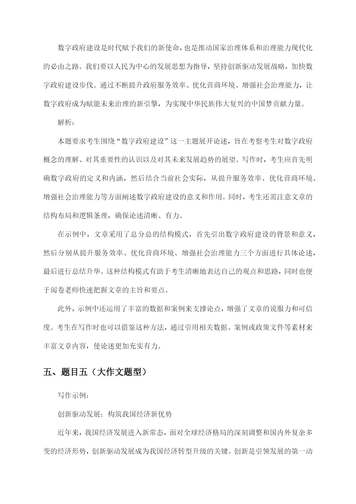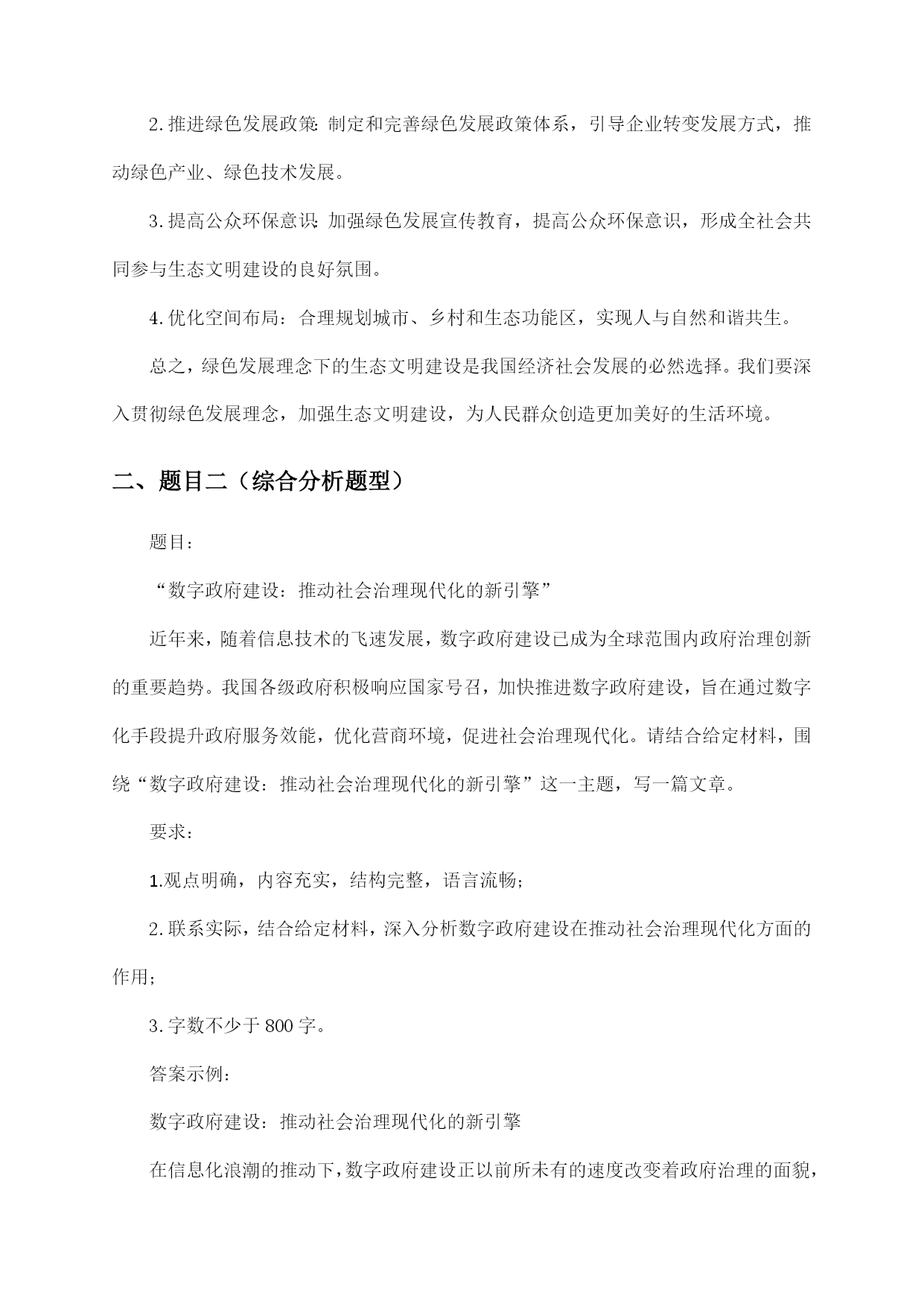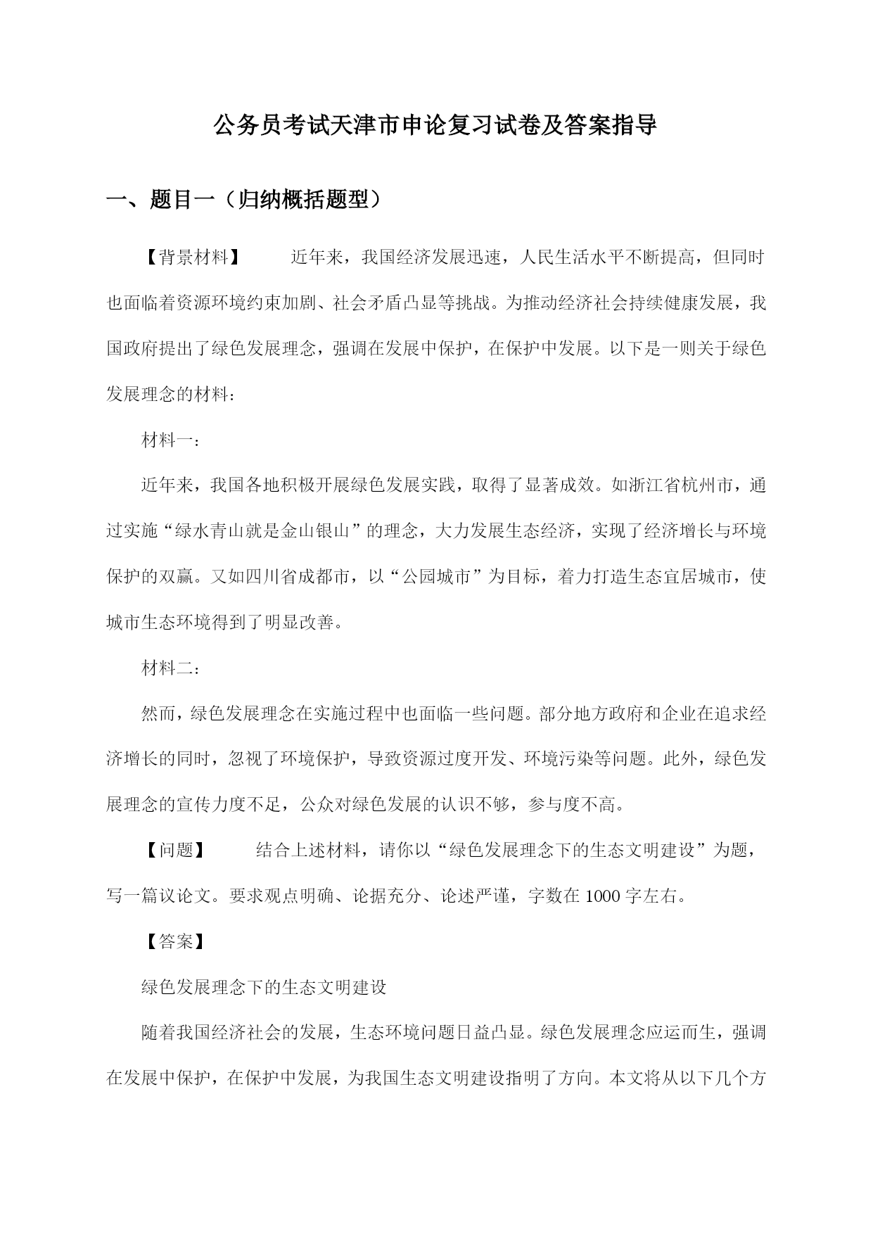 公务员考试天津市申论复习试卷及答案指导一、题目一(归纳概括题型)【背景材料】近年来,我国经济发展迅速,人民生活水平不断提高,但同时也面临着资源环境约束加剧、社会矛盾凸显等挑战。为推动经济社会持续健康发展,我国政府提出了绿色发展理念,强调在发展中保护,在保护中发展。以下是一则关于绿色发展理念的材料:材料一:近年来,我国各地积极开展绿色发展实践,取得了显著成效。如浙江省杭州市,通过实施“绿水青山就是金山银山”的理念,大力发展生态经济,实现了经济增长与环境保护的双赢。又如四川省成都市,以“公园城市”为目标,着力打造生态宜居城市,使城市生态环境得到了明显改善。材料二:然而,绿色发展理念在实施过程中也面临一些问题。部分地方政府和企业在追求经济增长的同时,忽视了环境保护,导致资源过度开发、环境污染等问题。此外,绿色发展理念的宣传力度不足,公众对绿色发展的认识不够,参与度不高。【问题】结合上述材料,请你以“绿色发展理念下的生态文明建设”为题,写一篇议论文。要求观点明确、论据充分、论述严谨,字数在1000字左右。【答案】绿色发展理念下的生态文明建设随着我国经济社会的发展,生态环境问题日益凸显。绿色发展理念应运而生,强调在发展中保护,在保护中发展,为我国生态文明建设指明了方向。本文将从以下几个方面论述绿色发展理念下的生态文明建设。一、绿色发展理念的内涵绿色发展理念是指在经济社会发展过程中,坚持节约资源和保护环境的基本国策,实现人与自然和谐共生,推动形成绿色发展方式和生活方式。具体包括以下几个方面:1.节约资源:倡导节约用水、用电、用气等,提高资源利用效率,减少资源浪费。2.保护环境:加强生态环境保护,治理污染,提高环境质量,保障人民群众的生态环境权益。3.绿色发展:发展绿色产业、绿色技术,推动产业结构优化升级,实现经济增长与环境保护的协调。4.绿色生活:倡导绿色出行、绿色消费等,提高公众环保意识,形成绿色生活方式。二、绿色发展理念在生态文明建设中的作用1.促进生态环境改善:绿色发展理念的实施,有助于减少污染排放,改善生态环境质量,为人民群众创造良好的生活环境。2.推动产业转型升级:绿色发展理念要求企业转变发展方式,提高资源利用效率,推动产业结构优化升级,培育新的经济增长点。3.提高人民群众生活质量:绿色发展理念关注人民群众的生活需求,通过改善生态环境、提高生活质量,增强人民群众的幸福感和获得感。4.促进全球可持续发展:绿色发展理念是我国对全球可持续发展的重要贡献,有助于推动全球生态文明建设。三、绿色发展理念下生态文明建设的路径1.加强法治建设:完善生态环境保护法律法规,加大对环境违法行为的查处力度,确保绿色发展理念的落实。2.推进绿色发展政策:制定和完善绿色发展政策体系,引导企业转变发展方式,推动绿色产业、绿色技术发展。3.提高公众环保意识:加强绿色发展宣传教育,提高公众环保意识,形成全社会共同参与生态文明建设的良好氛围。4.优化空间布局:合理规划城市、乡村和生态功能区,实现人与自然和谐共生。总之,绿色发展理念下的生态文明建设是我国经济社会发展的必然选择。我们要深入贯彻绿色发展理念,加强生态文明建设,为人民群众创造更加美好的生活环境。二、题目二(综合分析题型)题目:“数字政府建设:推动社会治理现代化的新引擎”近年来,随着信息技术的飞速发展,数字政府建设已成为全球范围内政府治理创新的重要趋势。我国各级政府积极响应国家号召,加快推进数字政府建设,旨在通过数字化手段提升政府服务效能,优化营商环境,促进社会治理现代化。请结合给定材料,围绕“数字政府建设:推动社会治理现代化的新引擎”这一主题,写一篇文章。要求:1.观点明确,内容充实,结构完整,语言流畅;2.联系实际,结合给定材料,深入分析数字政府建设在推动社会治理现代化方面的作用;3.字数不少于800字。答案示例:数字政府建设:推动社会治理现代化的新引擎在信息化浪潮的推动下,数字政府建设正以前所未有的速度改变着政府治理的面貌,成为推动社会治理现代化的重要力量。数字政府,简而言之,就是运用大数据、云计算、人工智能等现代信息技术手段,重塑政府治理结构,优化政府服务流程,提升政府治理效能的新型政府形态。一、数字政府建设提升政府服务效能数字政府通过构建一体化在线政务服务平台,实现了政务服务事项的“一网通办”和“跨省通办”,极大地便利了企业和群众办事。无论是企业注册、税务申报,还是个人社保查询、公积金提取,都可以通过手机APP或电脑终端轻松完成,有效解决了“办事难、办事慢、办事繁”的问题。这种高效便捷的政务服务,不仅提升了群众满意度,也增强了政府的公信力和执行力。二、数字政府建设优化营商环境营商环境是经济软实力的重要体现。数字政府