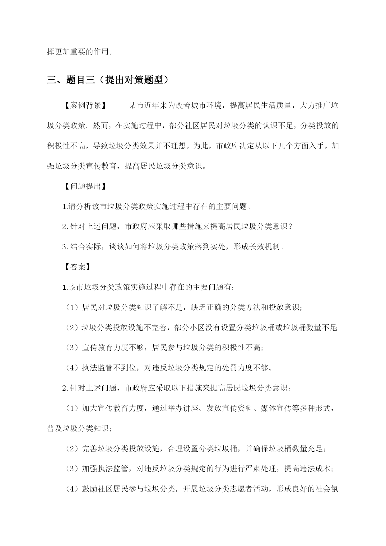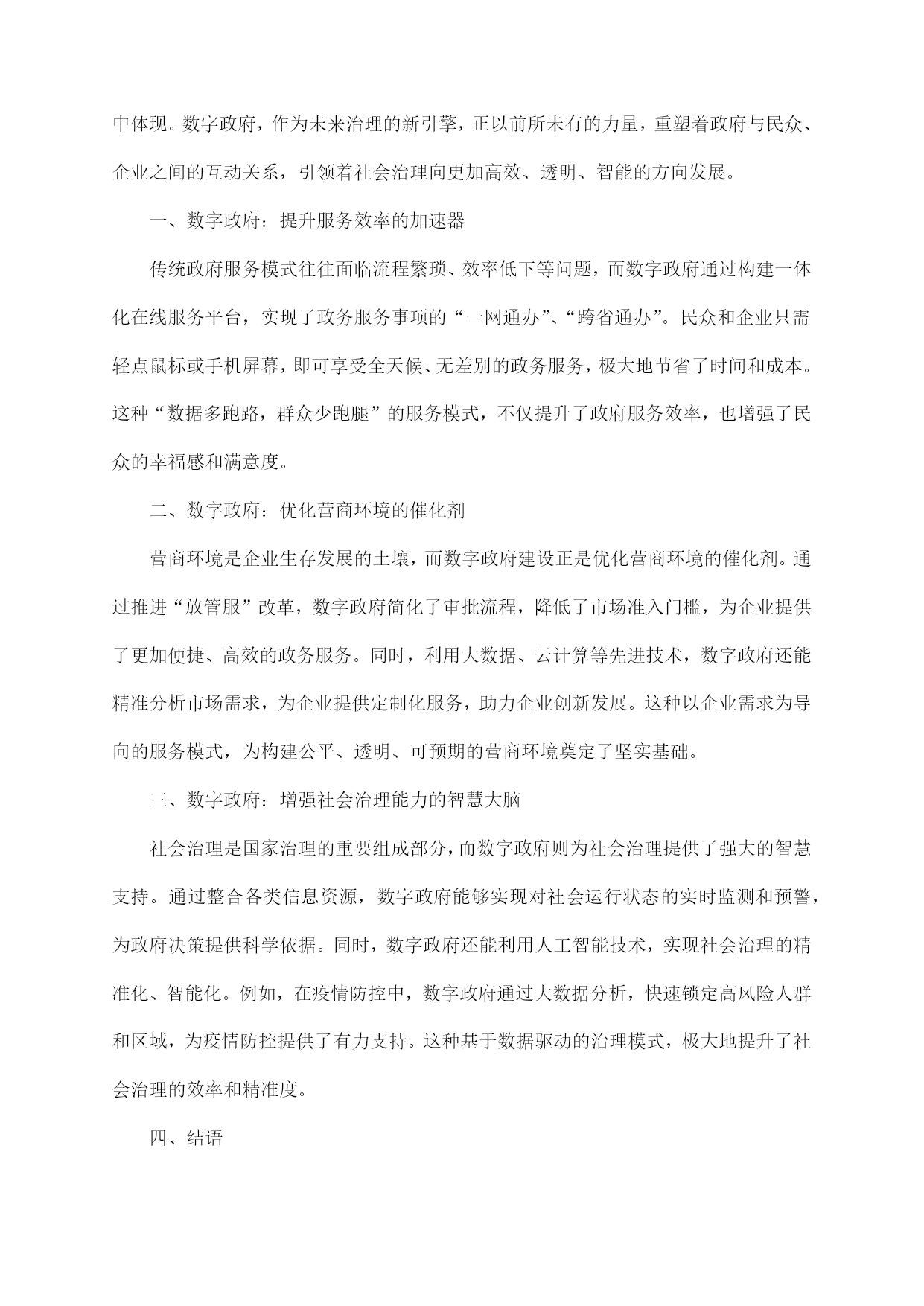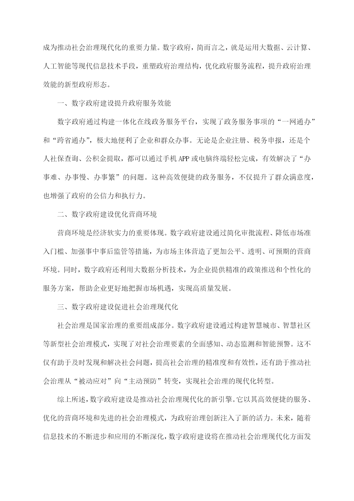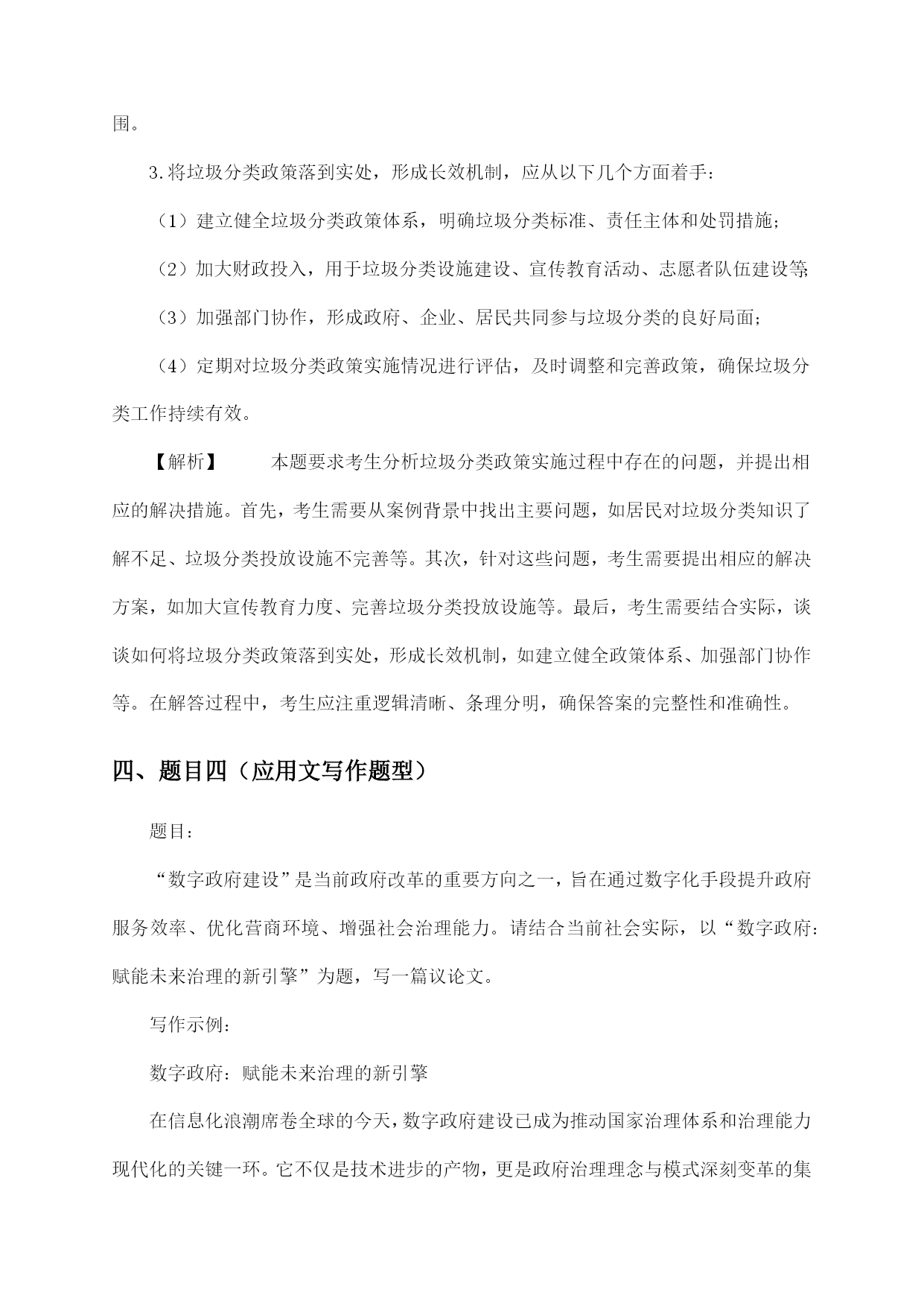 公务员考试天津市申论复习试卷及答案指导一、题目一(归纳概括题型)【背景材料】近年来,我国经济发展迅速,人民生活水平不断提高,但同时也面临着资源环境约束加剧、社会矛盾凸显等挑战。为推动经济社会持续健康发展,我国政府提出了绿色发展理念,强调在发展中保护,在保护中发展。以下是一则关于绿色发展理念的材料:材料一:近年来,我国各地积极开展绿色发展实践,取得了显著成效。如浙江省杭州市,通过实施“绿水青山就是金山银山”的理念,大力发展生态经济,实现了经济增长与环境保护的双赢。又如四川省成都市,以“公园城市”为目标,着力打造生态宜居城市,使城市生态环境得到了明显改善。材料二:然而,绿色发展理念在实施过程中也面临一些问题。部分地方政府和企业在追求经济增长的同时,忽视了环境保护,导致资源过度开发、环境污染等问题。此外,绿色发展理念的宣传力度不足,公众对绿色发展的认识不够,参与度不高。【问题】结合上述材料,请你以“绿色发展理念下的生态文明建设”为题,写一篇议论文。要求观点明确、论据充分、论述严谨,字数在1000字左右。【答案】绿色发展理念下的生态文明建设随着我国经济社会的发展,生态环境问题日益凸显。绿色发展理念应运而生,强调在发展中保护,在保护中发展,为我国生态文明建设指明了方向。本文将从以下几个方面论述绿色发展理念下的生态文明建设。一、绿色发展理念的内涵绿色发展理念是指在经济社会发展过程中,坚持节约资源和保护环境的基本国策,实现人与自然和谐共生,推动形成绿色发展方式和生活方式。具体包括以下几个方面:1.节约资源:倡导节约用水、用电、用气等,提高资源利用效率,减少资源浪费。2.保护环境:加强生态环境保护,治理污染,提高环境质量,保障人民群众的生态环境权益。3.绿色发展:发展绿色产业、绿色技术,推动产业结构优化升级,实现经济增长与环境保护的协调。4.绿色生活:倡导绿色出行、绿色消费等,提高公众环保意识,形成绿色生活方式。二、绿色发展理念在生态文明建设中的作用1.促进生态环境改善:绿色发展理念的实施,有助于减少污染排放,改善生态环境质量,为人民群众创造良好的生活环境。2.推动产业转型升级:绿色发展理念要求企业转变发展方式,提高资源利用效率,推动产业结构优化升级,培育新的经济增长点。3.提高人民群众生活质量:绿色发展理念关注人民群众的生活需求,通过改善生态环境、提高生活质量,增强人民群众的幸福感和获得感。4.促进全球可持续发展:绿色发展理念是我国对全球可持续发展的重要贡献,有助于推动全球生态文明建设。三、绿色发展理念下生态文明建设的路径1.加强法治建设:完善生态环境保护法律法规,加大对环境违法行为的查处力度,确保绿色发展理念的落实。2.推进绿色发展政策:制定和完善绿色发展政策体系,引导企业转变发展方式,推动绿色产业、绿色技术发展。3.提高公众环保意识:加强绿色发展宣传教育,提高公众环保意识,形成全社会共同参与生态文明建设的良好氛围。4.优化空间布局:合理规划城市、乡村和生态功能区,实现人与自然和谐共生。总之,绿色发展理念下的生态文明建设是我国经济社会发展的必然选择。我们要深入贯彻绿色发展理念,加强生态文明建设,为人民群众创造更加美好的生活环境。二、题目二(综合分析题型)题目:“数字政府建设:推动社会治理现代化的新引擎”近年来,随着信息技术的飞速发展,数字政府建设已成为全球范围内政府治理创新的重要趋势。我国各级政府积极响应国家号召,加快推进数字政府建设,旨在通过数字化手段提升政府服务效能,优化营商环境,促进社会治理现代化。请结合给定材料,围绕“数字政府建设:推动社会治理现代化的新引擎”这一主题,写一篇文章。要求:1.观点明确,内容充实,结构完整,语言流畅;2.联系实际,结合给定材料,深入分析数字政府建设在推动社会治理现代化方面的作用;3.字数不少于800字。答案示例:数字政府建设:推动社会治理现代化的新引擎在信息化浪潮的推动下,数字政府建设正以前所未有的速度改变着政府治理的面貌,成为推动社会治理现代化的重要力量。数字政府,简而言之,就是运用大数据、云计算、人工智能等现代信息技术手段,重塑政府治理结构,优化政府服务流程,提升政府治理效能的新型政府形态。一、数字政府建设提升政府服务效能数字政府通过构建一体化在线政务服务平台,实现了政务服务事项的“一网通办”和“跨省通办”,极大地便利了企业和群众办事。无论是企业注册、税务申报,还是个人社保查询、公积金提取,都可以通过手机APP或电脑终端轻松完成,有效解决了“办事难、办事慢、办事繁”的问题。这种高效便捷的政务服务,不仅提升了群众满意度,也增强了政府的公信力和执行力。二、数字政府建设优化营商环境营商环境是经济软实力的重要体现。数字政府