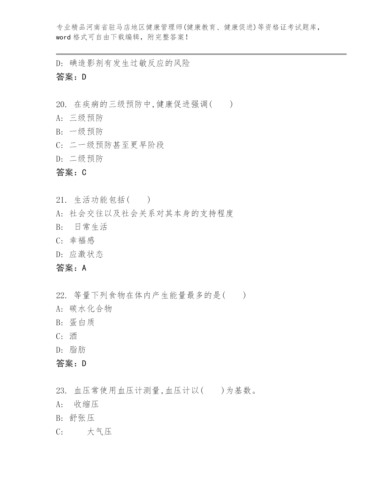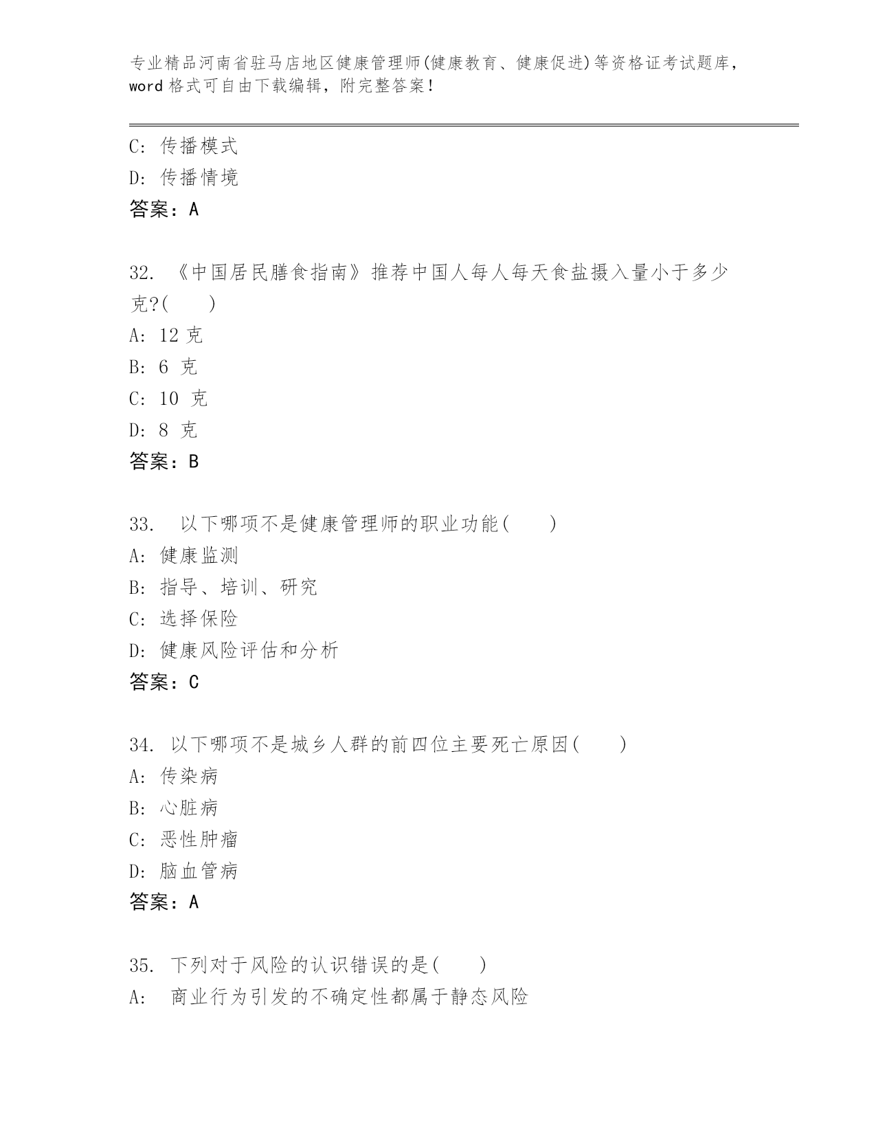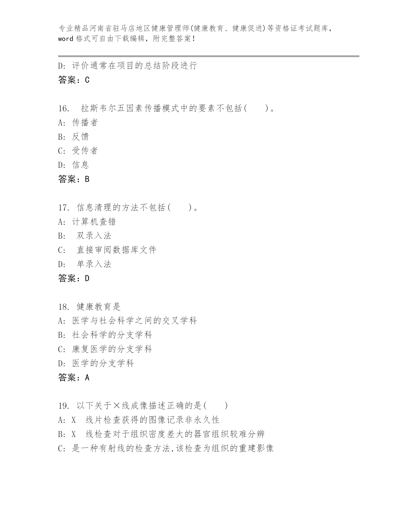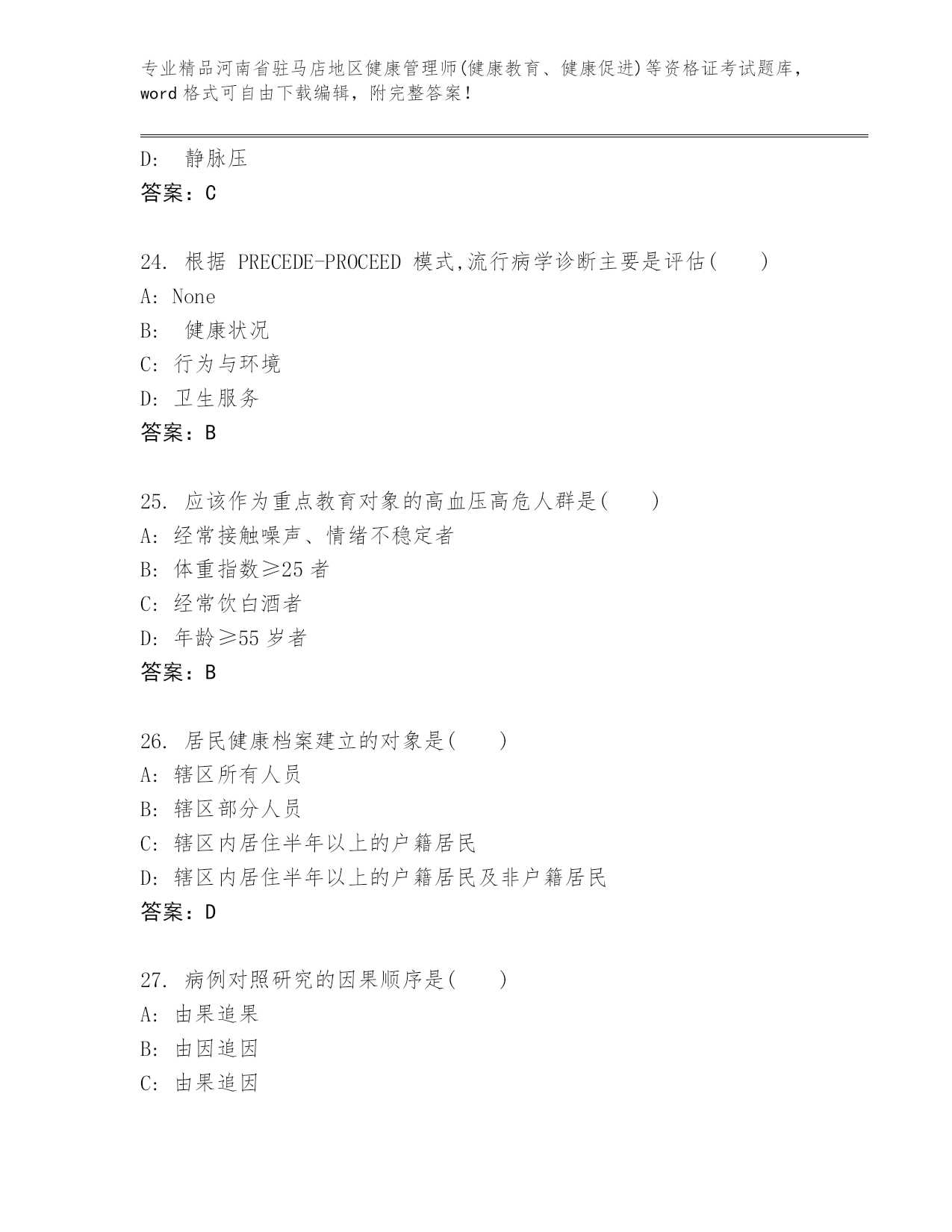 历年河南省驻马店地区健康管理师(健康教育、健康促进)等资格证考试真题题库(名师推荐)