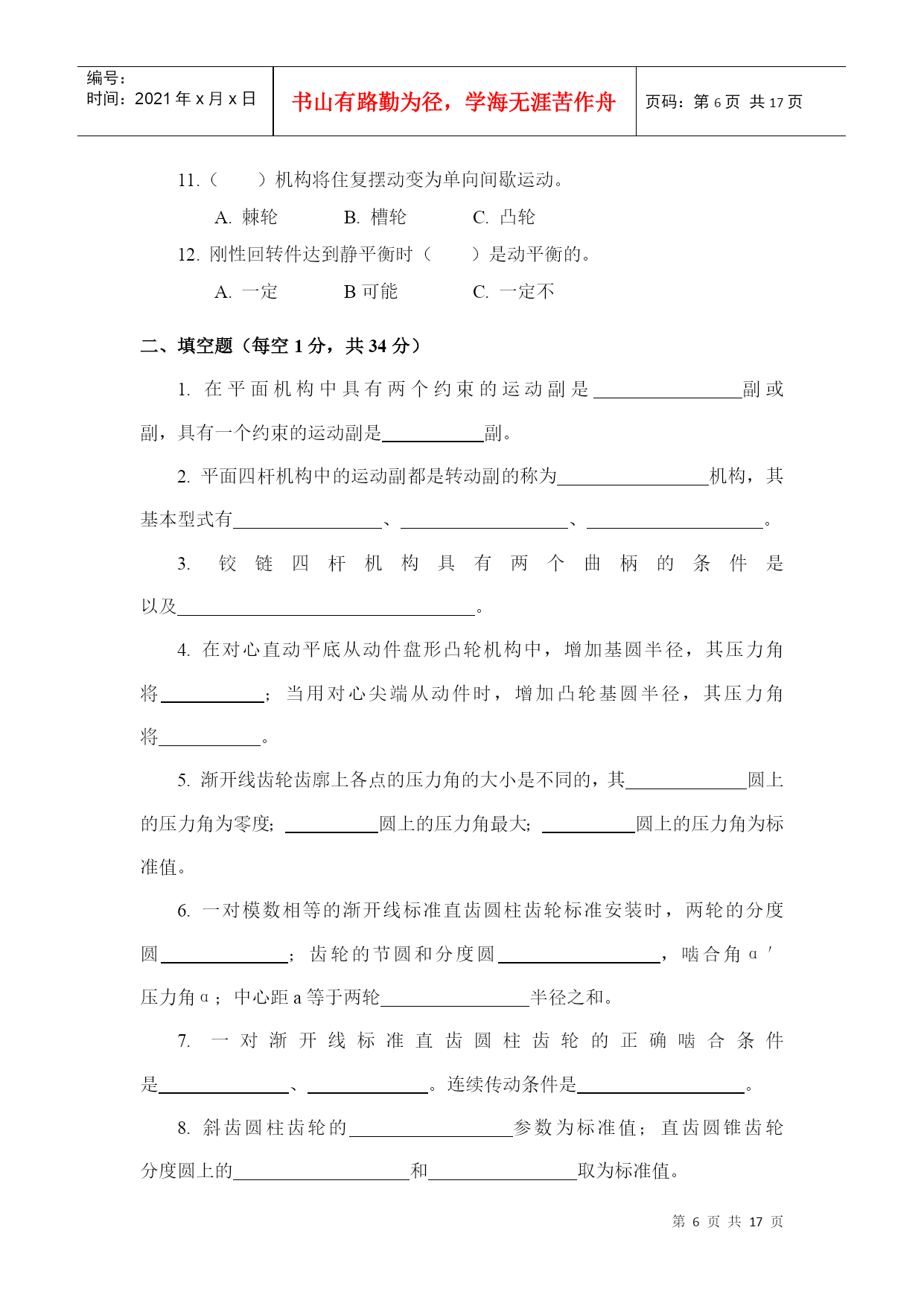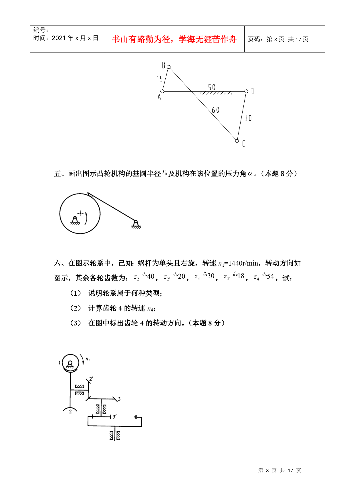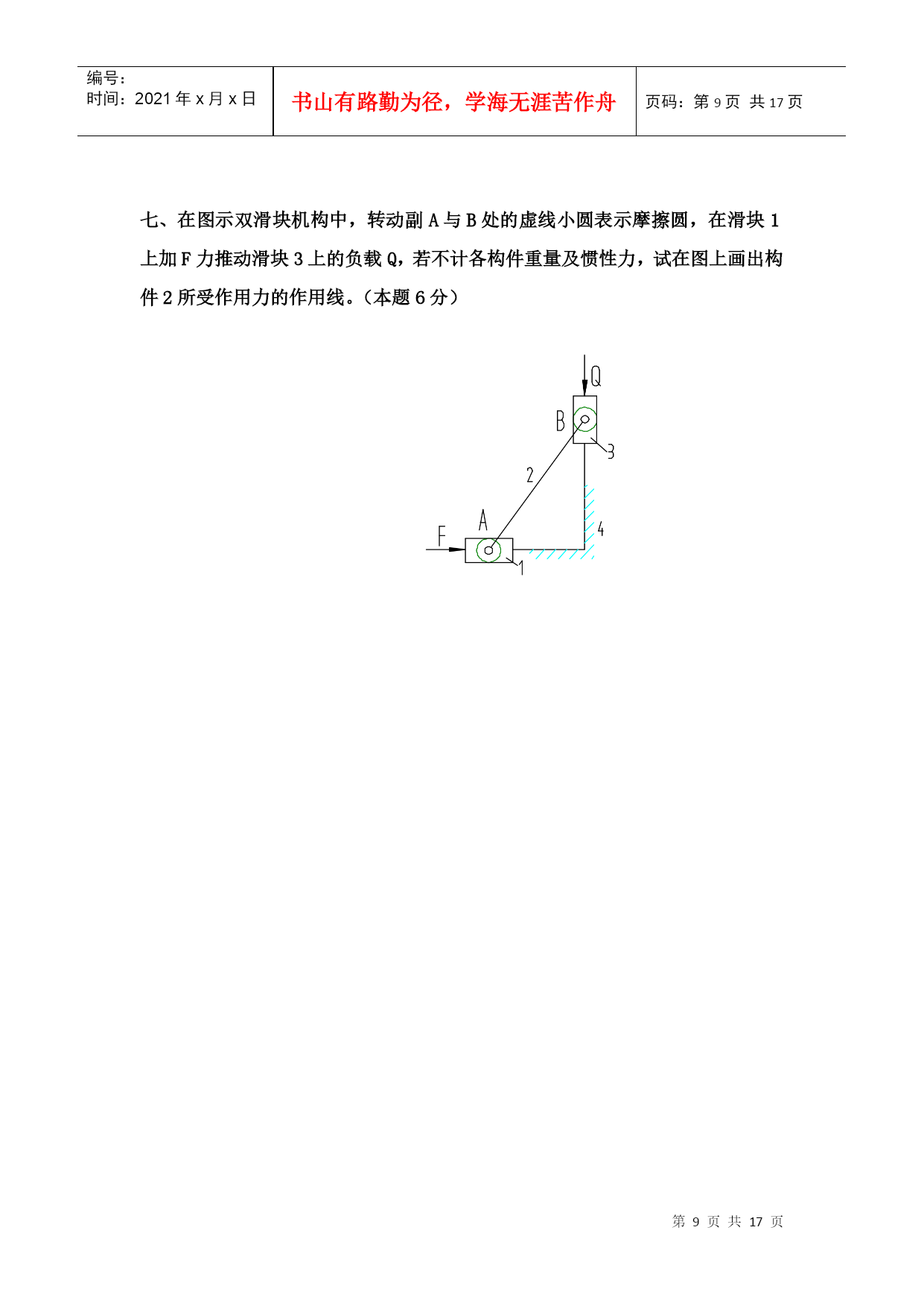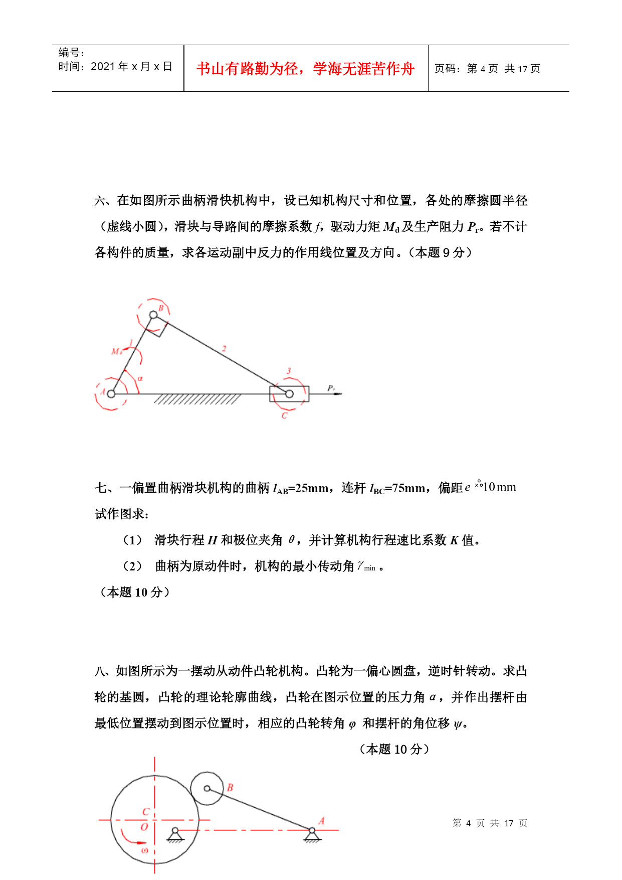 编号:时间:2021年x月x日书山有路勤为径,学海无涯苦作舟页码:第PAGE17页共NUMPAGES17页第PAGE\*MERGEFORMAT17页共NUMPAGES\*MERGEFORMAT17页自测题1一、选择题(每小题1分,共10分)1.构件是机械中独立()单元。A.制造B.运动C.分析2.在一般情况下,机构具有确定运动的条件是原动件数目等于()。A.从动件B.最终执行构件C.自由度D.13.一般情况下机构的对称部分可能产生()。A.复合铰链B.局部自由度C.虚约束4.一般门、窗扇与框之间有两个铰链,这是()。A.复合铰链B.局部自由度C.虚约束5.平面连杆机构是由许多刚性构件用()联结而成的机构。A.转动副B.高副C.低副6.对心曲柄滑块机构的行程速比系数一定()A.大于1B.等于1C.小于l7.()为无穷大引起的冲击为刚性冲击。A.速度B.加速度C.加速度的导数8.斜齿轮的标准模数和压力角在()上。A.端面B.法面C.轴面9.圆锥齿轮是用来传递两()轴之间的转动运动的。A.平行B.相交C.交错10.用()来调节机器的周期性速度波动。A.飞轮B.调速器C.轮系二、填空题(每空1分,共33分)1.在平面机构中具有两个约束的运动副是副或副,具有一个约束的运动副是副。2.平面四杆机构中的运动副都是转动副的称为机构,其基本型式有、、。3.在曲柄摇杆机构中,当与两次共线位置之一时出现最小传动角。4.在曲柄摇杆机构中,当为主动件,与构件两次共线时,则机构出现死点位置。5.铰链四杆机构具有两个曲柄的条件是和。6.在对心直动平底从动件盘形凸轮机构中,增加基圆半径,其压力角将;当用对心尖端从动件时,增加凸轮基圆半径,其压力角将。7.一对模数相等的渐开线标准直齿圆柱齿轮标准安装时,两轮的分度圆;齿轮的节圆和分度圆,啮合角α′压力角α;中心距a等于两轮半径之和。8.斜齿圆柱齿轮的参数为标准值;直齿圆锥齿轮分度圆上的和取为标准值。9.间歇运动机构是将原动件的运动变换为从动件的运动。常用的间歇运动机构有,,。10.机械效率是的比值,按机械效率来确定机构自锁的条件为。11.刚性转子静平衡的力学条件是,动平衡的力学条件是。三、计算图示各机构的自由度(若有复合铰链、局部自由度或虚约束应明确指出)。(本题10分)(b)(a)四、请在图中标出该机构的全部瞬心。(本题8分)五、在图示轮系中,已知各轮齿数为:z1=z2’=20,z2=40,z3=30,z4=80,试计算该轮系的传动比i1H。(本题10分)六、在如图所示曲柄滑快机构中,设已知机构尺寸和位置,各处的摩擦圆半径(虚线小圆),滑块与导路间的摩擦系数f,驱动力矩Md及生产阻力Pr。若不计各构件的质量,求各运动副中反力的作用线位置及方向。(本题9分)七、一偏置曲柄滑块机构的曲柄lAB=25mm,连杆lBC=75mm,偏距试作图求:滑块行程H和极位夹角θ,并计算机构行程速比系数K值。曲柄为原动件时,机构的最小传动角。(本题10分)八、如图所示为一摆动从动件凸轮机构。凸轮为一偏心圆盘,逆时针转动。求凸轮的基圆,凸轮的理论轮廓曲线,凸轮在图示位置的压力角α,并作出摆杆由最低位置摆动到图示位置时,相应的凸轮转角φ和摆杆的角位移ψ。(本题10分)自测题2一、选择题(每小题2分,共24分)1.两构件通过()接触组成的运动副称为高副。A.面B.面或线C点或线2.平面连杆机构是由许多刚性构件用()联结而成的机构。A.转动副B.高副C.低副3.以滑块为原动件时,曲柄滑块机构在()位置出现死点。A.曲柄与连杆共线B.曲柄与导路平行C.曲柄与导路垂直4.双摇杆机构倒置后()得到双曲柄机构。A.一定能B.不能C.不一定能5.渐开线的形状决定于()的大小。A.展角B.压力角C.基圆6.斜齿轮的标准模数和压力角在()上。A.端面B.法面C.轴面7.当齿轮中心距稍有改变时,()保持原值不变的性质称为可分性。A.压力角B.啮合角C.速比8.圆锥齿轮的标准参数在()面上。A.法B.小端C.大端9.一对齿轮传动相当于()作纯滚动。A.基圆B.节圆C.分度圆10.()轮系中必须有一个中心轮是固定不动的。A.行星B.周转C.差动11.()机构将住复摆动变为单向间歇运动。A.棘轮B.槽轮C.凸轮12.刚性回转件达到静平衡时()是动平衡的。A.一定B可能C.一定不二、填空题(每空1分,共34分)1.在平面机构中具有两个约束的运动副是副或副,具有一个约束的运动副是副。2.平面四