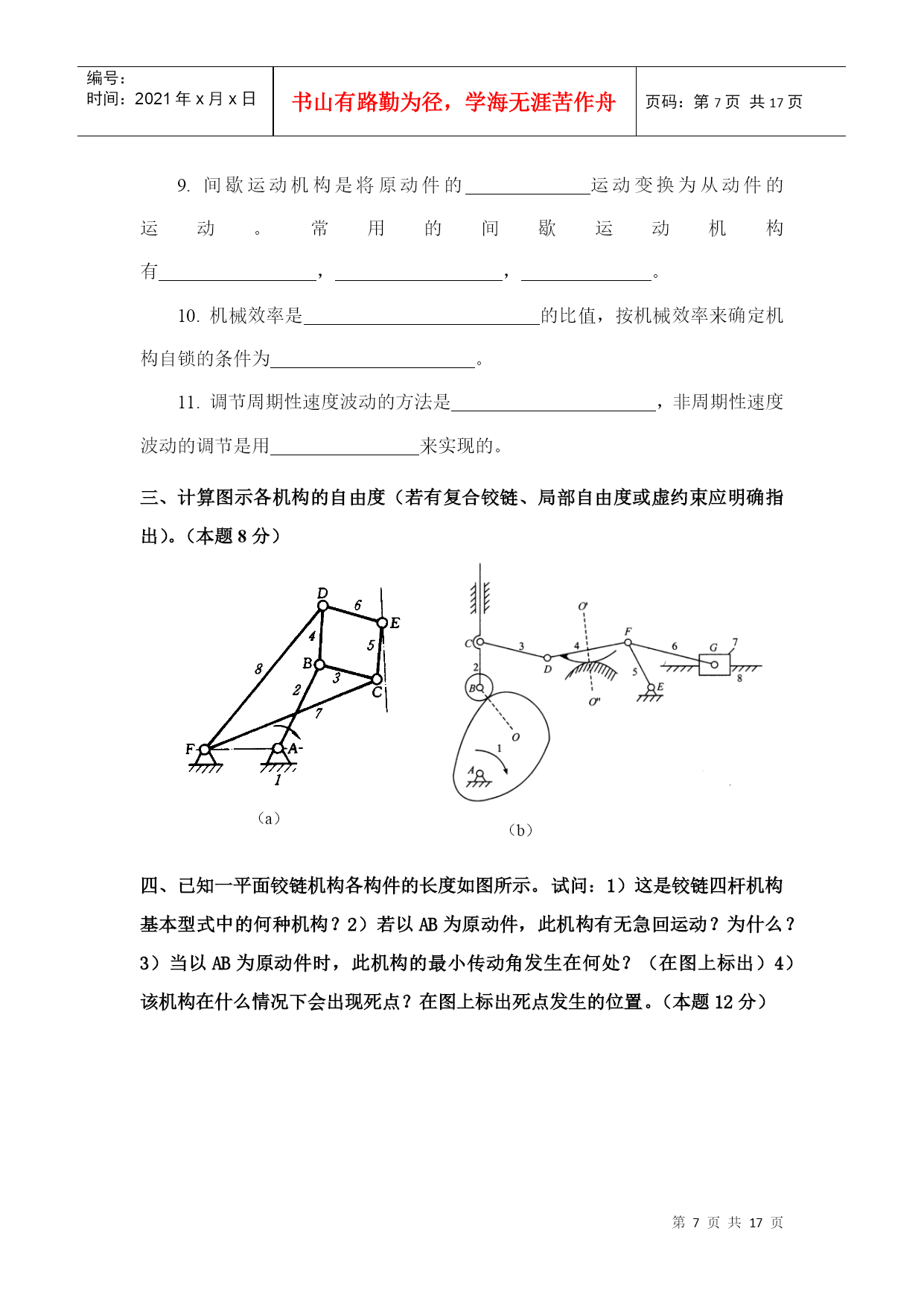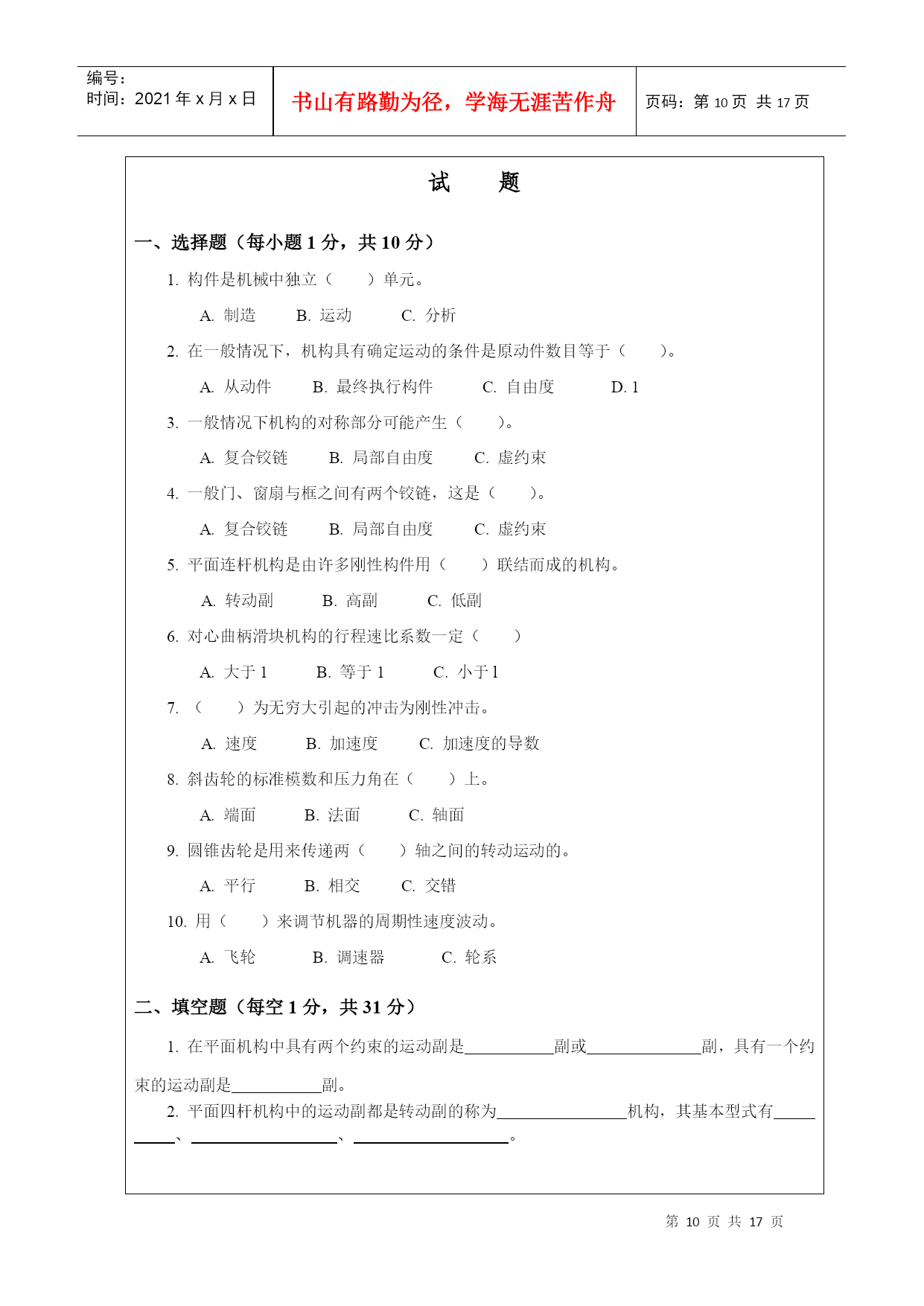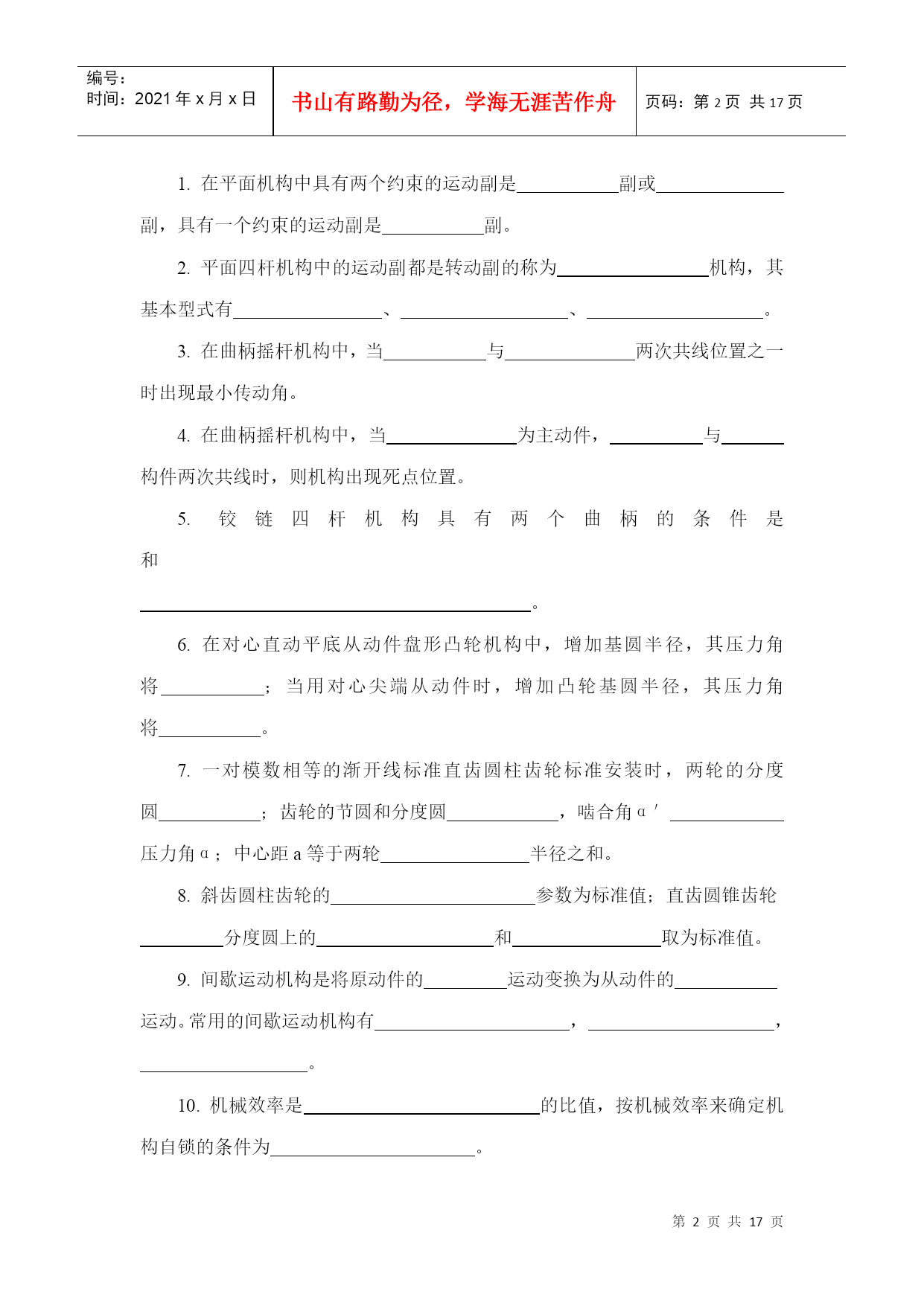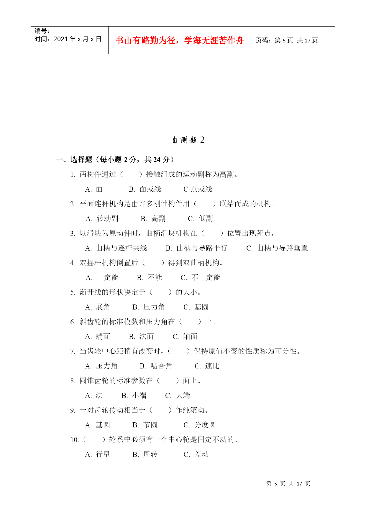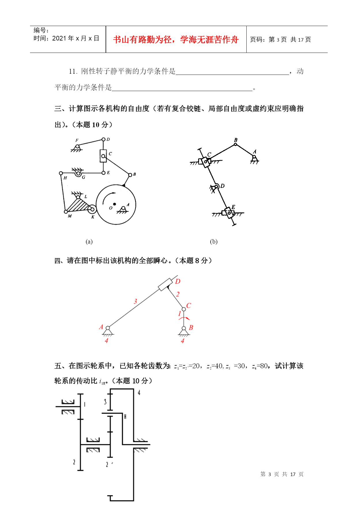 编号:时间:2021年x月x日书山有路勤为径,学海无涯苦作舟页码:第PAGE17页共NUMPAGES17页第PAGE\*MERGEFORMAT17页共NUMPAGES\*MERGEFORMAT17页自测题1一、选择题(每小题1分,共10分)1.构件是机械中独立()单元。A.制造B.运动C.分析2.在一般情况下,机构具有确定运动的条件是原动件数目等于()。A.从动件B.最终执行构件C.自由度D.13.一般情况下机构的对称部分可能产生()。A.复合铰链B.局部自由度C.虚约束4.一般门、窗扇与框之间有两个铰链,这是()。A.复合铰链B.局部自由度C.虚约束5.平面连杆机构是由许多刚性构件用()联结而成的机构。A.转动副B.高副C.低副6.对心曲柄滑块机构的行程速比系数一定()A.大于1B.等于1C.小于l7.()为无穷大引起的冲击为刚性冲击。A.速度B.加速度C.加速度的导数8.斜齿轮的标准模数和压力角在()上。A.端面B.法面C.轴面9.圆锥齿轮是用来传递两()轴之间的转动运动的。A.平行B.相交C.交错10.用()来调节机器的周期性速度波动。A.飞轮B.调速器C.轮系二、填空题(每空1分,共33分)1.在平面机构中具有两个约束的运动副是副或副,具有一个约束的运动副是副。2.平面四杆机构中的运动副都是转动副的称为机构,其基本型式有、、。3.在曲柄摇杆机构中,当与两次共线位置之一时出现最小传动角。4.在曲柄摇杆机构中,当为主动件,与构件两次共线时,则机构出现死点位置。5.铰链四杆机构具有两个曲柄的条件是和。6.在对心直动平底从动件盘形凸轮机构中,增加基圆半径,其压力角将;当用对心尖端从动件时,增加凸轮基圆半径,其压力角将。7.一对模数相等的渐开线标准直齿圆柱齿轮标准安装时,两轮的分度圆;齿轮的节圆和分度圆,啮合角α′压力角α;中心距a等于两轮半径之和。8.斜齿圆柱齿轮的参数为标准值;直齿圆锥齿轮分度圆上的和取为标准值。9.间歇运动机构是将原动件的运动变换为从动件的运动。常用的间歇运动机构有,,。10.机械效率是的比值,按机械效率来确定机构自锁的条件为。11.刚性转子静平衡的力学条件是,动平衡的力学条件是。三、计算图示各机构的自由度(若有复合铰链、局部自由度或虚约束应明确指出)。(本题10分)(b)(a)四、请在图中标出该机构的全部瞬心。(本题8分)五、在图示轮系中,已知各轮齿数为:z1=z2’=20,z2=40,z3=30,z4=80,试计算该轮系的传动比i1H。(本题10分)六、在如图所示曲柄滑快机构中,设已知机构尺寸和位置,各处的摩擦圆半径(虚线小圆),滑块与导路间的摩擦系数f,驱动力矩Md及生产阻力Pr。若不计各构件的质量,求各运动副中反力的作用线位置及方向。(本题9分)七、一偏置曲柄滑块机构的曲柄lAB=25mm,连杆lBC=75mm,偏距试作图求:滑块行程H和极位夹角θ,并计算机构行程速比系数K值。曲柄为原动件时,机构的最小传动角。(本题10分)八、如图所示为一摆动从动件凸轮机构。凸轮为一偏心圆盘,逆时针转动。求凸轮的基圆,凸轮的理论轮廓曲线,凸轮在图示位置的压力角α,并作出摆杆由最低位置摆动到图示位置时,相应的凸轮转角φ和摆杆的角位移ψ。(本题10分)自测题2一、选择题(每小题2分,共24分)1.两构件通过()接触组成的运动副称为高副。A.面B.面或线C点或线2.平面连杆机构是由许多刚性构件用()联结而成的机构。A.转动副B.高副C.低副3.以滑块为原动件时,曲柄滑块机构在()位置出现死点。A.曲柄与连杆共线B.曲柄与导路平行C.曲柄与导路垂直4.双摇杆机构倒置后()得到双曲柄机构。A.一定能B.不能C.不一定能5.渐开线的形状决定于()的大小。A.展角B.压力角C.基圆6.斜齿轮的标准模数和压力角在()上。A.端面B.法面C.轴面7.当齿轮中心距稍有改变时,()保持原值不变的性质称为可分性。A.压力角B.啮合角C.速比8.圆锥齿轮的标准参数在()面上。A.法B.小端C.大端9.一对齿轮传动相当于()作纯滚动。A.基圆B.节圆C.分度圆10.()轮系中必须有一个中心轮是固定不动的。A.行星B.周转C.差动11.()机构将住复摆动变为单向间歇运动。A.棘轮B.槽轮C.凸轮12.刚性回转件达到静平衡时()是动平衡的。A.一定B可能C.一定不二、填空题(每空1分,共34分)1.在平面机构中具有两个约束的运动副是副或副,具有一个约束的运动副是副。2.平面四
