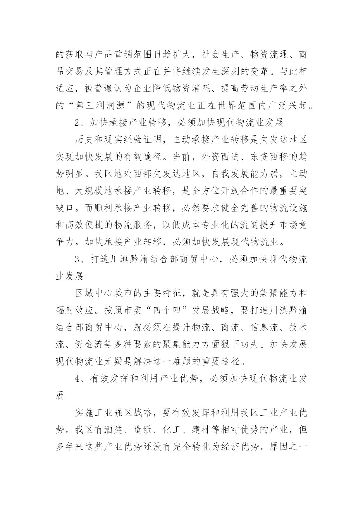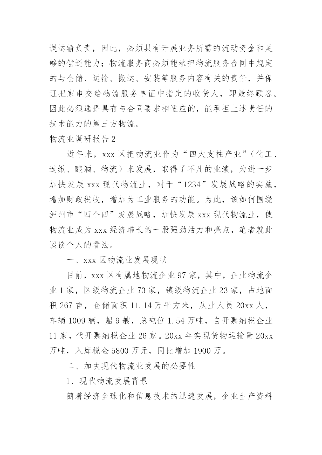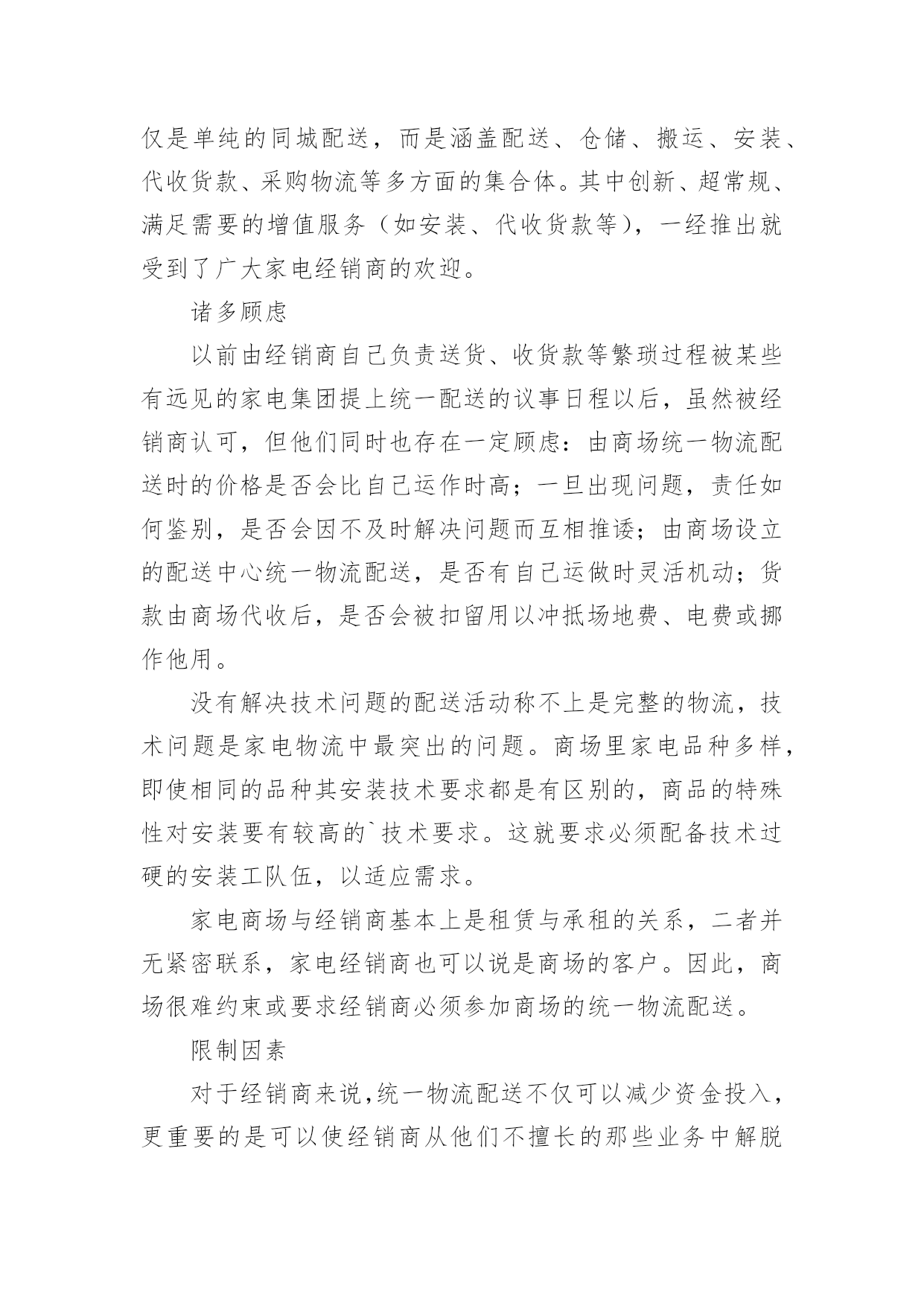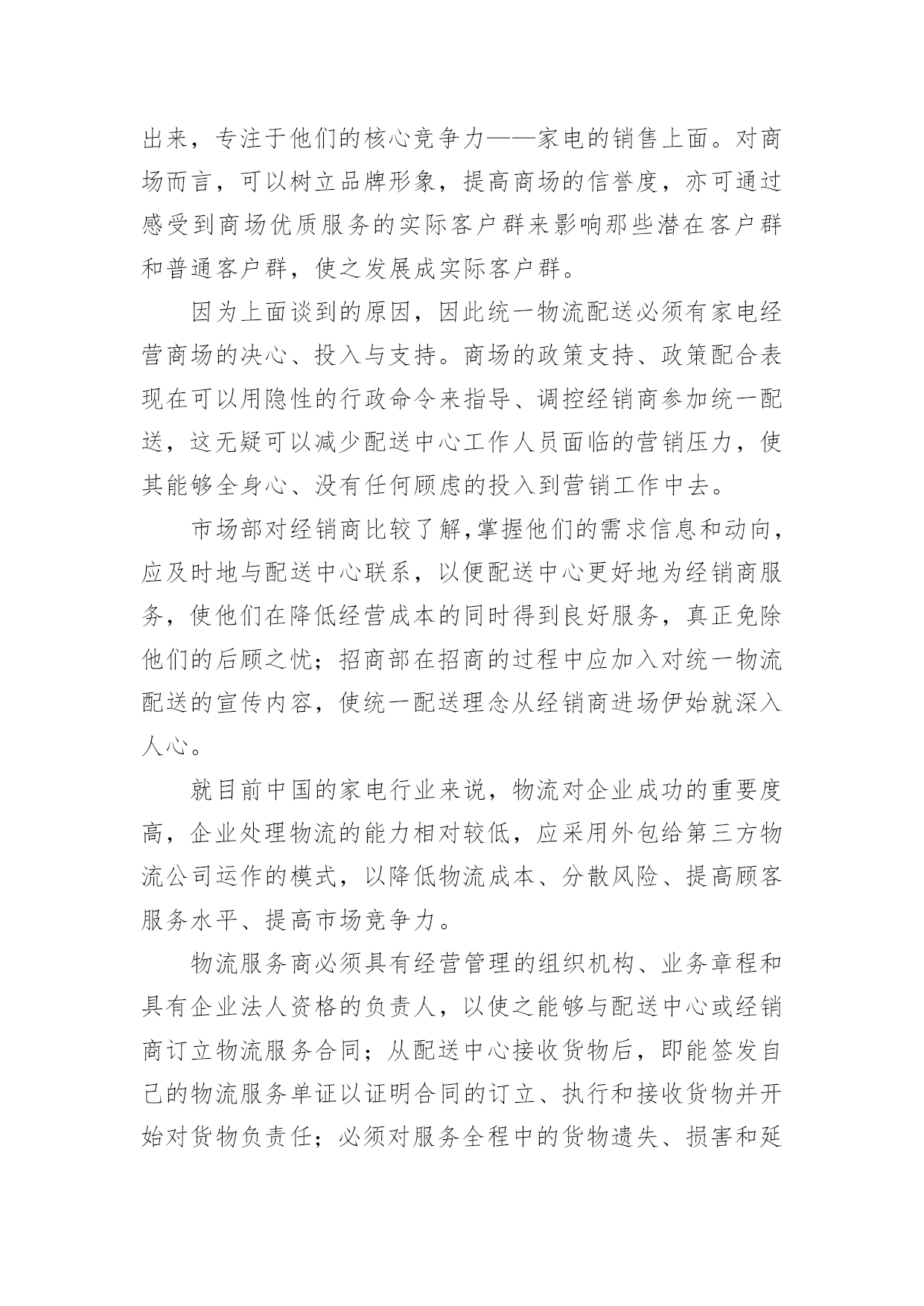物流业调研报告物流业调研报告在不断进步的时代,越来越多的事务都会使用到报告,我们在写报告的时候要注意逻辑的合理性。那么你真正懂得怎么写好报告吗?以下是小编精心整理的物流业调研报告,希望对大家有所帮助。物流业调研报告1随着人们对物质要求的提高,对中高档家电的需求与日俱增,专营家电的商场也如雨后春笋般成立开业。买方市场时代已经到来,在这样的环境中,各商场之间演绎着竞争的残酷。在经历了广告、降价促销大战以后,家电行业必须寻找到新的竞争点以突出重围,那就是服务。目前,大型家电商场如国美,苏宁,五星都提出了差额退款、服务跟踪,终身保修等服务承诺,就这些方面来看,家电行业中已无太大差别。要想取得竞争优势,必须找到新的切入点在管理、服务方面创新,争做行业的领跑者。于是,家电物流以其独特的服务方式开始被重视起来。如果没有物流商的适当(时间、货物、数量、地点)配合,不仅会因为二次运输而增加额外的物流费用,还会造成顾客投诉并要承担顾客退货的风险。目前中国大型家电商场几乎都采取商物配送的方式。这样的方式,物流对于家电行业的重要性可见一斑。对于家电行业来讲,物流活动绝不仅仅是单纯的同城配送,而是涵盖配送、仓储、搬运、安装、代收货款、采购物流等多方面的集合体。其中创新、超常规、满足需要的增值服务(如安装、代收货款等),一经推出就受到了广大家电经销商的欢迎。诸多顾虑以前由经销商自己负责送货、收货款等繁琐过程被某些有远见的家电集团提上统一配送的议事日程以后,虽然被经销商认可,但他们同时也存在一定顾虑:由商场统一物流配送时的价格是否会比自己运作时高;一旦出现问题,责任如何鉴别,是否会因不及时解决问题而互相推诿;由商场设立的配送中心统一物流配送,是否有自己运做时灵活机动;货款由商场代收后,是否会被扣留用以冲抵场地费、电费或挪作他用。没有解决技术问题的配送活动称不上是完整的物流,技术问题是家电物流中最突出的问题。商场里家电品种多样,即使相同的品种其安装技术要求都是有区别的,商品的特殊性对安装要有较高的`技术要求。这就要求必须配备技术过硬的安装工队伍,以适应需求。家电商场与经销商基本上是租赁与承租的关系,二者并无紧密联系,家电经销商也可以说是商场的客户。因此,商场很难约束或要求经销商必须参加商场的统一物流配送。限制因素对于经销商来说,统一物流配送不仅可以减少资金投入,更重要的是可以使经销商从他们不擅长的那些业务中解脱出来,专注于他们的核心竞争力——家电的销售上面。对商场而言,可以树立品牌形象,提高商场的信誉度,亦可通过感受到商场优质服务的实际客户群来影响那些潜在客户群和普通客户群,使之发展成实际客户群。因为上面谈到的原因,因此统一物流配送必须有家电经营商场的决心、投入与支持。商场的政策支持、政策配合表现在可以用隐性的行政命令来指导、调控经销商参加统一配送,这无疑可以减少配送中心工作人员面临的营销压力,使其能够全身心、没有任何顾虑的投入到营销工作中去。市场部对经销商比较了解,掌握他们的需求信息和动向,应及时地与配送中心联系,以便配送中心更好地为经销商服务,使他们在降低经营成本的同时得到良好服务,真正免除他们的后顾之忧;招商部在招商的过程中应加入对统一物流配送的宣传内容,使统一配送理念从经销商进场伊始就深入人心。就目前中国的家电行业来说,物流对企业成功的重要度高,企业处理物流的能力相对较低,应采用外包给第三方物流公司运作的模式,以降低物流成本、分散风险、提高顾客服务水平、提高市场竞争力。物流服务商必须具有经营管理的组织机构、业务章程和具有企业法人资格的负责人,以使之能够与配送中心或经销商订立物流服务合同;从配送中心接收货物后,即能签发自己的物流服务单证以证明合同的订立、执行和接收货物并开始对货物负责任;必须对服务全程中的货物遗失、损害和延误运输负责,因此,必须具有开展业务所需的流动资金和足够的偿还能力;物流服务商必须能承担物流服务合同中规定的与仓储、运输、搬运、安装等服务内容有关的责任,并保证把家电交给物流服务单证中指定的收货人,即最终顾客。因此必须选择具有与合同要求相适应的,能承担上述责任的技术能力的第三方物流。物流业调研报告2近年来,xxx区把物流业作为“四大支柱产业”(化工、造纸、酿酒、物流)来发展,取得了不凡的业绩,为进一步加快发展xxx现代物流业,对于“1234”发展战略的实施,增加财政税收,增加为工业服务的功能。为此,该如何围绕泸州市“四个四”发展战略,加快发展xxx现代物流业,使物流业成为xxx经济增长的一股强劲活力和亮点,笔者就此谈谈个人的看法。一、xxx区物流业发展现状目前,xxx区有属地物流企业97家,其中,企业物流企业1家,区级物流企业73家,镇级物流企业23家,占地面积267亩,仓储面积11.14万平方米,从业人员20xx人,车辆1009辆
