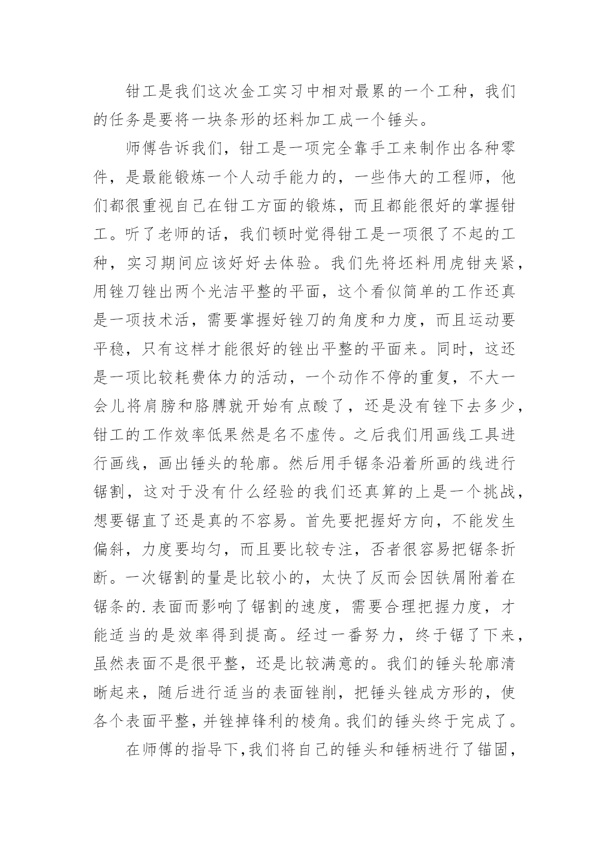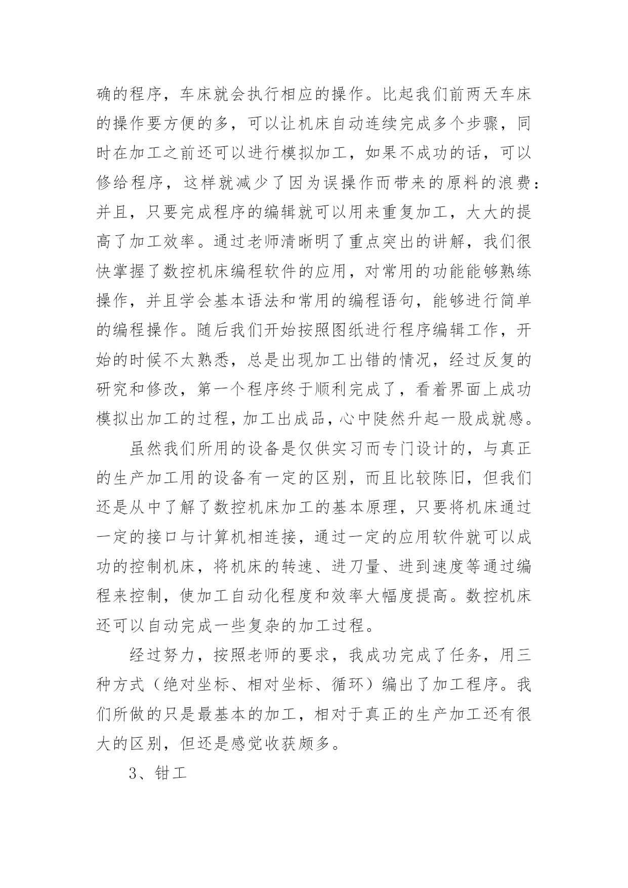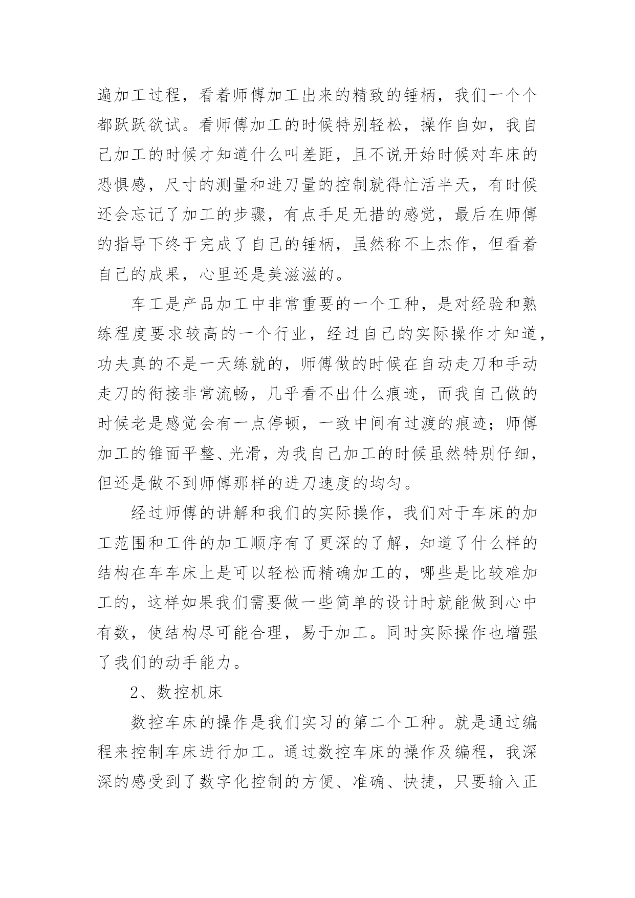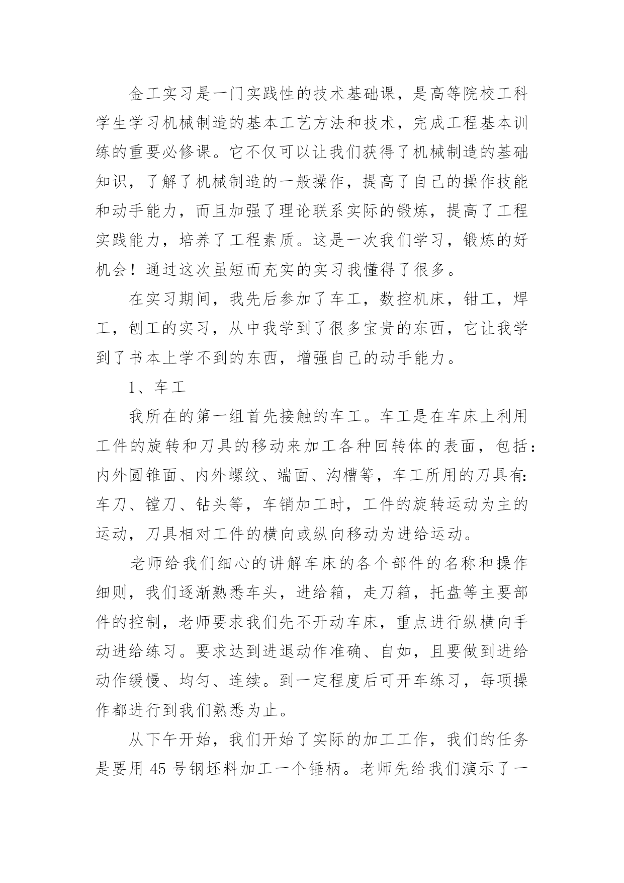 机电一体化专业实习报告机电一体化专业实习报告在经济飞速发展的今天,报告的用途越来越大,我们在写报告的时候要注意逻辑的合理性。我们应当如何写报告呢?下面是小编收集整理的机电一体化专业实习报告,欢迎大家分享。机电一体化专业实习报告篇1一、实习意义我们大家都知道,一个高校毕业生在三年或四年大学生涯结束之前都要参加一次踏入社会前的实习活动。对于这个活动的意义,不同人、不同的学校有不同的看法。我个人认为,毕业前的实习活动对于一个刚刚毕业的大学生来说是非常有必要的,大学生活是美好而快乐的,可是我们学生同样也在象牙塔中封闭了太久,我们不了解企业、不了解社会更不了解自己的能力和水平。通过实习可以让我们尝试着接触社会和企业,了解企业也了解自己。如今的大学生就业从过去的分配时代到了自主寻找时代,而现在的就业形势很不乐观,很多单位在招聘的时候列出需要有工作经验的条件,这对于刚走出校门的毕业生来说是很难达到的。这时,社会实习就显得尤为重要,它不单是对自己工作经验的一种积累,还能够让自己明确以后的发展方向,对提高自身能力有着极为重大的意义。因此,有了这次我的社会实习。二、操作流程及感想金工实习是一门实践性的技术基础课,是高等院校工科学生学习机械制造的基本工艺方法和技术,完成工程基本训练的重要必修课。它不仅可以让我们获得了机械制造的基础知识,了解了机械制造的一般操作,提高了自己的操作技能和动手能力,而且加强了理论联系实际的锻炼,提高了工程实践能力,培养了工程素质。这是一次我们学习,锻炼的好机会!通过这次虽短而充实的实习我懂得了很多。在实习期间,我先后参加了车工,数控机床,钳工,焊工,刨工的实习,从中我学到了很多宝贵的东西,它让我学到了书本上学不到的东西,增强自己的动手能力。1、车工我所在的第一组首先接触的车工。车工是在车床上利用工件的旋转和刀具的移动来加工各种回转体的表面,包括:内外圆锥面、内外螺纹、端面、沟槽等,车工所用的刀具有:车刀、镗刀、钻头等,车销加工时,工件的旋转运动为主的运动,刀具相对工件的横向或纵向移动为进给运动。老师给我们细心的讲解车床的各个部件的名称和操作细则,我们逐渐熟悉车头,进给箱,走刀箱,托盘等主要部件的控制,老师要求我们先不开动车床,重点进行纵横向手动进给练习。要求达到进退动作准确、自如,且要做到进给动作缓慢、均匀、连续。到一定程度后可开车练习,每项操作都进行到我们熟悉为止。从下午开始,我们开始了实际的加工工作,我们的任务是要用45号钢坯料加工一个锤柄。老师先给我们演示了一遍加工过程,看着师傅加工出来的精致的锤柄,我们一个个都跃跃欲试。看师傅加工的时候特别轻松,操作自如,我自己加工的时候才知道什么叫差距,且不说开始时候对车床的恐惧感,尺寸的测量和进刀量的控制就得忙活半天,有时候还会忘记了加工的步骤,有点手足无措的感觉,最后在师傅的指导下终于完成了自己的锤柄,虽然称不上杰作,但看着自己的成果,心里还是美滋滋的。车工是产品加工中非常重要的一个工种,是对经验和熟练程度要求较高的一个行业,经过自己的实际操作才知道,功夫真的不是一天练就的,师傅做的时候在自动走刀和手动走刀的衔接非常流畅,几乎看不出什么痕迹,而我自己做的时候老是感觉会有一点停顿,一致中间有过渡的痕迹;师傅加工的锥面平整、光滑,为我自己加工的时候虽然特别仔细,但还是做不到师傅那样的进刀速度的均匀。经过师傅的讲解和我们的实际操作,我们对于车床的加工范围和工件的加工顺序有了更深的了解,知道了什么样的结构在车车床上是可以轻松而精确加工的,哪些是比较难加工的,这样如果我们需要做一些简单的设计时就能做到心中有数,使结构尽可能合理,易于加工。同时实际操作也增强了我们的动手能力。2、数控机床数控车床的操作是我们实习的第二个工种。就是通过编程来控制车床进行加工。通过数控车床的操作及编程,我深深的感受到了数字化控制的方便、准确、快捷,只要输入正确的程序,车床就会执行相应的操作。比起我们前两天车床的操作要方便的多,可以让机床自动连续完成多个步骤,同时在加工之前还可以进行模拟加工,如果不成功的话,可以修给程序,这样就减少了因为误操作而带来的原料的浪费:并且,只要完成程序的编辑就可以用来重复加工,大大的提高了加工效率。通过老师清晰明了重点突出的讲解,我们很快掌握了数控机床编程软件的应用,对常用的功能能够熟练操作,并且学会基本语法和常用的编程语句,能够进行简单的编程操作。随后我们开始按照图纸进行程序编辑工作,开始的时候不太熟悉,总是出现加工出错的情况,经过反复的研究和修改,第一个程序终于顺利完成了,看着界面上成功模拟出加工的过程,加工出成品,心中陡然升起一股成就感。虽然我们所用的设备是仅供实习而专门设计的,与真正的生产加工用的设备有一定的区别,而且比较陈旧,但我们还是从中了解了数控机床加工的基本原