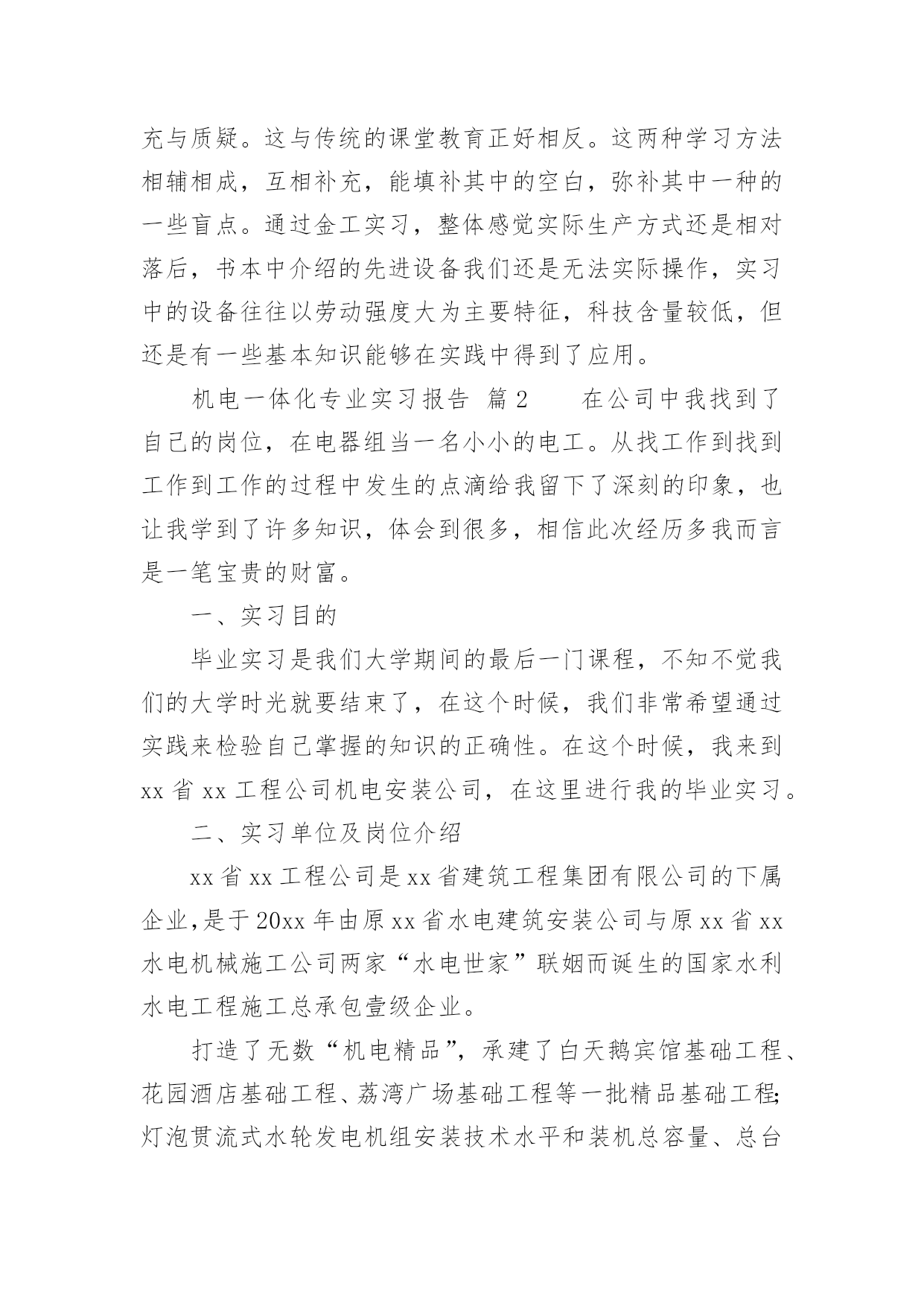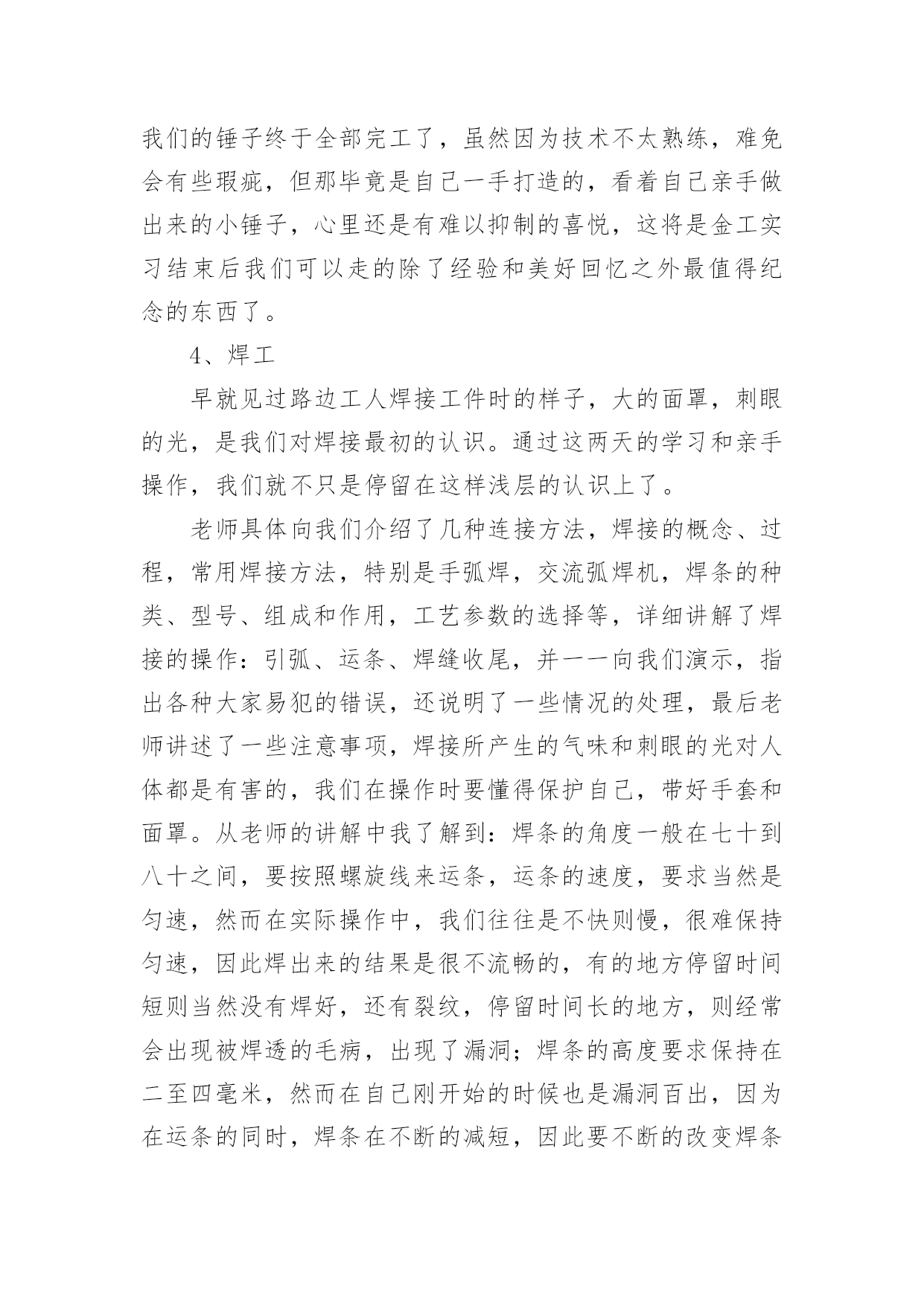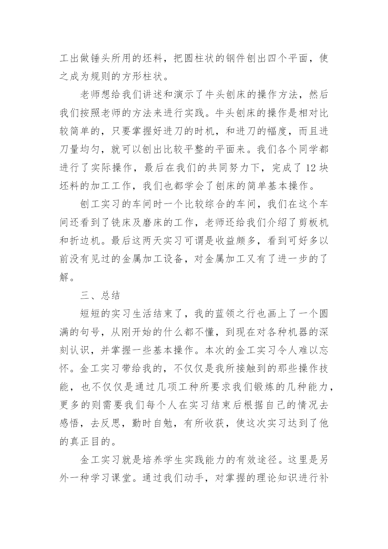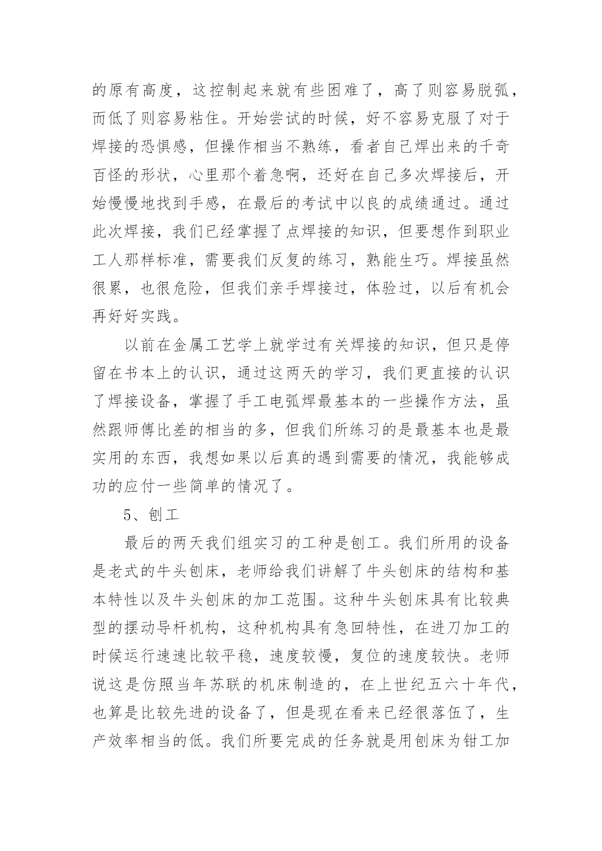 机电一体化专业实习报告机电一体化专业实习报告在经济飞速发展的今天,报告的用途越来越大,我们在写报告的时候要注意逻辑的合理性。我们应当如何写报告呢?下面是小编收集整理的机电一体化专业实习报告,欢迎大家分享。机电一体化专业实习报告篇1一、实习意义我们大家都知道,一个高校毕业生在三年或四年大学生涯结束之前都要参加一次踏入社会前的实习活动。对于这个活动的意义,不同人、不同的学校有不同的看法。我个人认为,毕业前的实习活动对于一个刚刚毕业的大学生来说是非常有必要的,大学生活是美好而快乐的,可是我们学生同样也在象牙塔中封闭了太久,我们不了解企业、不了解社会更不了解自己的能力和水平。通过实习可以让我们尝试着接触社会和企业,了解企业也了解自己。如今的大学生就业从过去的分配时代到了自主寻找时代,而现在的就业形势很不乐观,很多单位在招聘的时候列出需要有工作经验的条件,这对于刚走出校门的毕业生来说是很难达到的。这时,社会实习就显得尤为重要,它不单是对自己工作经验的一种积累,还能够让自己明确以后的发展方向,对提高自身能力有着极为重大的意义。因此,有了这次我的社会实习。二、操作流程及感想金工实习是一门实践性的技术基础课,是高等院校工科学生学习机械制造的基本工艺方法和技术,完成工程基本训练的重要必修课。它不仅可以让我们获得了机械制造的基础知识,了解了机械制造的一般操作,提高了自己的操作技能和动手能力,而且加强了理论联系实际的锻炼,提高了工程实践能力,培养了工程素质。这是一次我们学习,锻炼的好机会!通过这次虽短而充实的实习我懂得了很多。在实习期间,我先后参加了车工,数控机床,钳工,焊工,刨工的实习,从中我学到了很多宝贵的东西,它让我学到了书本上学不到的东西,增强自己的动手能力。1、车工我所在的第一组首先接触的车工。车工是在车床上利用工件的旋转和刀具的移动来加工各种回转体的表面,包括:内外圆锥面、内外螺纹、端面、沟槽等,车工所用的刀具有:车刀、镗刀、钻头等,车销加工时,工件的旋转运动为主的运动,刀具相对工件的横向或纵向移动为进给运动。老师给我们细心的讲解车床的各个部件的名称和操作细则,我们逐渐熟悉车头,进给箱,走刀箱,托盘等主要部件的控制,老师要求我们先不开动车床,重点进行纵横向手动进给练习。要求达到进退动作准确、自如,且要做到进给动作缓慢、均匀、连续。到一定程度后可开车练习,每项操作都进行到我们熟悉为止。从下午开始,我们开始了实际的加工工作,我们的任务是要用45号钢坯料加工一个锤柄。老师先给我们演示了一遍加工过程,看着师傅加工出来的精致的锤柄,我们一个个都跃跃欲试。看师傅加工的时候特别轻松,操作自如,我自己加工的时候才知道什么叫差距,且不说开始时候对车床的恐惧感,尺寸的测量和进刀量的控制就得忙活半天,有时候还会忘记了加工的步骤,有点手足无措的感觉,最后在师傅的指导下终于完成了自己的锤柄,虽然称不上杰作,但看着自己的成果,心里还是美滋滋的。车工是产品加工中非常重要的一个工种,是对经验和熟练程度要求较高的一个行业,经过自己的实际操作才知道,功夫真的不是一天练就的,师傅做的时候在自动走刀和手动走刀的衔接非常流畅,几乎看不出什么痕迹,而我自己做的时候老是感觉会有一点停顿,一致中间有过渡的痕迹;师傅加工的锥面平整、光滑,为我自己加工的时候虽然特别仔细,但还是做不到师傅那样的进刀速度的均匀。经过师傅的讲解和我们的实际操作,我们对于车床的加工范围和工件的加工顺序有了更深的了解,知道了什么样的结构在车车床上是可以轻松而精确加工的,哪些是比较难加工的,这样如果我们需要做一些简单的设计时就能做到心中有数,使结构尽可能合理,易于加工。同时实际操作也增强了我们的动手能力。2、数控机床数控车床的操作是我们实习的第二个工种。就是通过编程来控制车床进行加工。通过数控车床的操作及编程,我深深的感受到了数字化控制的方便、准确、快捷,只要输入正确的程序,车床就会执行相应的操作。比起我们前两天车床的操作要方便的多,可以让机床自动连续完成多个步骤,同时在加工之前还可以进行模拟加工,如果不成功的话,可以修给程序,这样就减少了因为误操作而带来的原料的浪费:并且,只要完成程序的编辑就可以用来重复加工,大大的提高了加工效率。通过老师清晰明了重点突出的讲解,我们很快掌握了数控机床编程软件的应用,对常用的功能能够熟练操作,并且学会基本语法和常用的编程语句,能够进行简单的编程操作。随后我们开始按照图纸进行程序编辑工作,开始的时候不太熟悉,总是出现加工出错的情况,经过反复的研究和修改,第一个程序终于顺利完成了,看着界面上成功模拟出加工的过程,加工出成品,心中陡然升起一股成就感。虽然我们所用的设备是仅供实习而专门设计的,与真正的生产加工用的设备有一定的区别,而且比较陈旧,但我们还是从中了解了数控机床加工的基本原