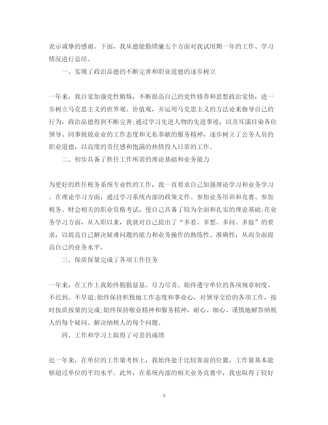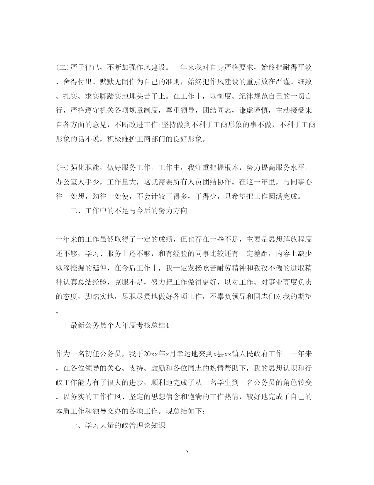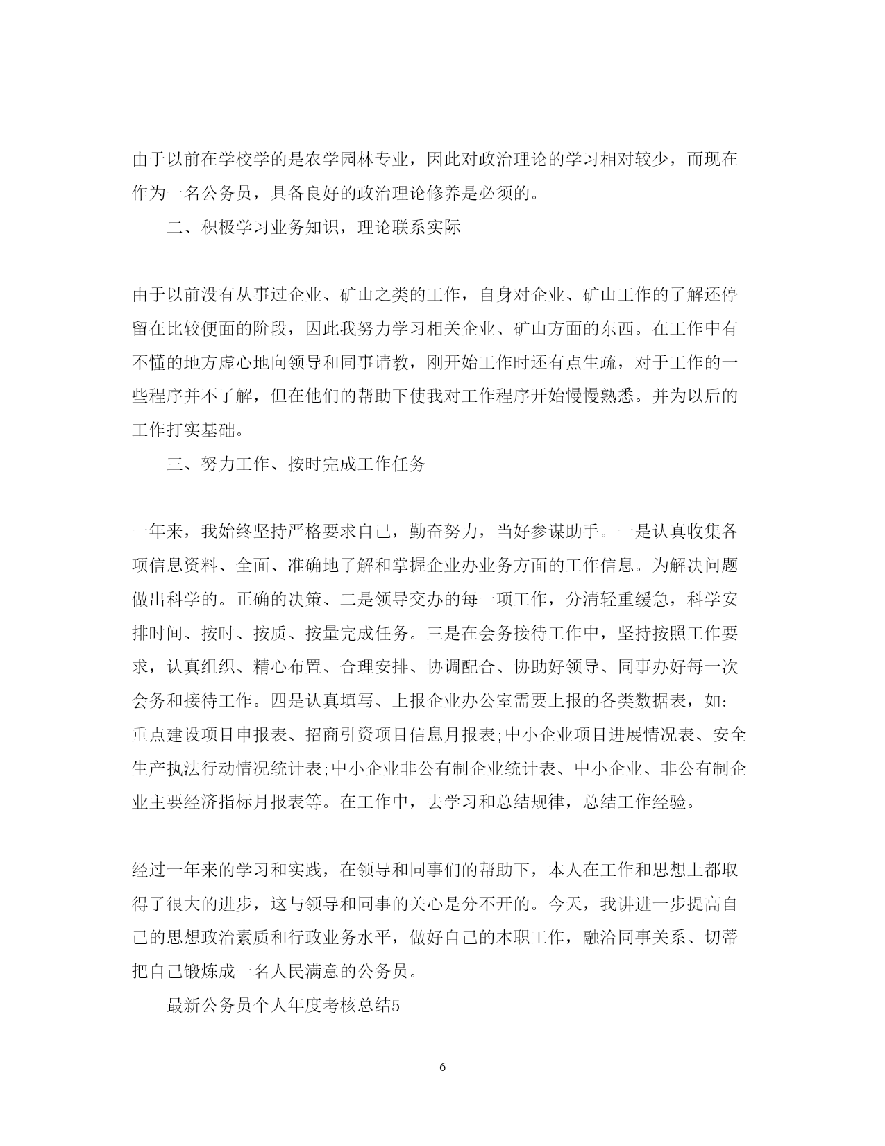 此资料由网络收集而来,如有侵权请告知上传者立即删除。资料共分享,我们负责传递知识。PAGEPAGE9最新公务员个人年度考核总结国家公务员的考核是指拥有法定公务员考核权限的国家行政机关根据公务员法及其相关规定所明确的公务员考核内容,标准和程序,对考核权限内的国家公务员进行的专门性的考察和评价。下面是范文网小编为您精心整理的最新公务员个人年度考核总结。最新公务员个人年度考核总结1今年以来,本人始终坚持党的方针政策,努力工作,求真务实,积极进取。在领导的关心下与同事一起圆满完成了各项工作任务。下面我从德、能、勤、绩、廉五个方面对去年的工作做一总结。一、“德”方面始终牢固树立马克思主义世界观、人生观、价值观,保持良好的道德风尚。无论做什么工作都能摆正自己同组织、同事的关系,把实现个人的人生价值同服从上级领导的安排紧密地结合起来。在工作和事业面前,不争名夺利,不计较个人得失,时刻保持良好的道德情操。二、“能”方面在日常工作中不断加强方针政策、法律法规、业务知识、信息化知识等的学习,在工作中多向老同志请教,遇到疑难问题及时向领导请示。通过努力不断提高自已各方面的能力,为完成好本职工作打下坚实的基础。三、“勤”方面勤勉敬业是对一名公务员的起码要求,我时刻牢记自己是人民的公仆,严格遵守各项工作纪律,上班不迟到不早退,不离岗、串岗、脱岗。在工作中始终坚持“做了就要做好”原则,对领导布置的工作认认真真按要求及时完成。有时遇到工作量大、时间赶的任务,能够利用中午或晚上的时间加班,按时完成工作。四、“绩”方面在工商局办事大厅我主要受理企业年检和户外广告、动产抵押、商品展销会登记窗口的业务,在窗口工作中我格遵守窗口岗位职责规范,热情高效服务办事群众,做到优质服务、支持地方经济发展。20xx年共办理企业年检xxx多份,办理户外广告登记xx份,受理动产抵押、商品展销会资询xx次。在受理窗口工作的同时做好企管股收发文和材料汇报工作,20xx年共收发文xxx份,按文件要求对各工商所报上来的材料进行收集整理,再向xx市局企管科、xx市安监局汇报的材料达xxx多份。今年x到xx月份我被抽调到注册股,在完成本股日常工作的同时协助注册股的企业档案扫描工作,共去黑企业档案扫描件500多份,为完成企业档案扫描工作尽了自已的一份力。五、“廉”方面按照国家工商总局和省工商局的“六项禁令”严格要求自己,廉洁奉公,依法办事,始终保持清正廉洁的作风。从来没有利用职务之便,获取一己之私。在党风廉政建设方面,把重点放在严谨、细致、扎实、求真上,养成奉公守法以廉为荣的作风。一年来,虽然在工作、学习方面取得了一定成绩,但仍然存在着一些不足,如理论学习不够、服务缺少创新等,今后我将加强学习,在实践中总结经验不断提高服务水平,成为一名人民满意的工商公务员。最新公务员个人年度考核总结2入职一年,我实现了从一名学生向一名合格的国家公务员的角色转变,这其中有我个人努力,但更多的还是源于各位领导、同事的关心、支持和帮助。在此,我表示诚挚的感谢。下面,我从德能勤绩廉五个方面对我试用期一年的工作、学习情况进行总结。一、实现了政治品德的不断完善和职业道德的逐步树立一年来,我自觉加强党性锻炼,不断提高自己的党性修养和思想政治觉悟,进一步树立马克思主义的世界观、价值观,并运用马克思主义的方法论来指导自己的行为,政治品德得到不断完善;通过学习先进人物的先进事迹,以及耳濡目染各位领导、同事兢兢业业的工作态度和无私奉献的服务精神,逐步树立了公务人员的职业道德,以高度的责任感和饱满的热情投入日常的工作。二、初步具备了胜任工作所需的理论基础和业务能力为更好的胜任税务系统专业性的工作,我一直要求自己加强理论学习和业务学习。在理论学习方面,通过学习系统内部的政策文件、参加业务培训和竞赛、参加税务、财会相关的职业资格考试,使自己具备了较为全面和扎实的理论基础;在业务学习方面,从入职以来,我就对自己提出了“多看、多想、多问、多做”的要求,以提高自己解决疑难问题的能力和业务操作的熟练性、准确性,从而全面提高自己的业务水平。三、保质保量完成了各项工作任务一年来,在工作上我始终勤勤恳恳、尽力尽责。始终遵守单位的各项规章制度、不迟到、不早退;始终保持积极地工作态度和事业心,对领导交给的各项工作,按时按质按量的完成;始终保持敬业精神和服务精神,耐心、细心、谨慎地解答纳税人的每个疑问、解决纳税人的每个问题。四、工作和学习上取得了可喜的成绩近一年来,在单位的工作量考核上,我始终处于比较靠前的位置,工作量基本能够超过单位的平均水平。此外,在系统内部的相关业务竞赛中,我也取得了较好的成绩和名次。第五、树立了国税干部廉洁奉公的形象。不断加强自己的廉政学习,强化自己的廉洁意识,