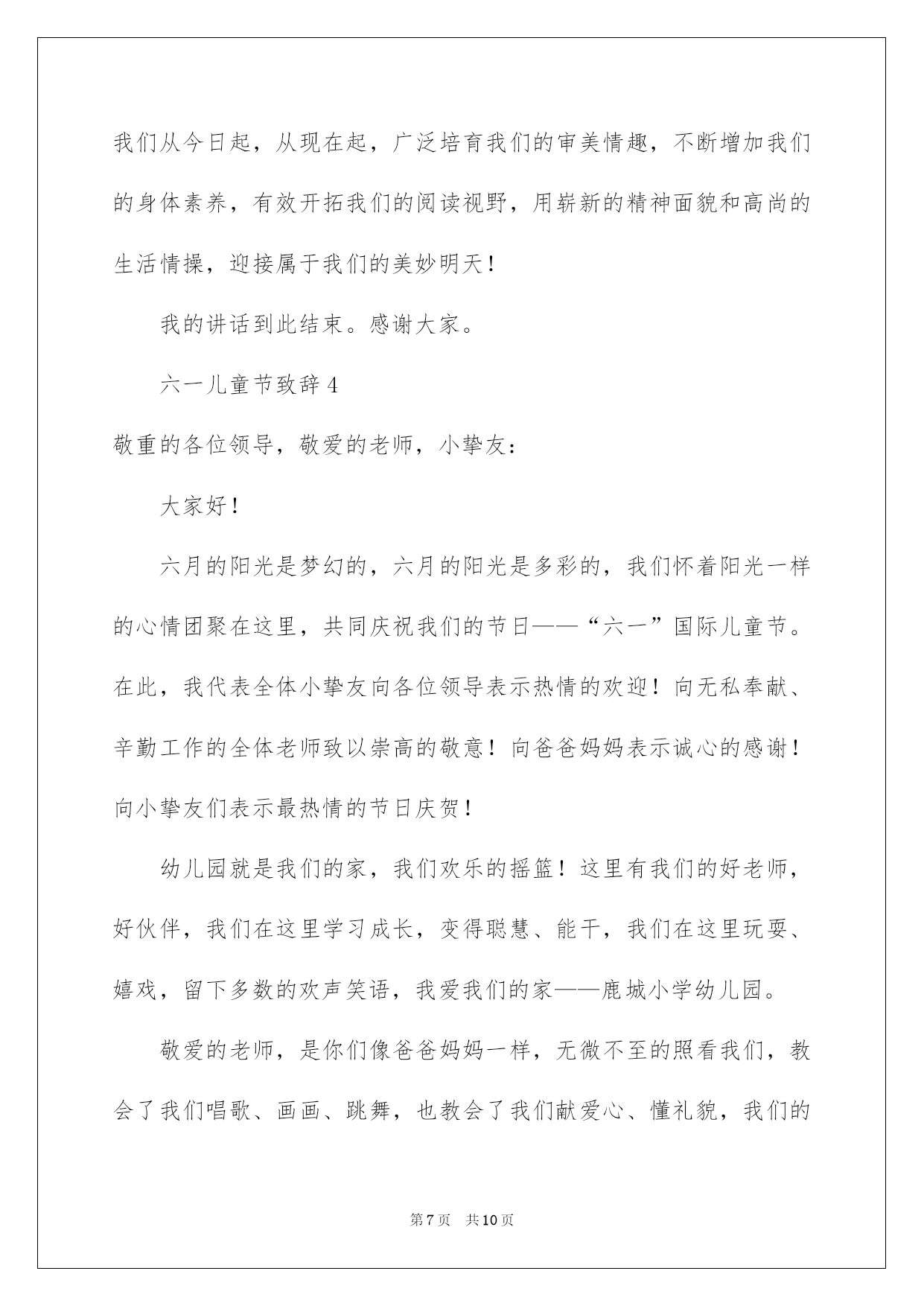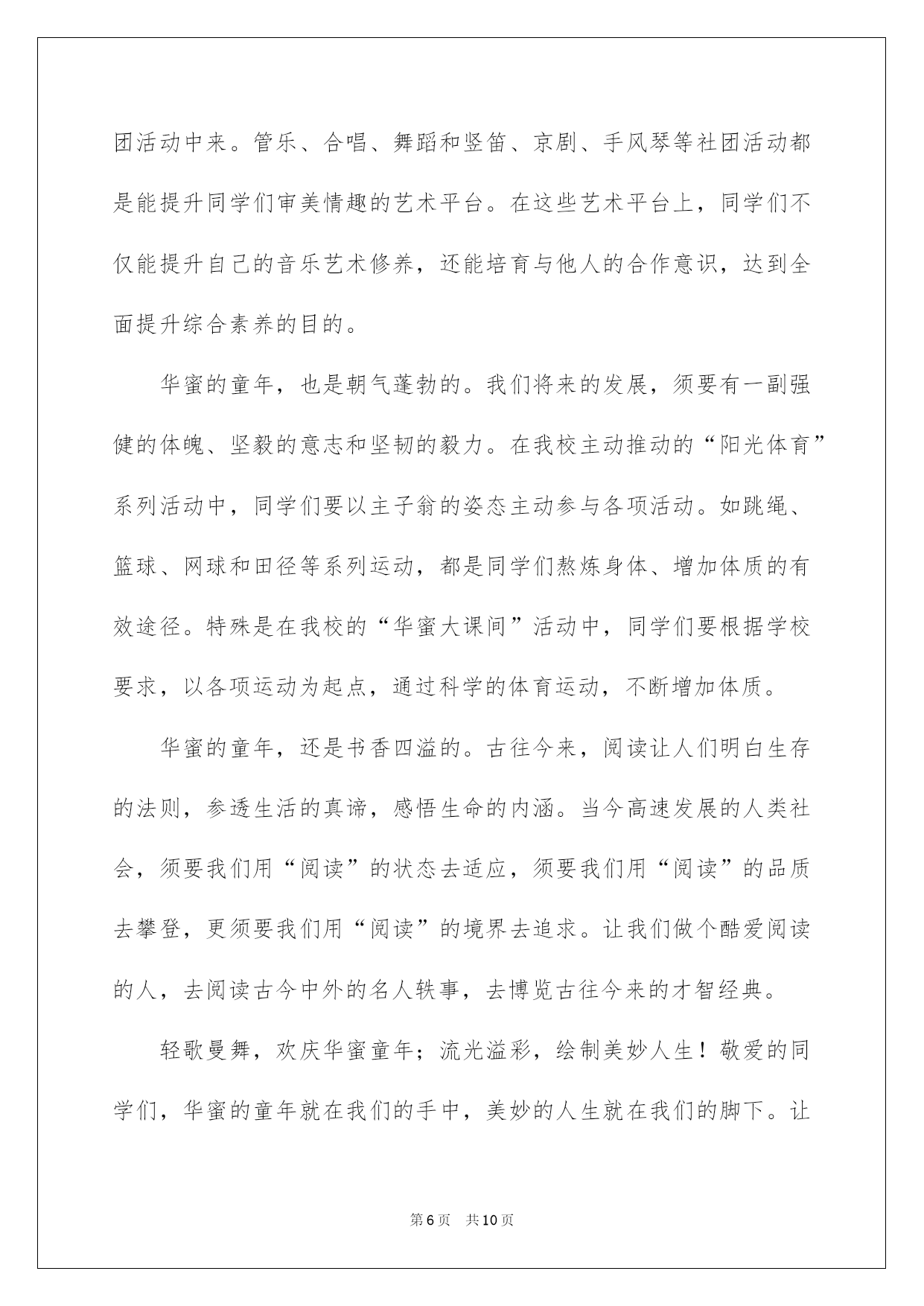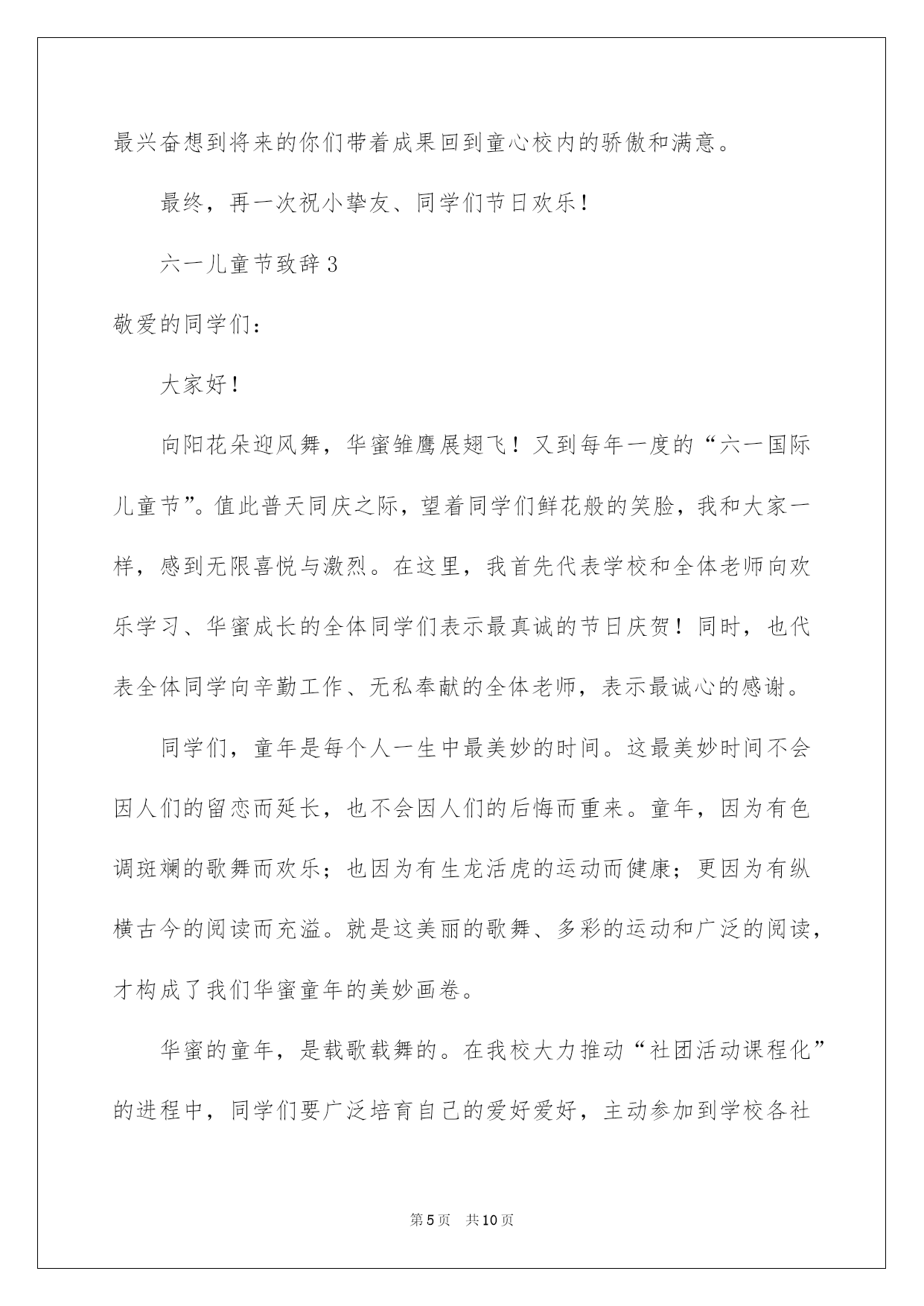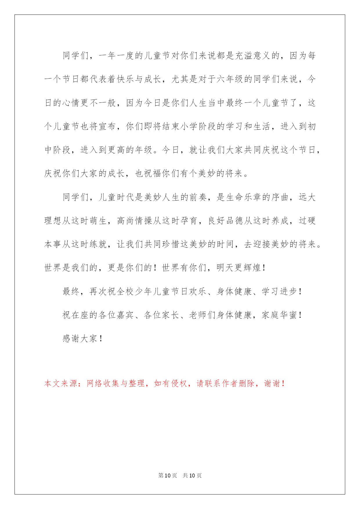 第PAGE\*Arabic\*MERGEFORMAT10页共NUMPAGES\*Arabic\*MERGEFORMAT10页第PAGE\*MERGEFORMAT10页共NUMPAGES\*MERGEFORMAT10页第PAGE\*MERGEFORMAT10页共NUMPAGES\*MERGEFORMAT10页第PAGE\*MERGEFORMAT10页共NUMPAGES\*MERGEFORMAT10页第PAGE\*MERGEFORMAT10页共NUMPAGES\*MERGEFORMAT10页第PAGE\*MERGEFORMAT10页共NUMPAGES\*MERGEFORMAT10页第PAGE\*MERGEFORMAT10页共NUMPAGES\*MERGEFORMAT10页第PAGE\*MERGEFORMAT10页共NUMPAGES\*MERGEFORMAT10页第PAGE\*MERGEFORMAT10页共NUMPAGES\*MERGEFORMAT10页第PAGE\*MERGEFORMAT10页共NUMPAGES\*MERGEFORMAT10页第PAGE\*MERGEFORMAT10页共NUMPAGES\*MERGEFORMAT10页2022六一儿童节致辞六一儿童节致辞范文(通用5篇)无论是身处学校还是步入社会,大家都不行避开地要接触到致辞吧,致辞是指在仪式上所讲的表示勉励、感谢、庆贺、哀悼等的话。那什么样的致辞才具有启发意义呢?下面是我帮大家整理的六一儿童节致辞范文(通用5篇),供大家参考借鉴,希望可以帮助到有须要的挚友。六一儿童节致辞1敬重的家长、尊敬的老师、敬爱的孩子们:当时夏的第一缕阳光映射我们喜悦的面庞时,当朵朵绚烂娇艳的花儿竞相开放时,我们又迎来了孩子们自己的节日——六一国际儿童节,在此,我谨代表学校向全体学生致以最真诚的节日问候,祝你们在牛栏山一中试验学校小学部这个大家庭里学好、玩好,祝老师们能怀揣着“倾心培育、静待花开”的办学理念,实现自己的教化幻想,祝各位家长能在陪伴孩子们成长的路程中收获最多的华蜜和希望!我记着有一首歌是这样唱的:六一的歌儿是甜甜的,六一的花儿是香香的,六一的小挚友个个都是美美的。“六一”是你们最欢乐的节日,鲜花烂漫、绿草如茵,红领巾迎风飞扬、笑靥尽情绽放。清末文学家梁启超说“少年智则国智,少年强则国强”。你们是家庭的珍宝,是家庭的希望,你们的欢乐成长,是家庭充溢欢歌、充溢笑语的力气。你们是学校的孩子,是学校的希望,你们的全面发展,是学校充溢朝气、充溢活力的光线。你们是社会的将来,是社会的希望,你们的融洽和谐,是社会充溢热忱、充溢友爱的源泉。你们是祖国的花朵,是祖国的希望,你们的健康强壮,是祖国充溢美妙、充溢希望的栋梁。孩子们,今日,你们是舞台上的主角,翩翩起舞的身姿,奇妙宛转的歌喉,如甘露般飘洒在舞台的角角落落,滋润着在场全部人的心田,这一刻,是你们多日辛苦排练的完备呈现,我信任,舞台上的你们心中确定满是喜悦。孩子们,你们正处于一个充溢希望和挑战的新时代,这既是一种幸运,也肩负了许多重担,今日你们是天真烂漫的红领巾,在这一方小小的舞台上尽展自己的魅力,明天你们将成为现代化建设的生力军,在社会这个大舞台上施展自己的才华。古人言:千里之行,始于足下。童年时代是美妙人生的开端,远大的志向在这里孕育,高尚的情操在这里萌生,良好的习惯在这里养成,生命的辉煌在这里奠基。我真诚地希望你们能够好好珍惜如此舒适的学习环境,做好眼前该做之事,储备好明日所需之才。作为一所新办校,我们在激情飞扬中走过了它的第一个春、夏、秋、冬,得到了社会的广泛认可。如此成果的取得,虽然有牛栏山一中深厚文化底蕴的滋养,但更少不了你们,我们可爱的园丁——老师们的辛勤耕耘,你们用自己的才智、勤奋和激情诠释了“落红不是无情物,化作春泥更护花”的深切含义;我们敬爱的护花使者——家长们同学校的心心相依,你们用自己的关爱、耐性和真诚守来了“春前苦耕片片土,秋后笑采粒粒珠”的喜悦。彩旗带着心愿迎风飘扬,鲜花伴随希望尽情绽放。让我们共同携起手来,把教化中琐碎的事情做彻底,把平凡的事情做经典,把简洁的事情做精细,凝合共同信念,把志向打造成现实,共创学校美妙的新篇章。六一儿童节致辞2尊敬的同学们:你们好!今日是“六一”国际儿童节,是你们自己的盛大节日,我代表老师们向你们表示节日的庆贺!祝大家节日欢乐!同时,我代表学校领导向关切少年儿童成长的家长、老师们表示崇高的敬意!你们辛苦了!同学们,“六一”是你们最欢乐的节日,也是我最兴奋的日子。回想过去的这一年,我要说的是你们不仅长高了,也长大了。你们是家庭、学