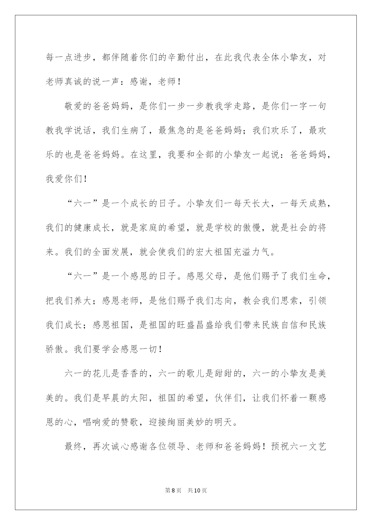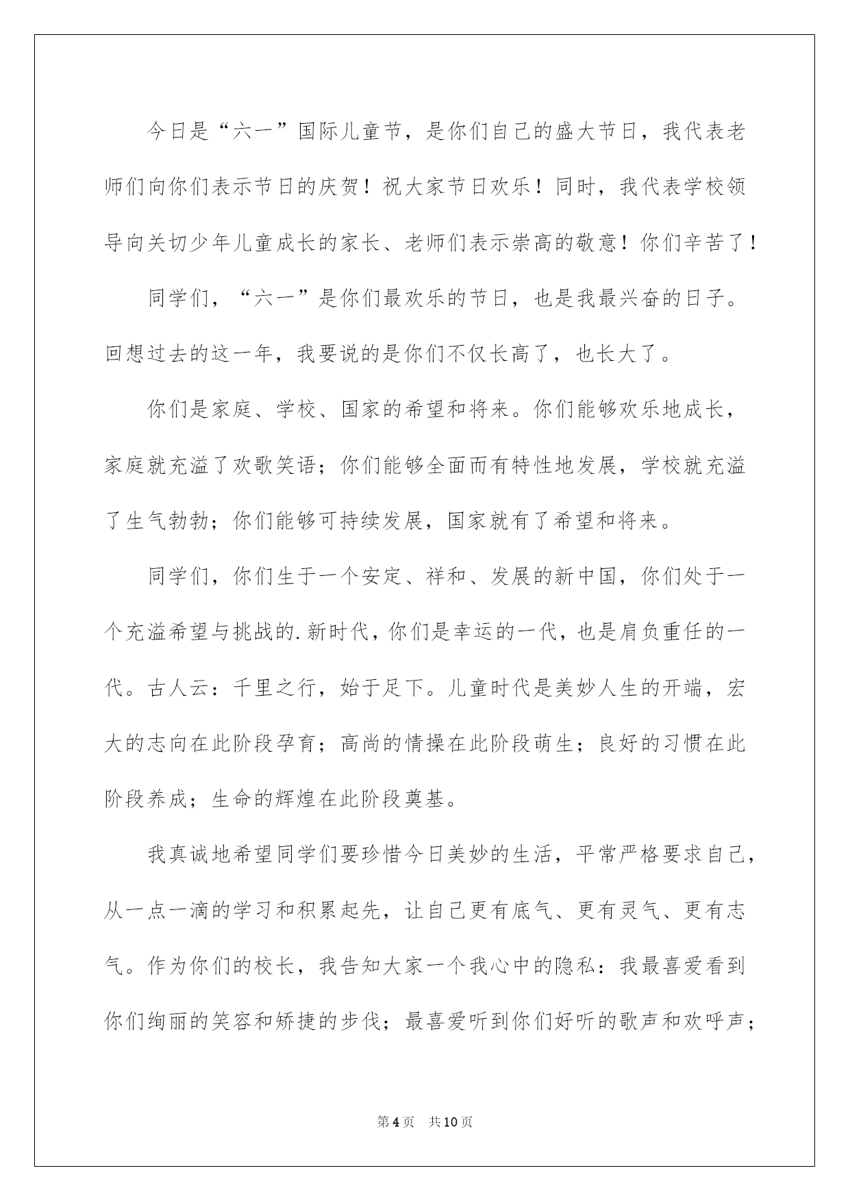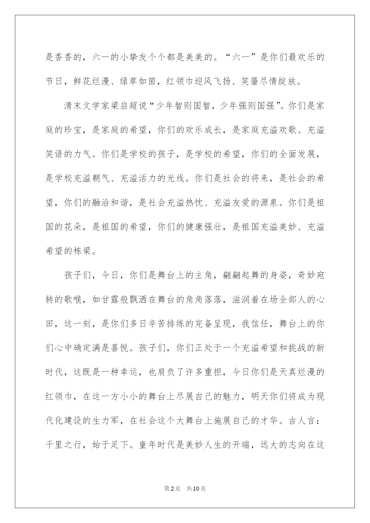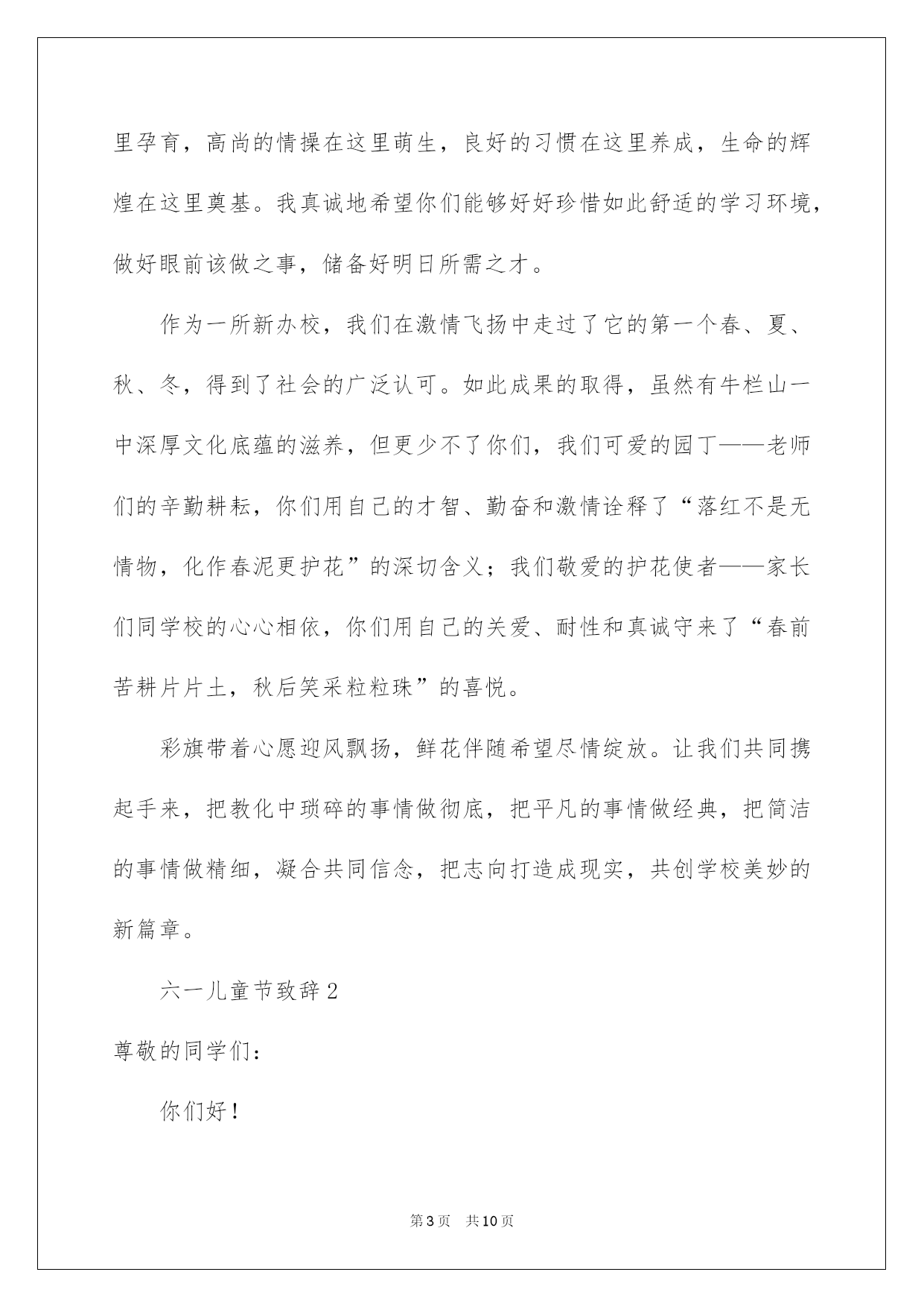 第PAGE\*Arabic\*MERGEFORMAT10页共NUMPAGES\*Arabic\*MERGEFORMAT10页第PAGE\*MERGEFORMAT10页共NUMPAGES\*MERGEFORMAT10页第PAGE\*MERGEFORMAT10页共NUMPAGES\*MERGEFORMAT10页第PAGE\*MERGEFORMAT10页共NUMPAGES\*MERGEFORMAT10页第PAGE\*MERGEFORMAT10页共NUMPAGES\*MERGEFORMAT10页第PAGE\*MERGEFORMAT10页共NUMPAGES\*MERGEFORMAT10页第PAGE\*MERGEFORMAT10页共NUMPAGES\*MERGEFORMAT10页第PAGE\*MERGEFORMAT10页共NUMPAGES\*MERGEFORMAT10页第PAGE\*MERGEFORMAT10页共NUMPAGES\*MERGEFORMAT10页第PAGE\*MERGEFORMAT10页共NUMPAGES\*MERGEFORMAT10页第PAGE\*MERGEFORMAT10页共NUMPAGES\*MERGEFORMAT10页2022六一儿童节致辞六一儿童节致辞范文(通用5篇)无论是身处学校还是步入社会,大家都不行避开地要接触到致辞吧,致辞是指在仪式上所讲的表示勉励、感谢、庆贺、哀悼等的话。那什么样的致辞才具有启发意义呢?下面是我帮大家整理的六一儿童节致辞范文(通用5篇),供大家参考借鉴,希望可以帮助到有须要的挚友。六一儿童节致辞1敬重的家长、尊敬的老师、敬爱的孩子们:当时夏的第一缕阳光映射我们喜悦的面庞时,当朵朵绚烂娇艳的花儿竞相开放时,我们又迎来了孩子们自己的节日——六一国际儿童节,在此,我谨代表学校向全体学生致以最真诚的节日问候,祝你们在牛栏山一中试验学校小学部这个大家庭里学好、玩好,祝老师们能怀揣着“倾心培育、静待花开”的办学理念,实现自己的教化幻想,祝各位家长能在陪伴孩子们成长的路程中收获最多的华蜜和希望!我记着有一首歌是这样唱的:六一的歌儿是甜甜的,六一的花儿是香香的,六一的小挚友个个都是美美的。“六一”是你们最欢乐的节日,鲜花烂漫、绿草如茵,红领巾迎风飞扬、笑靥尽情绽放。清末文学家梁启超说“少年智则国智,少年强则国强”。你们是家庭的珍宝,是家庭的希望,你们的欢乐成长,是家庭充溢欢歌、充溢笑语的力气。你们是学校的孩子,是学校的希望,你们的全面发展,是学校充溢朝气、充溢活力的光线。你们是社会的将来,是社会的希望,你们的融洽和谐,是社会充溢热忱、充溢友爱的源泉。你们是祖国的花朵,是祖国的希望,你们的健康强壮,是祖国充溢美妙、充溢希望的栋梁。孩子们,今日,你们是舞台上的主角,翩翩起舞的身姿,奇妙宛转的歌喉,如甘露般飘洒在舞台的角角落落,滋润着在场全部人的心田,这一刻,是你们多日辛苦排练的完备呈现,我信任,舞台上的你们心中确定满是喜悦。孩子们,你们正处于一个充溢希望和挑战的新时代,这既是一种幸运,也肩负了许多重担,今日你们是天真烂漫的红领巾,在这一方小小的舞台上尽展自己的魅力,明天你们将成为现代化建设的生力军,在社会这个大舞台上施展自己的才华。古人言:千里之行,始于足下。童年时代是美妙人生的开端,远大的志向在这里孕育,高尚的情操在这里萌生,良好的习惯在这里养成,生命的辉煌在这里奠基。我真诚地希望你们能够好好珍惜如此舒适的学习环境,做好眼前该做之事,储备好明日所需之才。作为一所新办校,我们在激情飞扬中走过了它的第一个春、夏、秋、冬,得到了社会的广泛认可。如此成果的取得,虽然有牛栏山一中深厚文化底蕴的滋养,但更少不了你们,我们可爱的园丁——老师们的辛勤耕耘,你们用自己的才智、勤奋和激情诠释了“落红不是无情物,化作春泥更护花”的深切含义;我们敬爱的护花使者——家长们同学校的心心相依,你们用自己的关爱、耐性和真诚守来了“春前苦耕片片土,秋后笑采粒粒珠”的喜悦。彩旗带着心愿迎风飘扬,鲜花伴随希望尽情绽放。让我们共同携起手来,把教化中琐碎的事情做彻底,把平凡的事情做经典,把简洁的事情做精细,凝合共同信念,把志向打造成现实,共创学校美妙的新篇章。六一儿童节致辞2尊敬的同学们:你们好!今日是“六一”国际儿童节,是你们自己的盛大节日,我代表老师们向你们表示节日的庆贺!祝大家节日欢乐!同时,我代表学校领导向关切少年儿童成长的家长、老师们表示崇高的敬意!你们辛苦了!同学们,“六一”是你们最欢乐的节日,也是我最兴奋的日子。回想过去的这一年,我要说的是你们不仅长高了,也长大了。你们是家庭、学