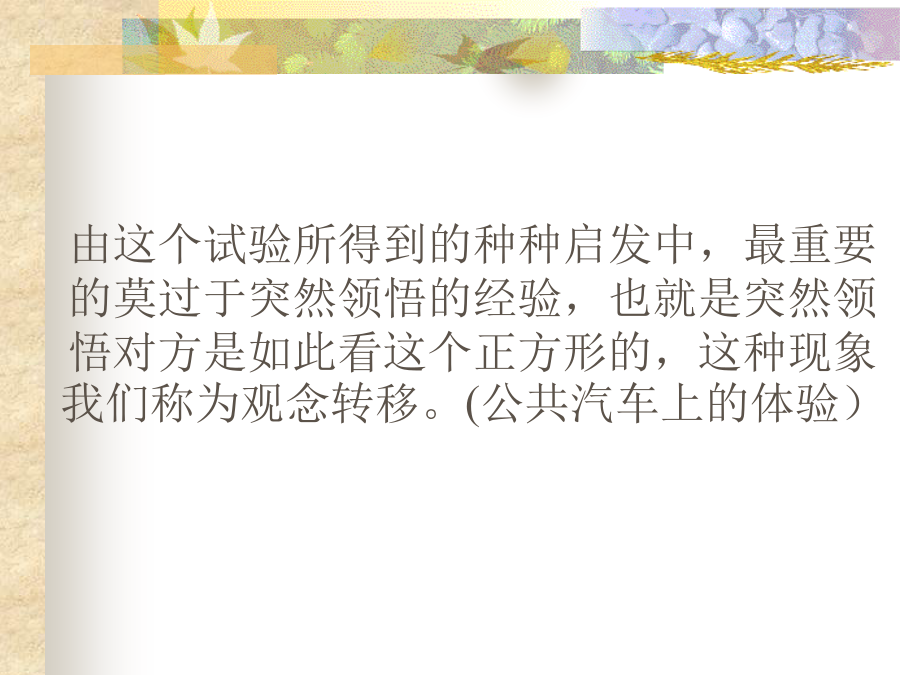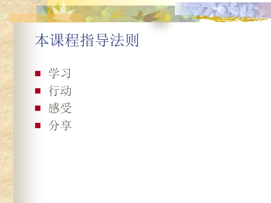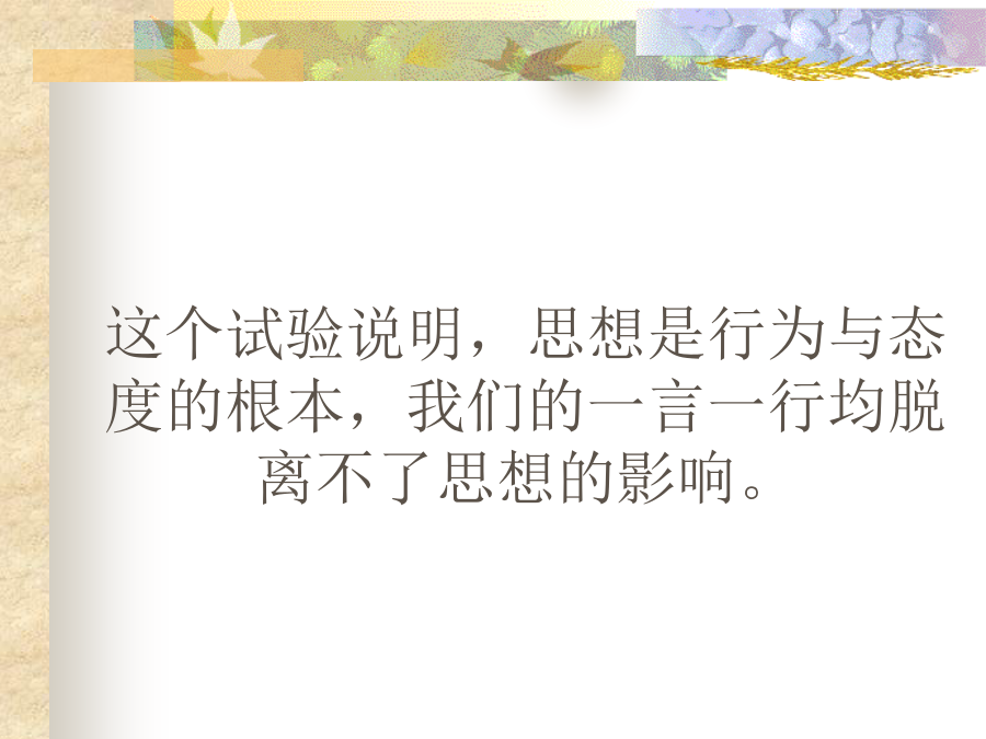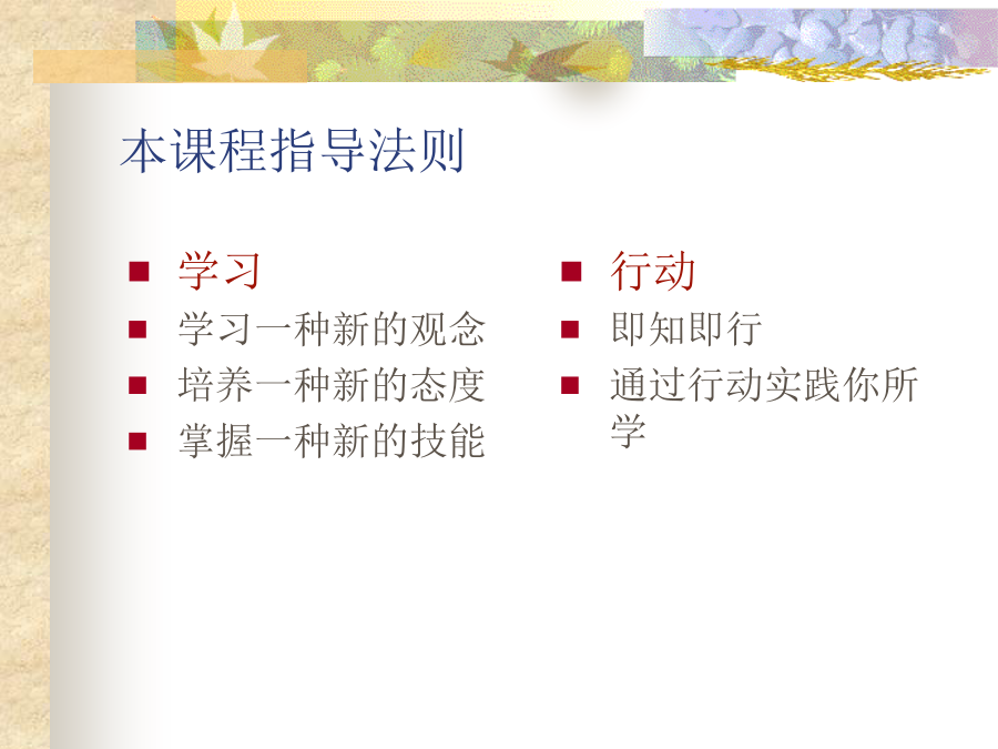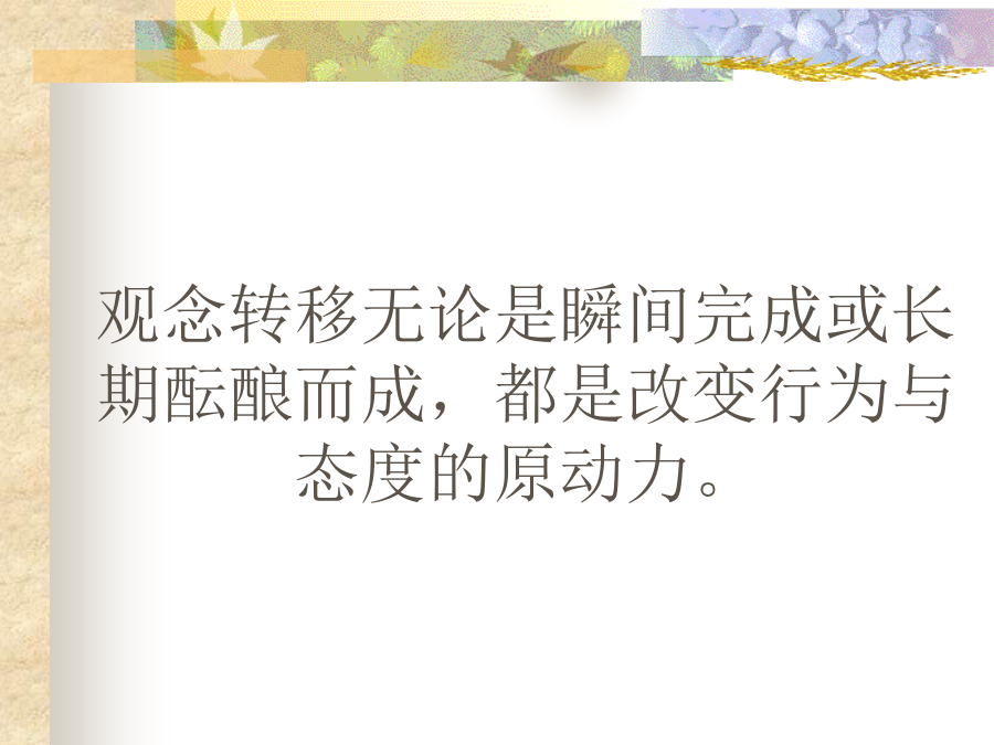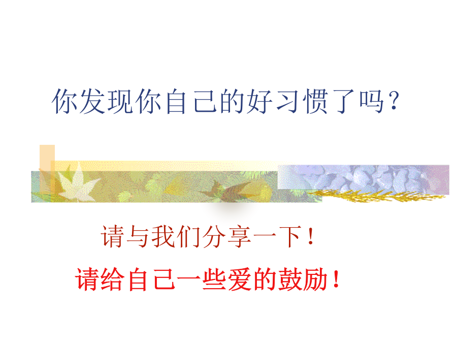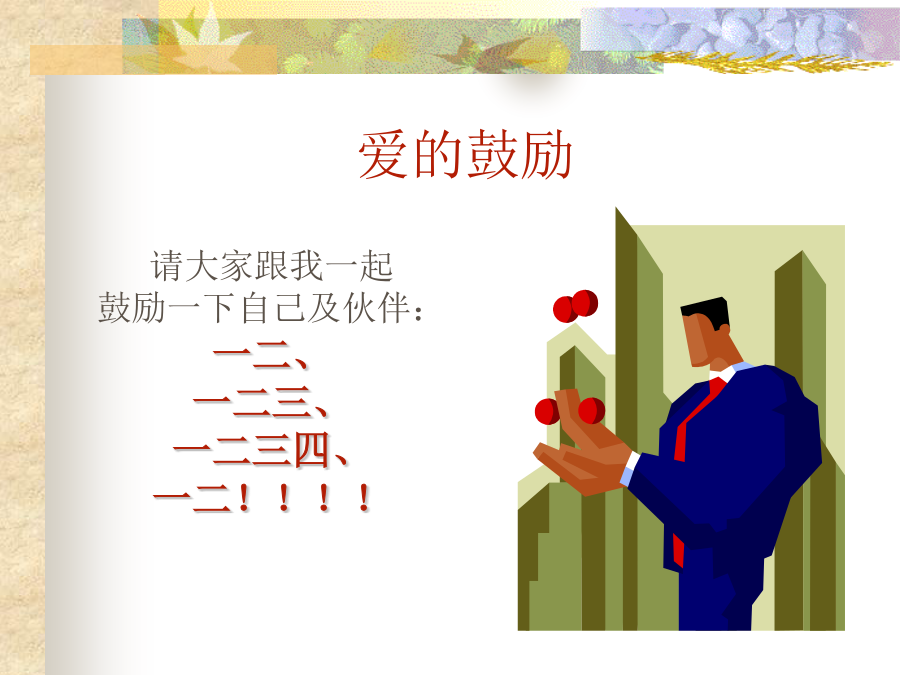 请签名!爱的鼓励这个试验说明,思想是行为与态度的根本,我们的一言一行均脱离不了思想的影响。由这个试验所得到的种种启发中,最重要的莫过于突然领悟的经验,也就是突然领悟对方是如此看这个正方形的,这种现象我们称为观念转移。(公共汽车上的体验)观念转移无论是瞬间完成或长期酝酿而成,都是改变行为与态度的原动力。本课程指导法则本课程指导法则本课程指导法则你发现你自己的好习惯了吗?这些好习惯带给了你什么?我们会发现:今天的议程:速食主义与自然法则对比速食主义与自然法则对比成功学追求成功?追求成功?追求成功?成功无捷径成功的根本讨论:什么叫做成功?目标----你的目标由你选择行动----成功是靠行动而成改变从你的行动中展开从行动中建立习惯成长的三个层次:成长层次的影响:通过习惯形成性格讨论:发现不同的性格改变你自己!如果你希望在工作上享有更多自主,那么先做个更负责尽职的员工吧!如果你希望获得信任,那么先做个值得信任的人。从观念与品德做起,由内而外全面塑造自己!个人你准备好钥匙了吗?先让我们轻松一下!分享主动积极积极心态助你成功掌握你最大的自由选择的自由“除非你同意,任何人都不能伤害你。”——EleanorRoosevelt“若非拱手让人,任何人无法剥夺我们的自尊。”——圣雄甘地为什么会成功?成功的人讨论:有没有命运?关切范围与影响范围人生的问题的解决之道砌墙工人的命运主动积极主动积极主动积极主动积极主动积极我们不能改变生命的长度,但我们可以选择生命的宽度。我们不能左右天气,但我们可以改变心情。我们不能改变容貌,但我们可以展现笑容。我们不能控制他人,但我们可以掌握自己。我们不能预知明天,但我们可以利用今天。我们不能样样胜利,但我们可以事事尽力。愿大家都能以主动积极的心态来面对每一天……主动积极受制于人主动积极积极主动的本质练习:10天心理挑战分享Haveabreak目标管理目标管理什么是价值观?什么是目标?一位企业主管的人生目标:订立目标的技巧:以终为始如何设定目标目标管理系统目标管理成功三原则面对自己——你认识你自己吗?你能实现目标!因为你拥有很多要事第一要事第一——忙要忙得有意义什么是要事?讨论:什么是你的要事?为什么要事第一?重要和紧急的不同之处在于:时间管理象限图如何做要事第一如何做要事第一要事第一把握今天时间管理时间管理认请时间大盗掌握的秘决:计划如何做有效的每日计划如何善用你的PLANNER如何善用你的PLANNER分享游戏:红与黑双赢思维什么是双赢?心理测验:你最先放弃什么?它们代表:双赢思维的品格双赢步骤:双赢的关系树立协同竞争新观念开设你的情感帐户,存入六种情感存款三分钟的时间,请你的同伴为你做一个评价。知彼解已知彼解已——做个“双向传播”的聆听者沟通有两大原则:自己充分表达意思,而且对方容易了解真义。沟通不良的四大弊病影响知彼解已的因素倾听的种类有:何谓有同理心倾听?同理性倾听带给你什么好处?倾听的步骤:倾听的步骤:说话的技巧:说话技巧要求:友好的态度表现于:练习:分享Haveabreak集思广益、统合综效通常的情况第三方案:能集思广益的讨论模式第三方案:让我们轻松一下!不断更新我们在什么时代?我们在什么时代?这个时代的忠诚这个时代的忠诚这个时代的忠诚这个时代的忠诚:这个时代的忠诚:这个时代的忠诚:这个时代的忠诚:这个时代的忠诚:这个时代的忠诚:所以最佳的“自我投资策略”不断更新的成长原则“工欲善其事,必先利其器”我们这个时代我们这个时代我们这个时代不断更新请切记:请切记:七个好习惯相辅相成分享让我们现在就开始吧!谢谢!