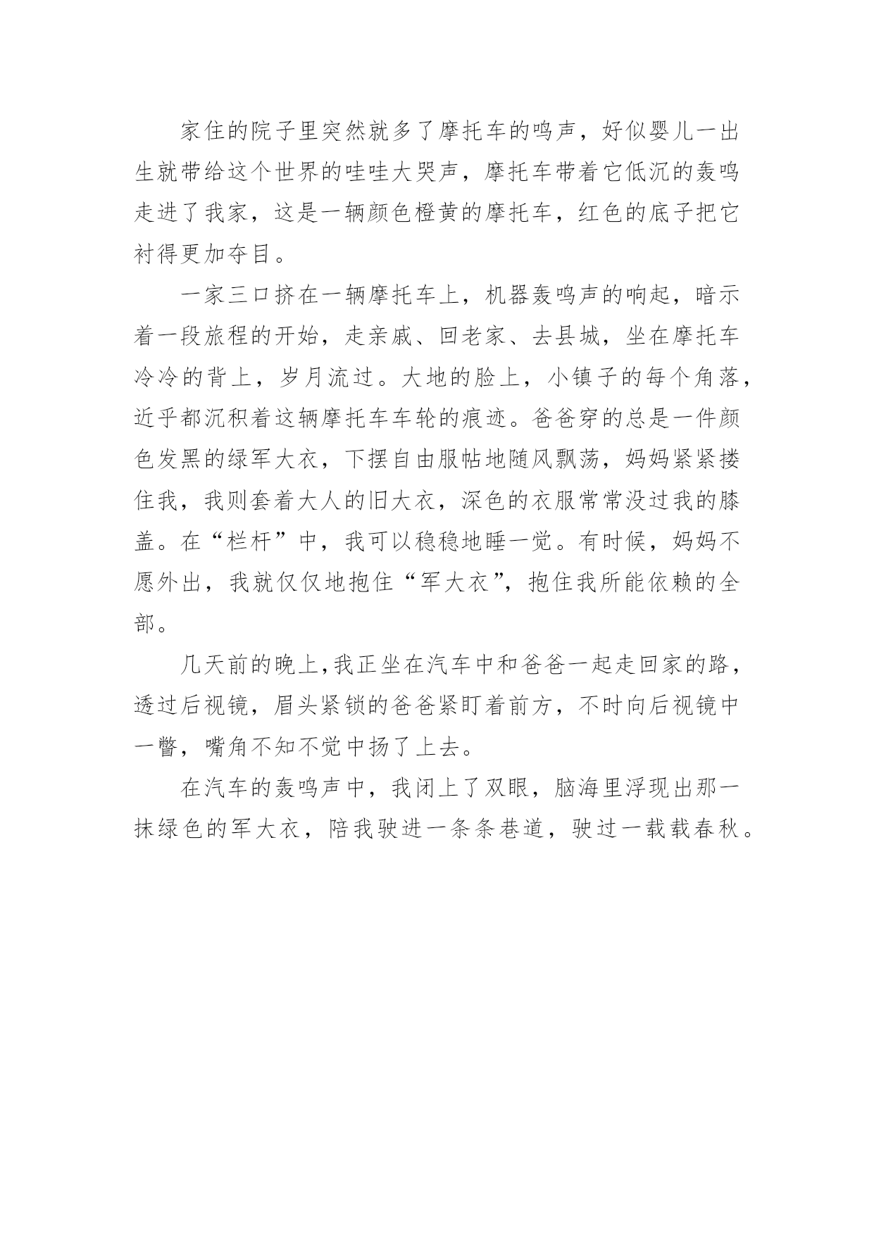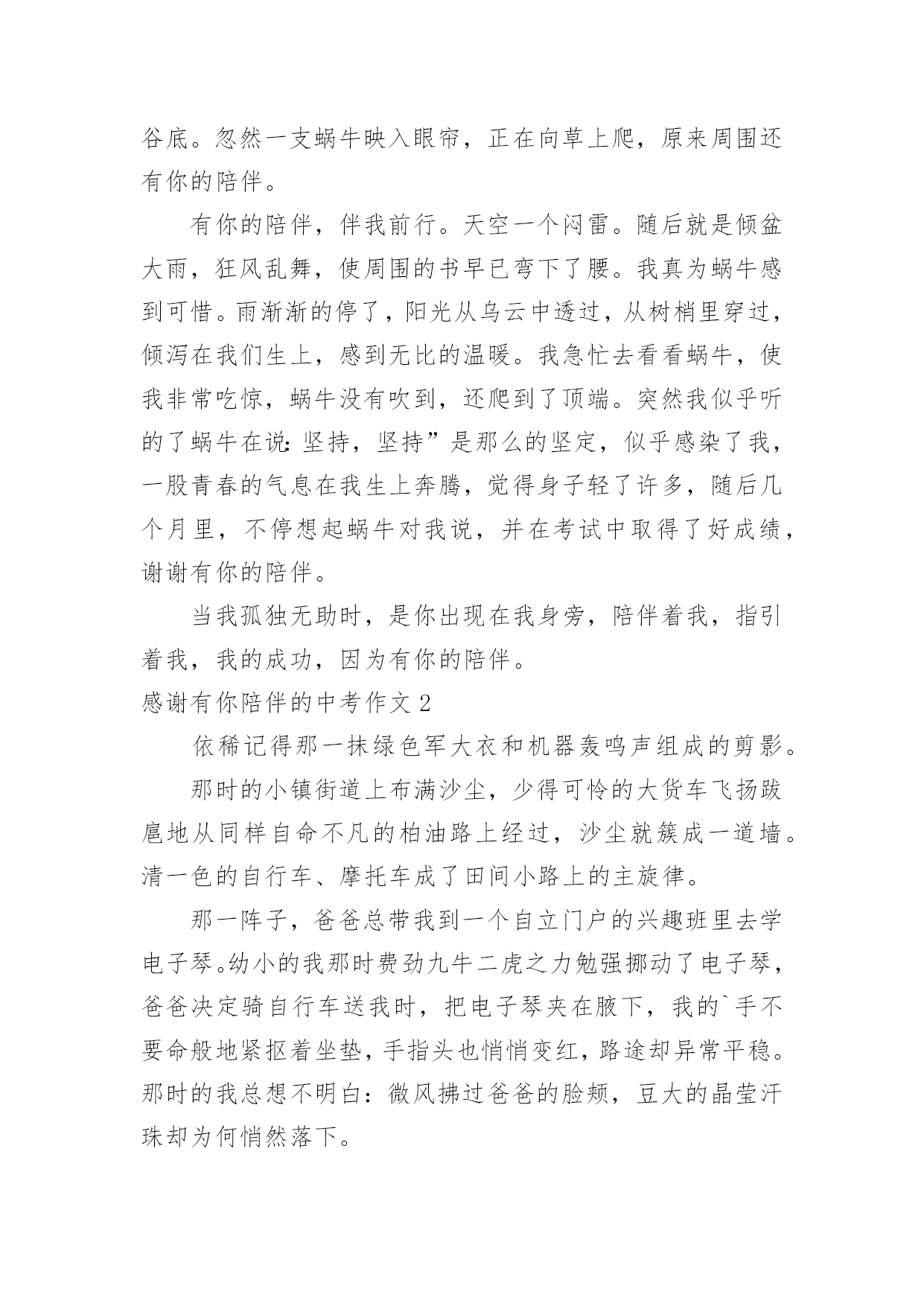 感谢有你陪伴的中考作文感谢有你陪伴的中考作文在日常学习、工作和生活中,许多人都写过作文吧,作文是经过人的思想考虑和语言组织,通过文字来表达一个主题意义的记叙方法。你知道作文怎样才能写的好吗?下面是小编为大家整理的感谢有你陪伴的中考作文,希望能够帮助到大家。感谢有你陪伴的中考作文1人生就像一条蜿蜒曲折的小道,充满着未知的挑战和艰巨的困难,有“失败”的荆棘和灌木,有“挫折”的枝叶藤萝,有“磨炼”的阴雨雾霾,一路磕磕绊绊,唯有你的陪伴蜗牛,让我披荆斩棘,迈向成功。有你的陪伴,温暖我心。教室里静悄悄的,只听见沙沙的发试卷的声音,同学们顶着呼吸静静地等待试卷的`到来。忽然一位同学不小心把书碰掉到地上,我的心随之猛跳一下。同桌的试卷已经发下来了,看着同学苦参的脸,再看看试卷上红红的圈,我的心想打鼓似的咚咚直跳。我静静的坐在石板上,风哀鸣,树欲泣,灰蒙蒙的天空,早已明白我心,布满了暗淡的乌云拦住阳光的倾泻。天阴沉沉的,不时卦刮来阵阵冷风,刮在脸里疼在心里。响起老师那一句句的教训,同学的一张张不服的脸孔,我的心低到了谷底。忽然一支蜗牛映入眼帘,正在向草上爬,原来周围还有你的陪伴。有你的陪伴,伴我前行。天空一个闷雷。随后就是倾盆大雨,狂风乱舞,使周围的书早已弯下了腰。我真为蜗牛感到可惜。雨渐渐的停了,阳光从乌云中透过,从树梢里穿过,倾泻在我们生上,感到无比的温暖。我急忙去看看蜗牛,使我非常吃惊,蜗牛没有吹到,还爬到了顶端。突然我似乎听的了蜗牛在说:坚持,坚持”是那么的坚定,似乎感染了我,一股青春的气息在我生上奔腾,觉得身子轻了许多,随后几个月里,不停想起蜗牛对我说,并在考试中取得了好成绩,谢谢有你的陪伴。当我孤独无助时,是你出现在我身旁,陪伴着我,指引着我,我的成功,因为有你的陪伴。感谢有你陪伴的中考作文2依稀记得那一抹绿色军大衣和机器轰鸣声组成的剪影。那时的小镇街道上布满沙尘,少得可怜的大货车飞扬跋扈地从同样自命不凡的柏油路上经过,沙尘就簇成一道墙。清一色的自行车、摩托车成了田间小路上的主旋律。那一阵子,爸爸总带我到一个自立门户的兴趣班里去学电子琴。幼小的我那时费劲九牛二虎之力勉强挪动了电子琴,爸爸决定骑自行车送我时,把电子琴夹在腋下,我的`手不要命般地紧抠着坐垫,手指头也悄悄变红,路途却异常平稳。那时的我总想不明白:微风拂过爸爸的脸颊,豆大的晶莹汗珠却为何悄然落下。家住的院子里突然就多了摩托车的鸣声,好似婴儿一出生就带给这个世界的哇哇大哭声,摩托车带着它低沉的轰鸣走进了我家,这是一辆颜色橙黄的摩托车,红色的底子把它衬得更加夺目。一家三口挤在一辆摩托车上,机器轰鸣声的响起,暗示着一段旅程的开始,走亲戚、回老家、去县城,坐在摩托车冷冷的背上,岁月流过。大地的脸上,小镇子的每个角落,近乎都沉积着这辆摩托车车轮的痕迹。爸爸穿的总是一件颜色发黑的绿军大衣,下摆自由服帖地随风飘荡,妈妈紧紧搂住我,我则套着大人的旧大衣,深色的衣服常常没过我的膝盖。在“栏杆”中,我可以稳稳地睡一觉。有时候,妈妈不愿外出,我就仅仅地抱住“军大衣”,抱住我所能依赖的全部。几天前的晚上,我正坐在汽车中和爸爸一起走回家的路,透过后视镜,眉头紧锁的爸爸紧盯着前方,不时向后视镜中一瞥,嘴角不知不觉中扬了上去。在汽车的轰鸣声中,我闭上了双眼,脑海里浮现出那一抹绿色的军大衣,陪我驶进一条条巷道,驶过一载载春秋。