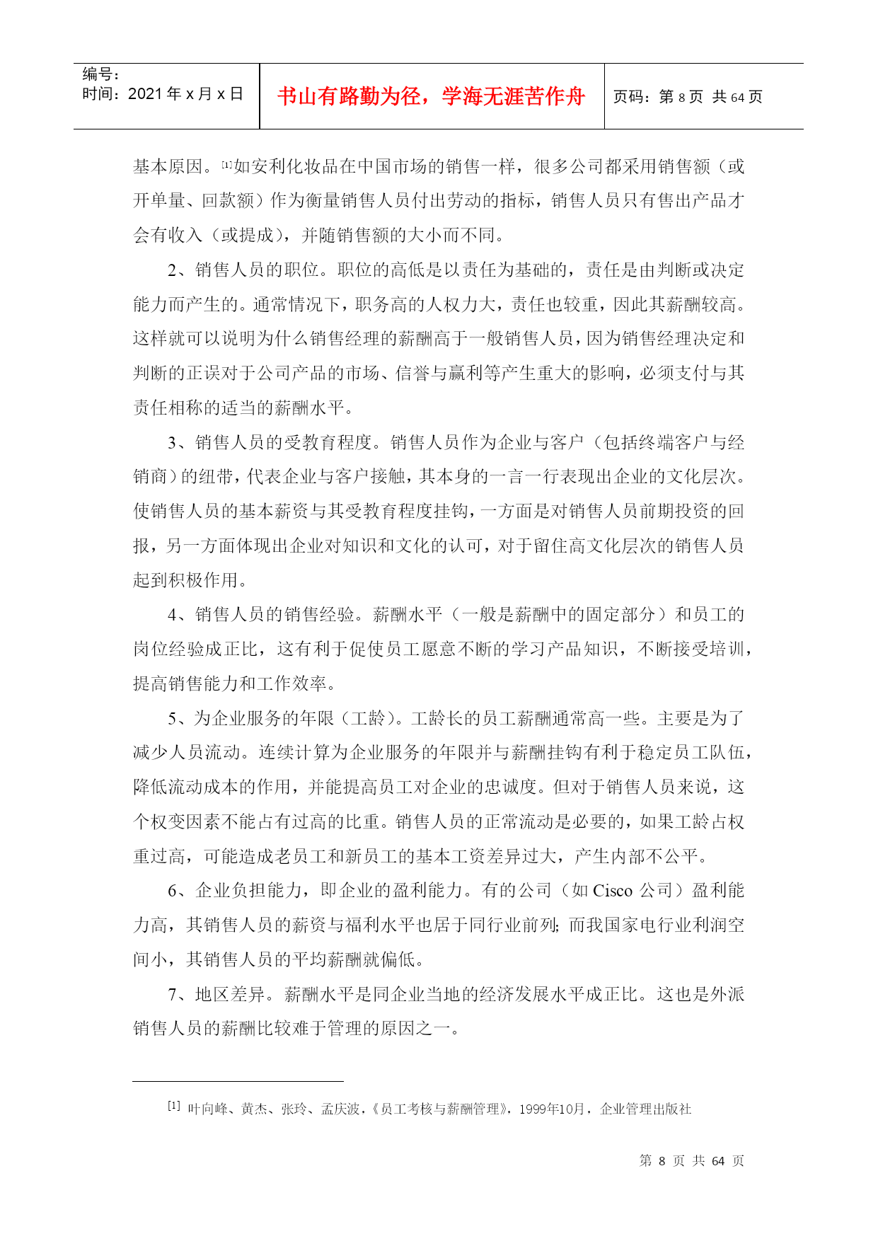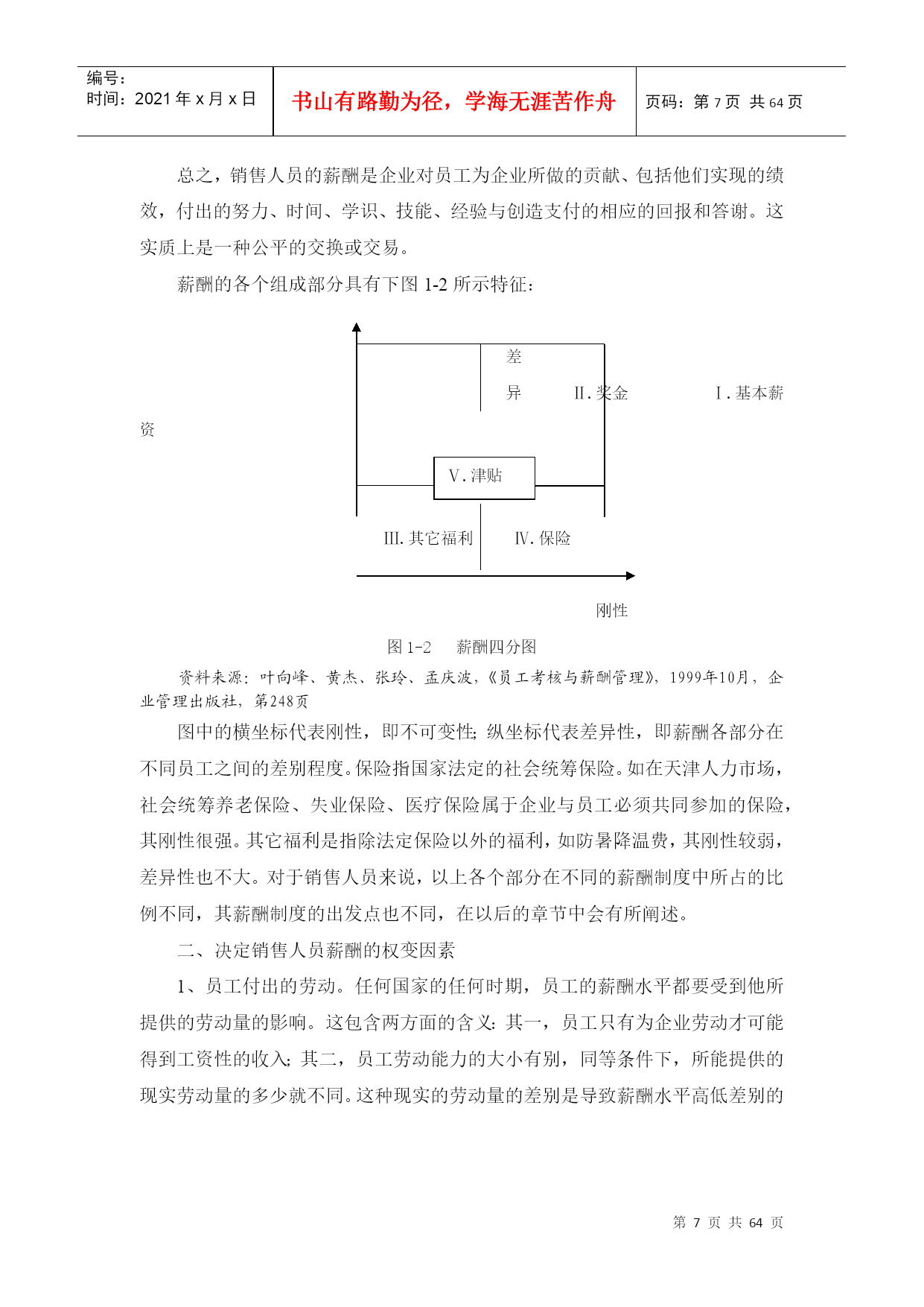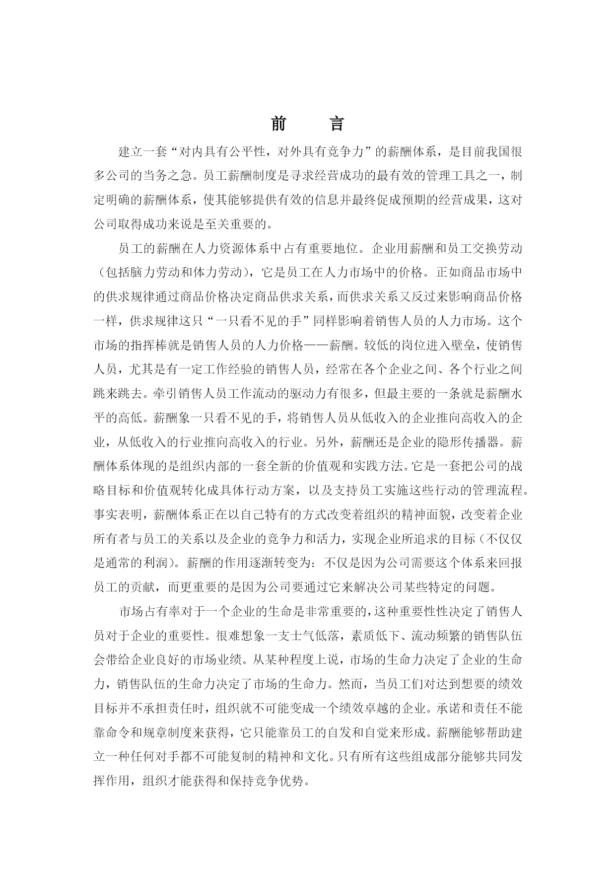编号:时间:2021年x月x日书山有路勤为径,学海无涯苦作舟页码:第PAGE64页共NUMPAGES64页第PAGE\*MERGEFORMAT64页共NUMPAGES\*MERGEFORMAT64页前言建立一套“对内具有公平性,对外具有竞争力”的薪酬体系,是目前我国很多公司的当务之急。员工薪酬制度是寻求经营成功的最有效的管理工具之一,制定明确的薪酬体系,使其能够提供有效的信息并最终促成预期的经营成果,这对公司取得成功来说是至关重要的。员工的薪酬在人力资源体系中占有重要地位。企业用薪酬和员工交换劳动(包括脑力劳动和体力劳动),它是员工在人力市场中的价格。正如商品市场中的供求规律通过商品价格决定商品供求关系,而供求关系又反过来影响商品价格一样,供求规律这只“一只看不见的手”同样影响着销售人员的人力市场。这个市场的指挥棒就是销售人员的人力价格——薪酬。较低的岗位进入壁垒,使销售人员,尤其是有一定工作经验的销售人员,经常在各个企业之间、各个行业之间跳来跳去。牵引销售人员工作流动的驱动力有很多,但最主要的一条就是薪酬水平的高低。薪酬象一只看不见的手,将销售人员从低收入的企业推向高收入的企业,从低收入的行业推向高收入的行业。另外,薪酬还是企业的隐形传播器。薪酬体系体现的是组织内部的一套全新的价值观和实践方法。它是一套把公司的战略目标和价值观转化成具体行动方案,以及支持员工实施这些行动的管理流程。事实表明,薪酬体系正在以自己特有的方式改变着组织的精神面貌,改变着企业所有者与员工的关系以及企业的竞争力和活力,实现企业所追求的目标(不仅仅是通常的利润)。薪酬的作用逐渐转变为:不仅是因为公司需要这个体系来回报员工的贡献,而更重要的是因为公司要通过它来解决公司某些特定的问题。市场占有率对于一个企业的生命是非常重要的,这种重要性性决定了销售人员对于企业的重要性。很难想象一支士气低落,素质低下、流动频繁的销售队伍会带给企业良好的市场业绩。从某种程度上说,市场的生命力决定了企业的生命力,销售队伍的生命力决定了市场的生命力。然而,当员工们对达到想要的绩效目标并不承担责任时,组织就不可能变成一个绩效卓越的企业。承诺和责任不能靠命令和规章制度来获得,它只能靠员工的自发和自觉来形成。薪酬能够帮助建立一种任何对手都不可能复制的精神和文化。只有所有这些组成部分能够共同发挥作用,组织才能获得和保持竞争优势。正是由于一支销售队伍的质量对于在市场中栉风沐雨的企业如此重要,本文才着重探讨销售人员的薪酬制度。加之销售人员流动率比较大,薪酬公开程度低,薪酬高低差异大,岗位进入壁垒较低,从岗人数较多,因此研究其薪酬制度对于如何开发销售人员的潜力,使之为企业作出最大的贡献,格外有意义。国内外关于薪酬的研究已经很多了,专门针对销售人员的薪酬研究也或多或少的包含于其中。本文对其中的一些文献及文章进行了参考。在现实中,尤其在国外公司中,薪酬制度已经不再仅仅是对员工贡献的一种补偿。薪酬制度作为连接企业和员工的联系纽带,已经成为表明企业发展动向和引导员工行为的一个最有力的信号。这些研究促使管理者把绩效的改进看成是以薪酬的形式发生的投资带来的回报。这种变化是令人激动的,它使人力资源的管理变得更加主动和有战略意义。本人阅读了大量的文献,根据自己多年的人力资源管理经验,结合案例,对销售人员的薪酬计划进行的探讨。在此基础上,提出薪酬制度与绩效考核体系的匹配程度决定了绩效管理的持续性和有效性,薪酬制度与战略之间的匹配程度通常决定了战略是否能够有效实施。所以,本文的第三章和第四章分别就销售人员的薪酬制度与绩效考核的匹配、销售人员的薪酬制度与企业战略的匹配做了探讨。本文中还有一些作者个人的工作体会和经验,愿与有志于人力资源工作的各位同仁切磋并共勉。第一章销售人员的薪酬及其理论基础目前,国内市场竞争空前激烈,怎样才能战胜对手,提高市场占有率呢?这就要考虑企业的薪酬制度能否留住人才,企业员工之间,薪酬是否公平,与其他企业相比,薪酬是否具有竞争性。如果答案是否定的,就需要采取果断的措施,只有那些仅希望保住自己的职位和薪水的平庸的员工才会留在企业中,素质较高,能力出众并想干一番事业的优秀的员工会选择更适合自己发展的、能体现自身价值的企业。本章旨在研究销售人员的特点,明确销售人员薪酬的概念及原则,以便于在科学的理论指导下,设计有效的薪酬制度。销售人员及其管理的特点研究销售人员的薪酬,首先要研究销售人员的特点。销售人员作为企业员工中相对独立的一个群体,有明显的特点。一、销售人员的群体特点1、工作时间自由,单独行动多。2、工作绩效可以用具体成果显示出来。3、工作业绩的不稳定性。4、对工作的安定性需求不大,销售人员经常想到跳槽以改变自己的工作环境。另一方面,