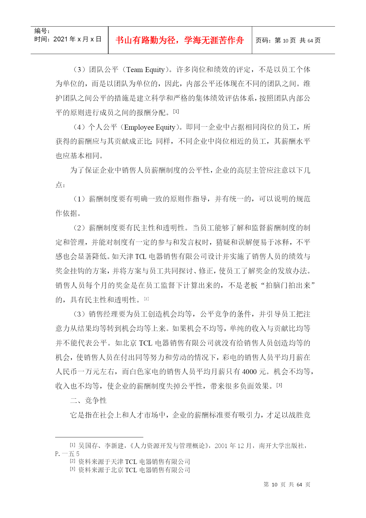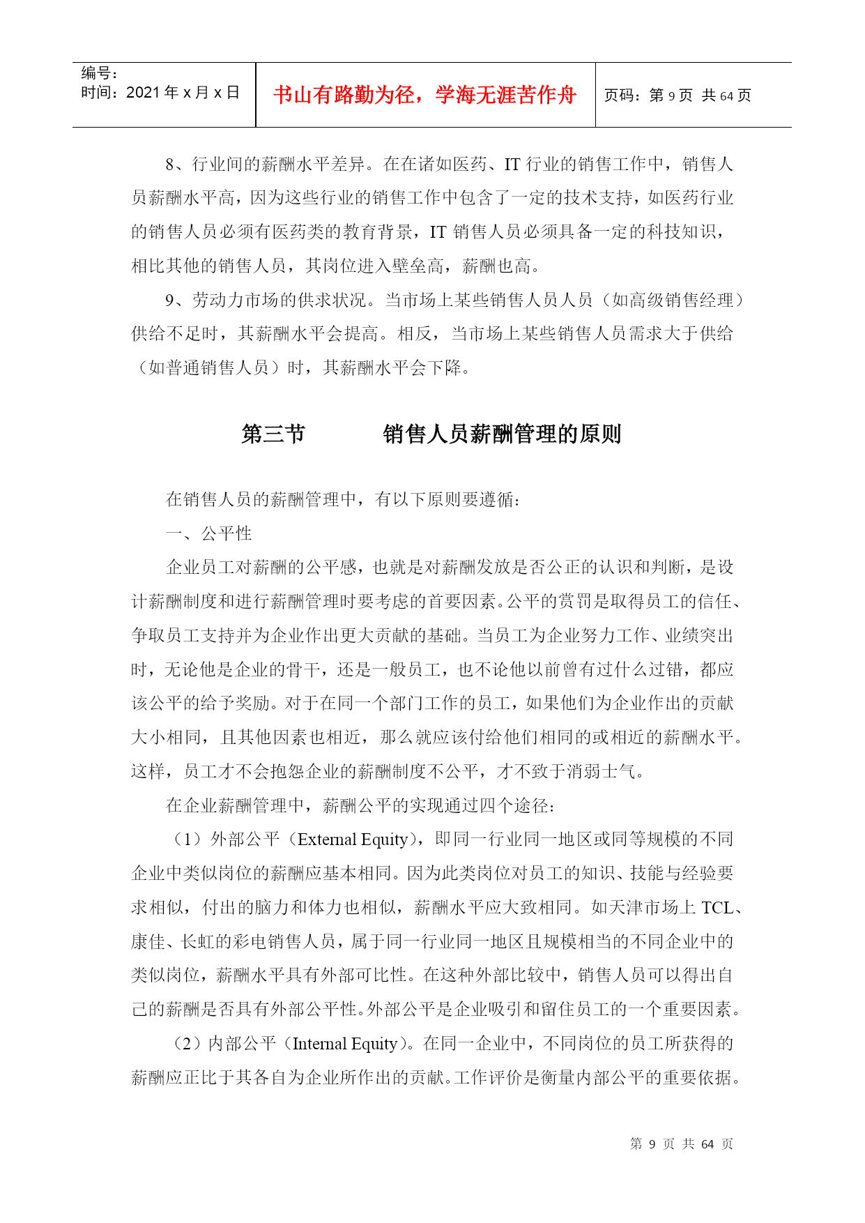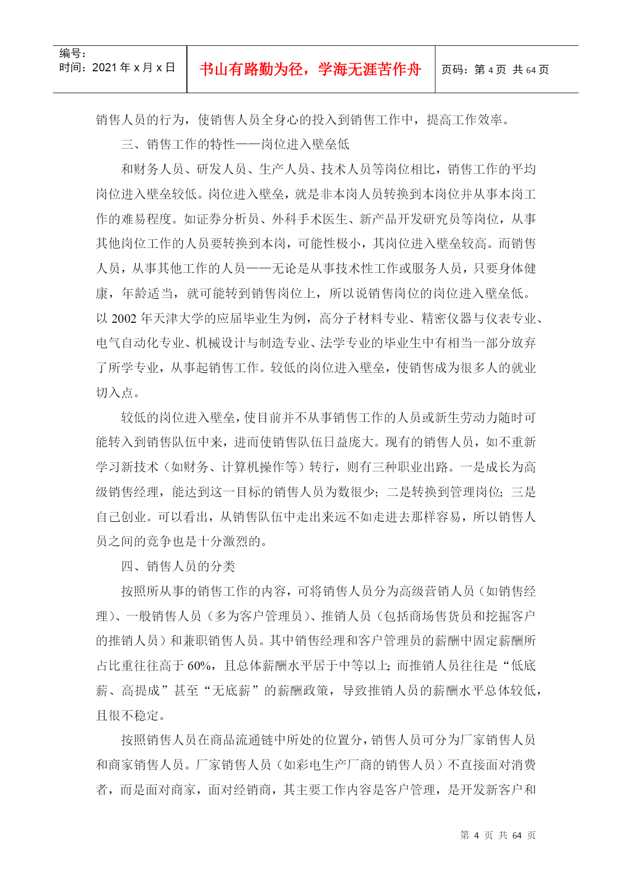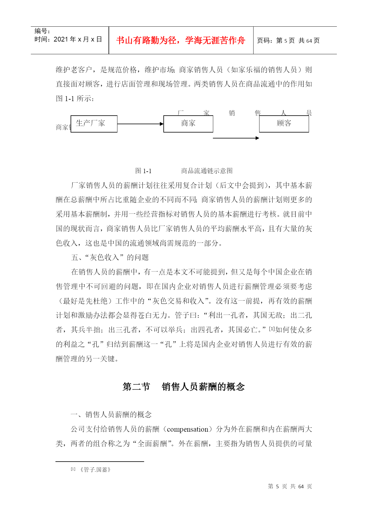 编号:时间:2021年x月x日书山有路勤为径,学海无涯苦作舟页码:第PAGE64页共NUMPAGES64页第PAGE\*MERGEFORMAT64页共NUMPAGES\*MERGEFORMAT64页前言建立一套“对内具有公平性,对外具有竞争力”的薪酬体系,是目前我国很多公司的当务之急。员工薪酬制度是寻求经营成功的最有效的管理工具之一,制定明确的薪酬体系,使其能够提供有效的信息并最终促成预期的经营成果,这对公司取得成功来说是至关重要的。员工的薪酬在人力资源体系中占有重要地位。企业用薪酬和员工交换劳动(包括脑力劳动和体力劳动),它是员工在人力市场中的价格。正如商品市场中的供求规律通过商品价格决定商品供求关系,而供求关系又反过来影响商品价格一样,供求规律这只“一只看不见的手”同样影响着销售人员的人力市场。这个市场的指挥棒就是销售人员的人力价格——薪酬。较低的岗位进入壁垒,使销售人员,尤其是有一定工作经验的销售人员,经常在各个企业之间、各个行业之间跳来跳去。牵引销售人员工作流动的驱动力有很多,但最主要的一条就是薪酬水平的高低。薪酬象一只看不见的手,将销售人员从低收入的企业推向高收入的企业,从低收入的行业推向高收入的行业。另外,薪酬还是企业的隐形传播器。薪酬体系体现的是组织内部的一套全新的价值观和实践方法。它是一套把公司的战略目标和价值观转化成具体行动方案,以及支持员工实施这些行动的管理流程。事实表明,薪酬体系正在以自己特有的方式改变着组织的精神面貌,改变着企业所有者与员工的关系以及企业的竞争力和活力,实现企业所追求的目标(不仅仅是通常的利润)。薪酬的作用逐渐转变为:不仅是因为公司需要这个体系来回报员工的贡献,而更重要的是因为公司要通过它来解决公司某些特定的问题。市场占有率对于一个企业的生命是非常重要的,这种重要性性决定了销售人员对于企业的重要性。很难想象一支士气低落,素质低下、流动频繁的销售队伍会带给企业良好的市场业绩。从某种程度上说,市场的生命力决定了企业的生命力,销售队伍的生命力决定了市场的生命力。然而,当员工们对达到想要的绩效目标并不承担责任时,组织就不可能变成一个绩效卓越的企业。承诺和责任不能靠命令和规章制度来获得,它只能靠员工的自发和自觉来形成。薪酬能够帮助建立一种任何对手都不可能复制的精神和文化。只有所有这些组成部分能够共同发挥作用,组织才能获得和保持竞争优势。正是由于一支销售队伍的质量对于在市场中栉风沐雨的企业如此重要,本文才着重探讨销售人员的薪酬制度。加之销售人员流动率比较大,薪酬公开程度低,薪酬高低差异大,岗位进入壁垒较低,从岗人数较多,因此研究其薪酬制度对于如何开发销售人员的潜力,使之为企业作出最大的贡献,格外有意义。国内外关于薪酬的研究已经很多了,专门针对销售人员的薪酬研究也或多或少的包含于其中。本文对其中的一些文献及文章进行了参考。在现实中,尤其在国外公司中,薪酬制度已经不再仅仅是对员工贡献的一种补偿。薪酬制度作为连接企业和员工的联系纽带,已经成为表明企业发展动向和引导员工行为的一个最有力的信号。这些研究促使管理者把绩效的改进看成是以薪酬的形式发生的投资带来的回报。这种变化是令人激动的,它使人力资源的管理变得更加主动和有战略意义。本人阅读了大量的文献,根据自己多年的人力资源管理经验,结合案例,对销售人员的薪酬计划进行的探讨。在此基础上,提出薪酬制度与绩效考核体系的匹配程度决定了绩效管理的持续性和有效性,薪酬制度与战略之间的匹配程度通常决定了战略是否能够有效实施。所以,本文的第三章和第四章分别就销售人员的薪酬制度与绩效考核的匹配、销售人员的薪酬制度与企业战略的匹配做了探讨。本文中还有一些作者个人的工作体会和经验,愿与有志于人力资源工作的各位同仁切磋并共勉。第一章销售人员的薪酬及其理论基础目前,国内市场竞争空前激烈,怎样才能战胜对手,提高市场占有率呢?这就要考虑企业的薪酬制度能否留住人才,企业员工之间,薪酬是否公平,与其他企业相比,薪酬是否具有竞争性。如果答案是否定的,就需要采取果断的措施,只有那些仅希望保住自己的职位和薪水的平庸的员工才会留在企业中,素质较高,能力出众并想干一番事业的优秀的员工会选择更适合自己发展的、能体现自身价值的企业。本章旨在研究销售人员的特点,明确销售人员薪酬的概念及原则,以便于在科学的理论指导下,设计有效的薪酬制度。销售人员及其管理的特点研究销售人员的薪酬,首先要研究销售人员的特点。销售人员作为企业员工中相对独立的一个群体,有明显的特点。一、销售人员的群体特点1、工作时间自由,单独行动多。2、工作绩效可以用具体成果显示出来。3、工作业绩的不稳定性。4、对工作的安定性需求不大,销售人员经常想到跳槽以改变自己的工作环境。另一方面,