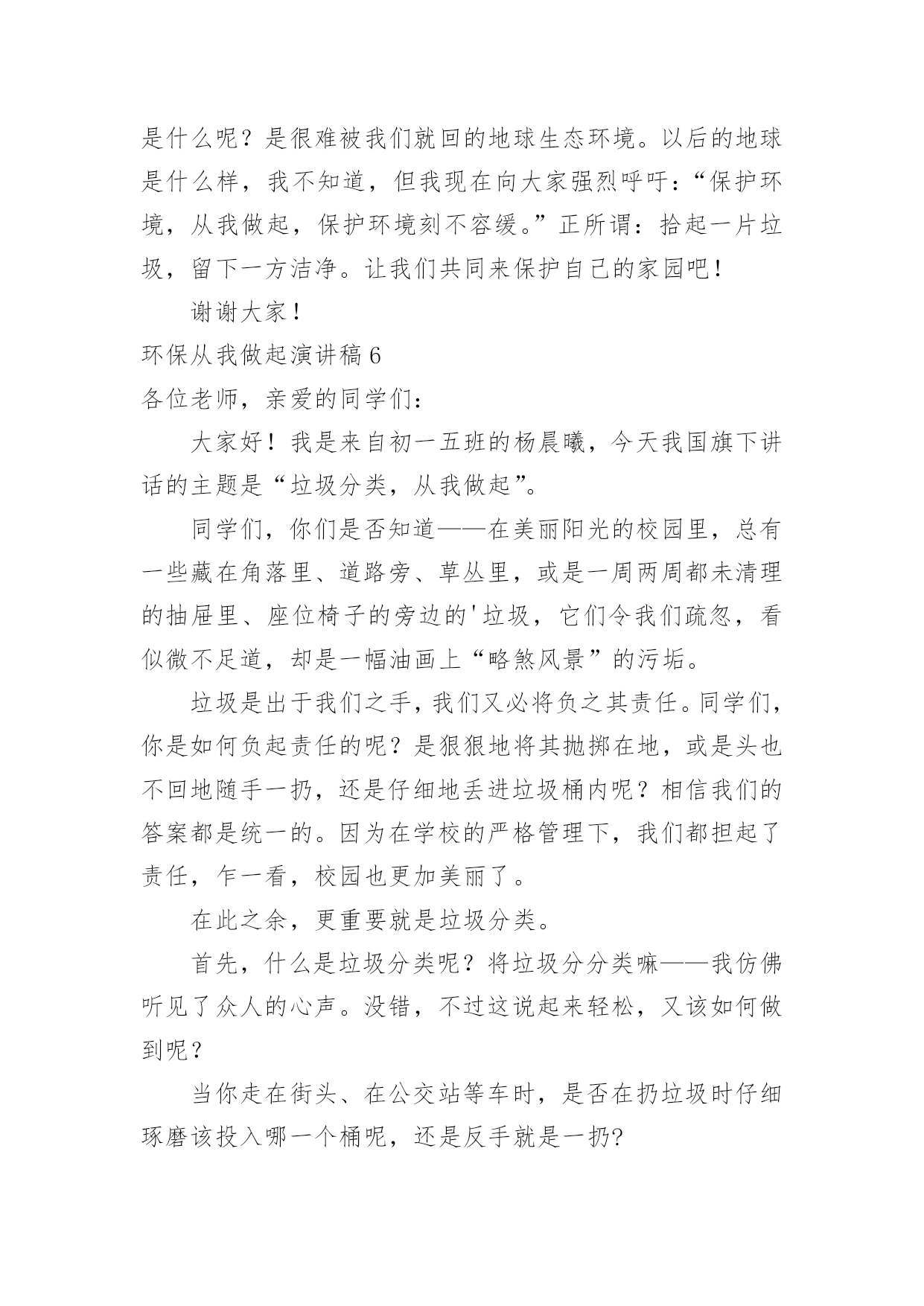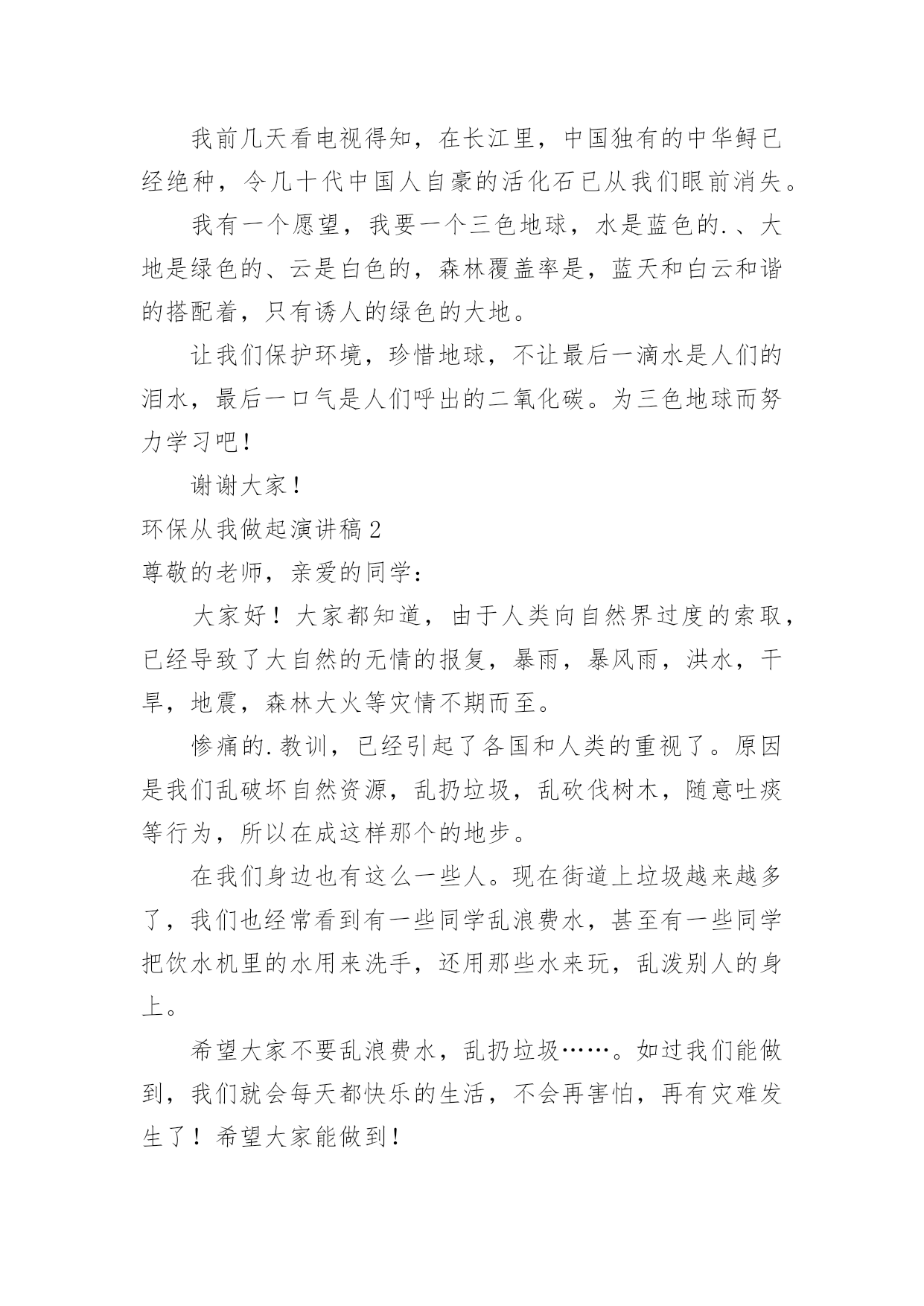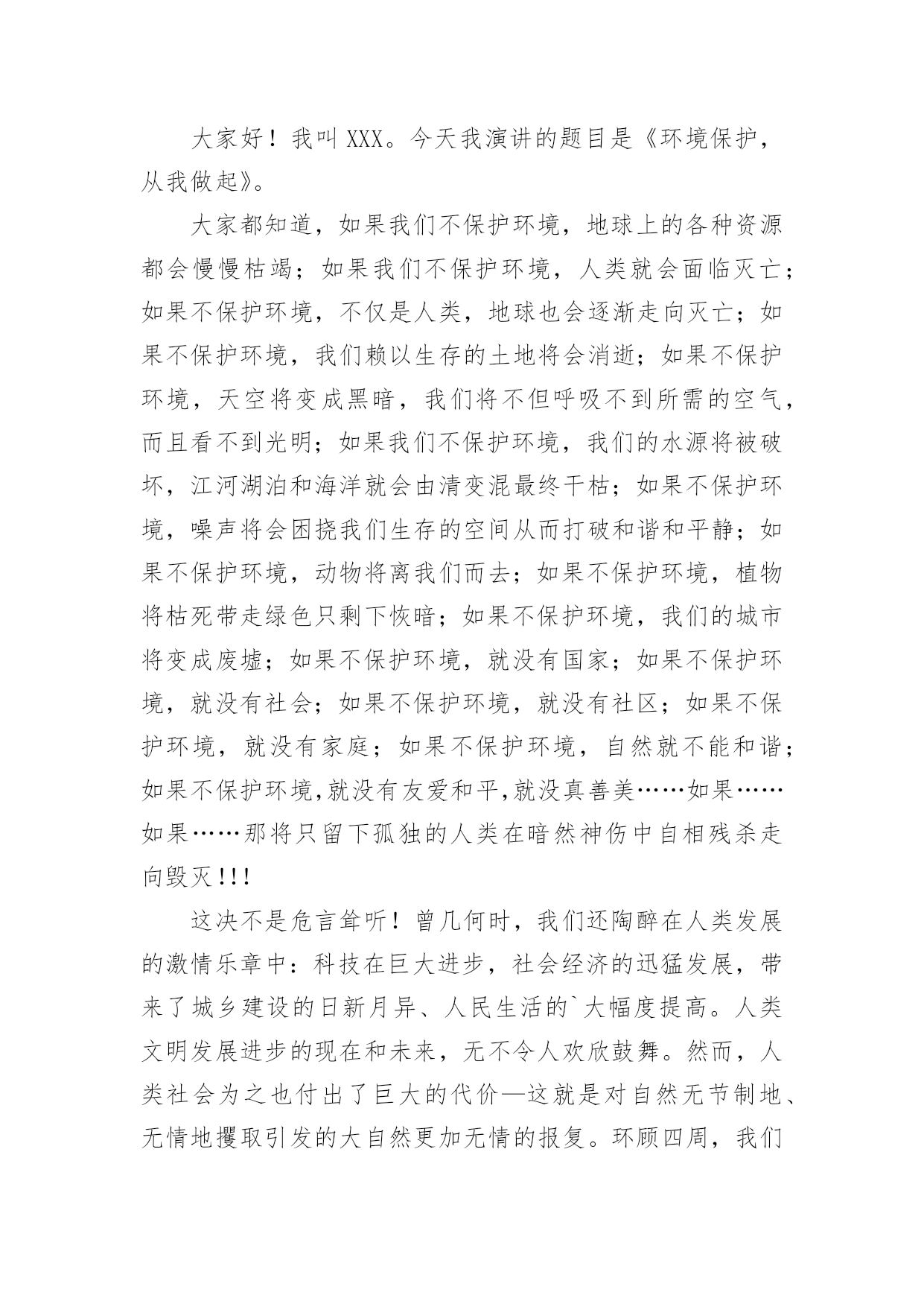 环保从我做起演讲稿环保从我做起演讲稿使用正确的写作思路书写演讲稿会更加事半功倍。在不断进步的时代,我们使用上演讲稿的情况与日俱增,写起演讲稿来就毫无头绪?下面是小编帮大家整理的环保从我做起演讲稿,供大家参考借鉴,希望可以帮助到有需要的朋友。环保从我做起演讲稿1亲爱的同学们:我今天发言的主题是《保护环境,珍惜地球》。我们生活在地球上,因为她是我们能生存的地方。我们离不开阳光,离不开植物,离不开氧气,也离不开水。可是同学们知道吗?地球这位母亲的身上的绿,正一点一点地变黄,科学家们测算,在不久的将来,母亲的绿色会消失,我也曾作过一个真实的梦,梦见全球已被沙漠化,一眼望去,只能看见无边的沙子和黑色的天空,而我向一架飞船走去……可是同学们知道吗?母亲将面临一场灾难——全球气候变暖,南北极冰雪融化,海平面升高,大地淹没,南极上空出现臭氧空洞,空气一点点的流逝,动物大量灭绝……可是同学们知道吗?我们可以直接利用的水只占世界总水量的十万分之七,可以说是微乎其微。可是这些水害不断地被污染着,大地上水的颜色,正不停的变换着……我前几天看电视得知,在长江里,中国独有的中华鲟已经绝种,令几十代中国人自豪的活化石已从我们眼前消失。我有一个愿望,我要一个三色地球,水是蓝色的.、大地是绿色的、云是白色的,森林覆盖率是,蓝天和白云和谐的搭配着,只有诱人的绿色的大地。让我们保护环境,珍惜地球,不让最后一滴水是人们的泪水,最后一口气是人们呼出的二氧化碳。为三色地球而努力学习吧!谢谢大家!环保从我做起演讲稿2尊敬的老师,亲爱的同学:大家好!大家都知道,由于人类向自然界过度的索取,已经导致了大自然的无情的报复,暴雨,暴风雨,洪水,干旱,地震,森林大火等灾情不期而至。惨痛的.教训,已经引起了各国和人类的重视了。原因是我们乱破坏自然资源,乱扔垃圾,乱砍伐树木,随意吐痰等行为,所以在成这样那个的地步。在我们身边也有这么一些人。现在街道上垃圾越来越多了,我们也经常看到有一些同学乱浪费水,甚至有一些同学把饮水机里的水用来洗手,还用那些水来玩,乱泼别人的身上。希望大家不要乱浪费水,乱扔垃圾……。如过我们能做到,我们就会每天都快乐的生活,不会再害怕,再有灾难发生了!希望大家能做到!我想呼吁人们一句话:“爱护地球,你我安全!”环保从我做起演讲稿3敬爱的老师、亲爱的同学们:我今天演讲的主题是节能环保,从我做起!地球是我们赖以生存的美丽家园。然而随着经济和生活水平的提高直接带来的就是垃圾量的激增,环境越来越变得恶劣。最近大家看新闻,可能经常会听到一个词:雾霾。今年1月起,中国中、东部地区就陷入严重“雾霾”之中,全国半数城市都出现了大范围的严重空气污染,这样恶劣、极端空气状况,是汽车尾气,工厂的废气污染等造成的。电影《20xx》中的场景绝非无中生有,在地球家园的美丽倩影渐行渐远之际,倡导“低碳环保生活”刻不容缓!那什么是低碳环保生活呢?低碳环保生活就是减少二氧化碳排放的低能量、低消耗、低开支的节能减排生活方式。“低碳环保生活”有利于减缓全球气候变暖和环境恶化的速度。减少二氧化碳排放,选择“低碳环保生活”,是每位公民应尽的责任,也是每位公民应尽的义务。那怎样才算低碳环保生活呢?今天,就让我们从小事说起吧!一、节约每一张纸在场的同学,我相信大家都离不开纸,而且很多同学的草稿纸应该堆成小山头了!知道吗,我国每生产1吨纸就要耗费20棵大树、100立方米水,如果每人每天浪费一张纸,全国就要浪费约2700吨纸、27万吨水,54000棵大树将化为乌有。因此,节约用纸有利于节约能源和保护树木,有利于减少温室气体的排放,有利于保护我们的生态环境。在此,我提倡大家积极回收废纸、不撕作业本,尽量使用双面草稿纸,努力减少纸张消耗。节约一张纸,保护一片林!二、节约每一度电同学们,家中的电器应该不少吧!而且很多电器随时都处于待机状态吧!电器设备在待机状态下耗电一般为其开机功率的10%左右,家里的电视、空调、音响、电脑、微波炉、饮水机、电热水器等的待机能耗加在一起,相当于开一只30至50瓦的长明灯,照此推算,一户普通人家一年待机而消耗的能源折合人民币近60元,因此,离开房间时,请关上电灯并且拔掉电器插头;离开教室或寝室时,请随手关掉灯、风扇,打下开关。从我做起,取缔无谓的浪费,节约每一度电。三、节约每一升油同学们,在车水马龙的街头,当一股股蓝色的烟气从一辆辆机动车尾部喷出时;当一阵阵气味怪异,令人头昏、恶心的尾气向我们袭来时,你是否以为躲在自家车子里捏着鼻子就能幸免,就能身体健康?告诉你,生活在城市里,谁也无法全身而退!英国的'有关协会曾发表研究报告称,与交通事故遇难者相比,英国每年死于空气污染的人要多出10倍。节约一升油,减少我们对机动车的依赖,减少我们对空气的污染,近距离出行尽可能使用自行车或者步行,让我们人