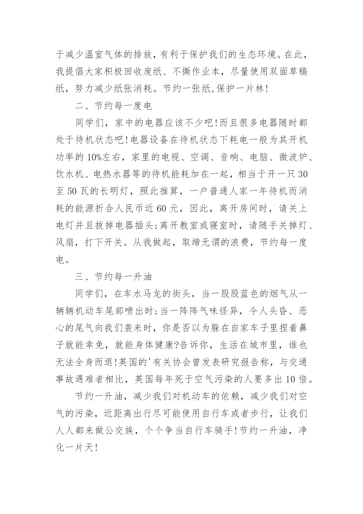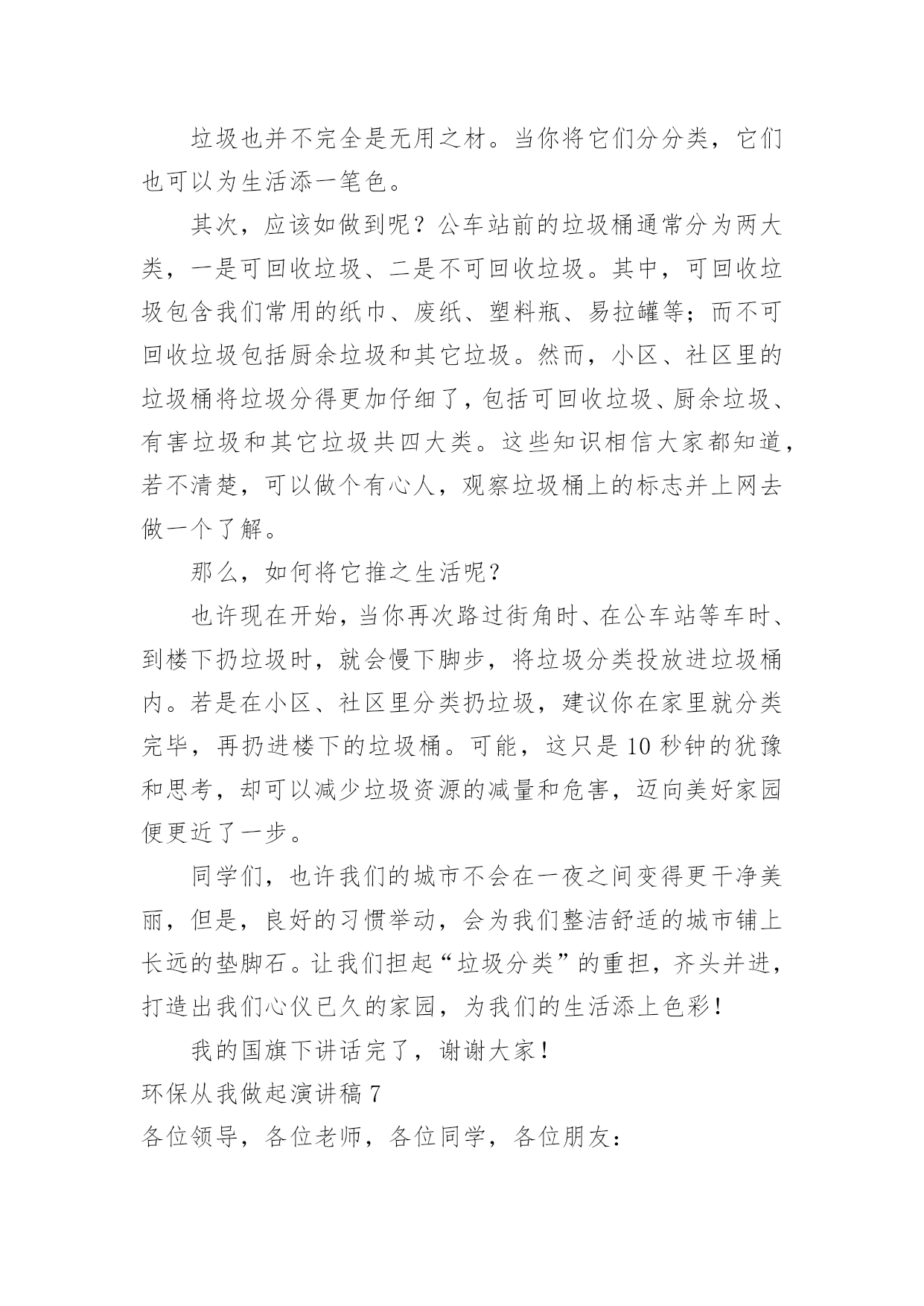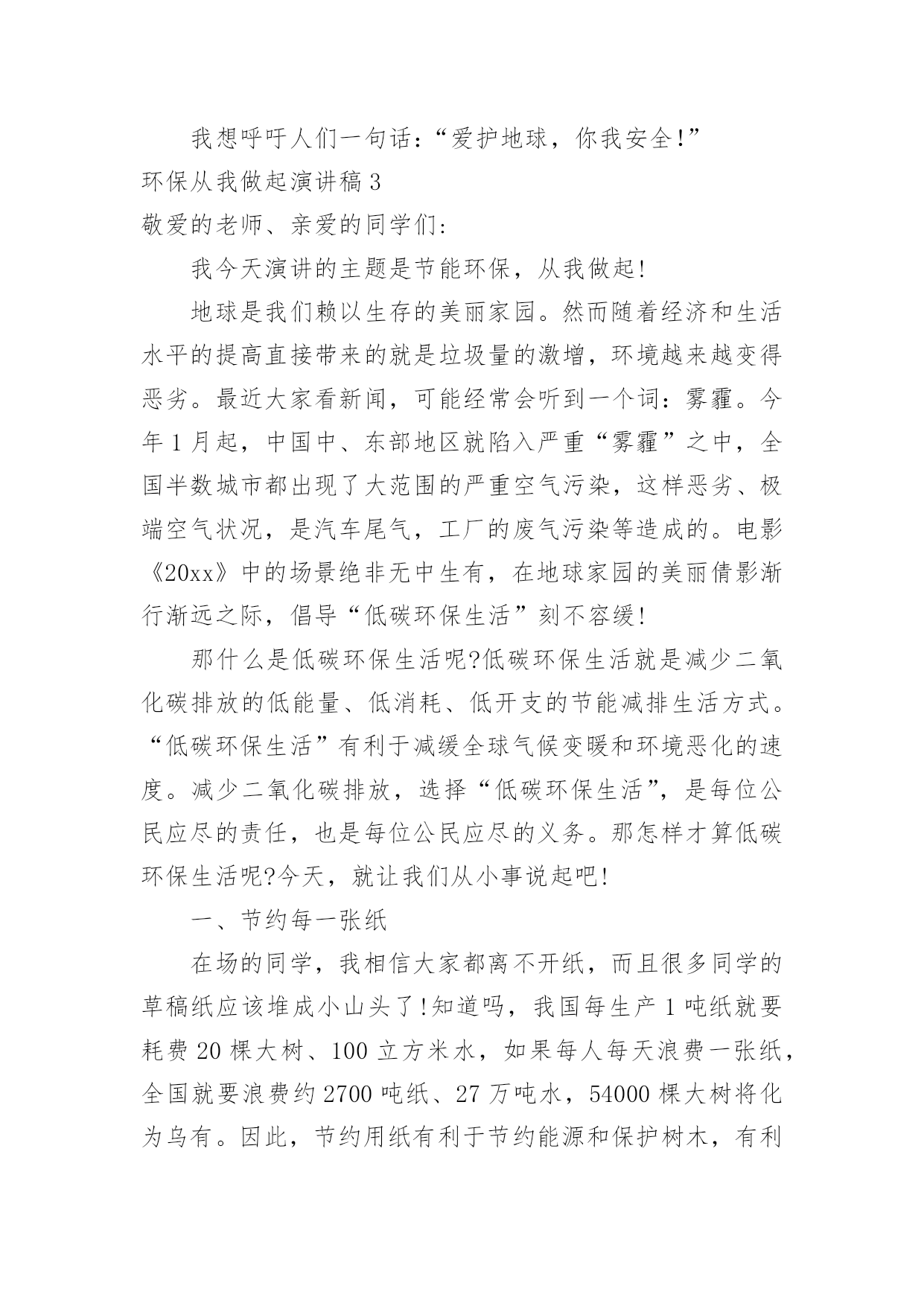 环保从我做起演讲稿环保从我做起演讲稿使用正确的写作思路书写演讲稿会更加事半功倍。在不断进步的时代,我们使用上演讲稿的情况与日俱增,写起演讲稿来就毫无头绪?下面是小编帮大家整理的环保从我做起演讲稿,供大家参考借鉴,希望可以帮助到有需要的朋友。环保从我做起演讲稿1亲爱的同学们:我今天发言的主题是《保护环境,珍惜地球》。我们生活在地球上,因为她是我们能生存的地方。我们离不开阳光,离不开植物,离不开氧气,也离不开水。可是同学们知道吗?地球这位母亲的身上的绿,正一点一点地变黄,科学家们测算,在不久的将来,母亲的绿色会消失,我也曾作过一个真实的梦,梦见全球已被沙漠化,一眼望去,只能看见无边的沙子和黑色的天空,而我向一架飞船走去……可是同学们知道吗?母亲将面临一场灾难——全球气候变暖,南北极冰雪融化,海平面升高,大地淹没,南极上空出现臭氧空洞,空气一点点的流逝,动物大量灭绝……可是同学们知道吗?我们可以直接利用的水只占世界总水量的十万分之七,可以说是微乎其微。可是这些水害不断地被污染着,大地上水的颜色,正不停的变换着……我前几天看电视得知,在长江里,中国独有的中华鲟已经绝种,令几十代中国人自豪的活化石已从我们眼前消失。我有一个愿望,我要一个三色地球,水是蓝色的.、大地是绿色的、云是白色的,森林覆盖率是,蓝天和白云和谐的搭配着,只有诱人的绿色的大地。让我们保护环境,珍惜地球,不让最后一滴水是人们的泪水,最后一口气是人们呼出的二氧化碳。为三色地球而努力学习吧!谢谢大家!环保从我做起演讲稿2尊敬的老师,亲爱的同学:大家好!大家都知道,由于人类向自然界过度的索取,已经导致了大自然的无情的报复,暴雨,暴风雨,洪水,干旱,地震,森林大火等灾情不期而至。惨痛的.教训,已经引起了各国和人类的重视了。原因是我们乱破坏自然资源,乱扔垃圾,乱砍伐树木,随意吐痰等行为,所以在成这样那个的地步。在我们身边也有这么一些人。现在街道上垃圾越来越多了,我们也经常看到有一些同学乱浪费水,甚至有一些同学把饮水机里的水用来洗手,还用那些水来玩,乱泼别人的身上。希望大家不要乱浪费水,乱扔垃圾……。如过我们能做到,我们就会每天都快乐的生活,不会再害怕,再有灾难发生了!希望大家能做到!我想呼吁人们一句话:“爱护地球,你我安全!”环保从我做起演讲稿3敬爱的老师、亲爱的同学们:我今天演讲的主题是节能环保,从我做起!地球是我们赖以生存的美丽家园。然而随着经济和生活水平的提高直接带来的就是垃圾量的激增,环境越来越变得恶劣。最近大家看新闻,可能经常会听到一个词:雾霾。今年1月起,中国中、东部地区就陷入严重“雾霾”之中,全国半数城市都出现了大范围的严重空气污染,这样恶劣、极端空气状况,是汽车尾气,工厂的废气污染等造成的。电影《20xx》中的场景绝非无中生有,在地球家园的美丽倩影渐行渐远之际,倡导“低碳环保生活”刻不容缓!那什么是低碳环保生活呢?低碳环保生活就是减少二氧化碳排放的低能量、低消耗、低开支的节能减排生活方式。“低碳环保生活”有利于减缓全球气候变暖和环境恶化的速度。减少二氧化碳排放,选择“低碳环保生活”,是每位公民应尽的责任,也是每位公民应尽的义务。那怎样才算低碳环保生活呢?今天,就让我们从小事说起吧!一、节约每一张纸在场的同学,我相信大家都离不开纸,而且很多同学的草稿纸应该堆成小山头了!知道吗,我国每生产1吨纸就要耗费20棵大树、100立方米水,如果每人每天浪费一张纸,全国就要浪费约2700吨纸、27万吨水,54000棵大树将化为乌有。因此,节约用纸有利于节约能源和保护树木,有利于减少温室气体的排放,有利于保护我们的生态环境。在此,我提倡大家积极回收废纸、不撕作业本,尽量使用双面草稿纸,努力减少纸张消耗。节约一张纸,保护一片林!二、节约每一度电同学们,家中的电器应该不少吧!而且很多电器随时都处于待机状态吧!电器设备在待机状态下耗电一般为其开机功率的10%左右,家里的电视、空调、音响、电脑、微波炉、饮水机、电热水器等的待机能耗加在一起,相当于开一只30至50瓦的长明灯,照此推算,一户普通人家一年待机而消耗的能源折合人民币近60元,因此,离开房间时,请关上电灯并且拔掉电器插头;离开教室或寝室时,请随手关掉灯、风扇,打下开关。从我做起,取缔无谓的浪费,节约每一度电。三、节约每一升油同学们,在车水马龙的街头,当一股股蓝色的烟气从一辆辆机动车尾部喷出时;当一阵阵气味怪异,令人头昏、恶心的尾气向我们袭来时,你是否以为躲在自家车子里捏着鼻子就能幸免,就能身体健康?告诉你,生活在城市里,谁也无法全身而退!英国的'有关协会曾发表研究报告称,与交通事故遇难者相比,英国每年死于空气污染的人要多出10倍。节约一升油,减少我们对机动车的依赖,减少我们对空气的污染,近距离出行尽可能使用自行车或者步行,让我们人