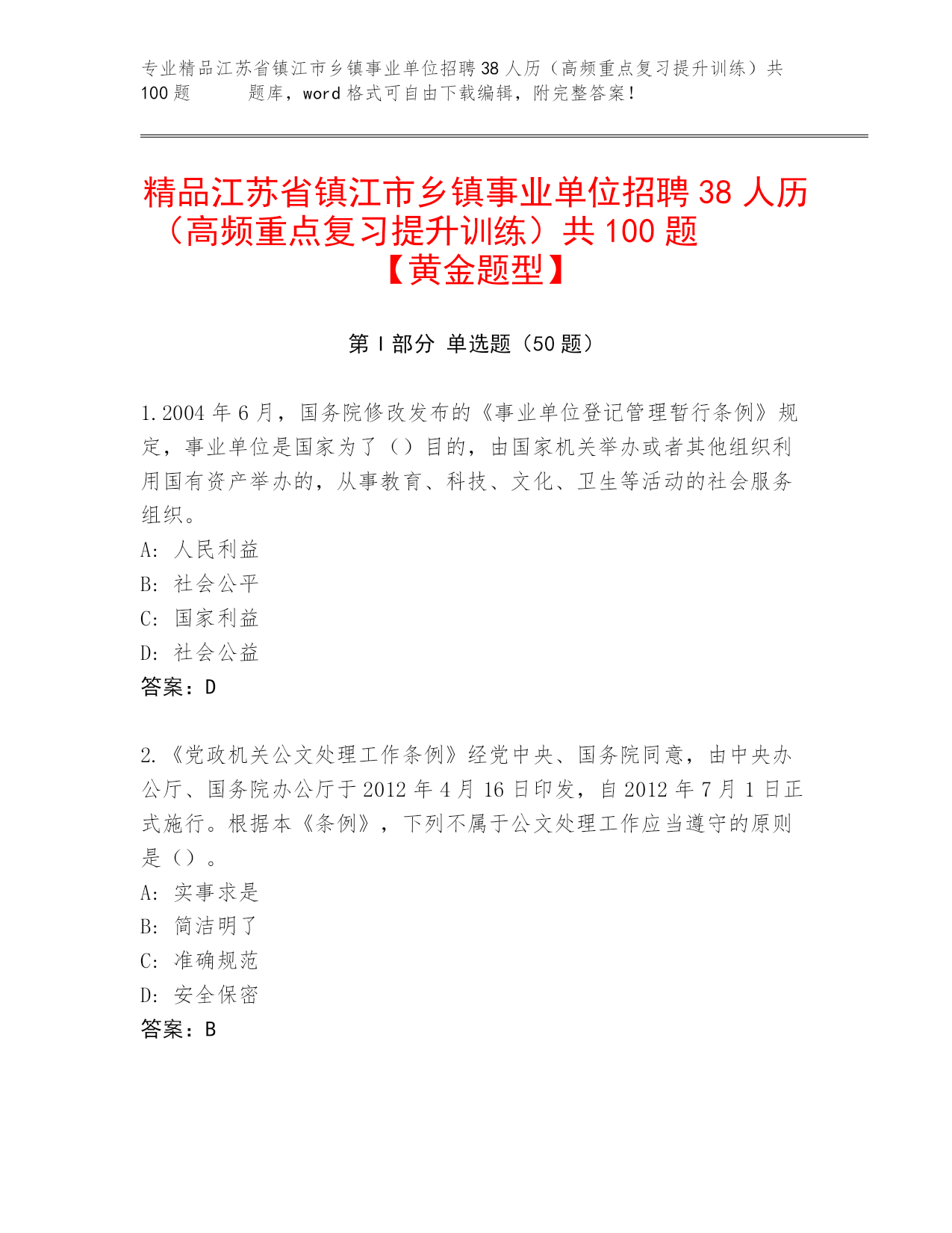 历年江苏省镇江市乡镇事业单位招聘38人历(高频重点复习提升训练)共100题 王牌题库(黄金题型)